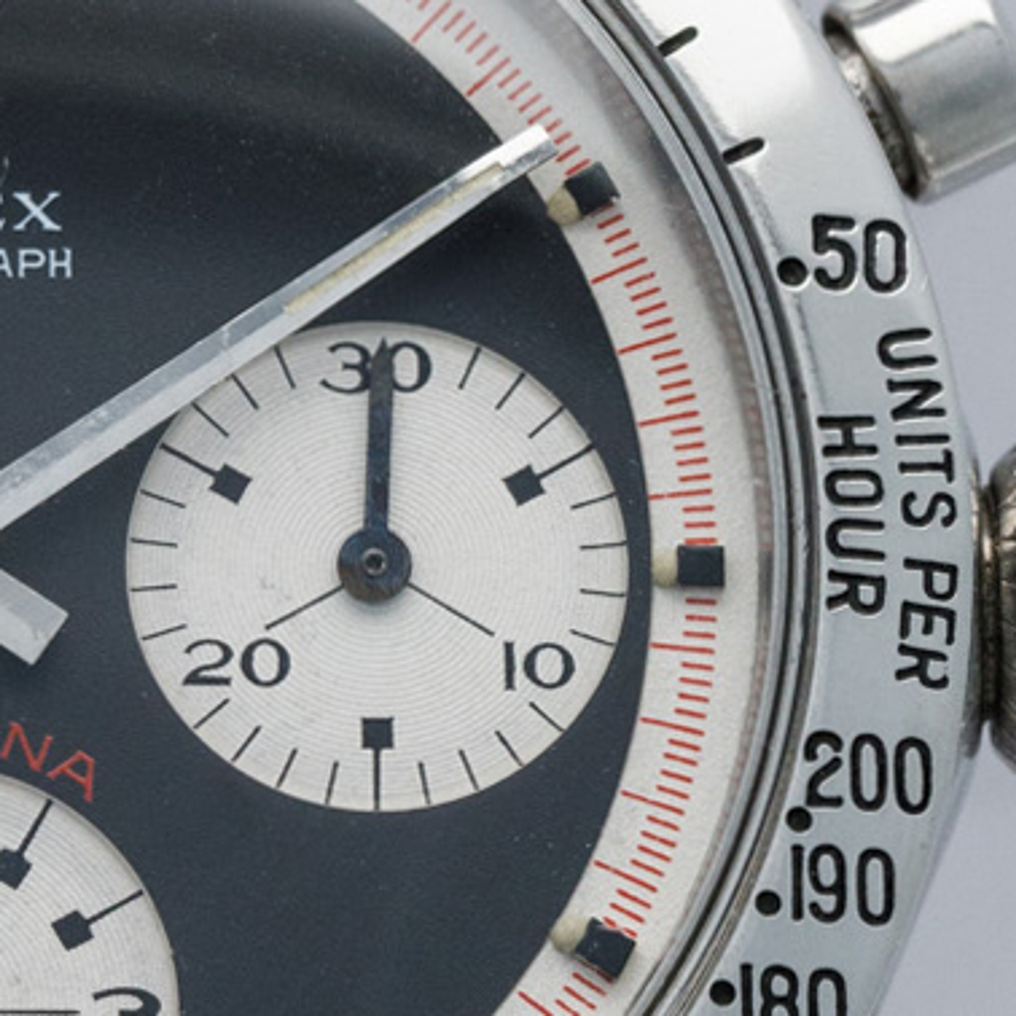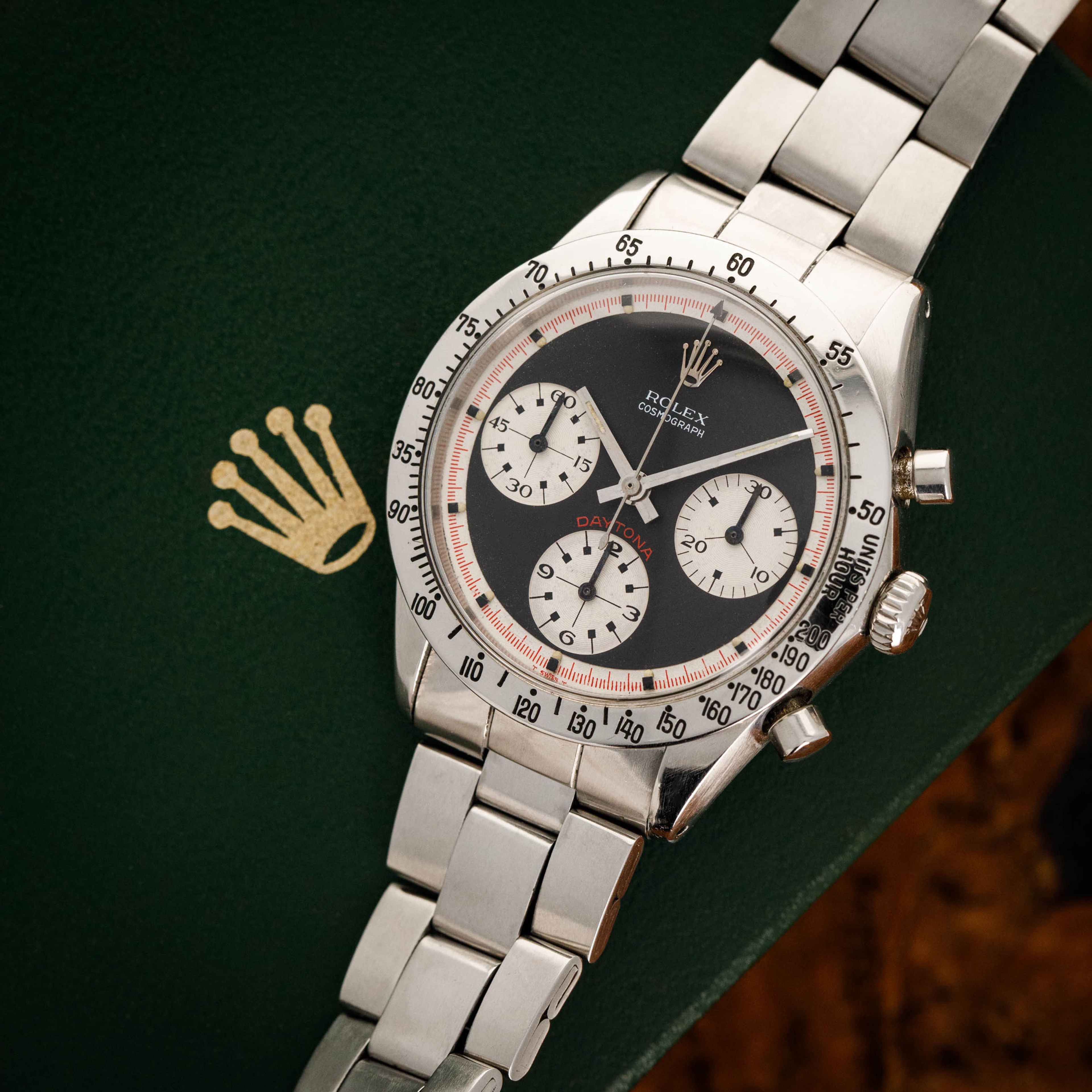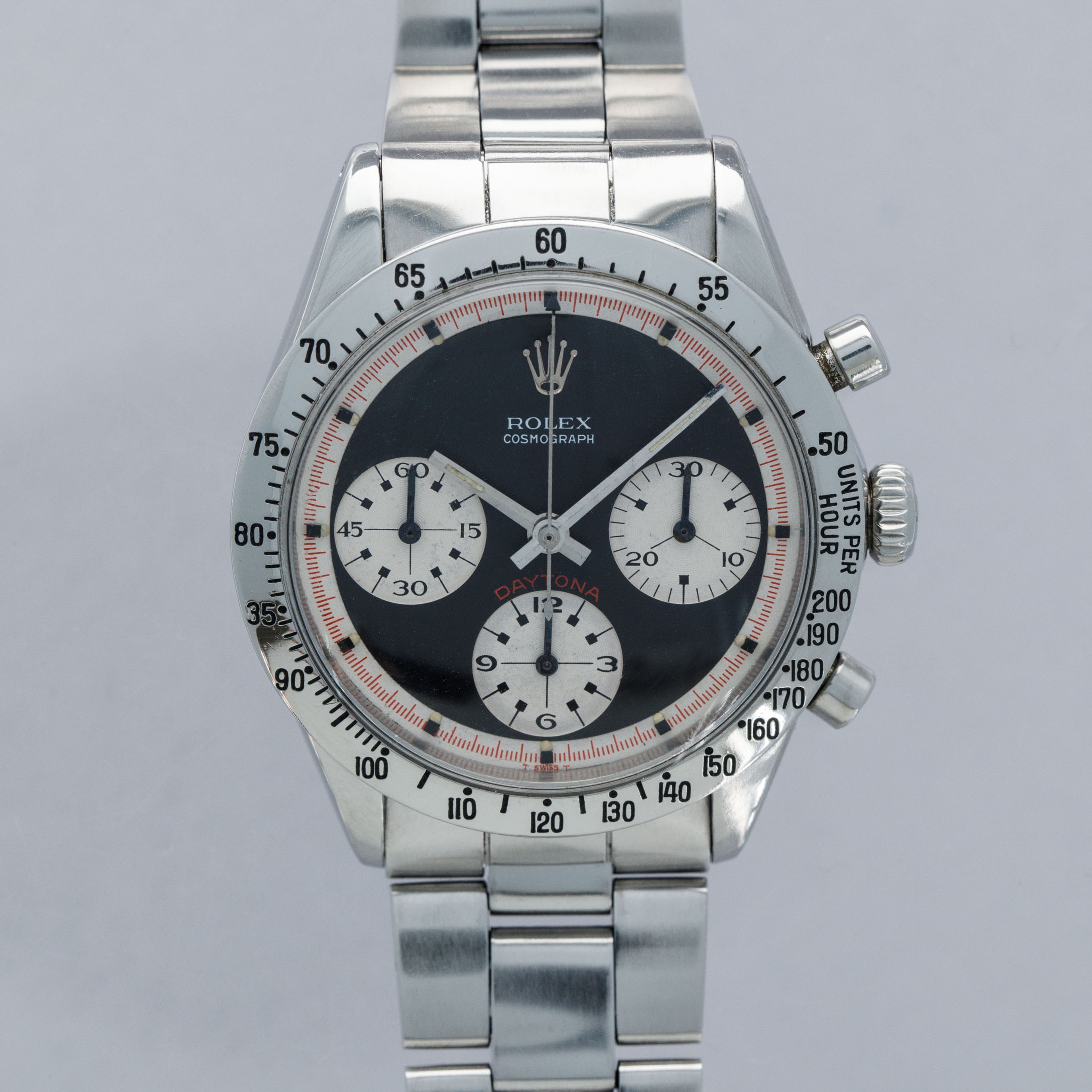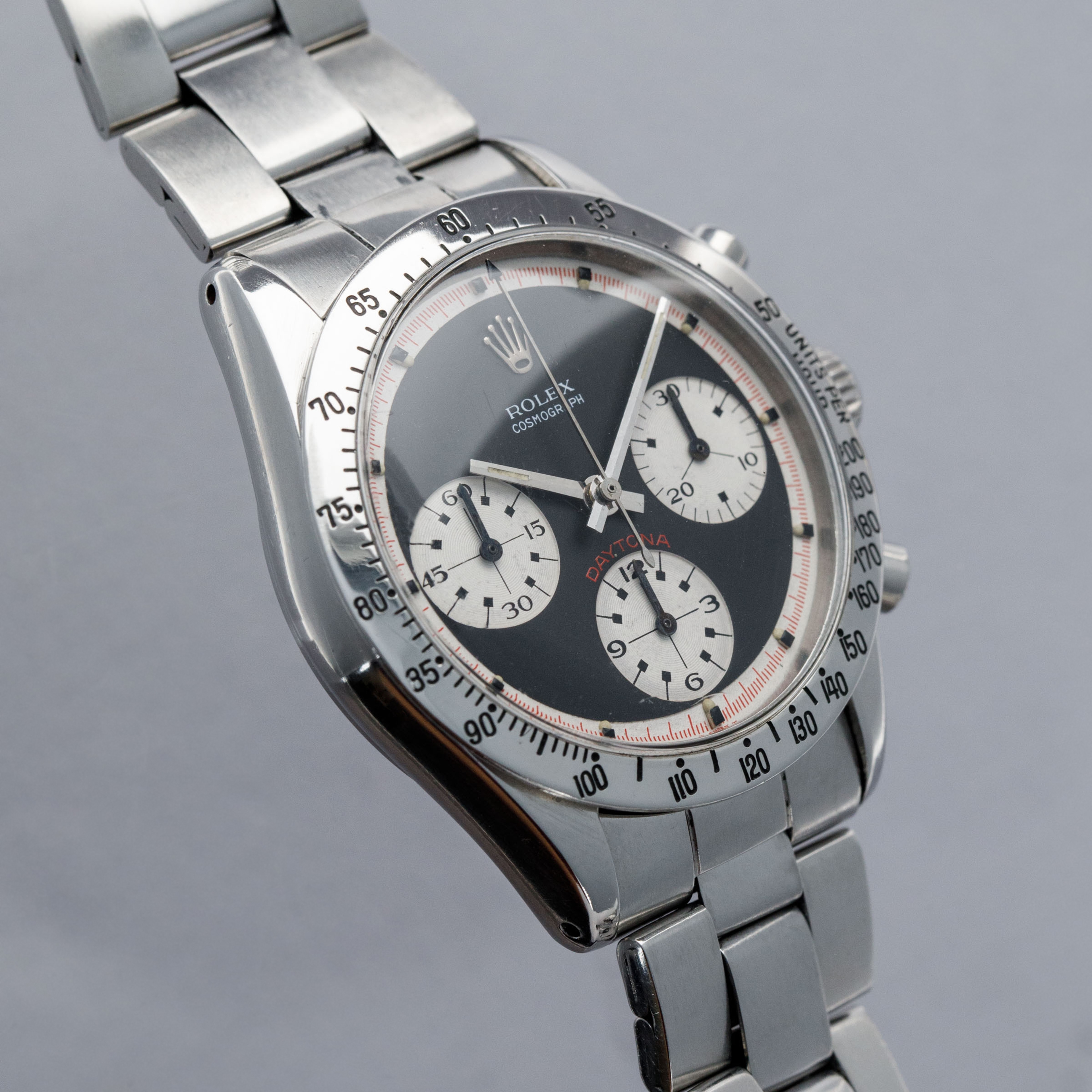 Released in 1963, the Rolex Cosmograph Daytona has become perhaps the most iconic chronograph the world has ever seen. Famed for its legendary design, a rich heritage in motorsport and ties to famed actor and race car driver Paul Newman whose wearing the watch spurred a watch collector frenzy, the Daytona's reputation precedes itself. However, it wasn’t always that way for the Daytona. Released to celebrate Rolex becoming the Daytona International Speedway's official timekeeper the year before in 1962, the Cosmograph was actually a commercial failure in the early years of its launch. Debuting as the ref. 6239, the Cosmograph was up against industry titans like Heuer, Breitling and others. Measuring in at 37mm and powered by its iconic Valjoux movement, the ref. 6239 was always up to the task, but customers would choose the other options instead. While Rolex had called the Cosmograph both the Le Mans and the Daytona, they eventually stuck with the Daytona name in 1965 and birthed the fully-fledged icon that we know today. In addition to the evolution of its name, another tactic Rolex employed to popularize their watch was giving it new dial variants, with the exotic dial, or “Paul Newman” dial as it is known, existing as one of those dial variants. Offered here we have the fabled Daytona ref. 6262. Launched in 1970 and produced for only one year, the ref. 6262 introduced the upgraded manual-wind Valjoux cal. 727 to the Daytona, while reintroducing pump chronograph pushers and a stainless steel bezel to the collection. While the ref. 6262 is a rare watch in and of itself, the example we have here is particularly notable due to its black exotic “Paul Newman” dial, as identifiable with square counters in its white subdials and red accents along its white chapter ring. An icon of horology and greater pop culture, the Paul Newman Daytona was popularized in the 1980s when collectors caught on to Paul Newman wearing his famous example, and since then the Daytona as a whole has become one of the most desirable watches in horology, and the four digit ‘Paul Newman’ exotic dial examples like the one we have here stand as the apex predator of that food chain.
