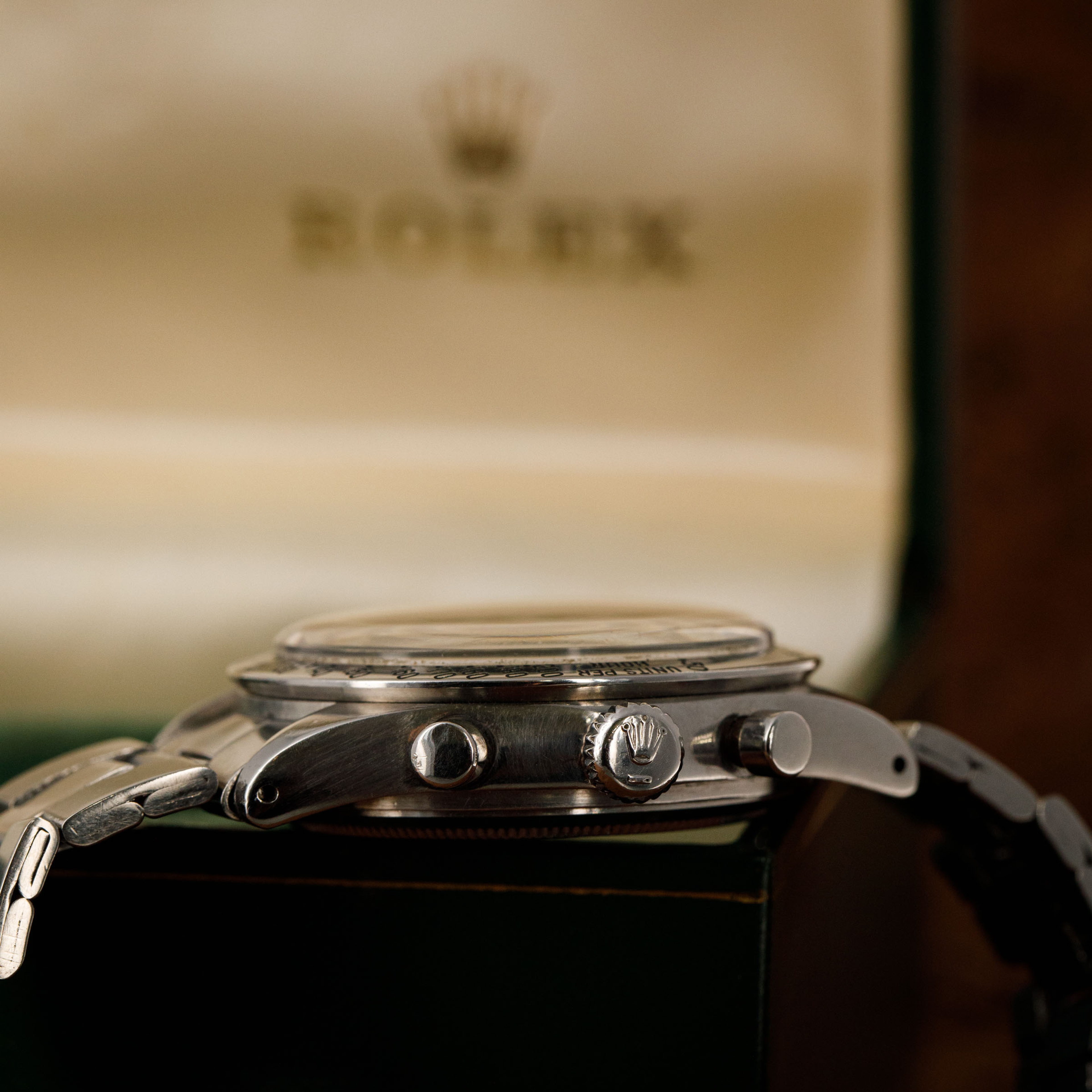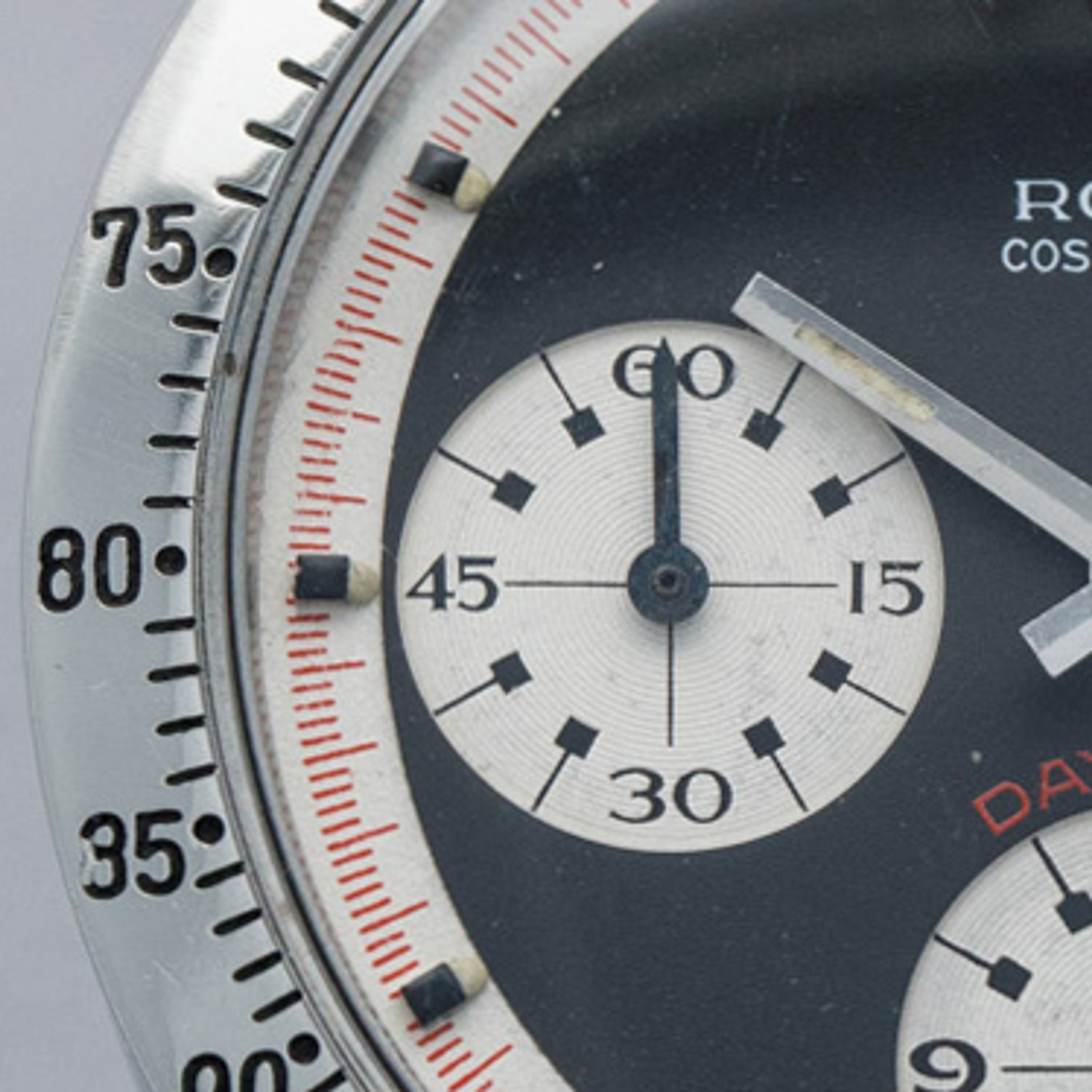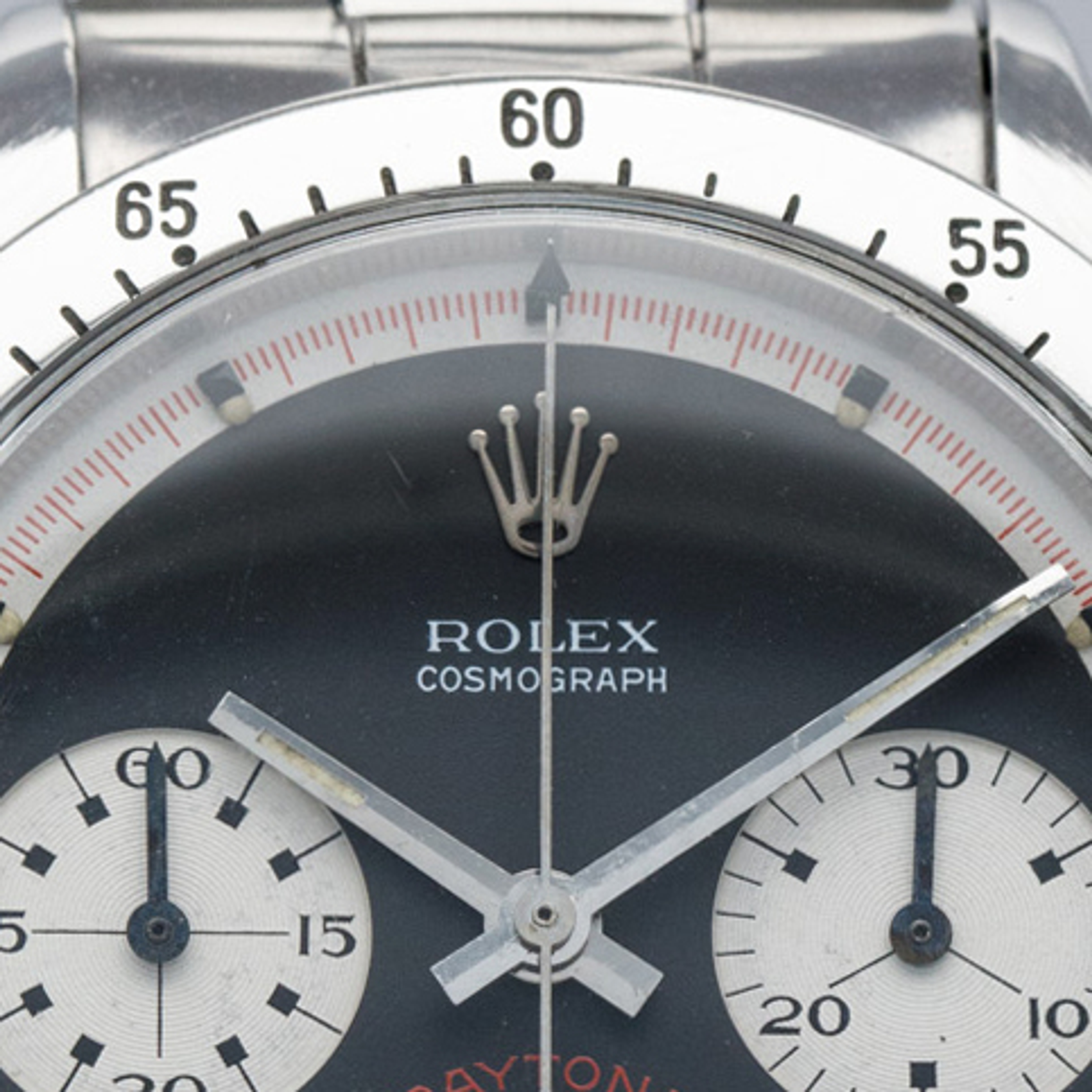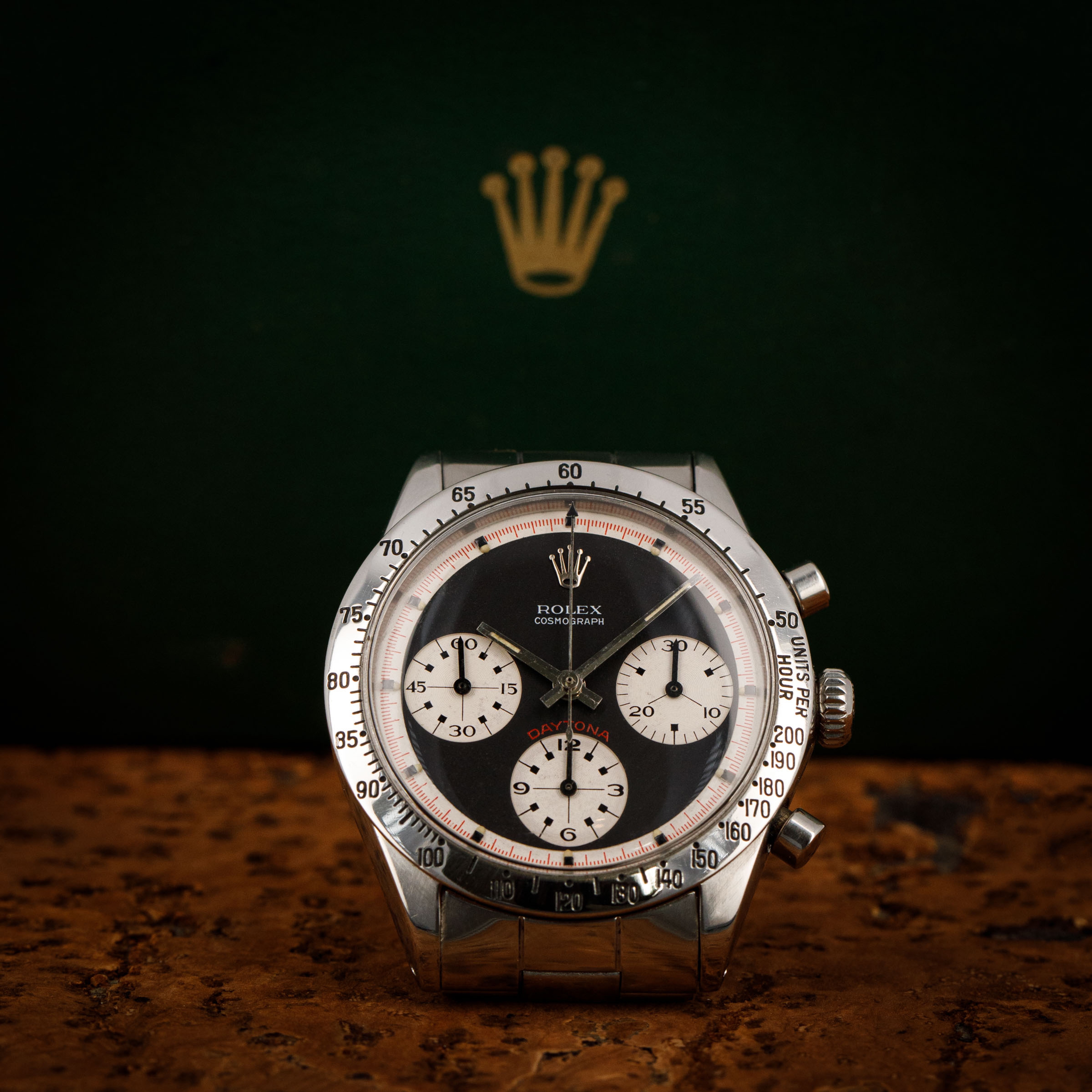 Released in 1963, the Rolex Cosmograph Daytona has become perhaps the most iconic chronograph the world has ever seen. Famed for its legendary design, a rich heritage in motorsport and ties to famed actor and race car driver Paul Newman whose wearing the watch spurred a watch collector frenzy, the Daytona's reputation precedes itself. However, it wasn’t always that way for the Daytona. Released to celebrate Rolex becoming the Daytona International Speedway's official timekeeper the year before in 1962, the Cosmograph was actually a commercial failure in the early years of its launch. Debuting as the ref. 6239, the Cosmograph was up against industry titans like Heuer, Breitling and others. Measuring in at 37mm and powered by its iconic Valjoux movement, the ref. 6239 was always up to the task, but customers would choose the other options instead. While Rolex had called the Cosmograph both the Le Mans and the Daytona, they eventually stuck with the Daytona name in 1965 and birthed the fully-fledged icon that we know today. In addition to the evolution of its name, another tactic Rolex employed to popularize their watch was giving it new dial variants, with the exotic dial, or “Paul Newman” dial as it is known, existing as one of those dial variants. Offered here we have the fabled Daytona ref. 6262. Launched in 1970 and produced for only one year, the ref. 6262 introduced the upgraded manual-wind Valjoux cal. 727 to the Daytona, while reintroducing pump chronograph pushers and a stainless steel bezel to the collection. While the ref. 6262 is a rare watch in and of itself, the example we have here is particularly notable due to its black exotic “Paul Newman” dial, as identifiable with square counters in its white subdials and red accents along its white chapter ring. An icon of horology and greater pop culture, the Paul Newman Daytona was popularized in the 1980s when collectors caught on to Paul Newman wearing his famous example, and since then the Daytona as a whole has become one of the most desirable watches in horology, and the four digit ‘Paul Newman’ exotic dial examples like the one we have here stand as the apex predator of that food chain.