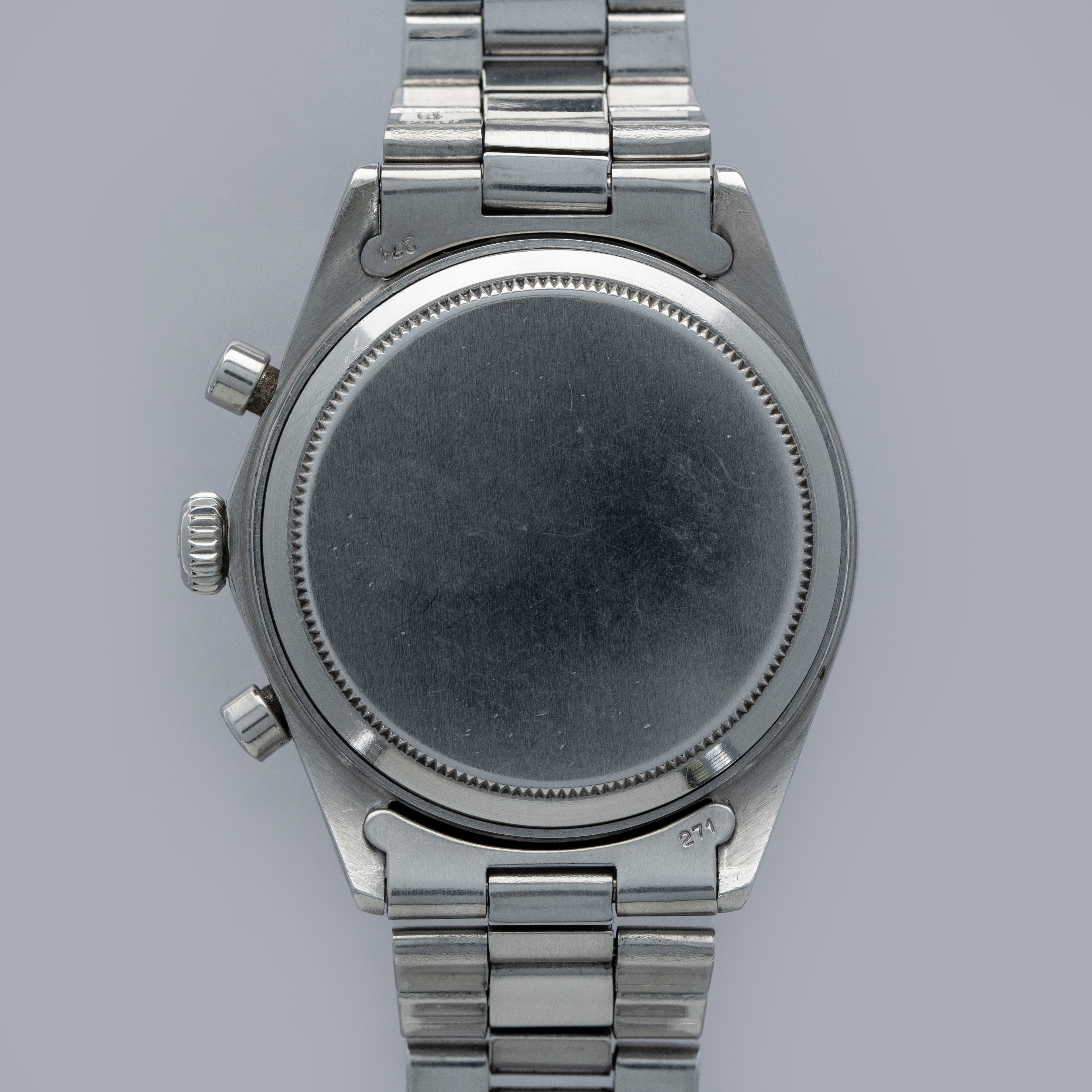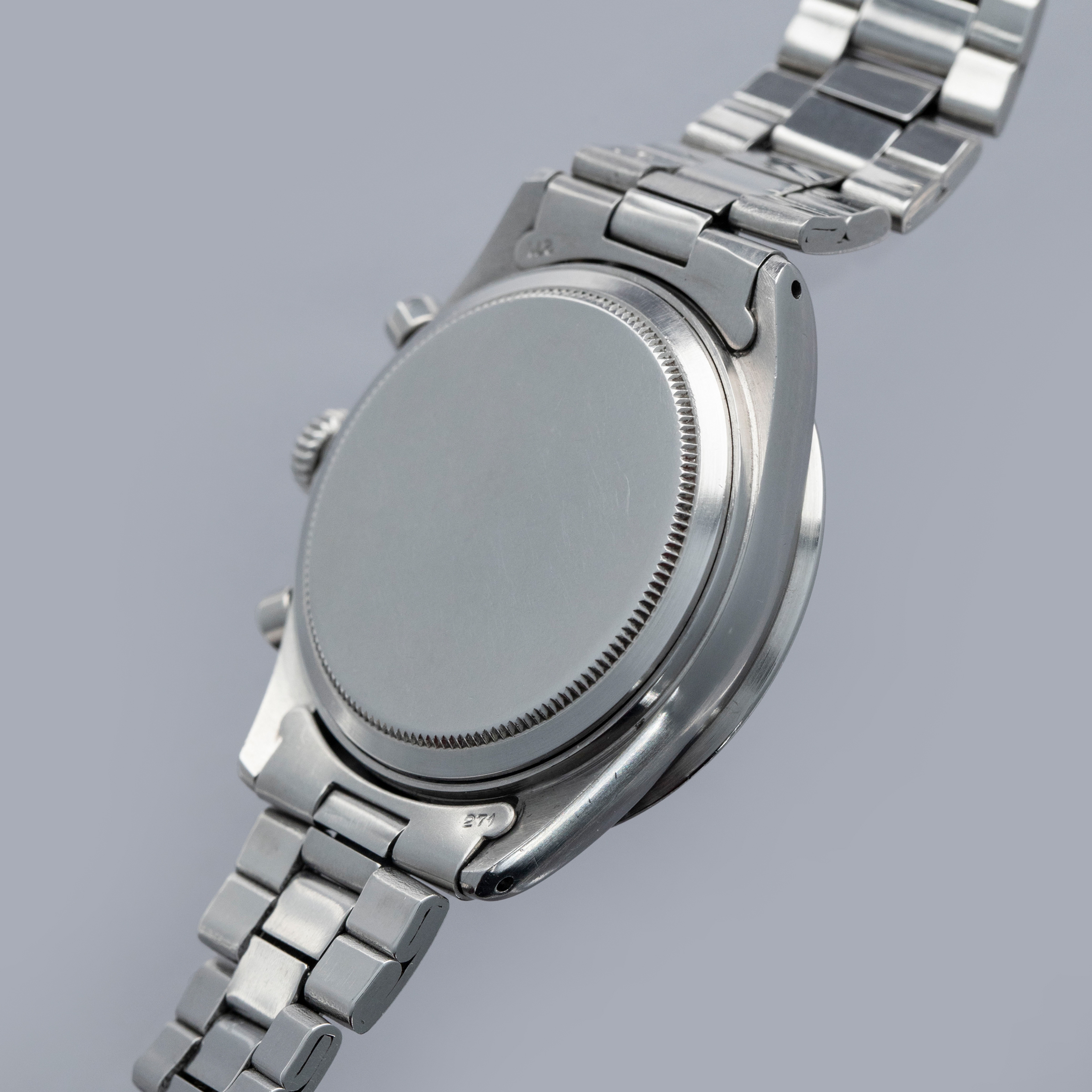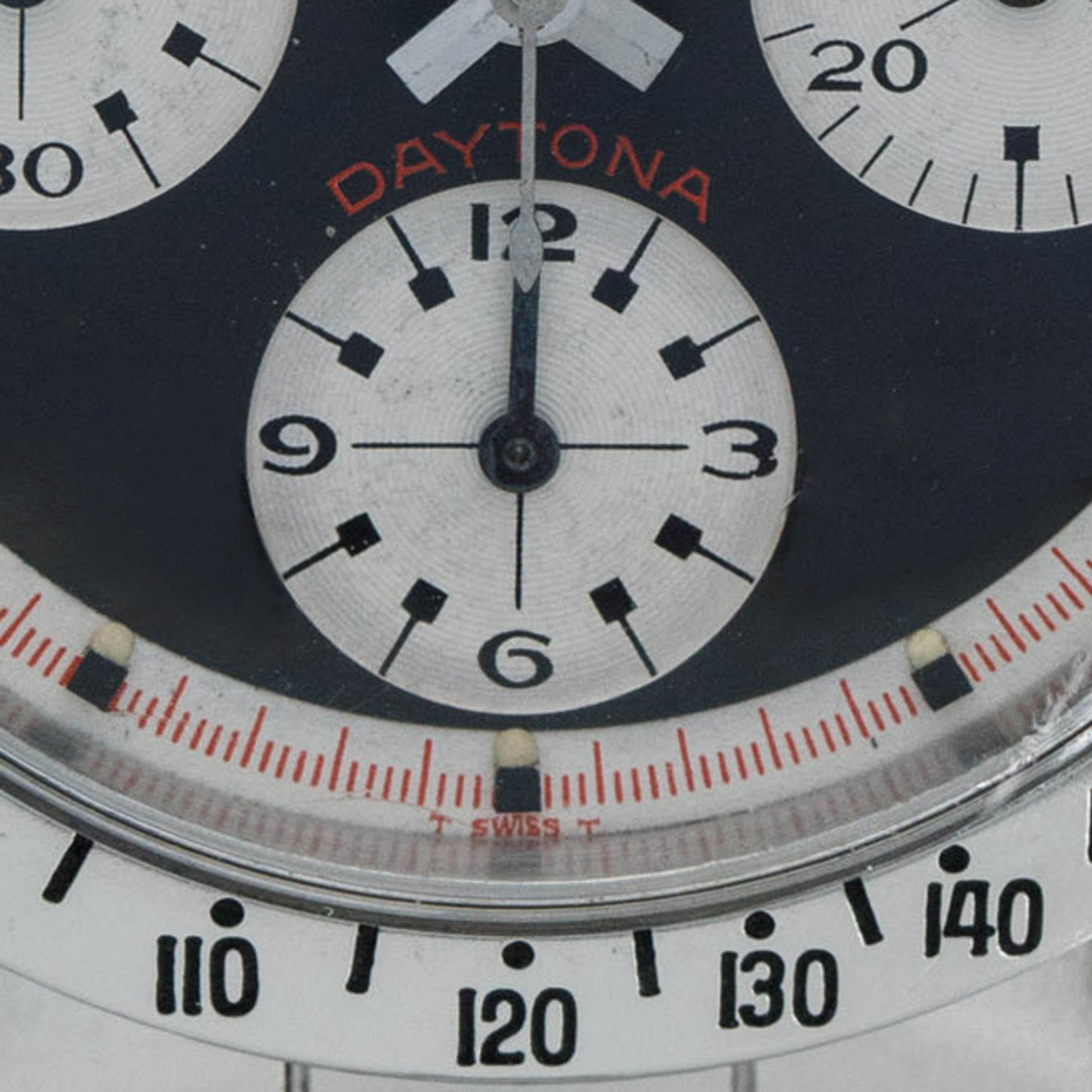 Boasting the exotic or "Paul Newman" dial, this ref. 6263 features a reverse panda dial with its white subdials sporting a unique serif font with red inscriptions along the white chapter ring that surrounds the dial's large black center.