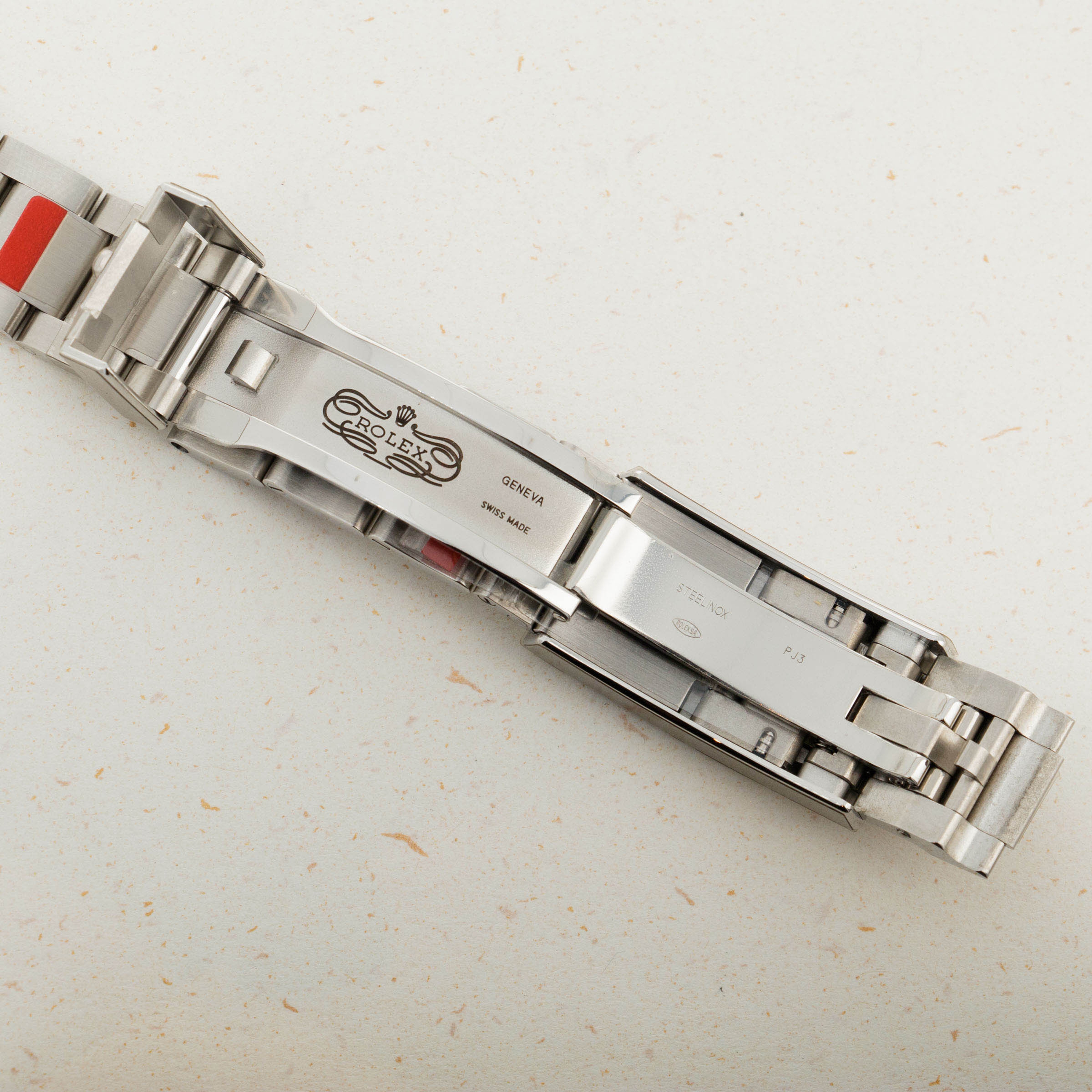 Since its purchase, this watch has not been worn. The original plastic stickers of the watch are still present along the bracelet clasp as well as the mid-case, and caseback.