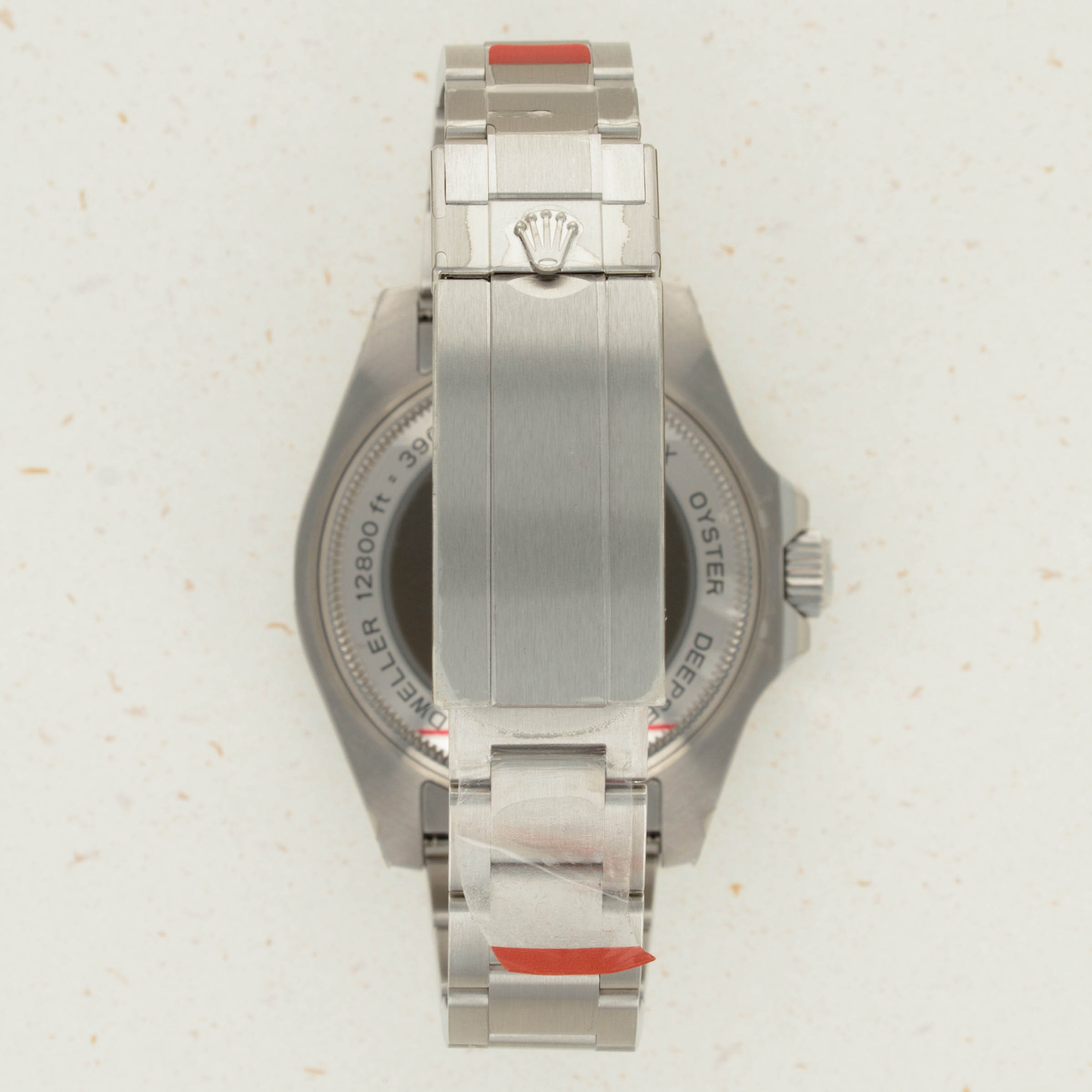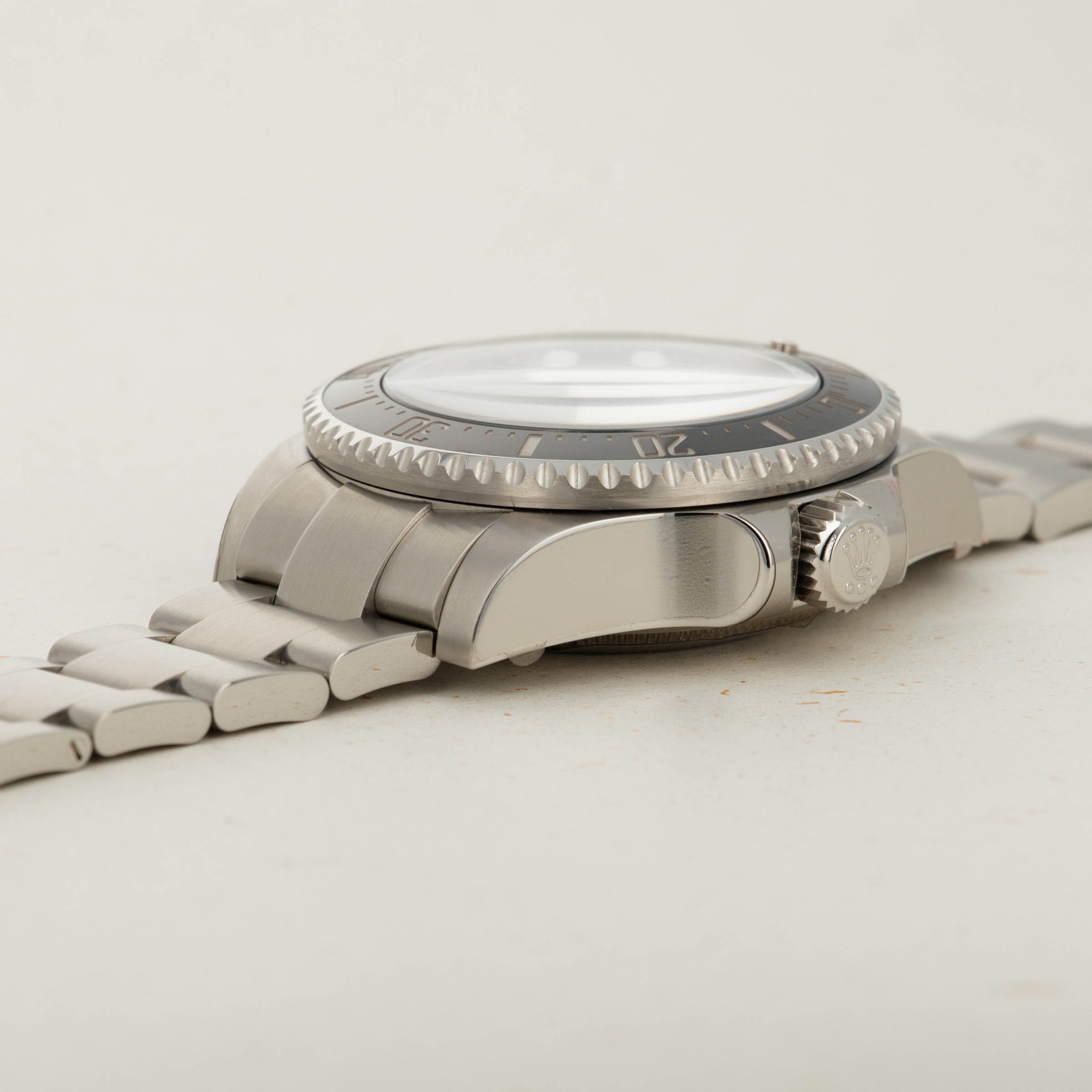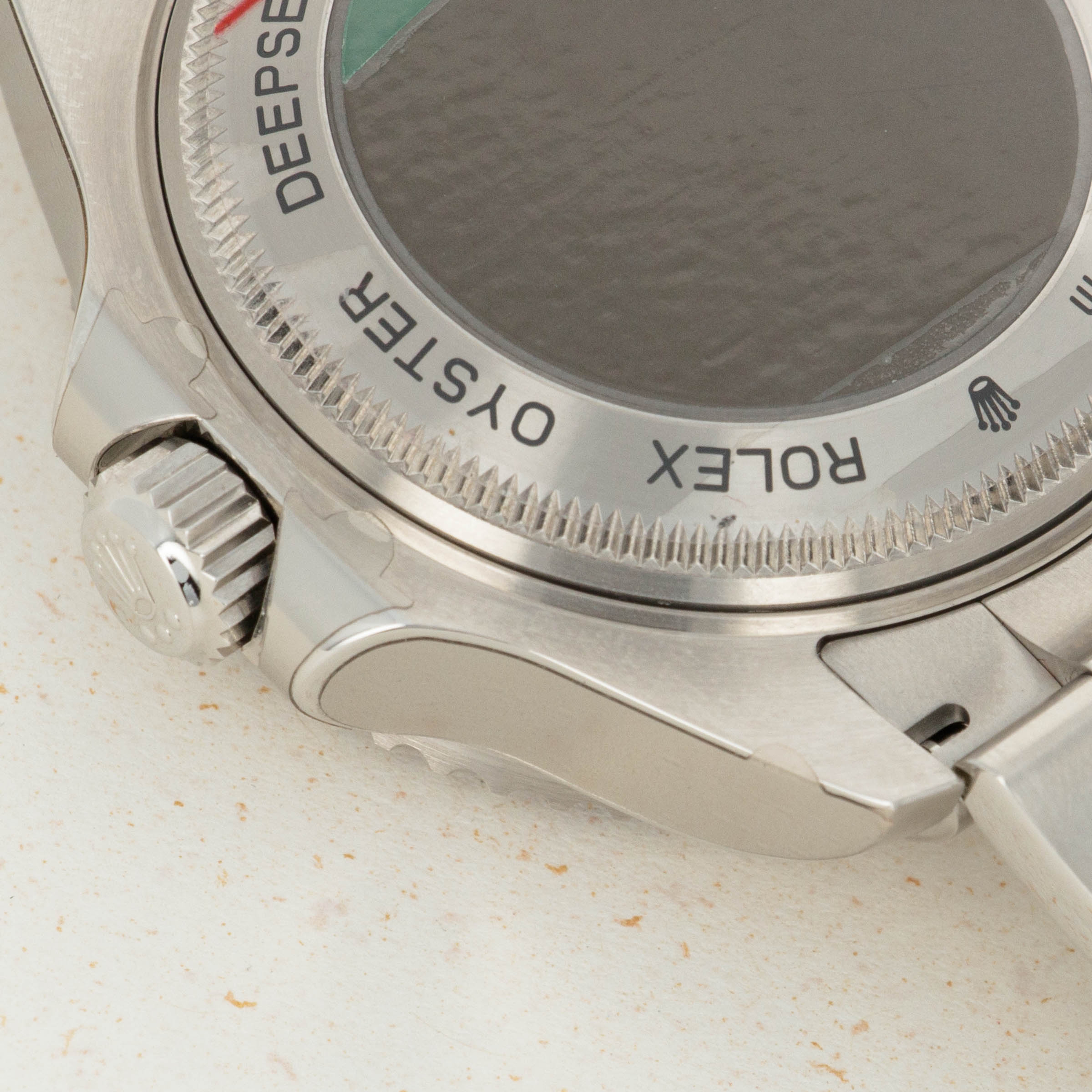 Boasting one of Rolex's largest constructions ever, the ref. 116660 requires its 44mm x 17.7mm stainless steel case to house its Ring Lock System and helium escape valve - both of which are referenced on the silver ring that encircles the timepiece's black dial and contribute to the ref. 116660's mammoth water resistance.
