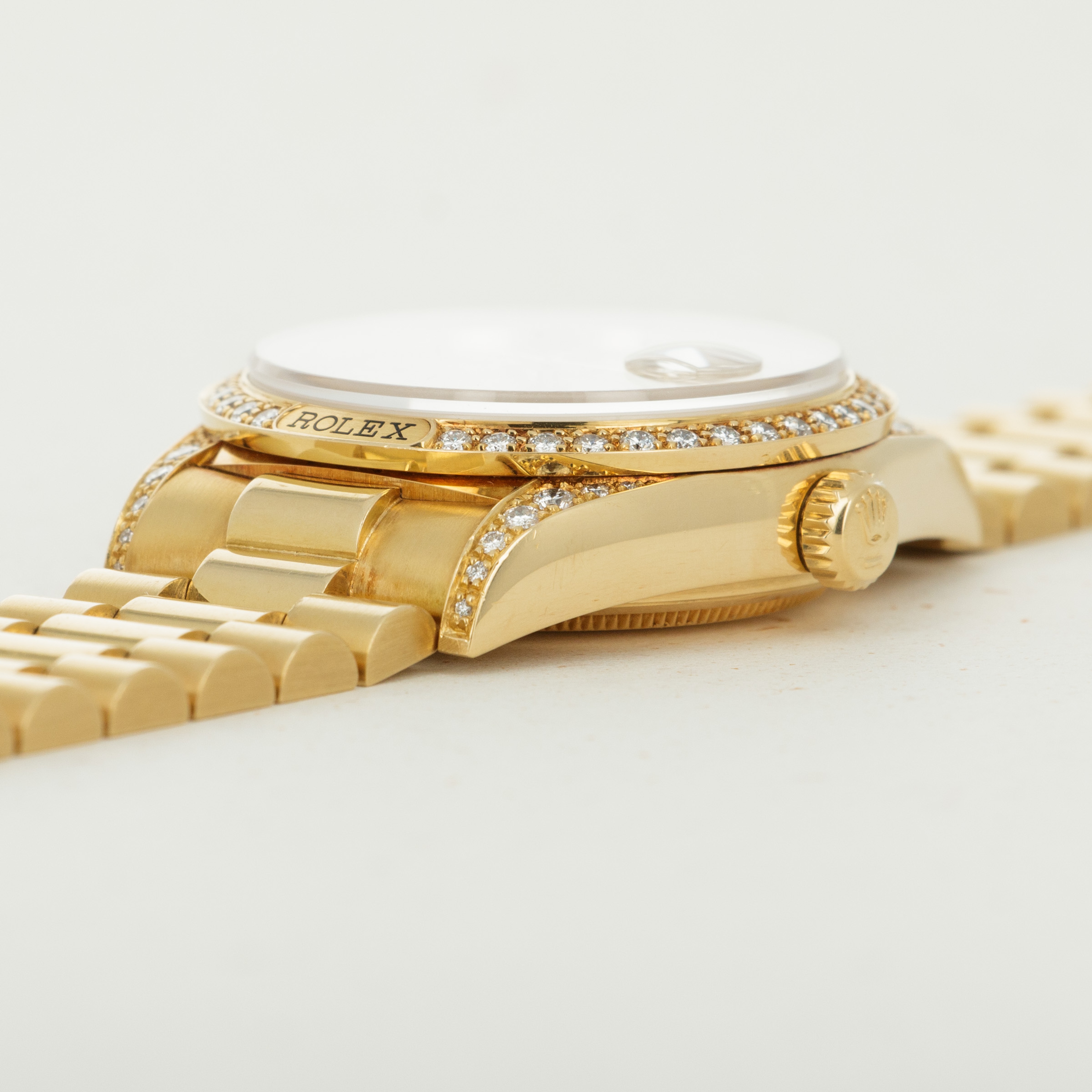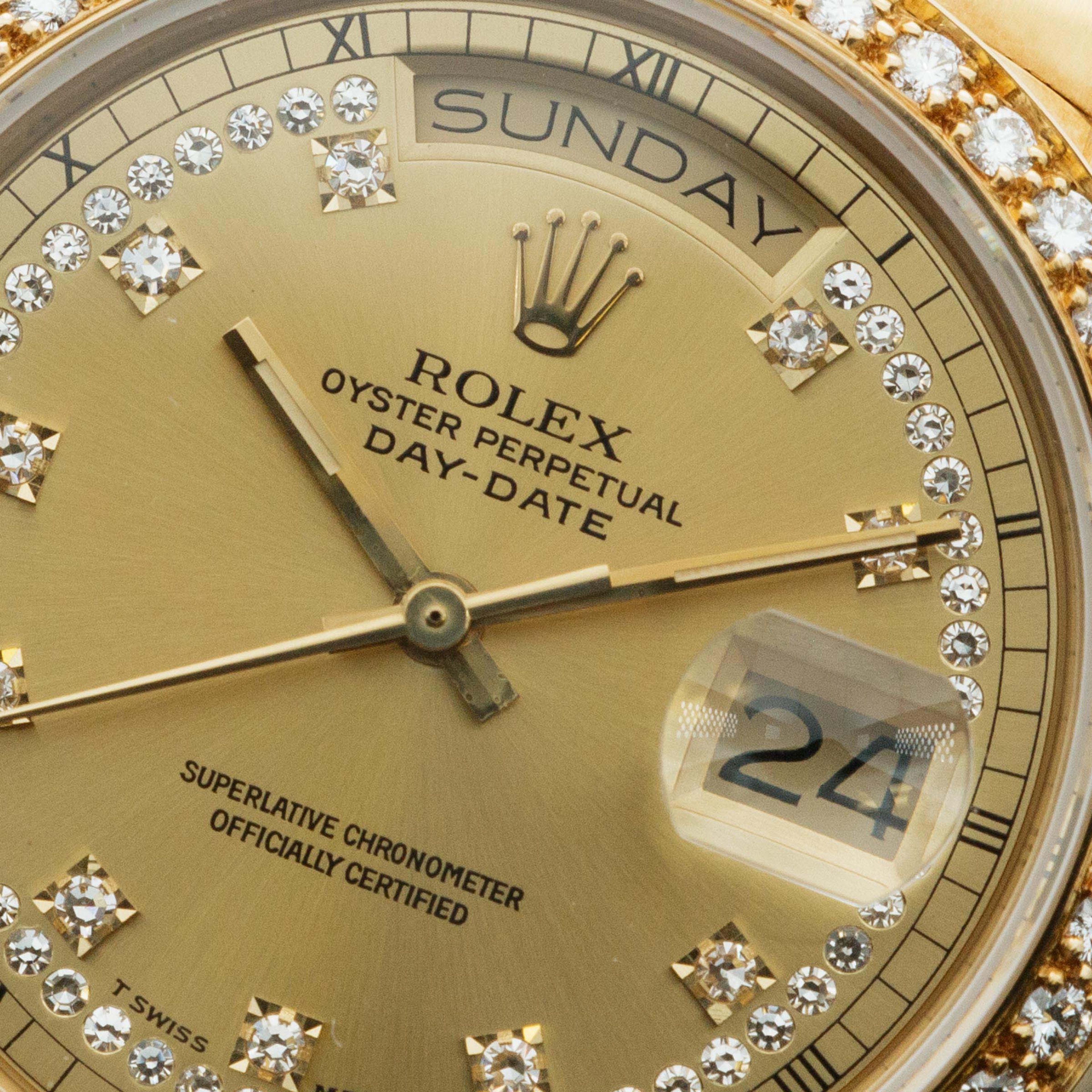 Featuring diamonds across its entire bezel and lugs, and a "Rolex" plaque at 6 o'clock on the bezel, this example's aesthetic is unapologetically luxurious, just as the Day-Date deserves.