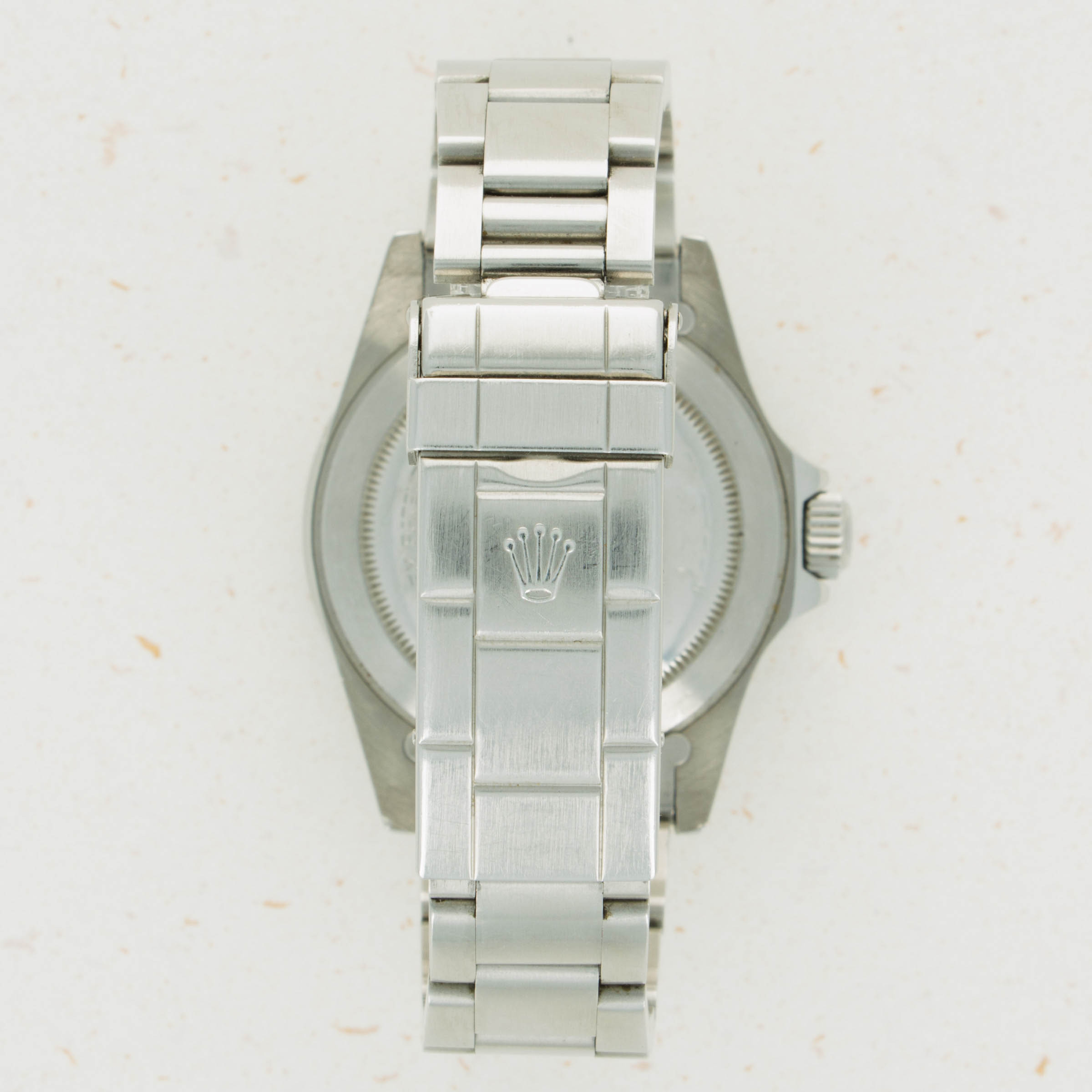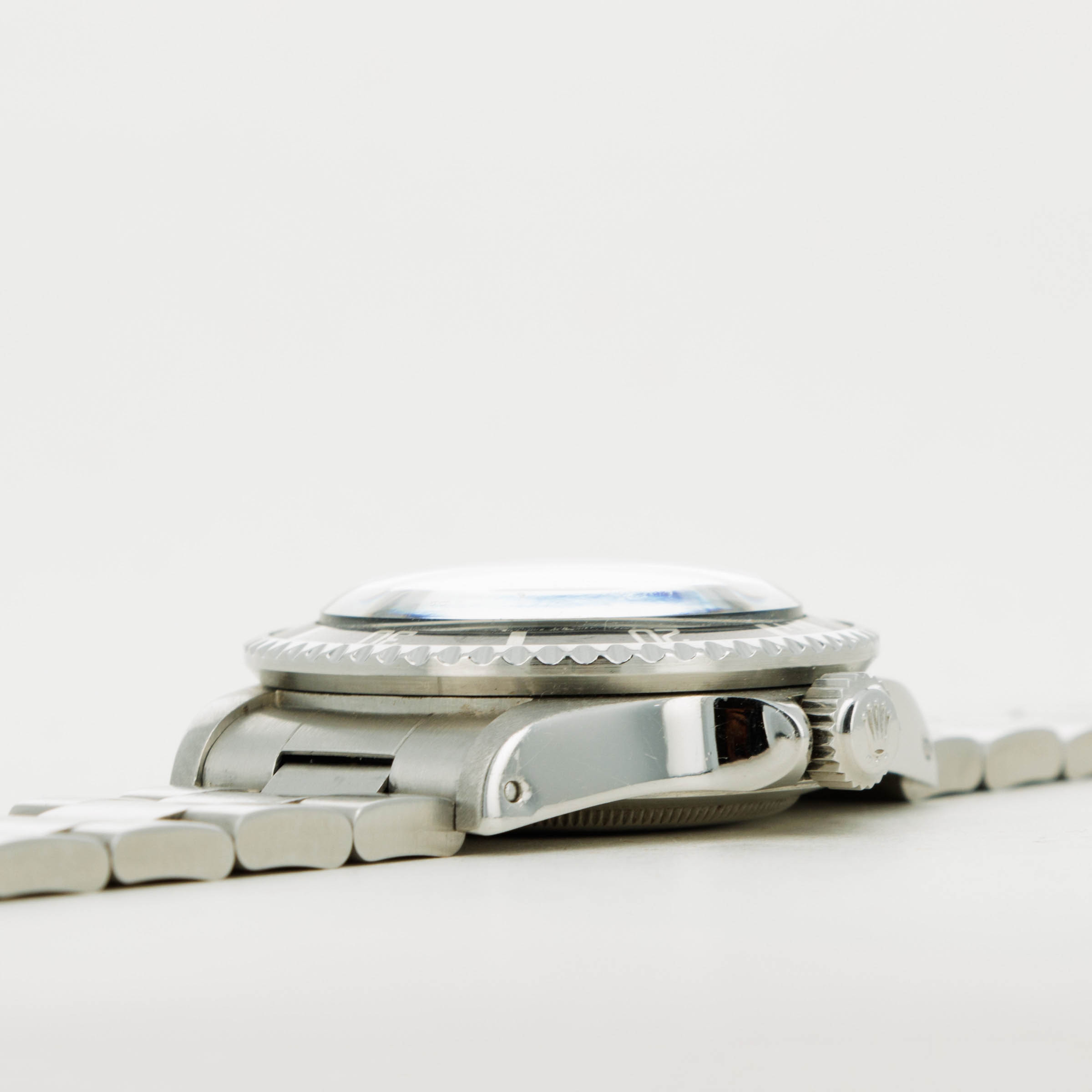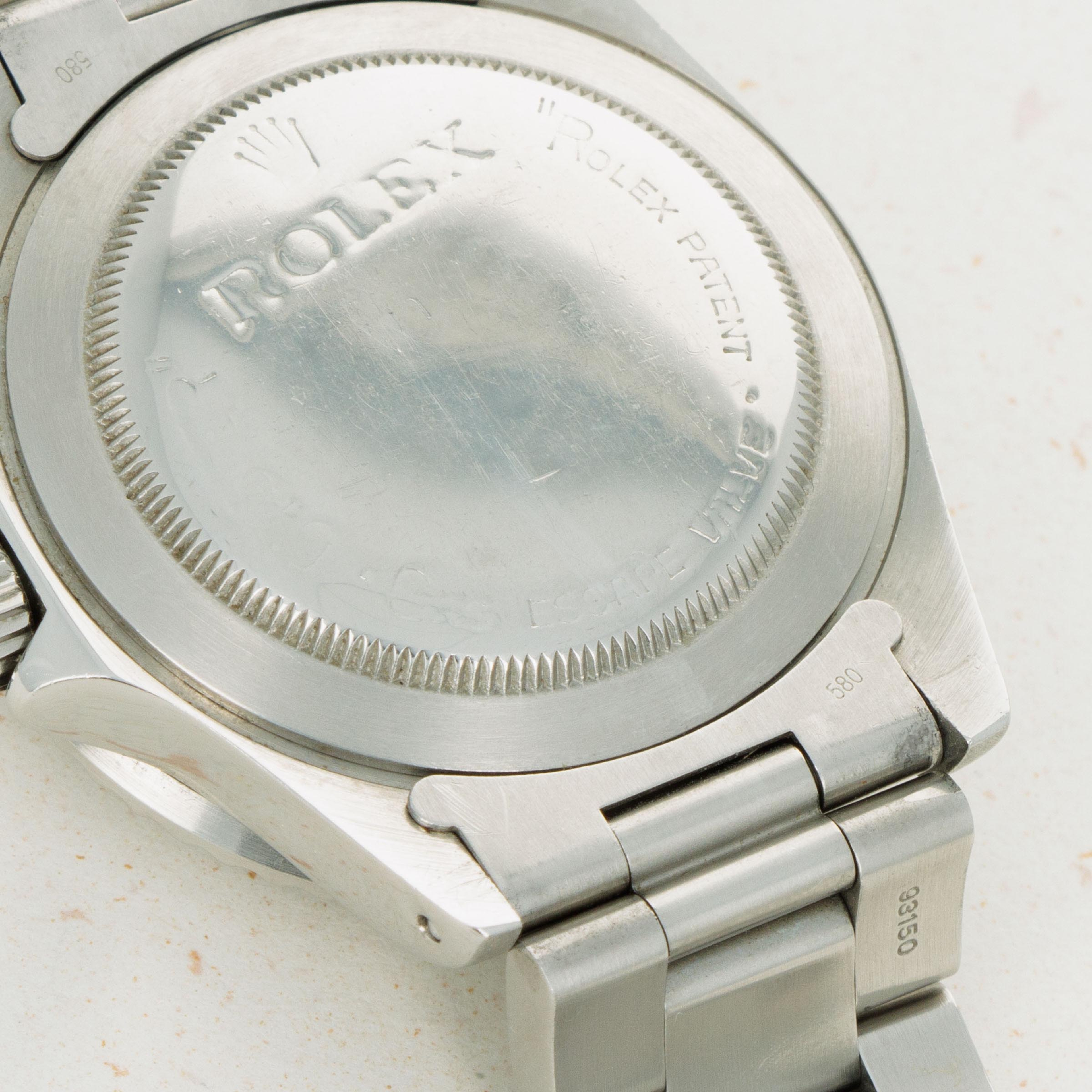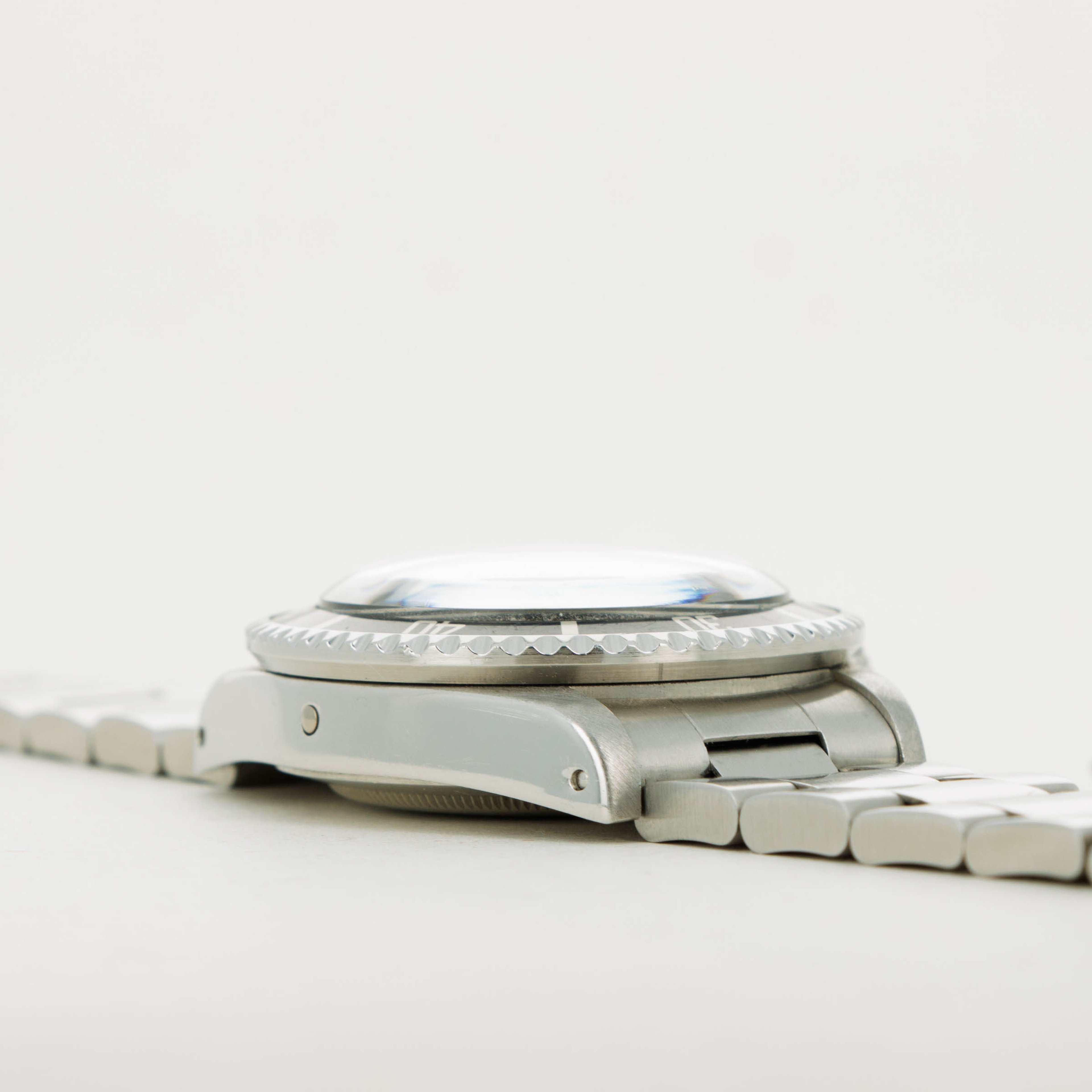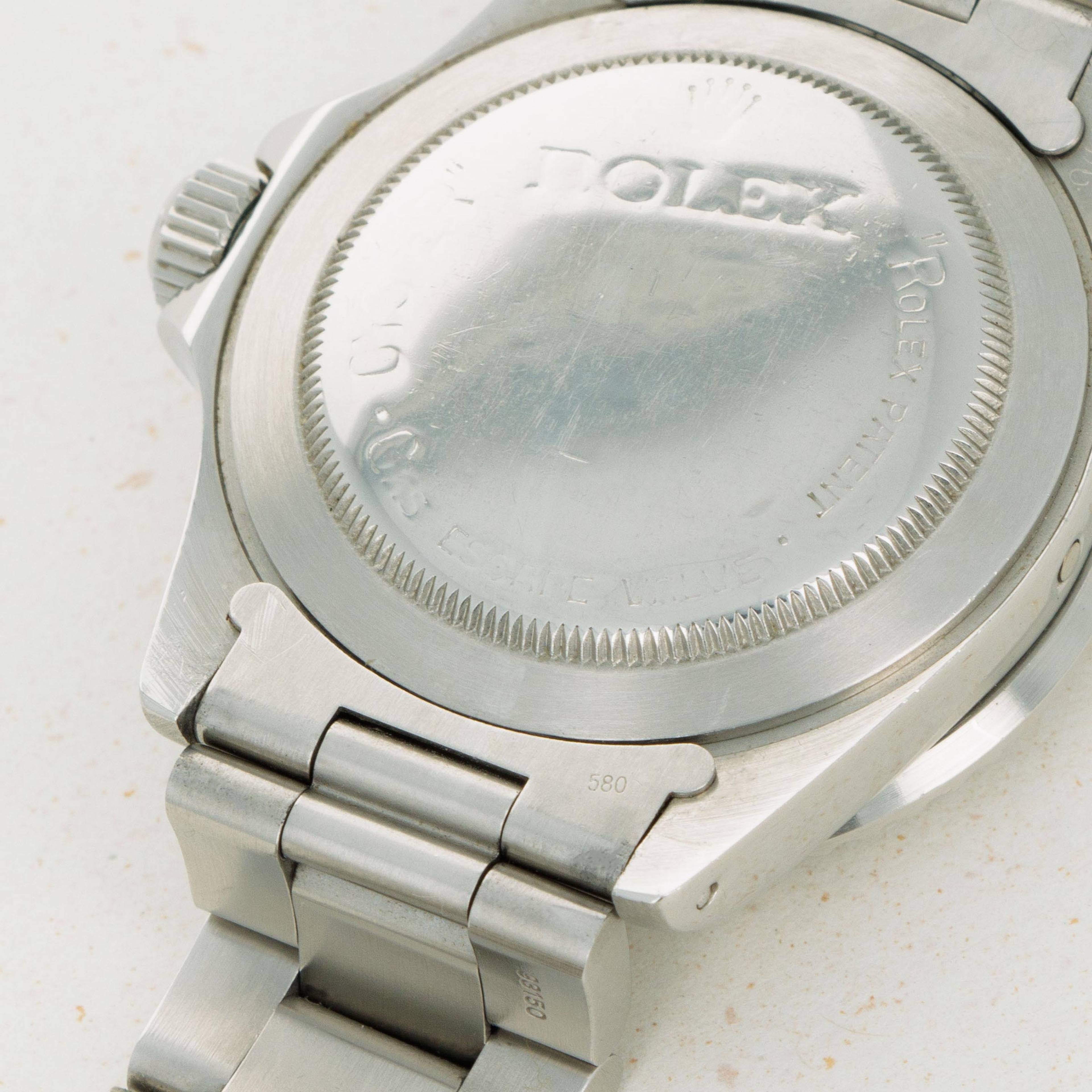 Watch is in good to very good overall condition. Case has been previously polished, exhibiting moderate wear. Caseback engravings are faint, having been worn and polished over time. Full serial number matching the case is engraved on the inside of the caseback. The dial is in very good condition, with a small chip at the edge at 6 o'clock but otherwise near-mint. Luminous is creamy and matches the hands perfectly. Slightly faded bezel insert with pearl still intact. The later solid link oyster bracelet has 11 links, 1 of which is removable. There is light stretch.