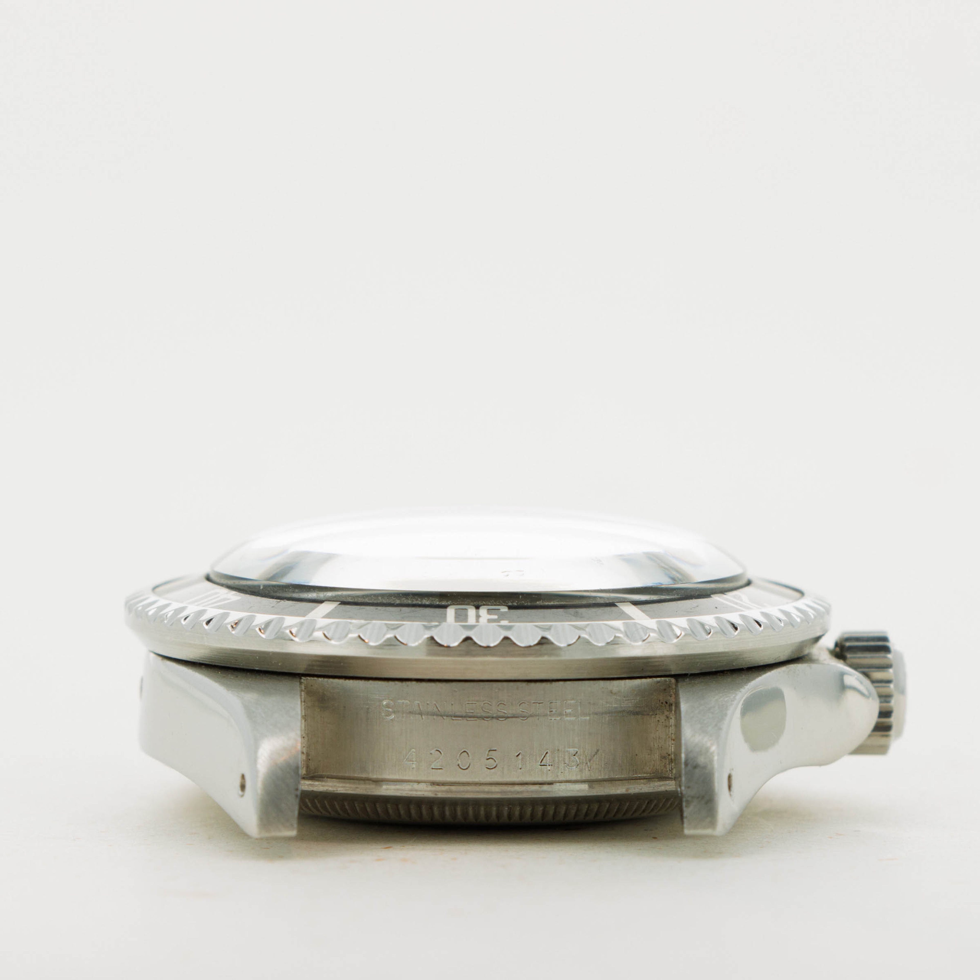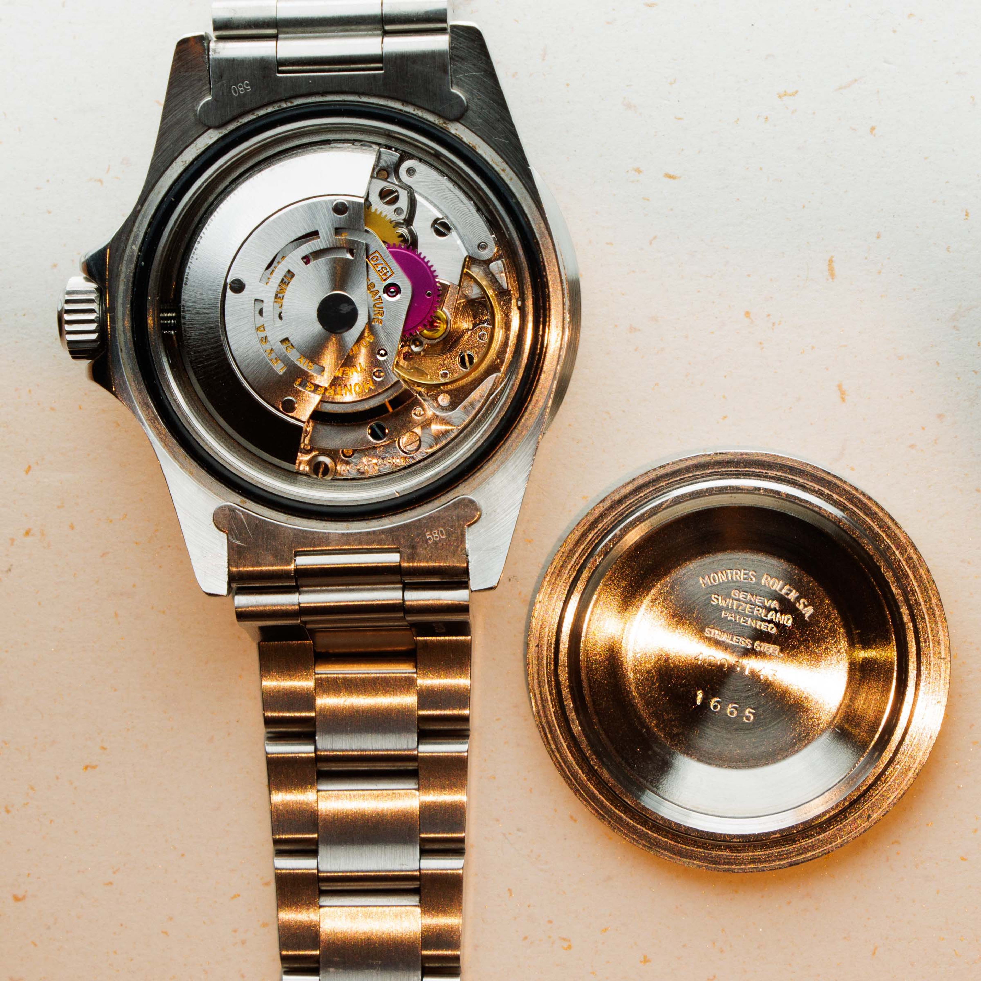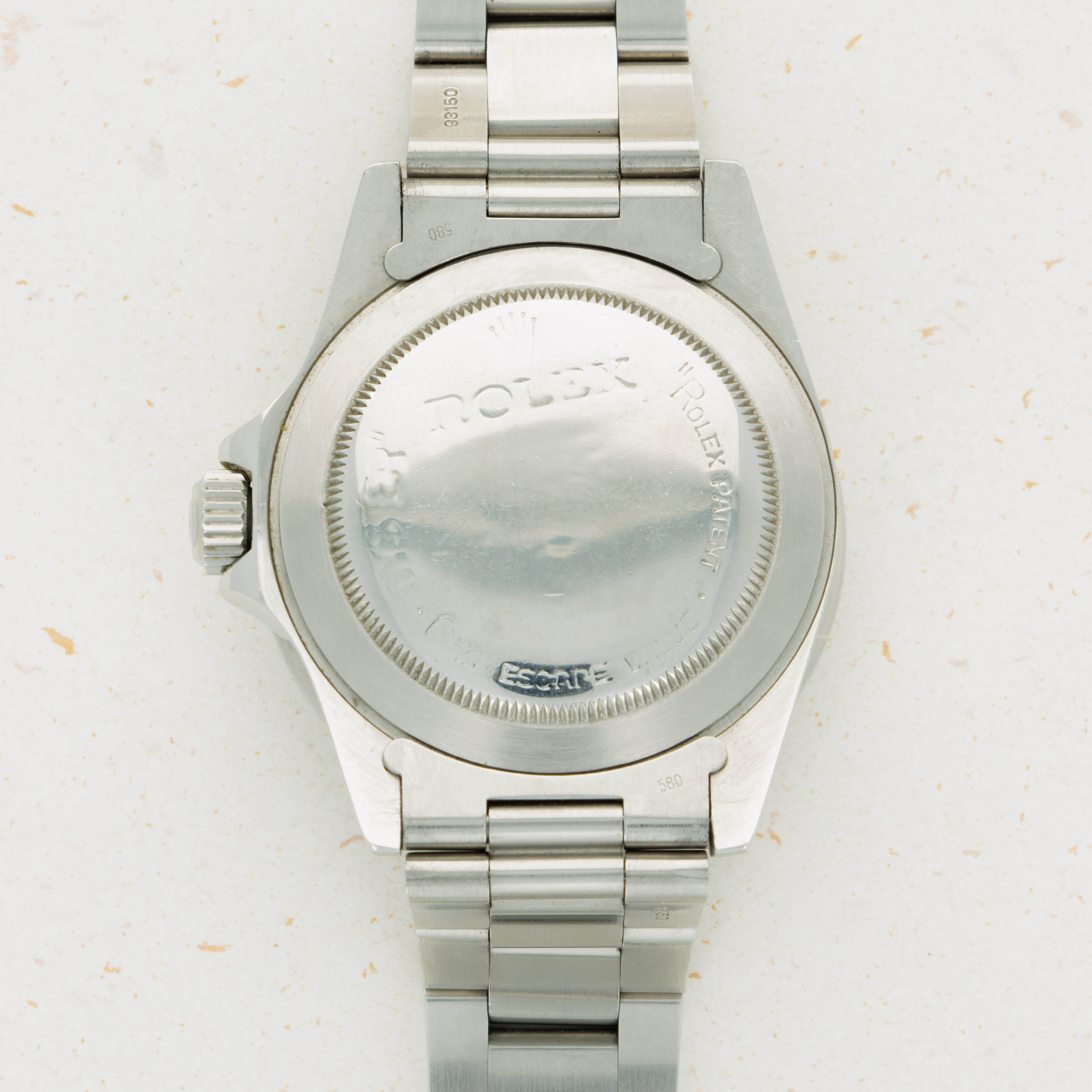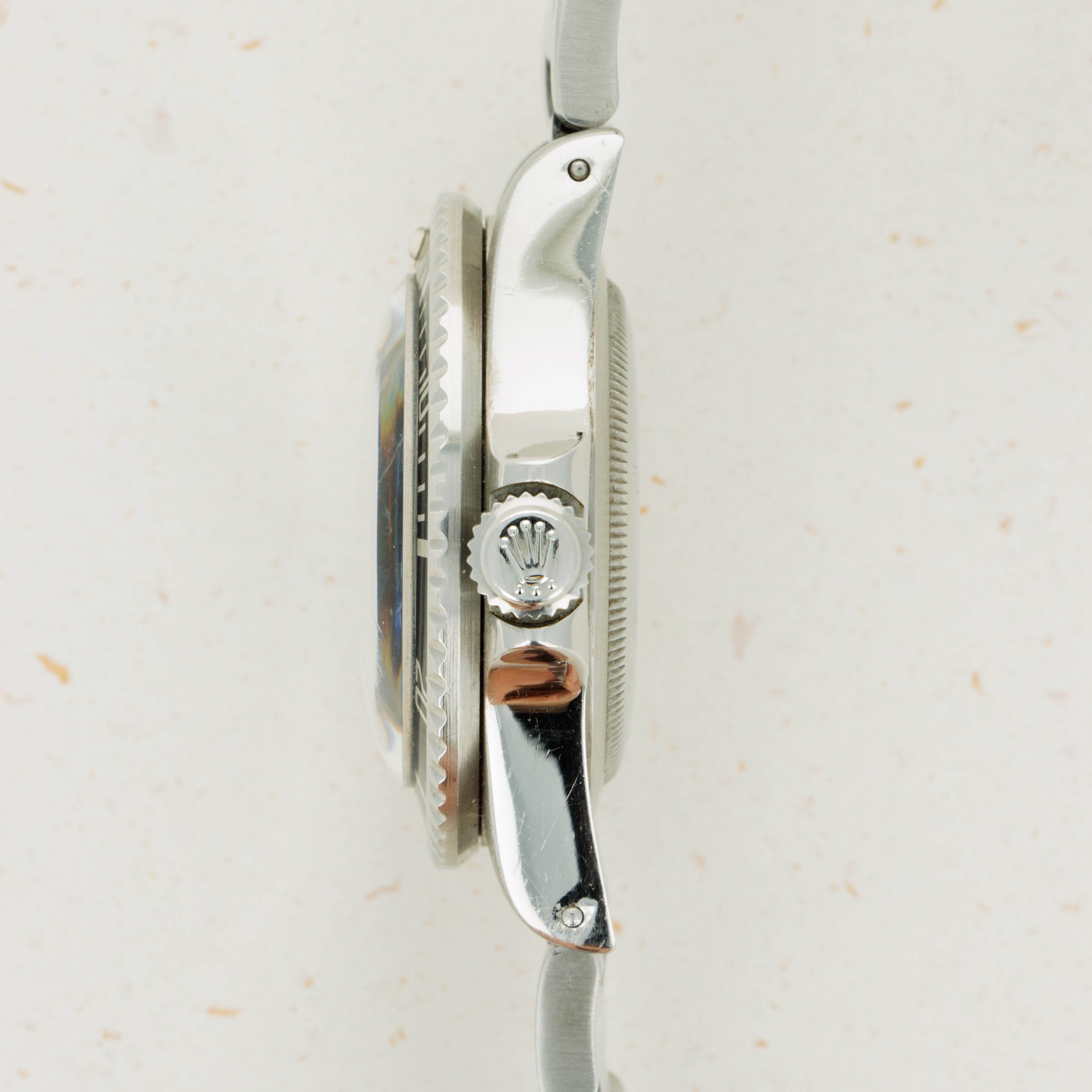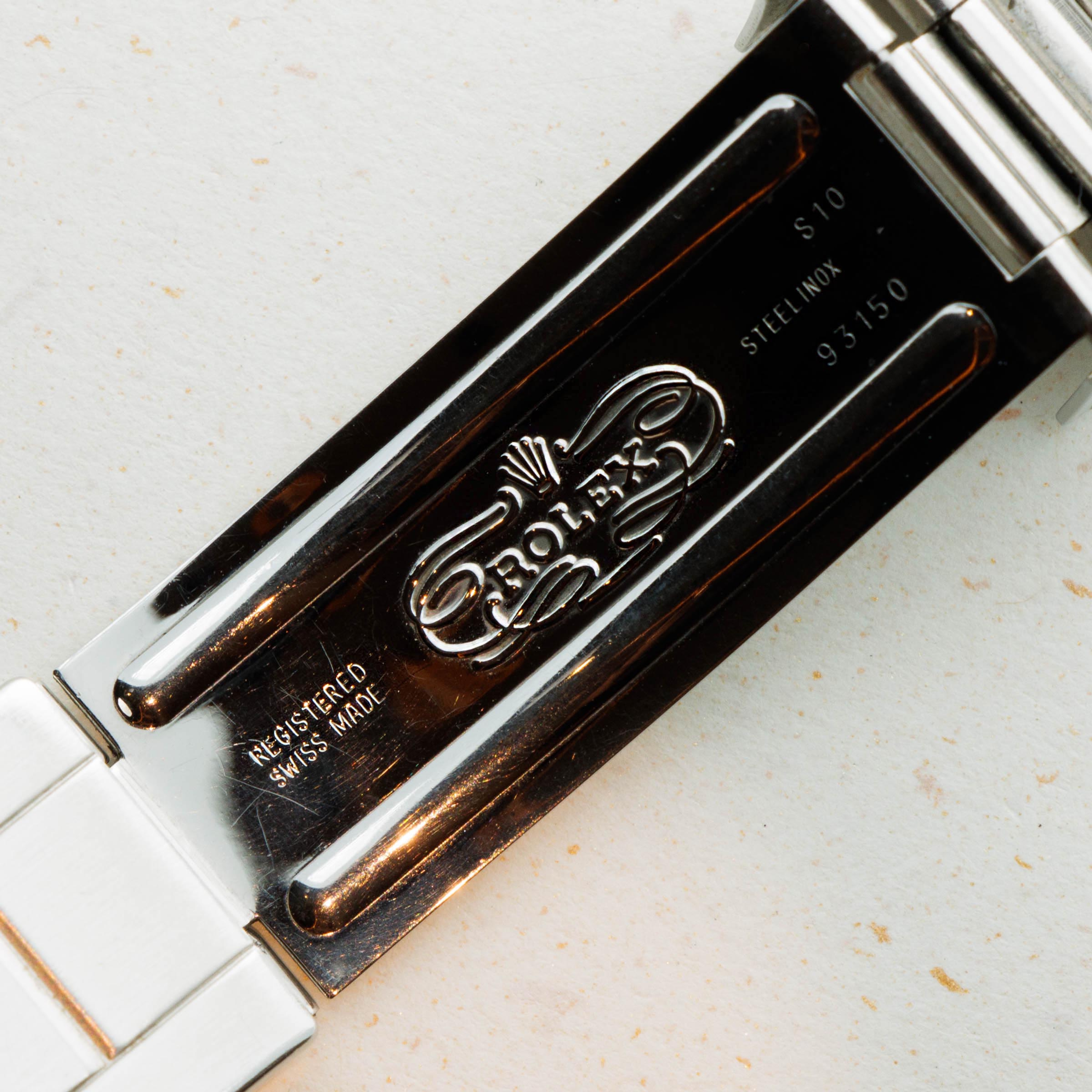 Watch is in good to very good overall condition. Case has been previously polished, exhibiting moderate wear. Caseback engravings are faint, having been worn and polished over time. Full serial number matching the case is engraved on the inside of the caseback. The dial is in very good condition, with a small chip at the edge at 6 o'clock but otherwise near-mint. Luminous is creamy and matches the hands perfectly. Slightly faded bezel insert with pearl still intact. The later solid link oyster bracelet has 11 links, 1 of which is removable. There is light stretch.