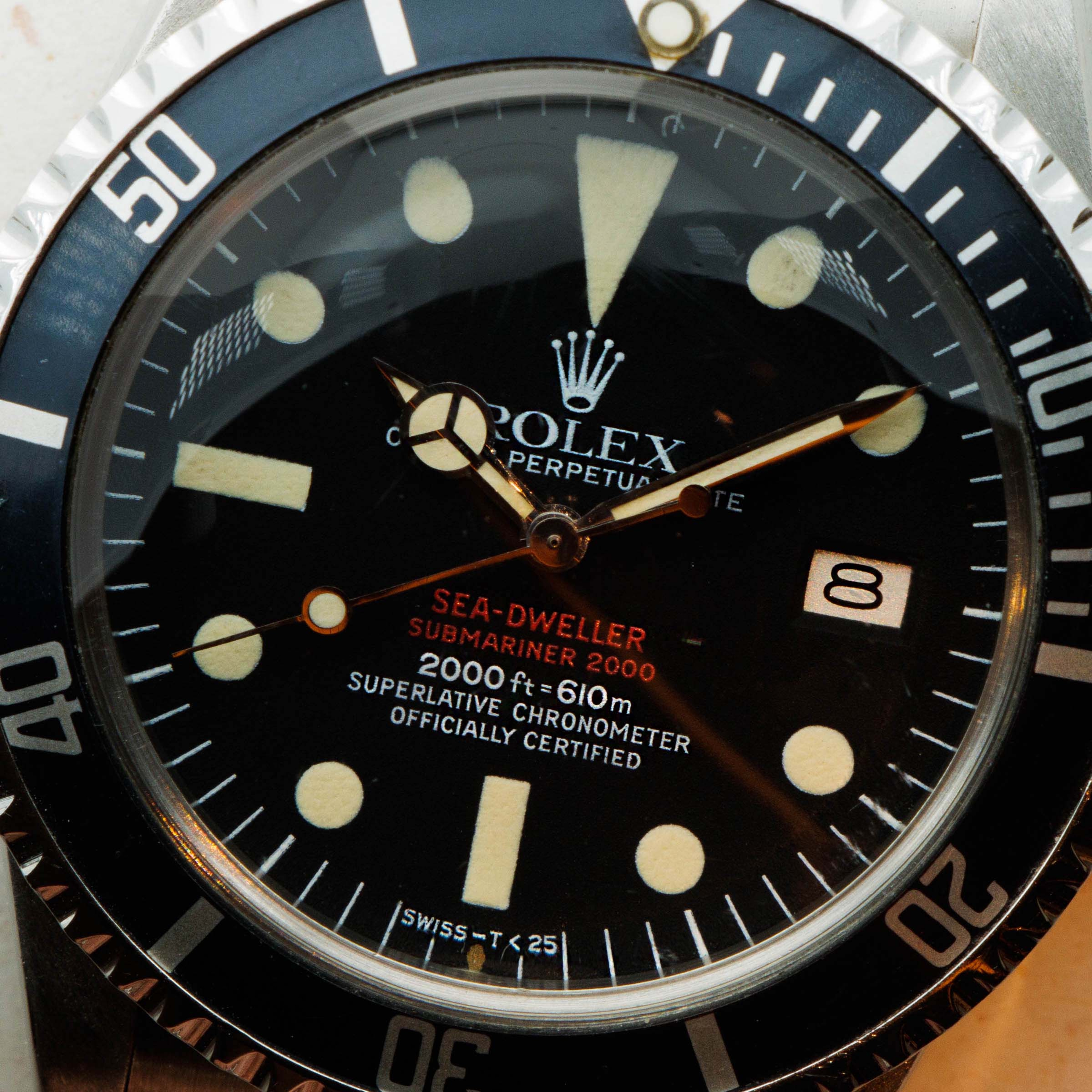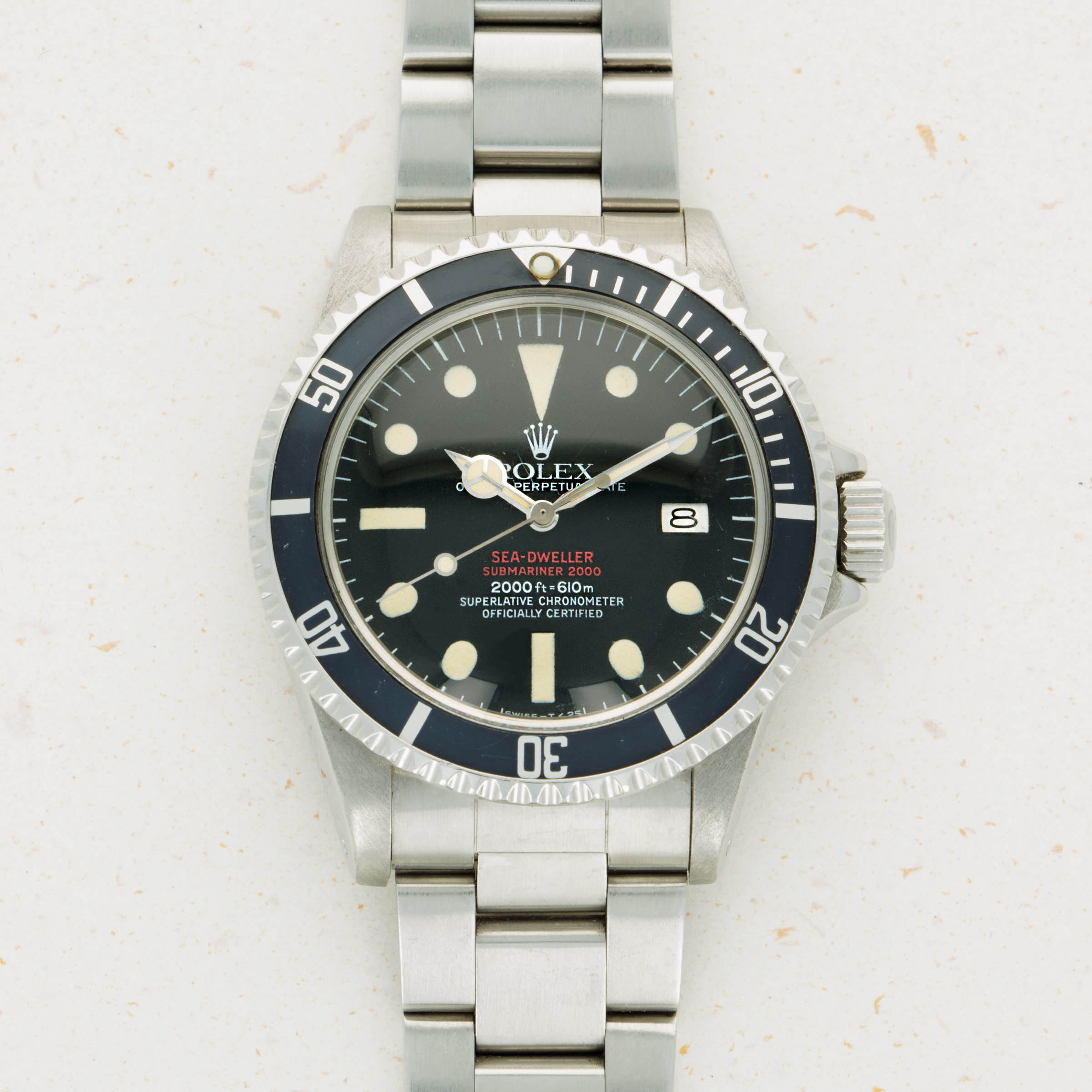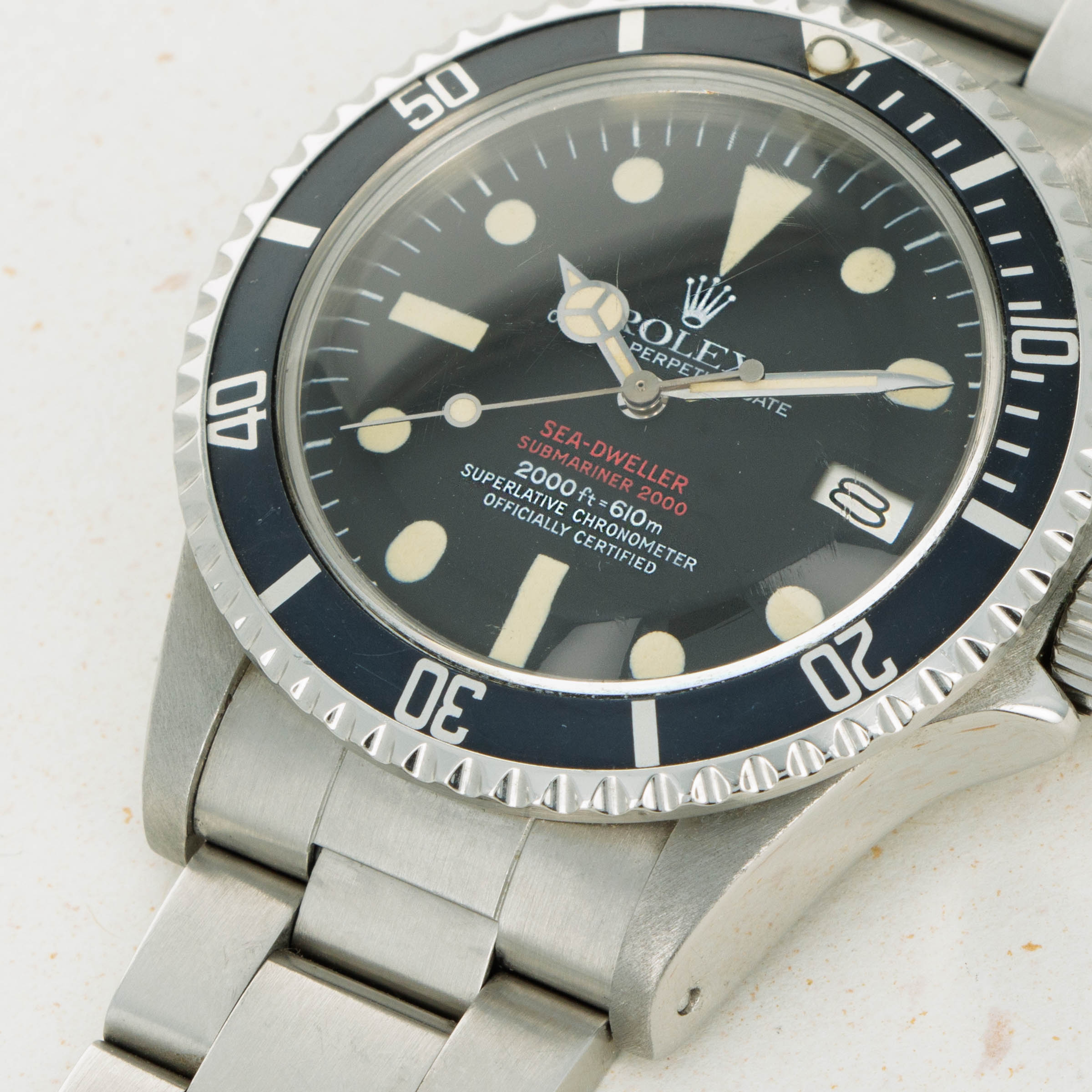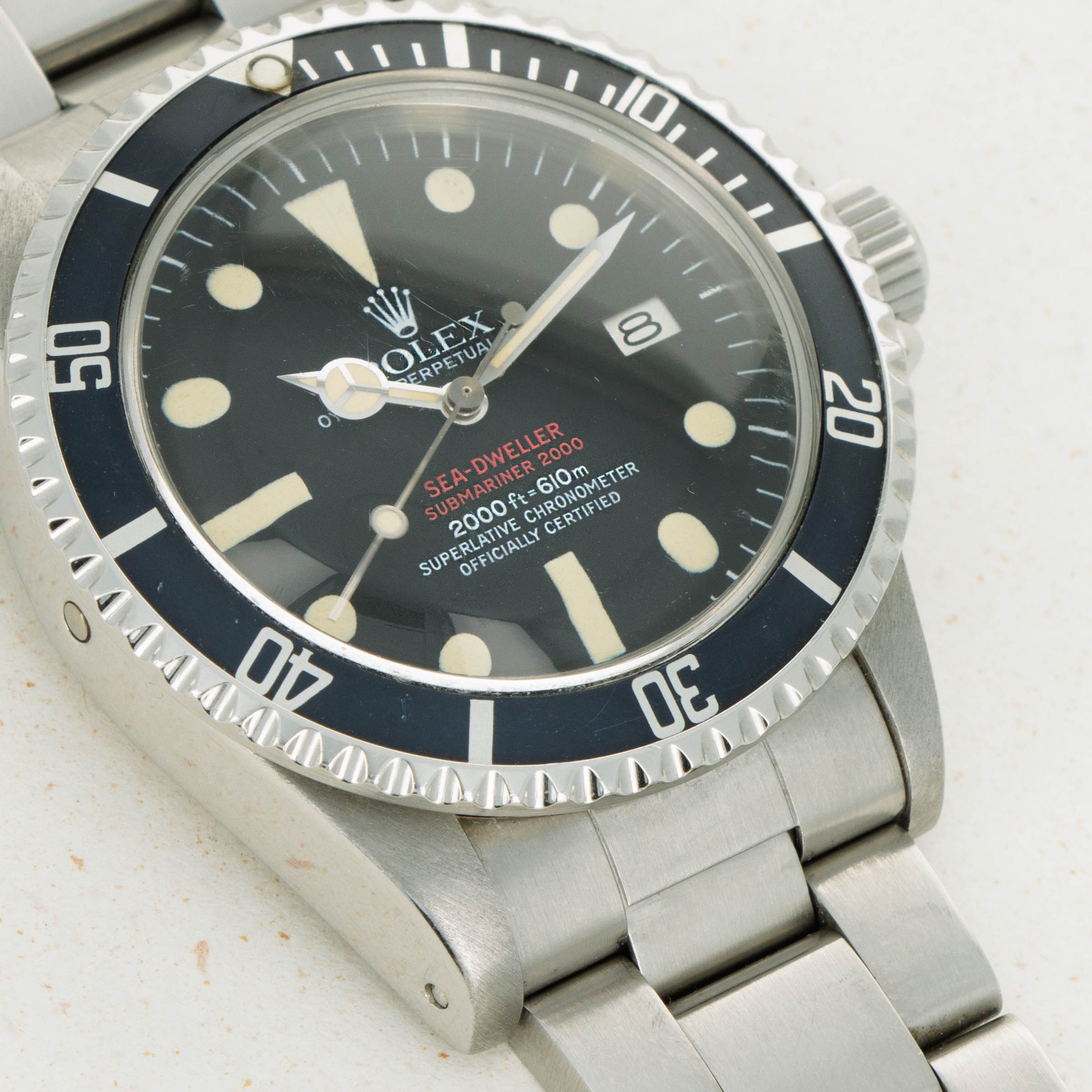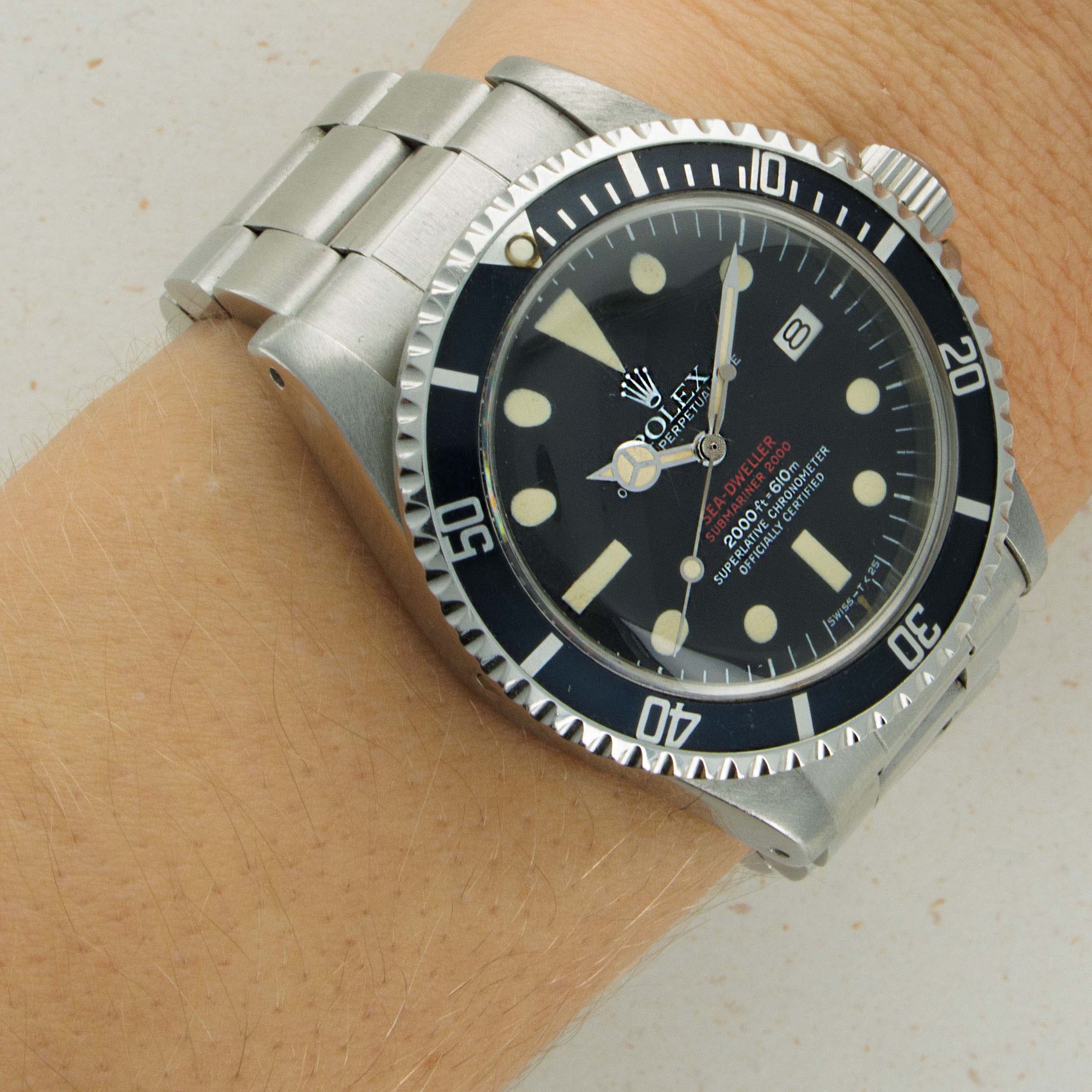 Featuring its iconic double red Mk4 dial, this example was amongst the last batch of double red Sea-Dwellers as the Mk4 dial was followed by the plain white inscription dial that also lost the "Submariner" distinction.