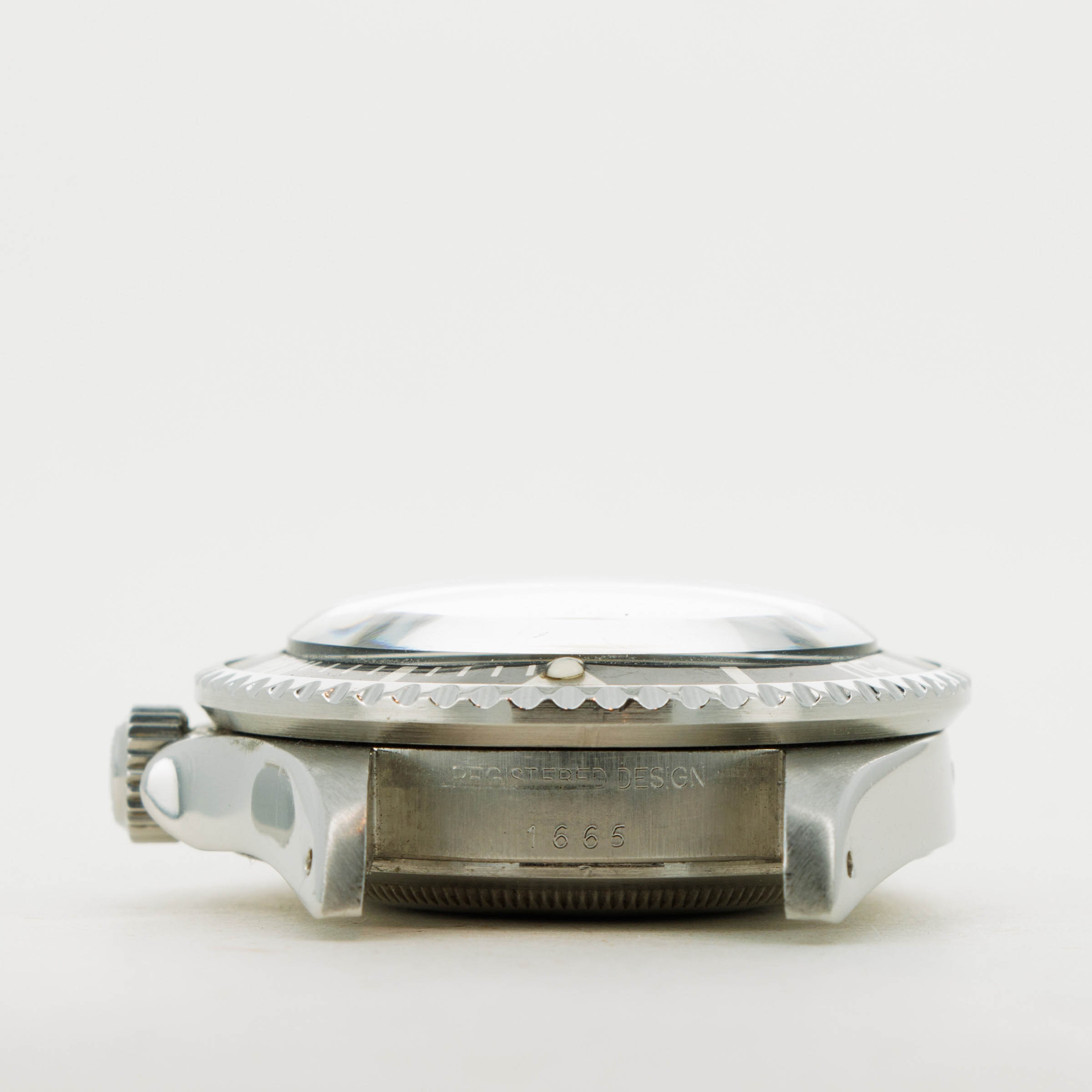 An imposing watch on account of its intended use as a tool watch for divers, the ref. 1665 is tall on the wrist thanks to its revolutionary HEV and domed crystal.