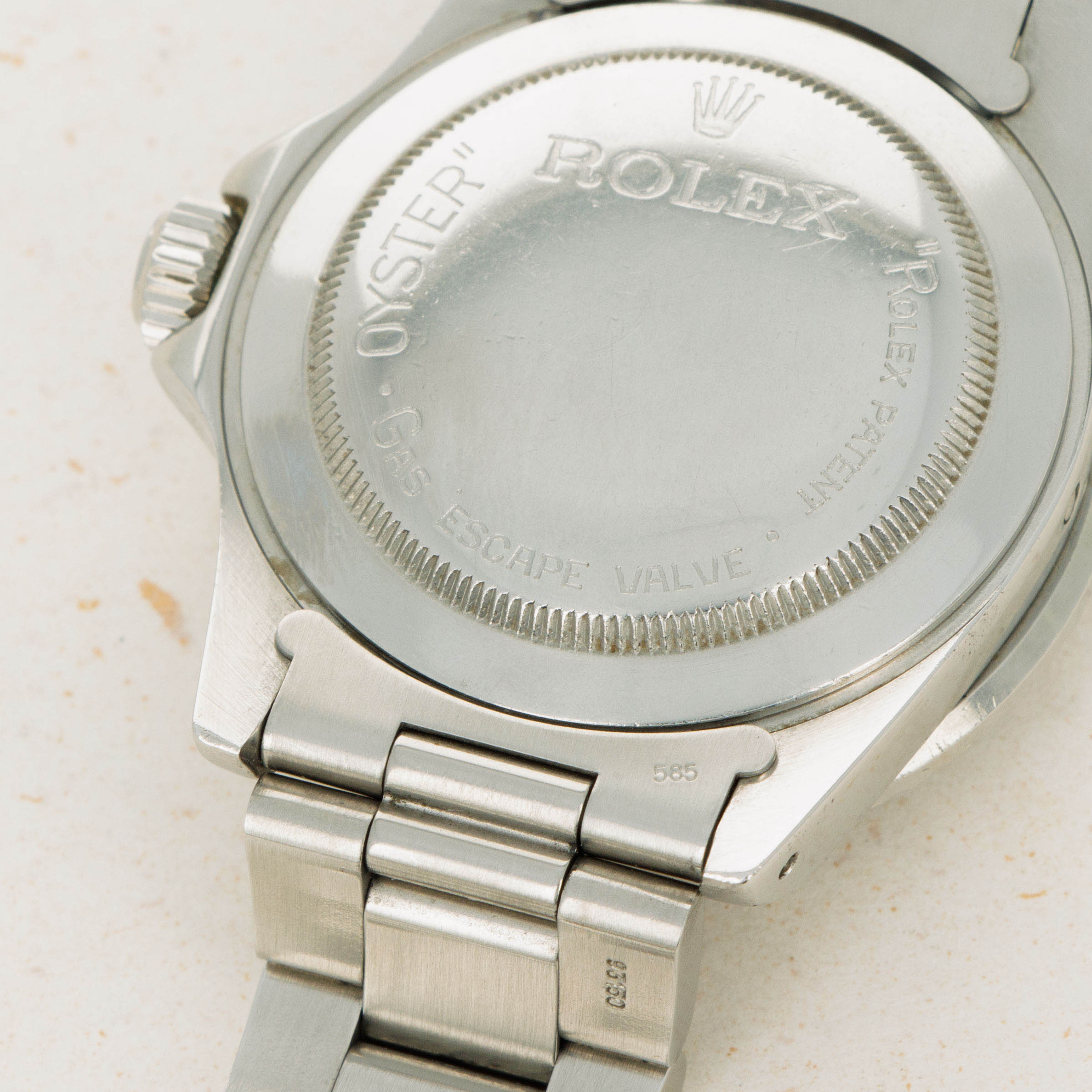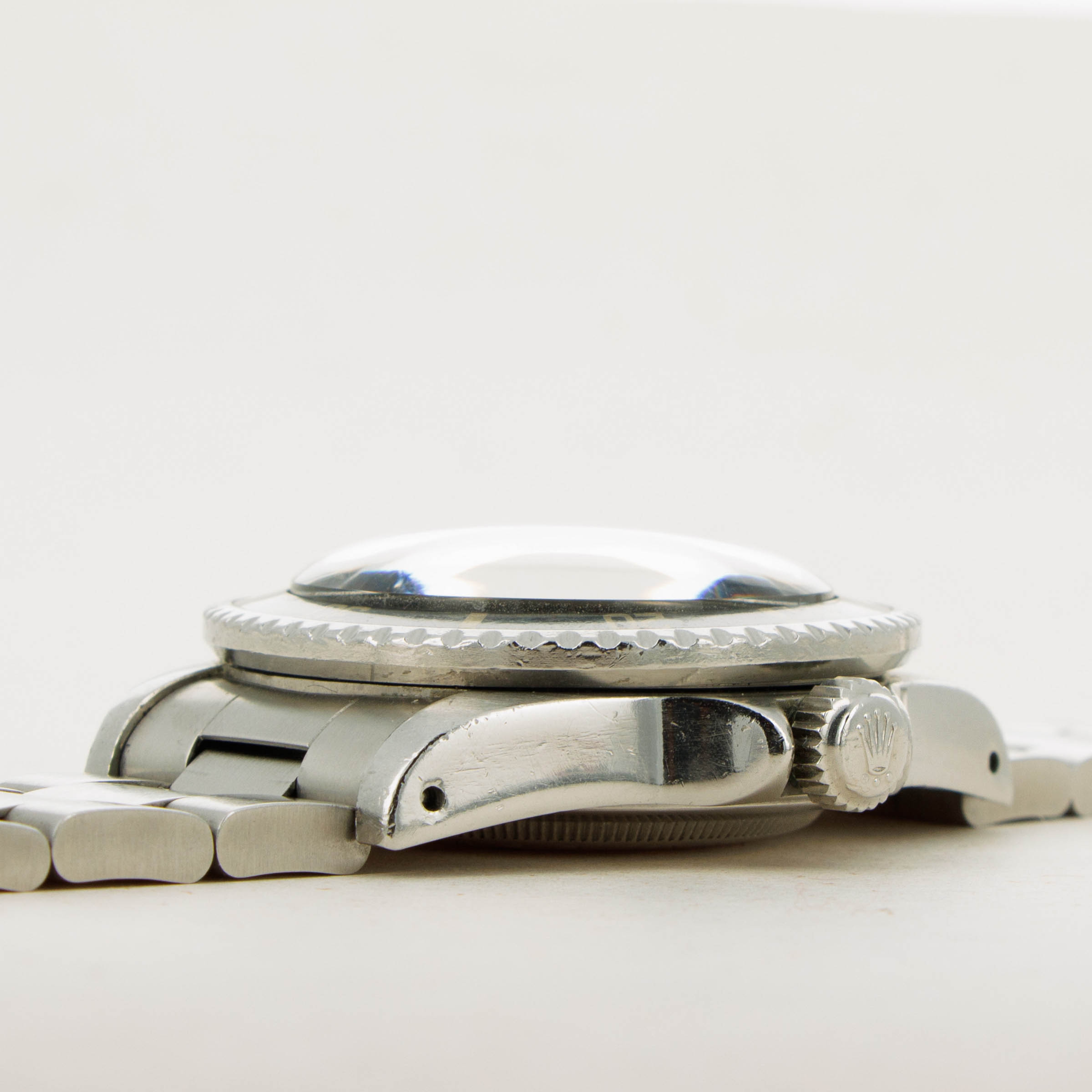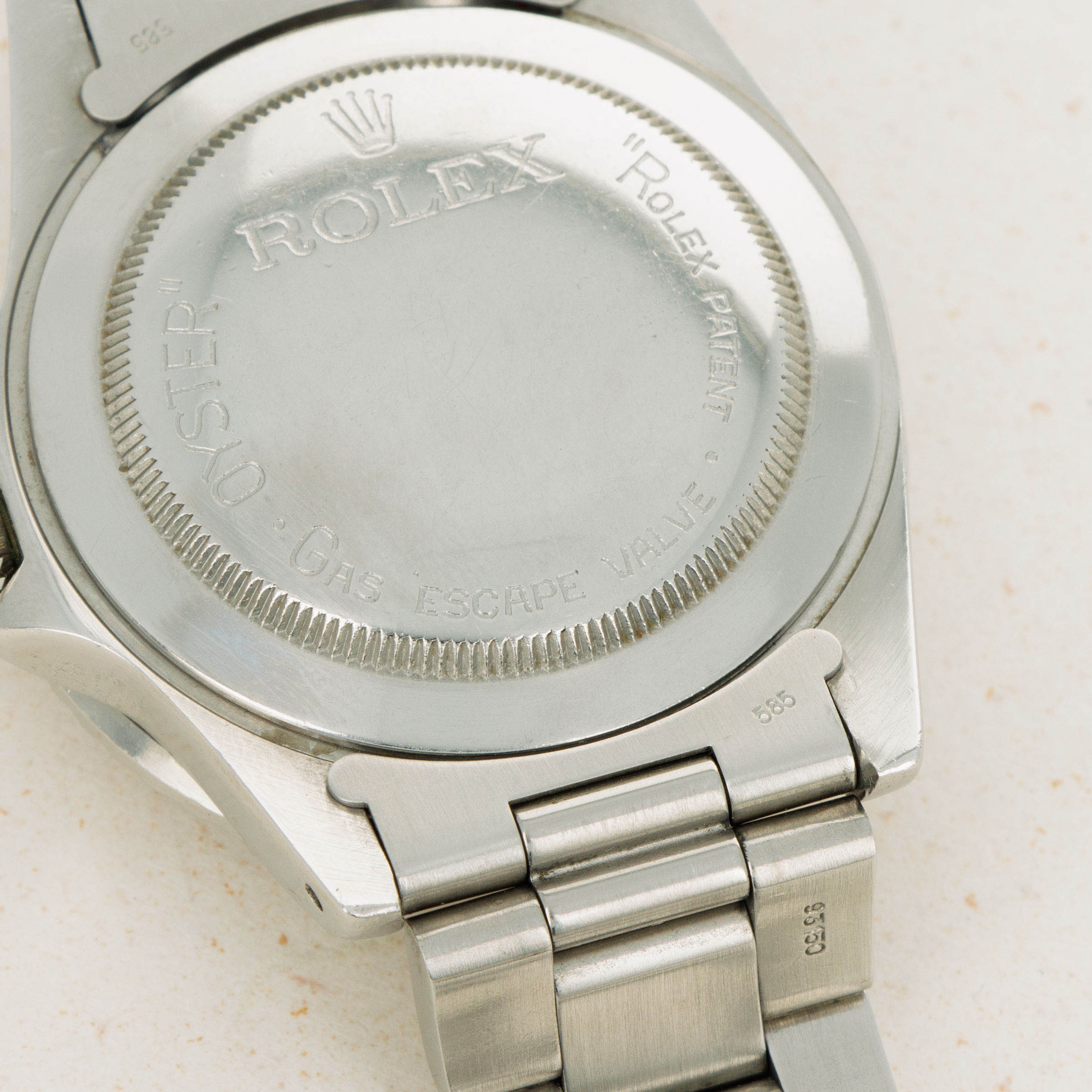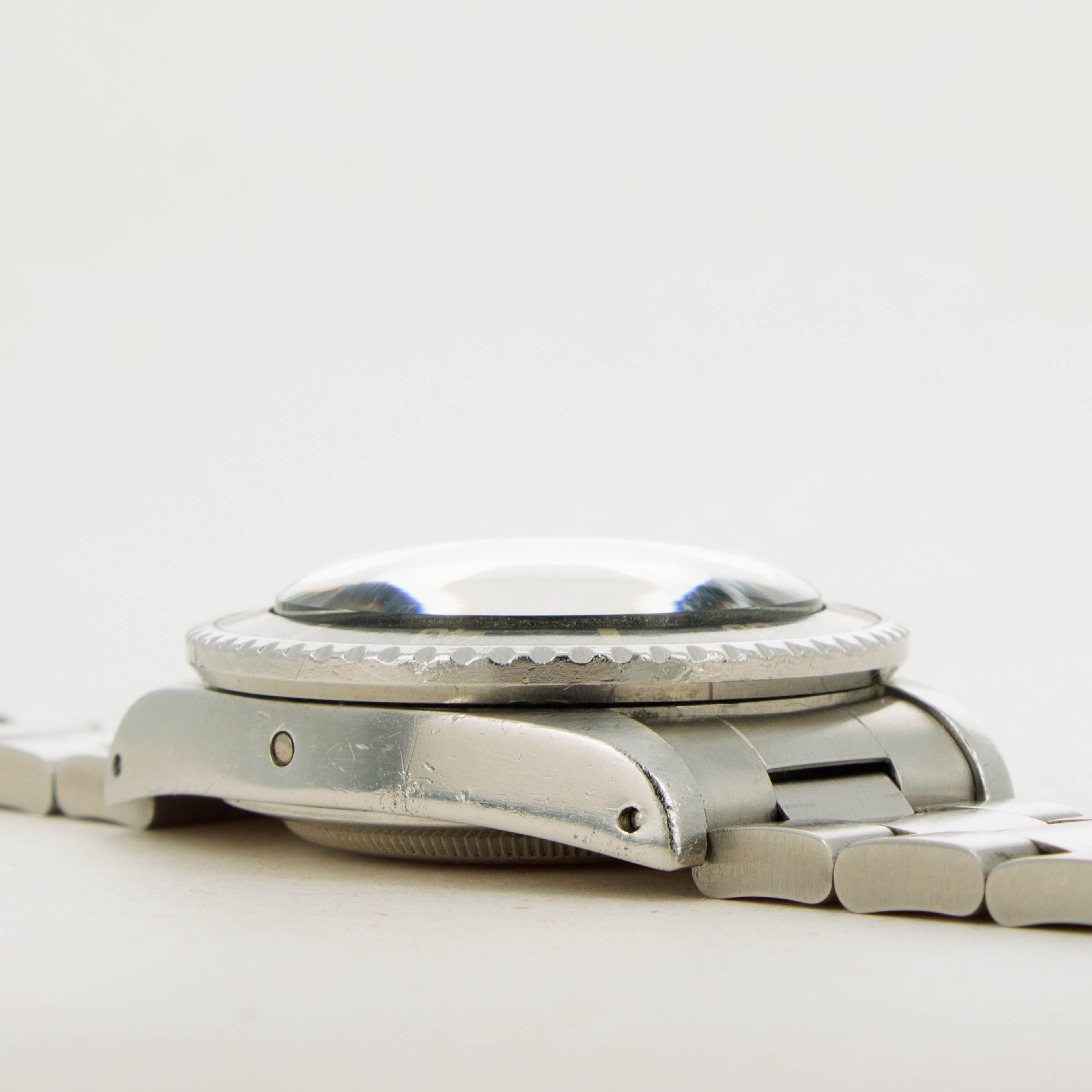 Watch is in excellent overall condition Case has some signs of wear including surface marks and scratches. Lugs are thick and full, but have soft edges. The dial is in excellent condition, with a tiny chip visible on the 55 minute hash mark. Luminous indexes on the dial are slightly darker than the hands and pearl on the faded bezel insert. Caseback has the full serial number engraved inside as it should. Watch comes on a solid oyster bracelet with the correct 585 endpieces and an "I" clasp dating it to 1984. Bracelet has 12 links, 2 removable. There is light stretch.