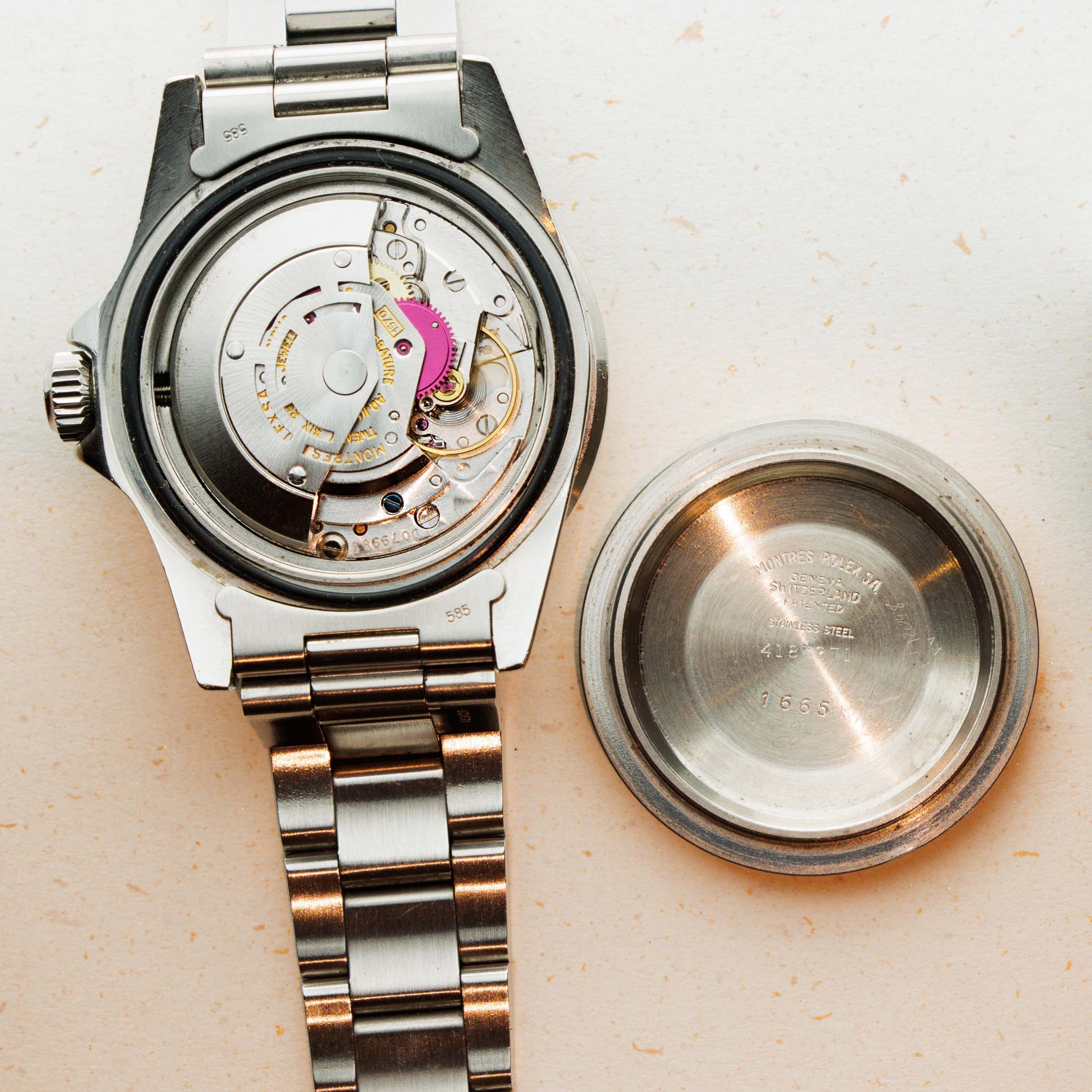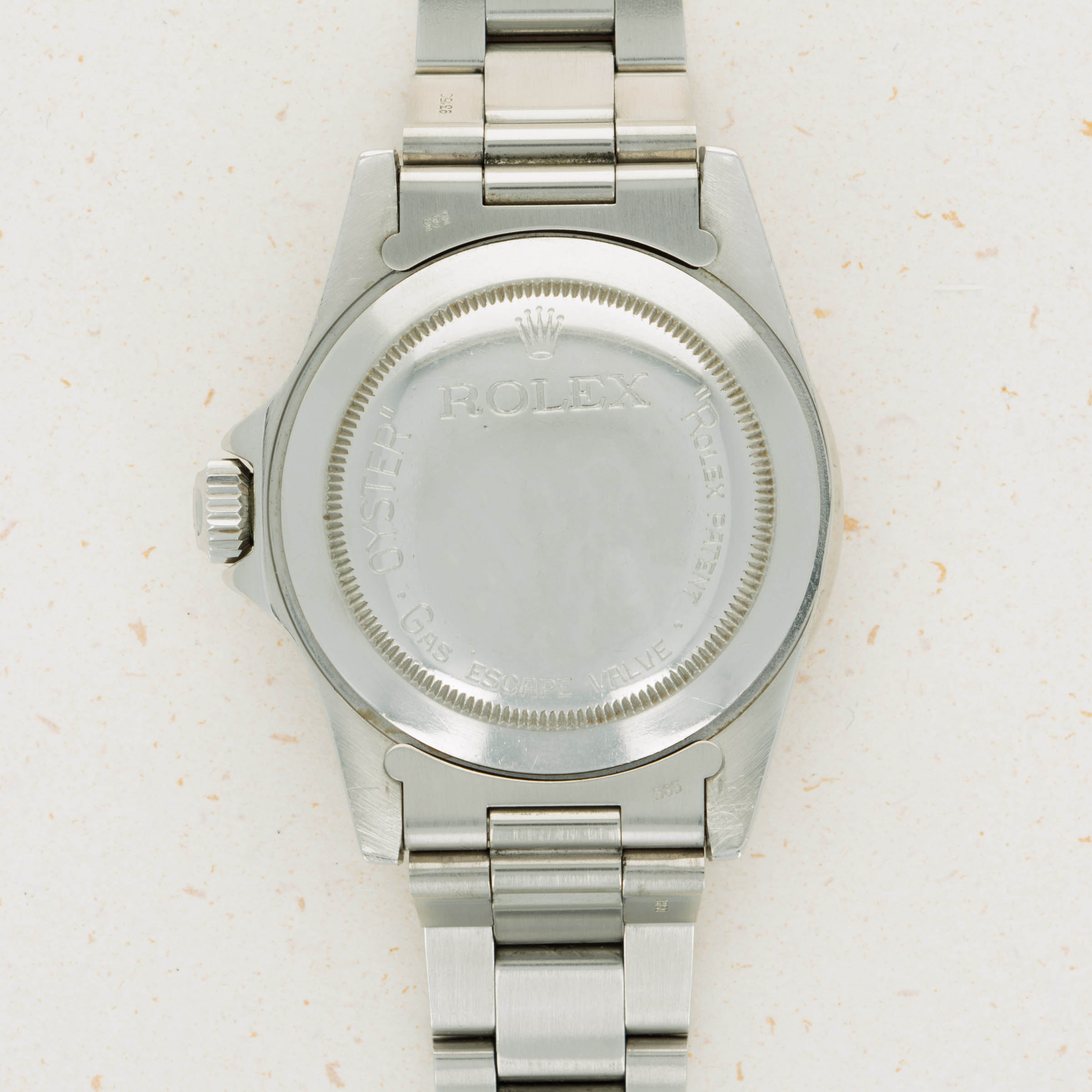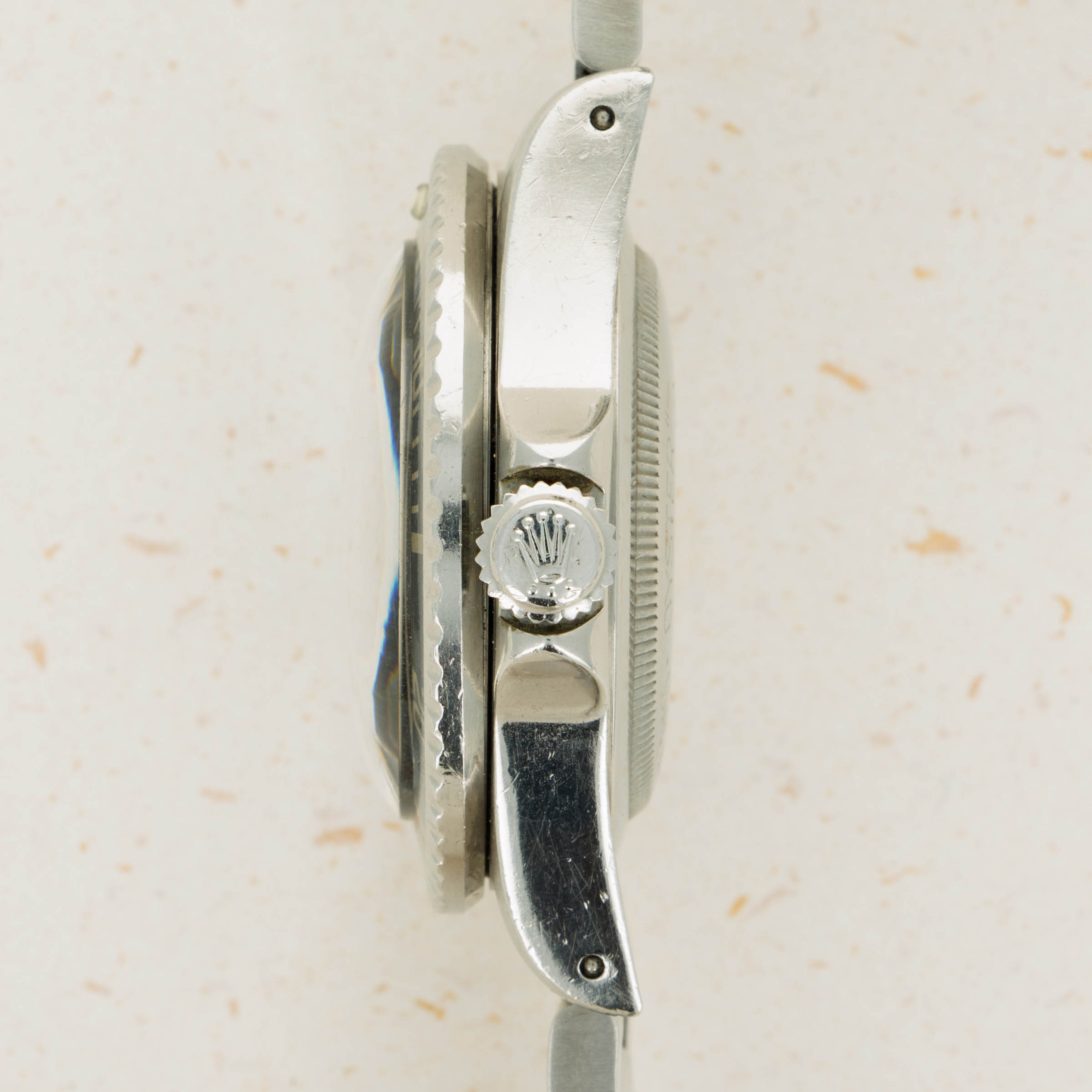 Watch is in excellent overall condition Case has some signs of wear including surface marks and scratches. Lugs are thick and full, but have soft edges. The dial is in excellent condition, with a tiny chip visible on the 55 minute hash mark. Luminous indexes on the dial are slightly darker than the hands and pearl on the faded bezel insert. Caseback has the full serial number engraved inside as it should. Watch comes on a solid oyster bracelet with the correct 585 endpieces and an "I" clasp dating it to 1984. Bracelet has 12 links, 2 removable. There is light stretch.