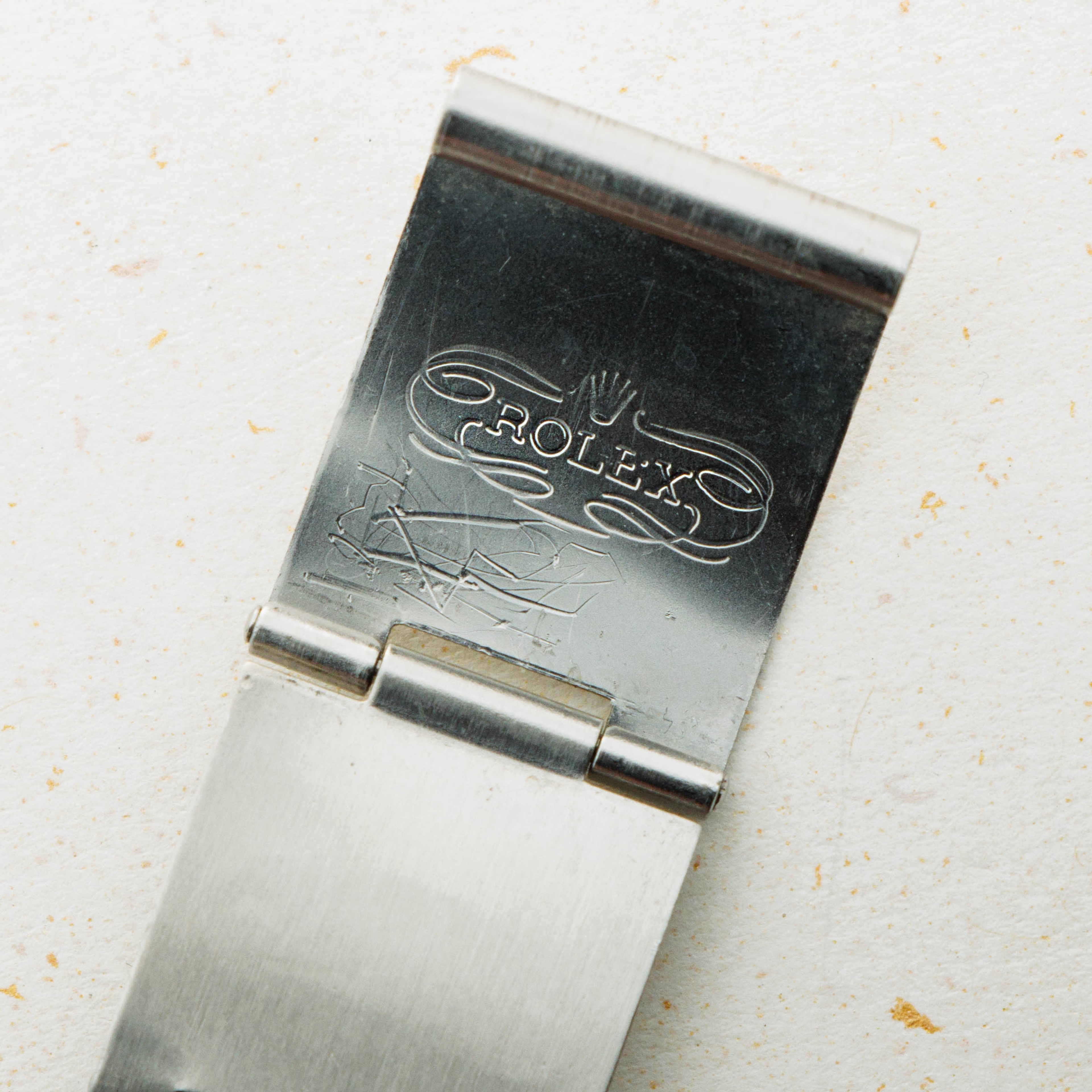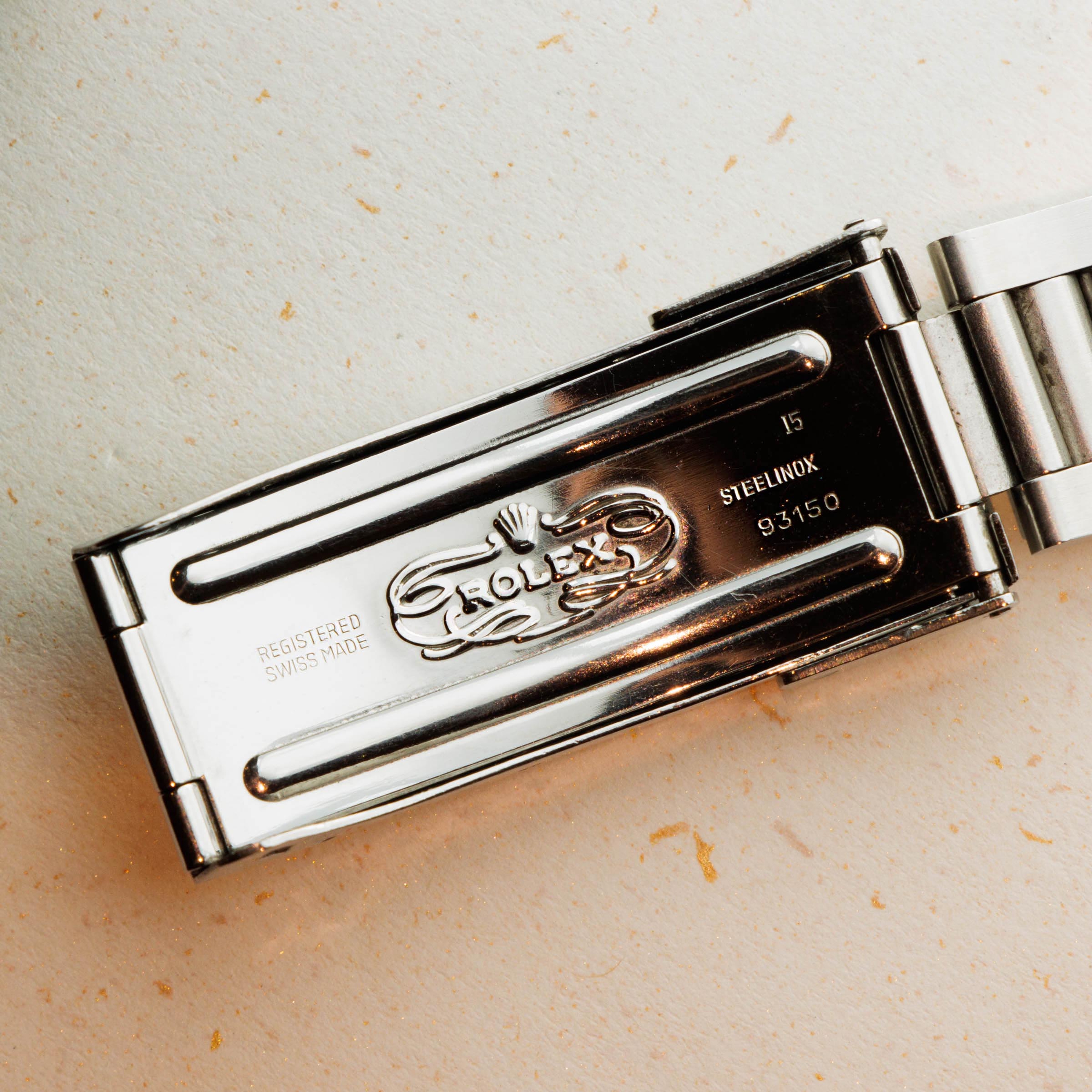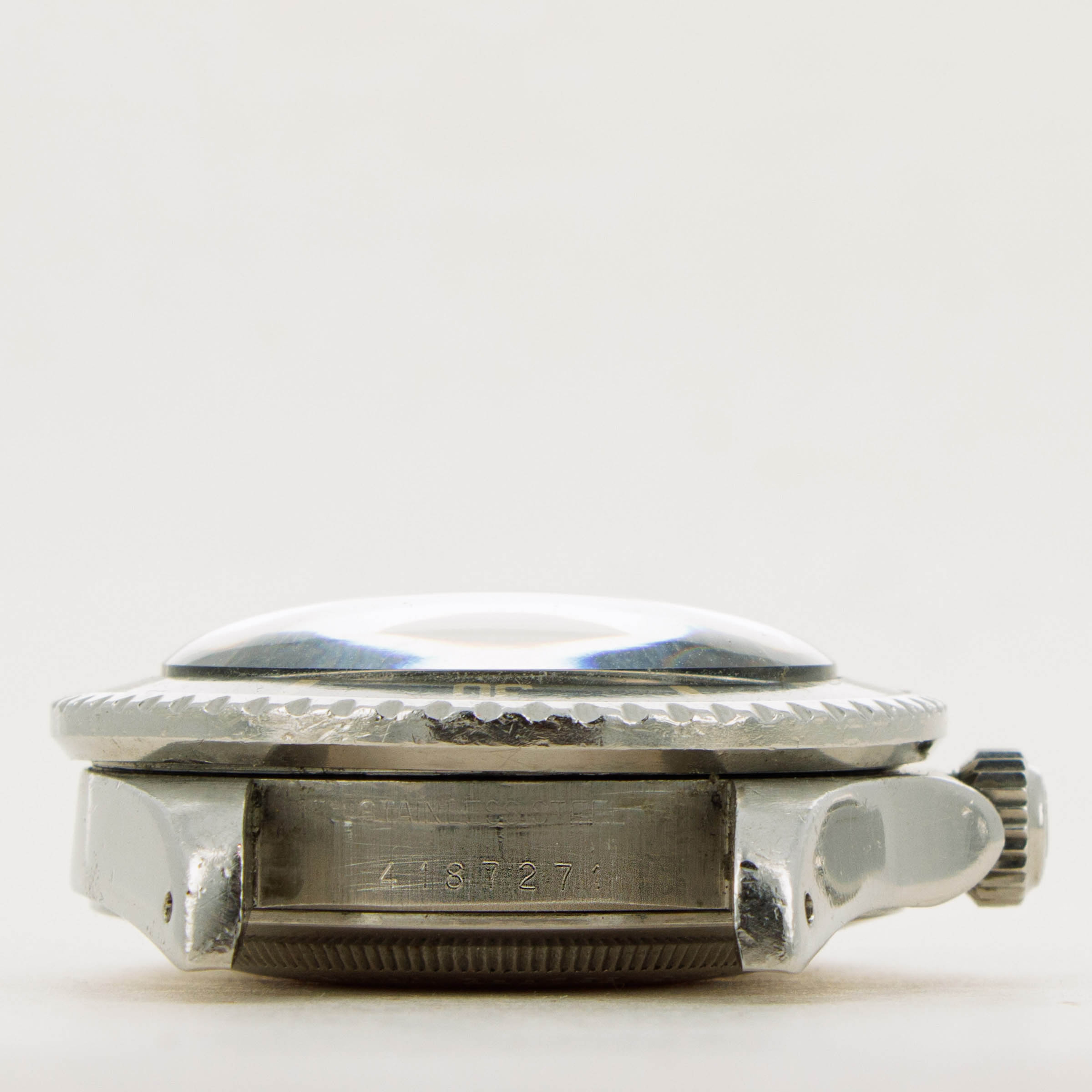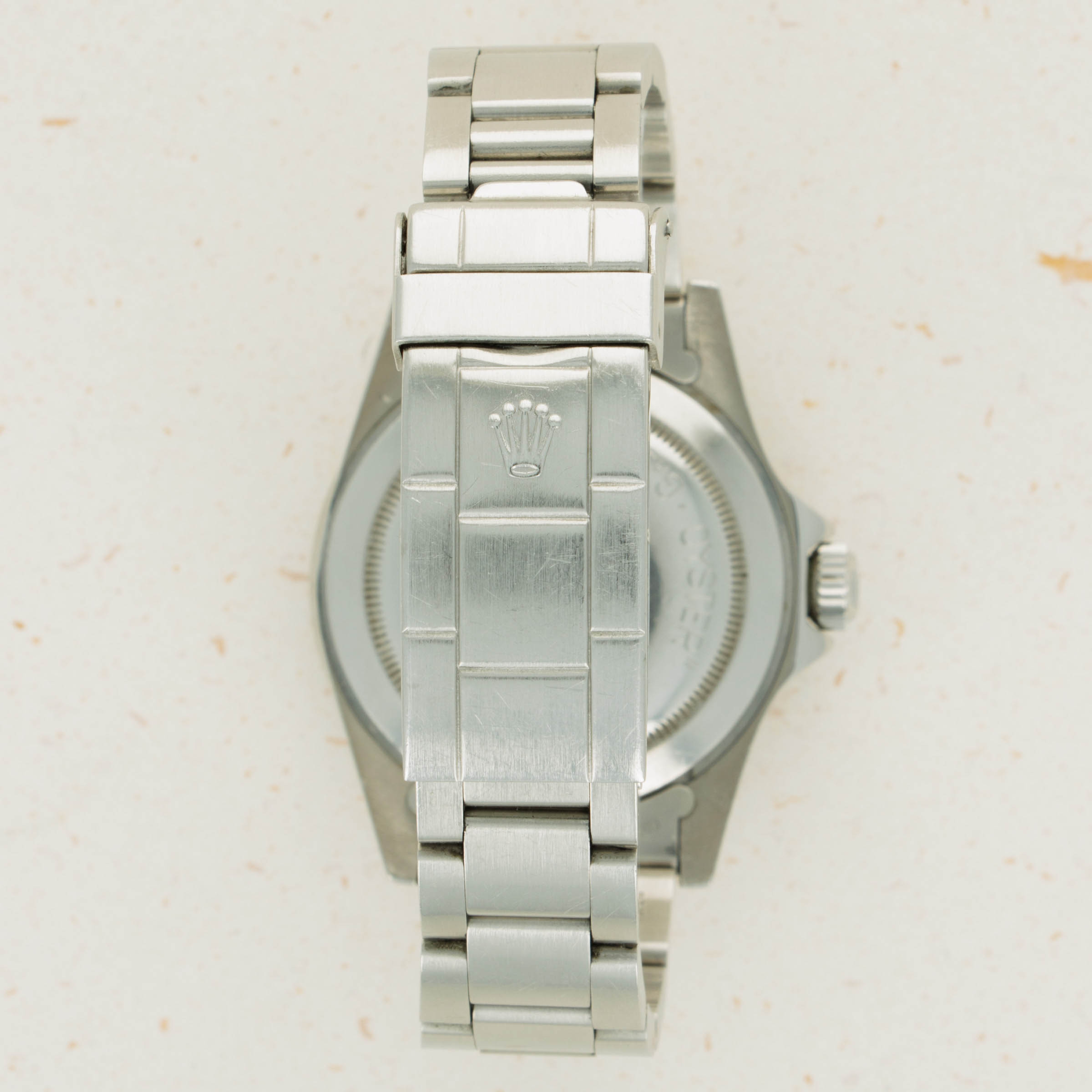 Watch is in excellent overall condition Case has some signs of wear including surface marks and scratches. Lugs are thick and full, but have soft edges. The dial is in excellent condition, with a tiny chip visible on the 55 minute hash mark. Luminous indexes on the dial are slightly darker than the hands and pearl on the faded bezel insert. Caseback has the full serial number engraved inside as it should. Watch comes on a solid oyster bracelet with the correct 585 endpieces and an "I" clasp dating it to 1984. Bracelet has 12 links, 2 removable. There is light stretch.