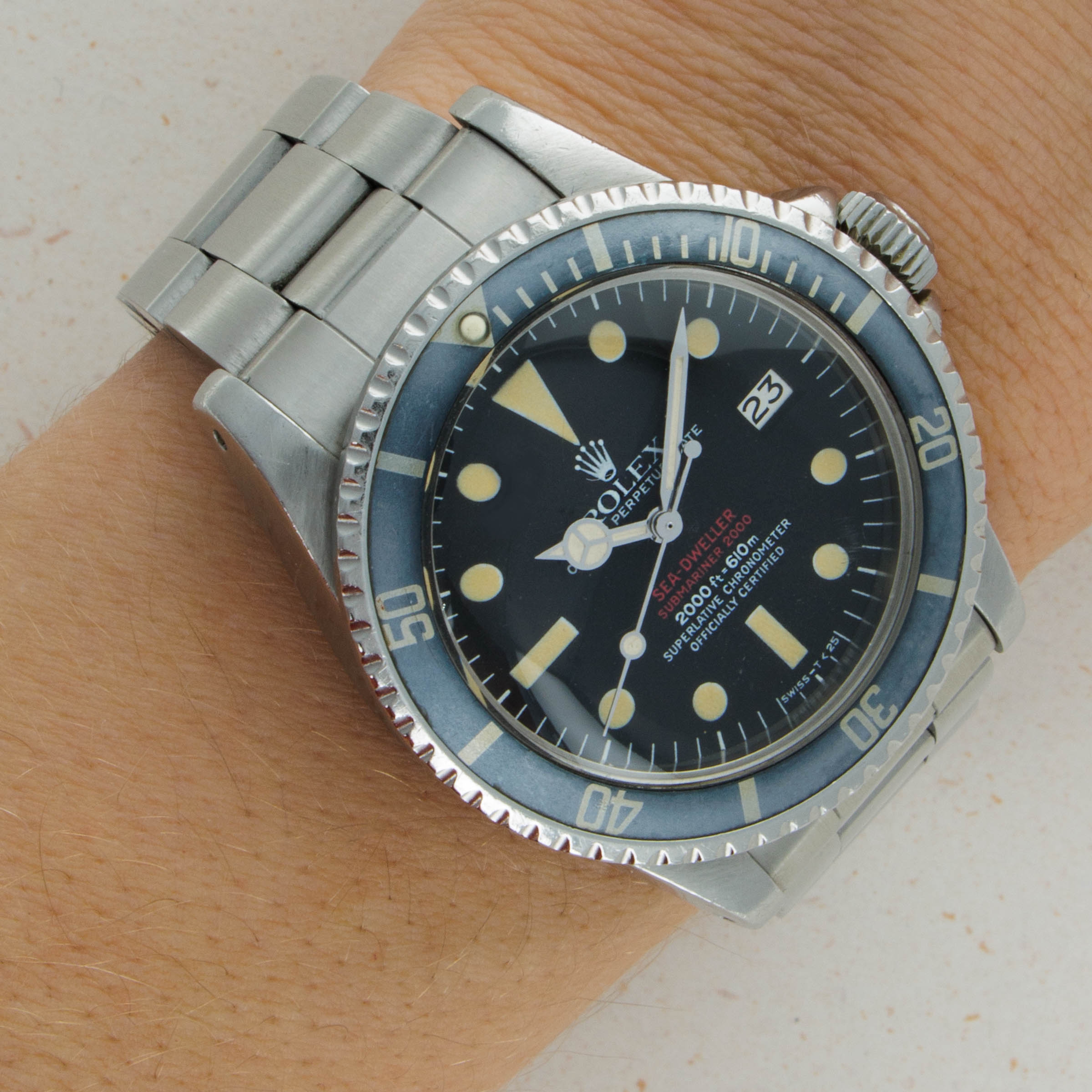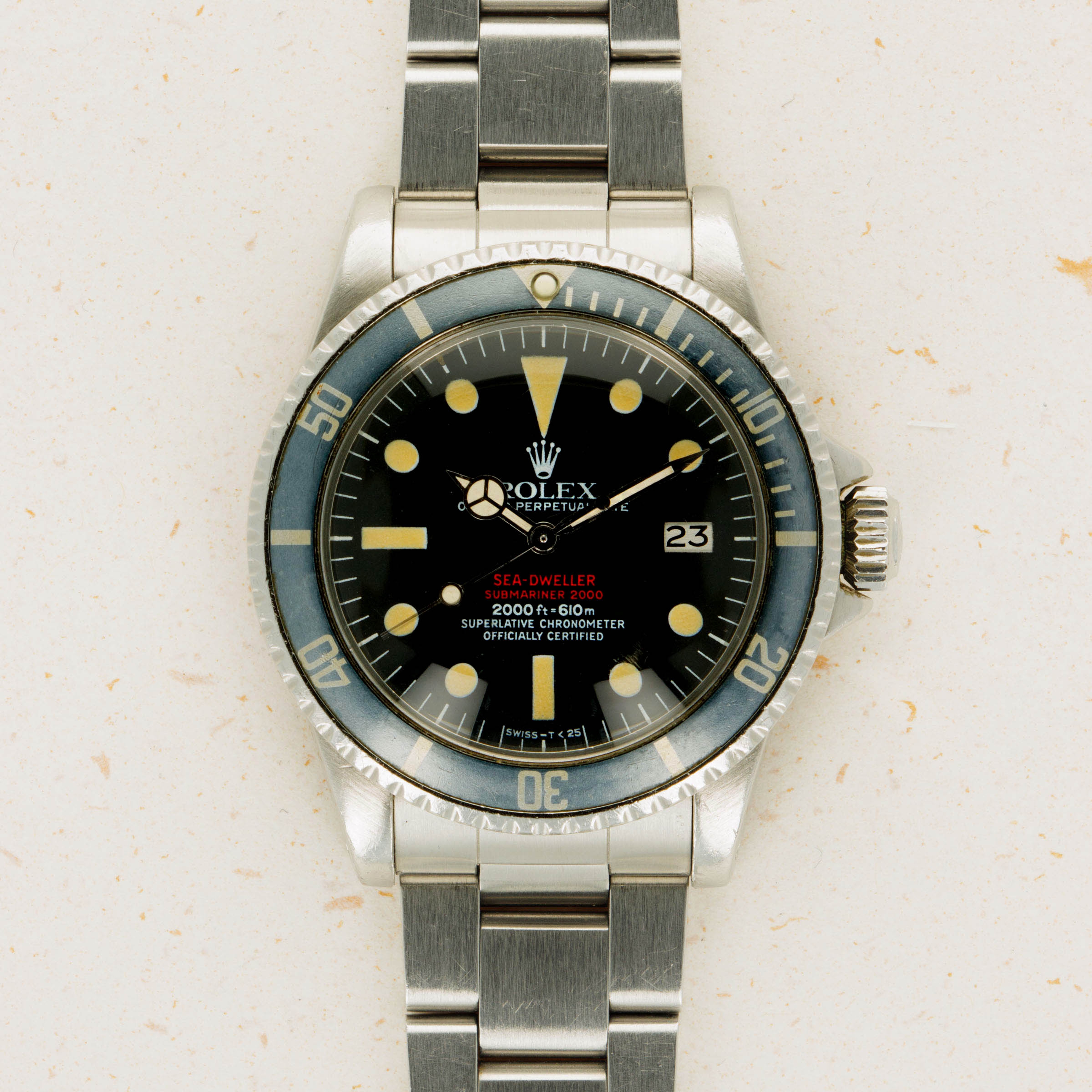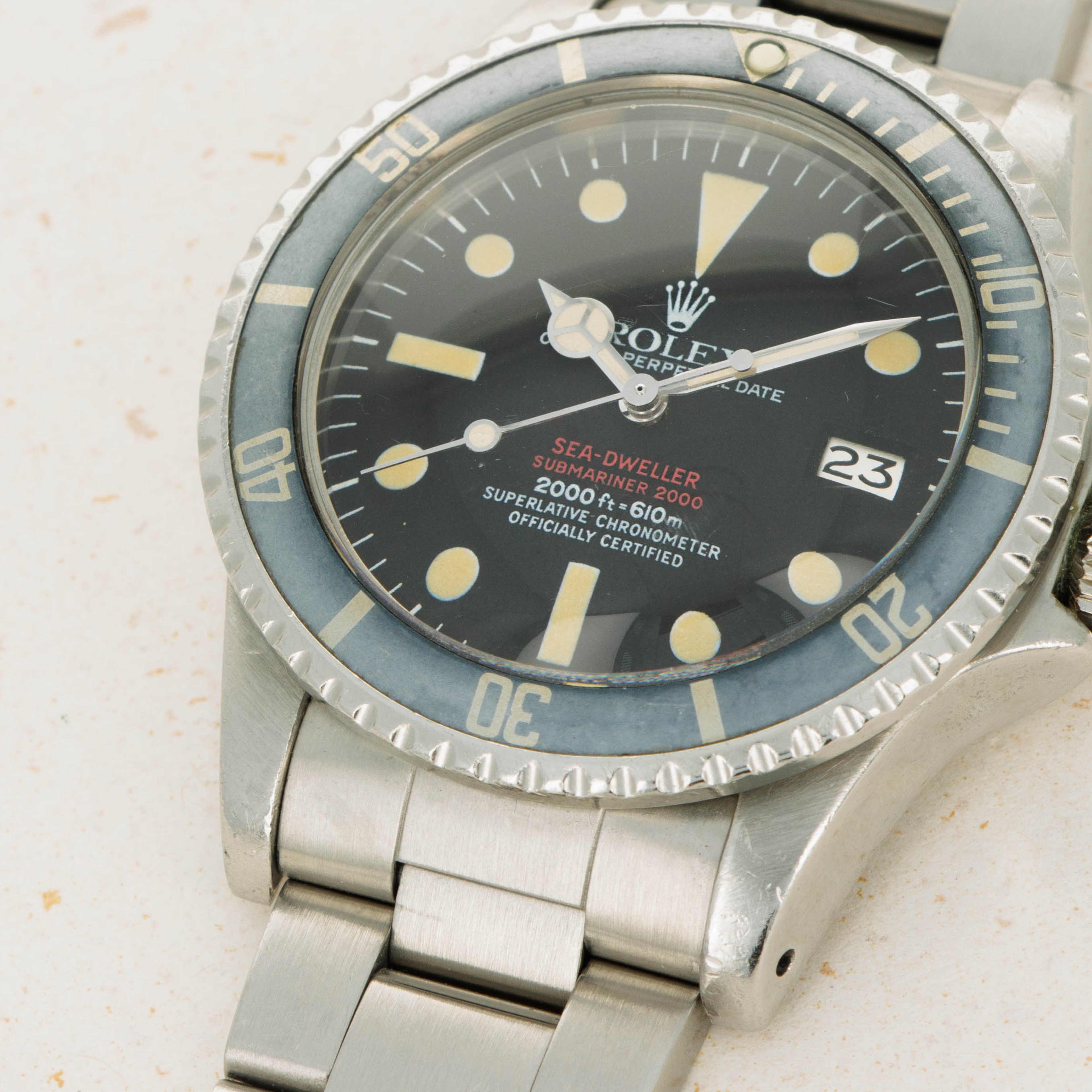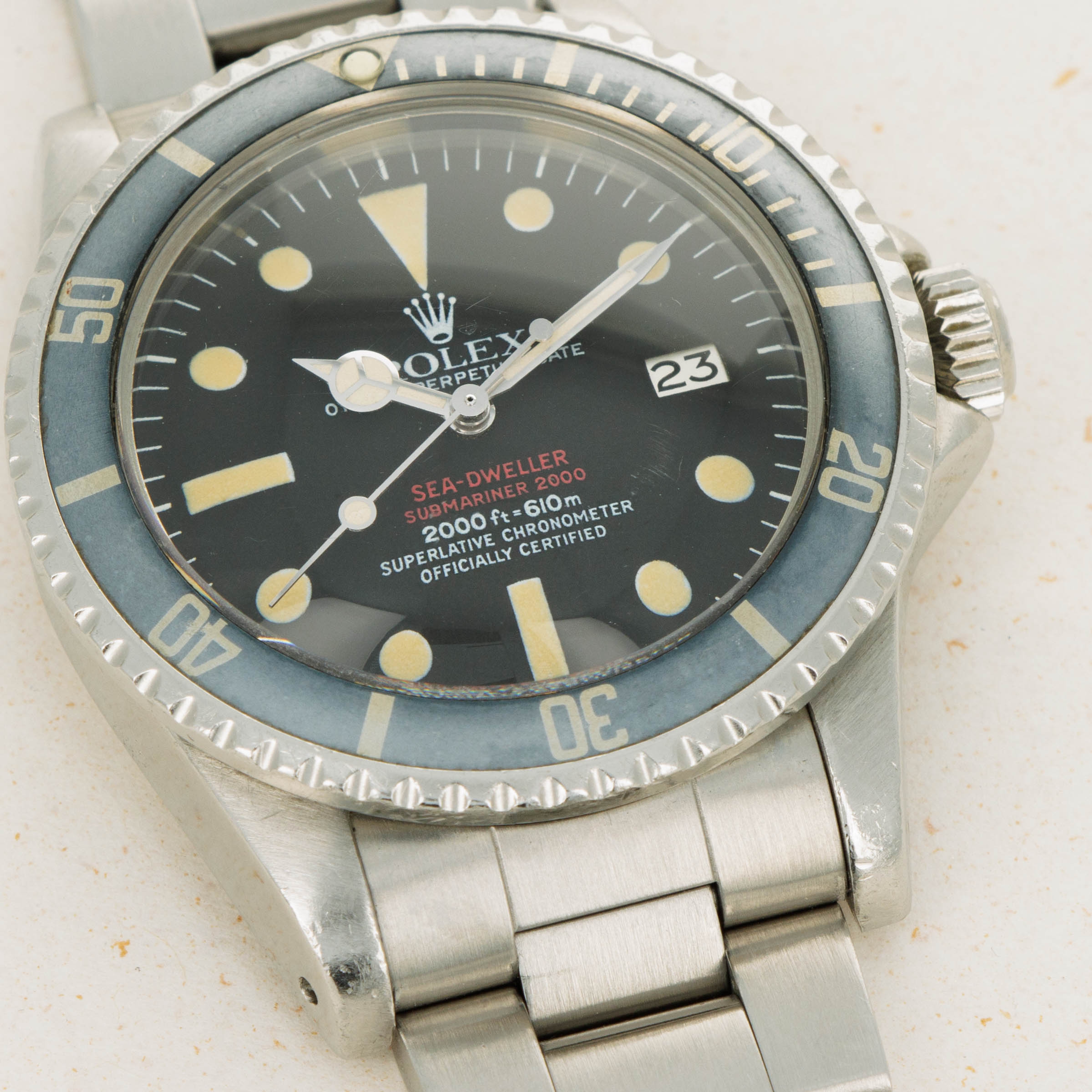 Featuring its iconic double red Mk4 dial, this example was amongst the last batch of double red Sea-Dwellers as the Mk4 dial was followed by the plain white inscription dial that also lost the "Submariner" distinction.