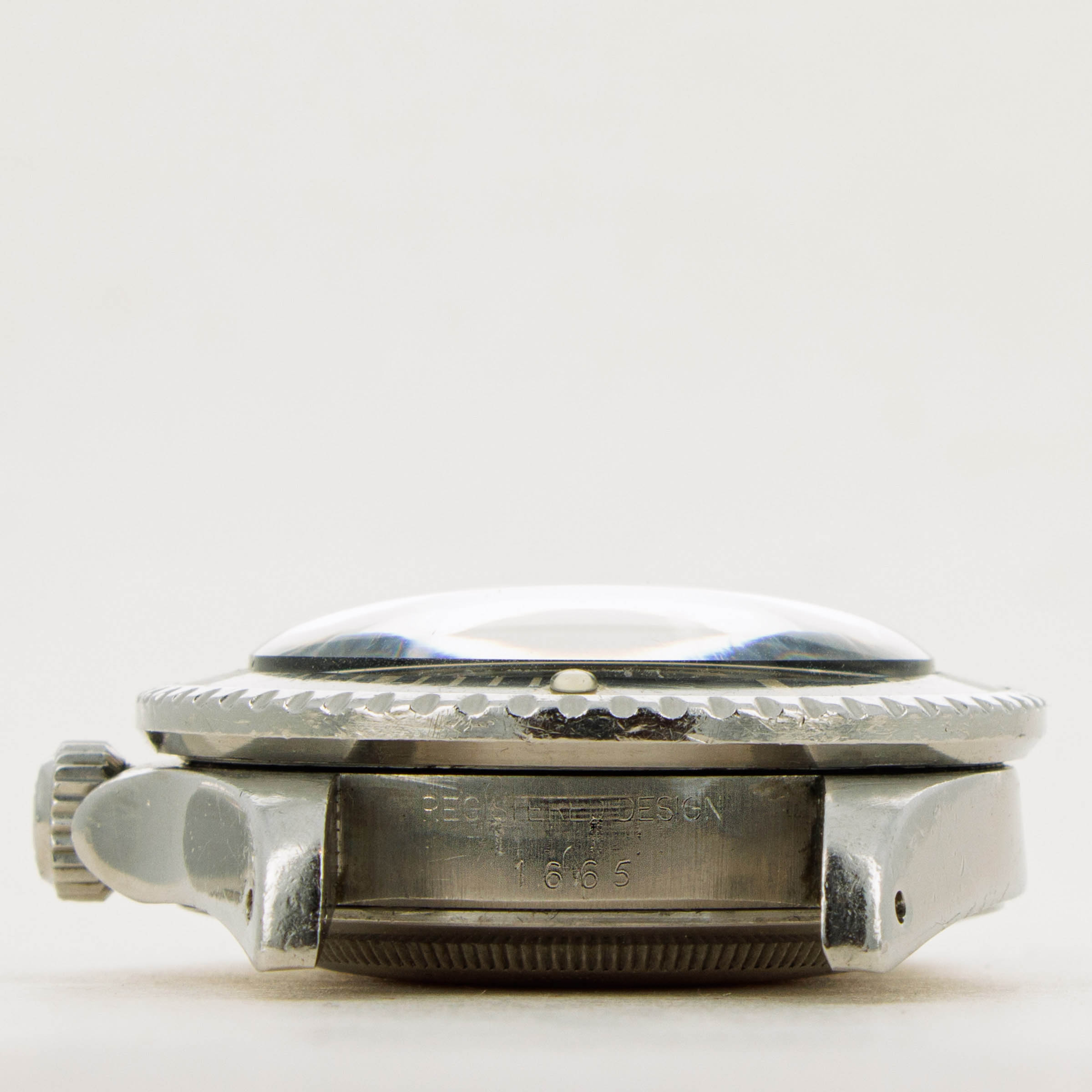 An imposing watch on account of its intended use as a tool watch for divers, the ref. 1665 is tall on the wrist thanks to its revolutionary HEV and domed crystal. Additionally, this example's uniquely aged bezel adds a wonderful level of visual depth to its aesthetic.