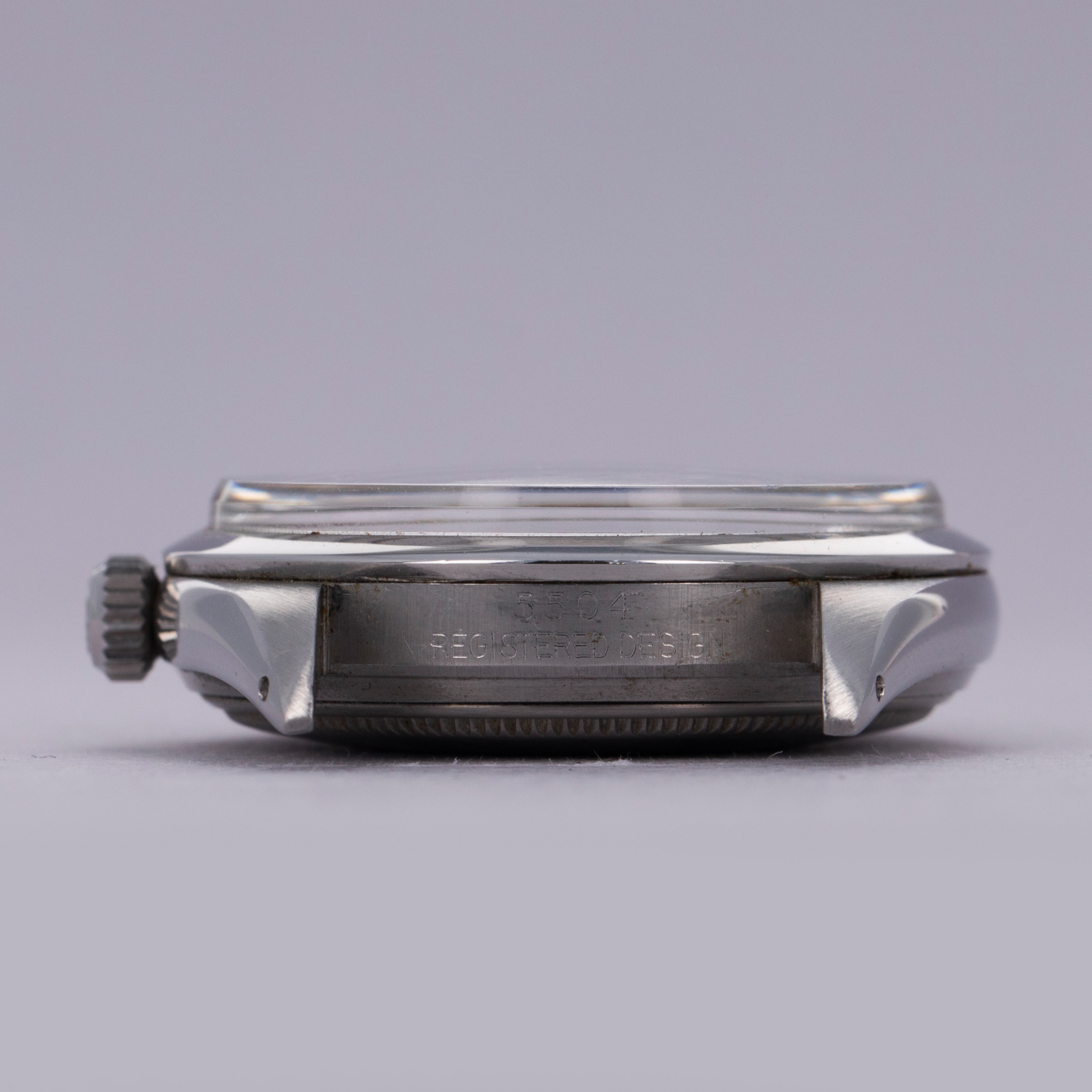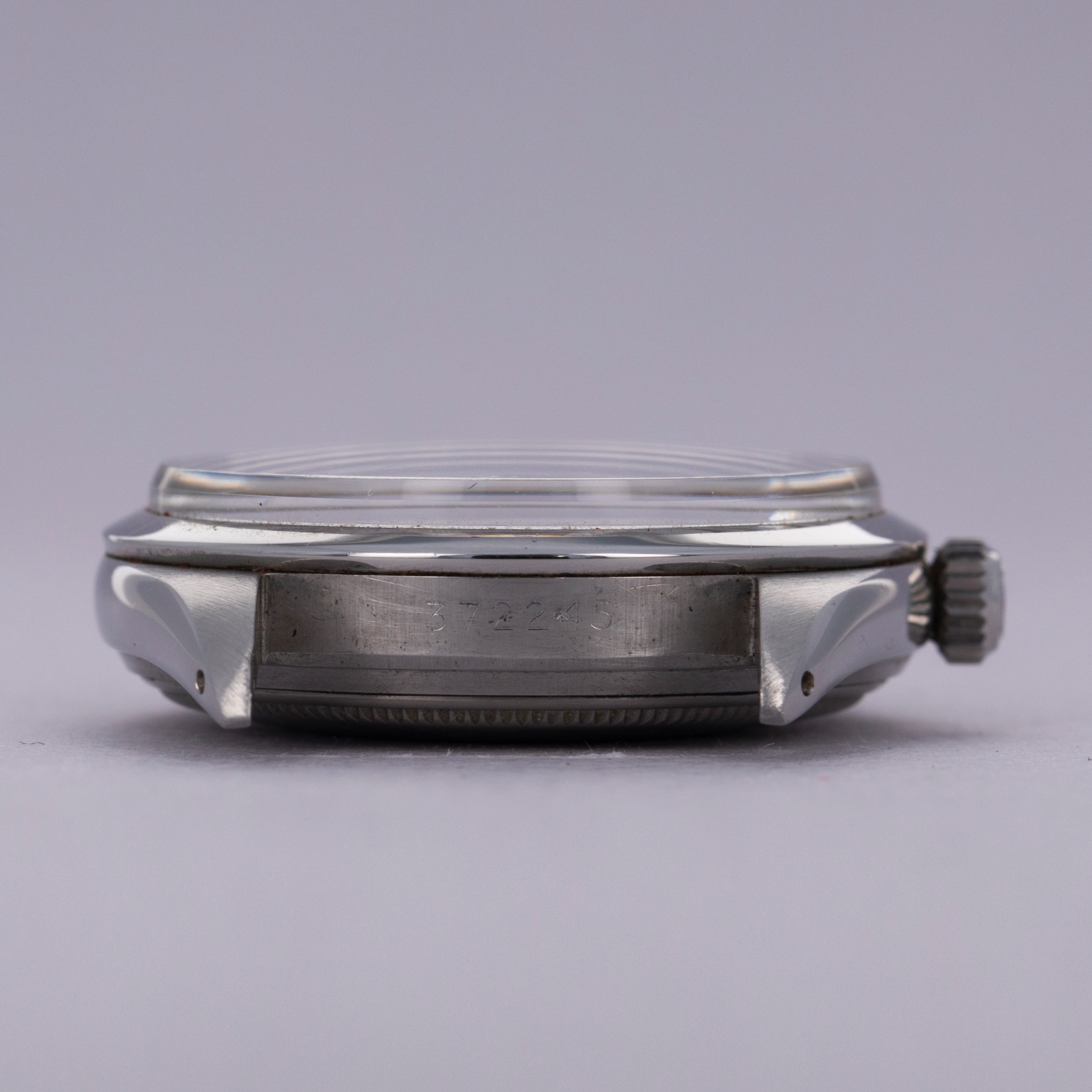 Only offered on the ref. 5504 in its first year of production, 1958, this ref. 5504 features a stunning black gilt chapter ring "Super Precision" dial with stunningly-aged orange lume on its hands and hour markers.