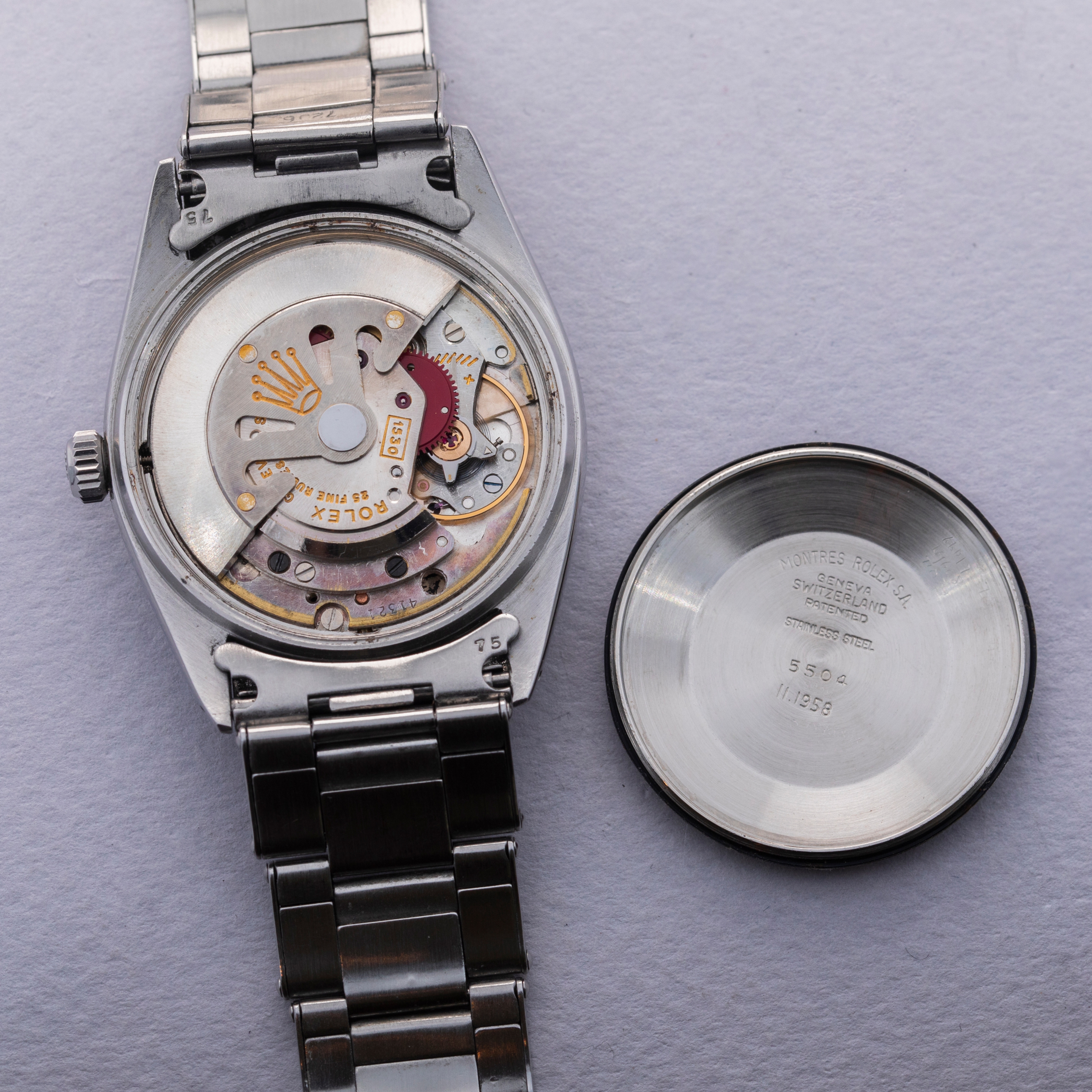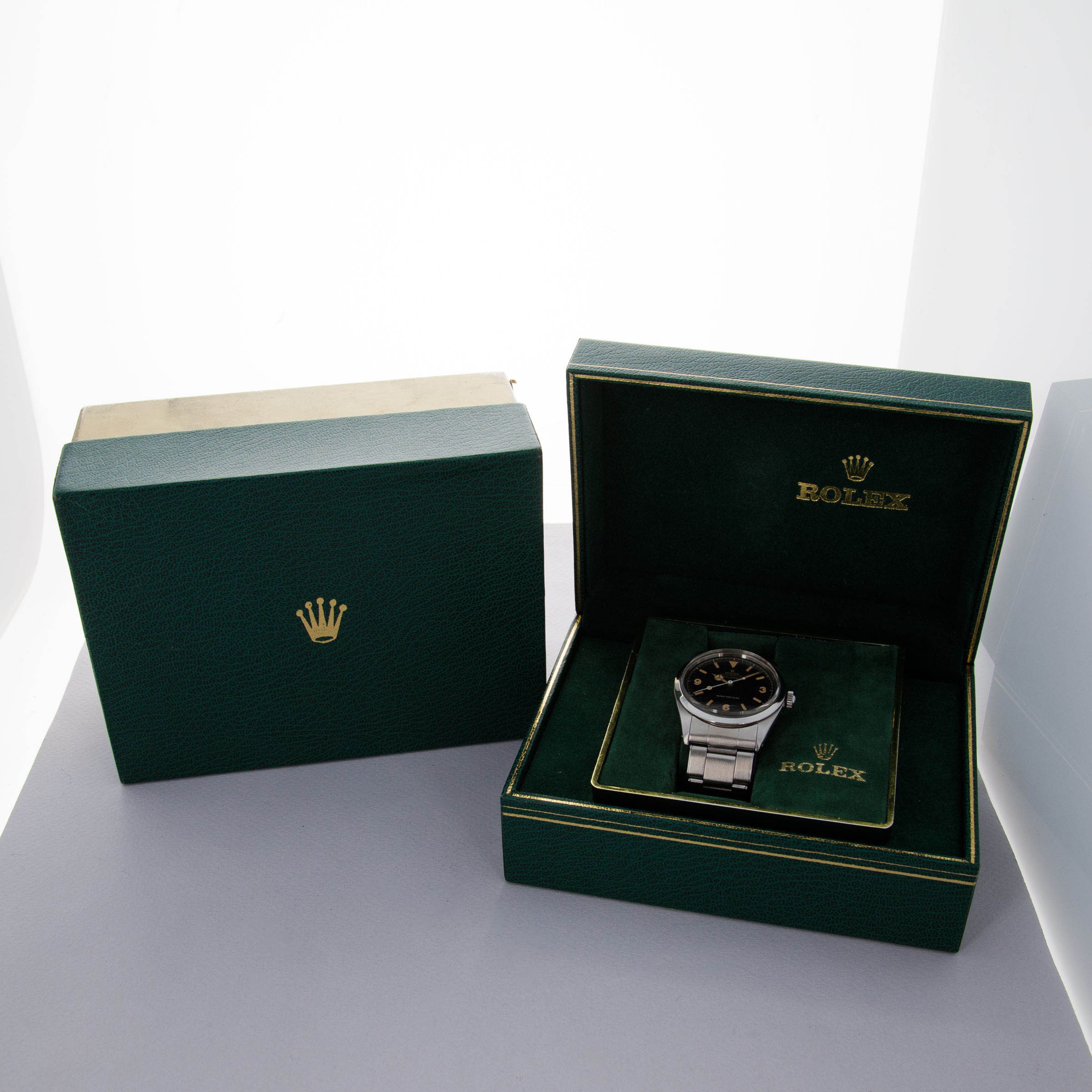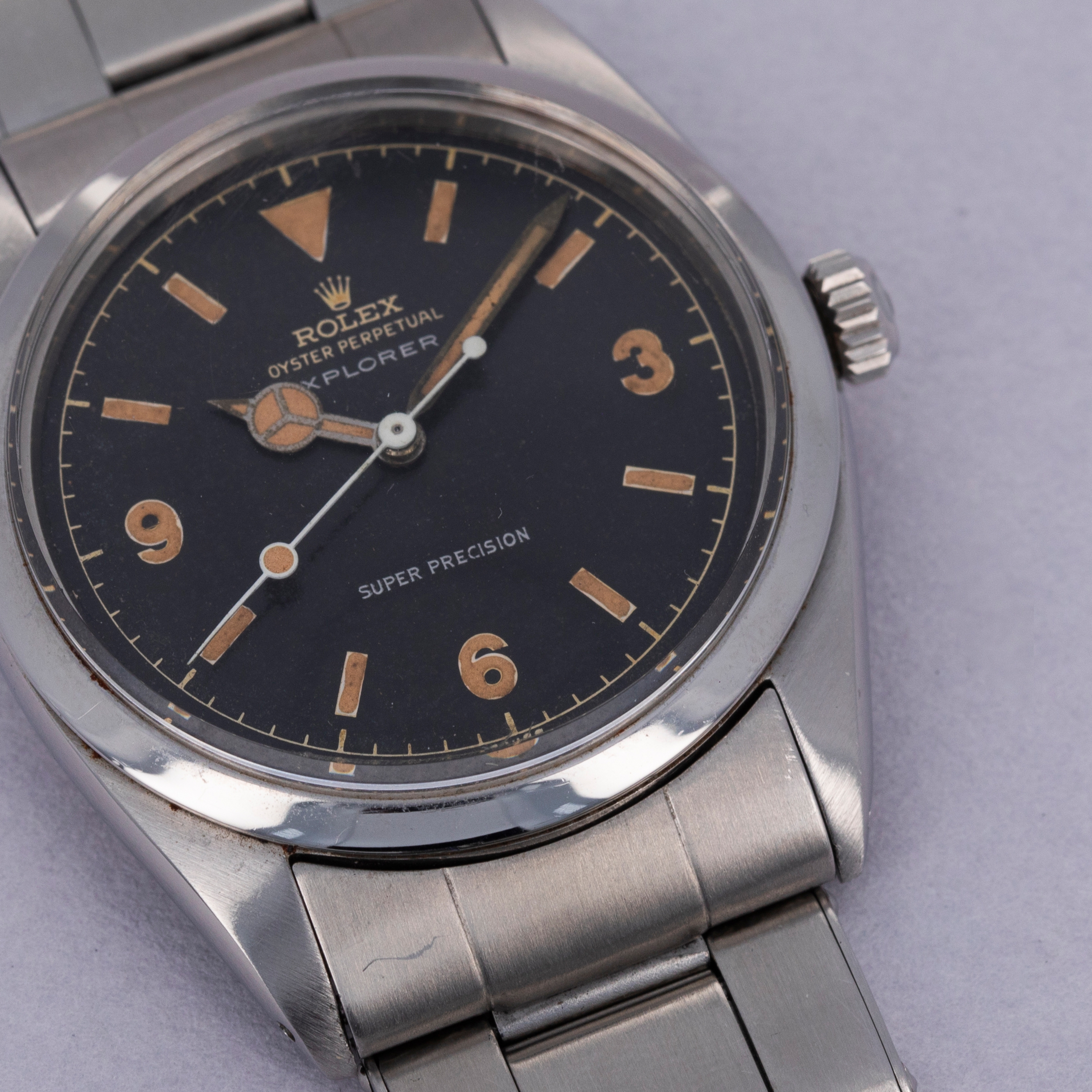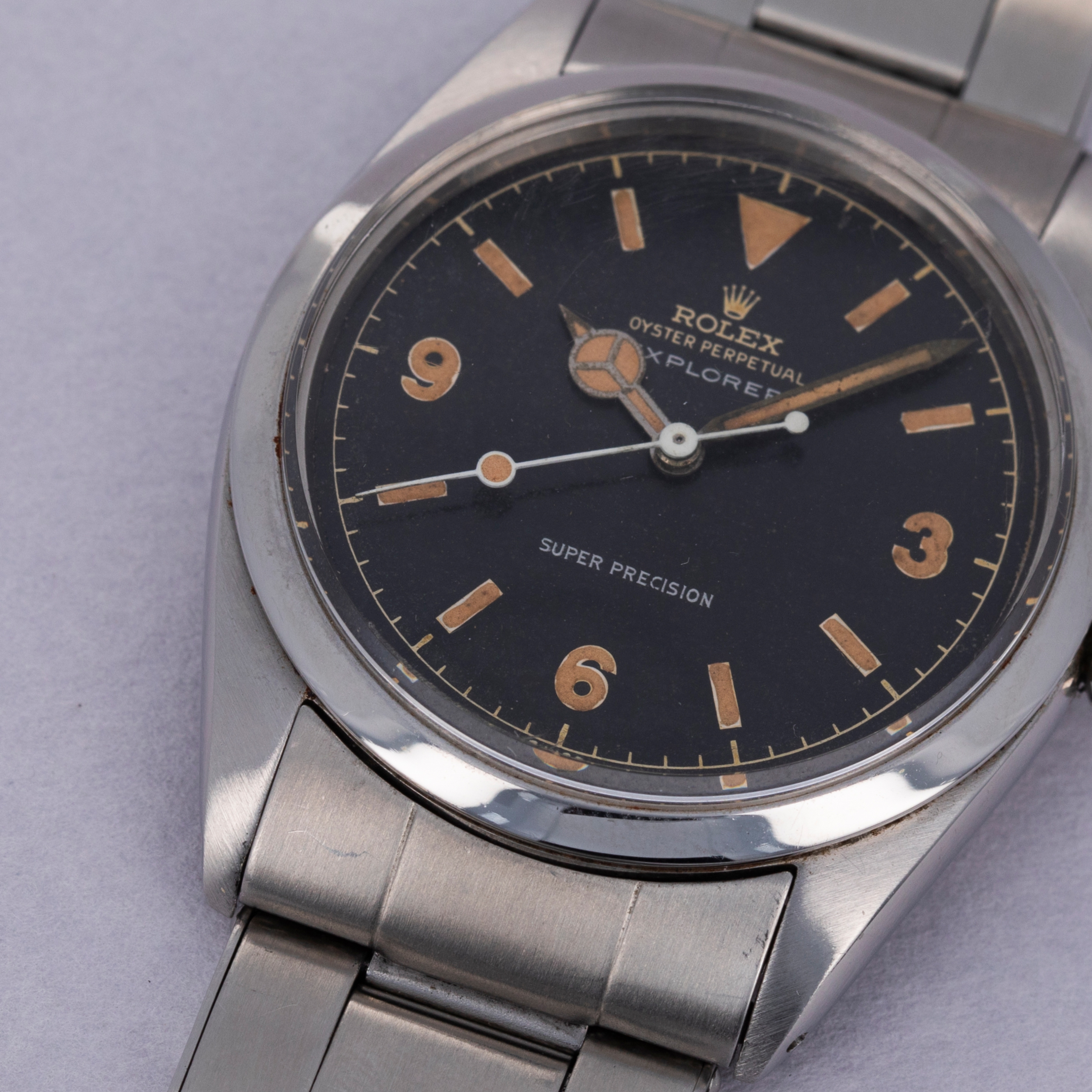 Inspired by the first-ever successful summit of Mount Everest by Sir Edmund Hillary and his Sherpa Tenzing Norgay, who wore a Rolex Oyster Perpetual, the Rolex Explorer has long been Rolex's ultimate adventure watch. Constructed entirely from Rolex's 904L steel, the Explorer's robust design ensures that it can always battle the elements. Featuring some of Rolex's most capable movements and a rich heritage to boot, the Explorer is another display of their timeless design as this icon of watchmaking has remained virtually untouched in its aesthetic since its inception. Identifiable by its signature 3-6-9 black dial, a flat stainless steel bezel, and entirely satin-brushed stainless steel case and bracelet, the Rolex Explorer has become renowned for its understated class, sporty elegance, and capable construction. Launched in 1958 as the non-chronometer certified Explorer variant, the ref. 5504 was powered by the automatic cal. 1530, a new movement that would go on to feature in other watches like the Submariner ref. 5508 and ref. 5510 - both icons in their own right. Boasting a black gilt "Super Precision" dial, which was only offered in 1958, this ref. 5504 is the real deal with its 1958-stamped caseback and 1958-dated serial number.