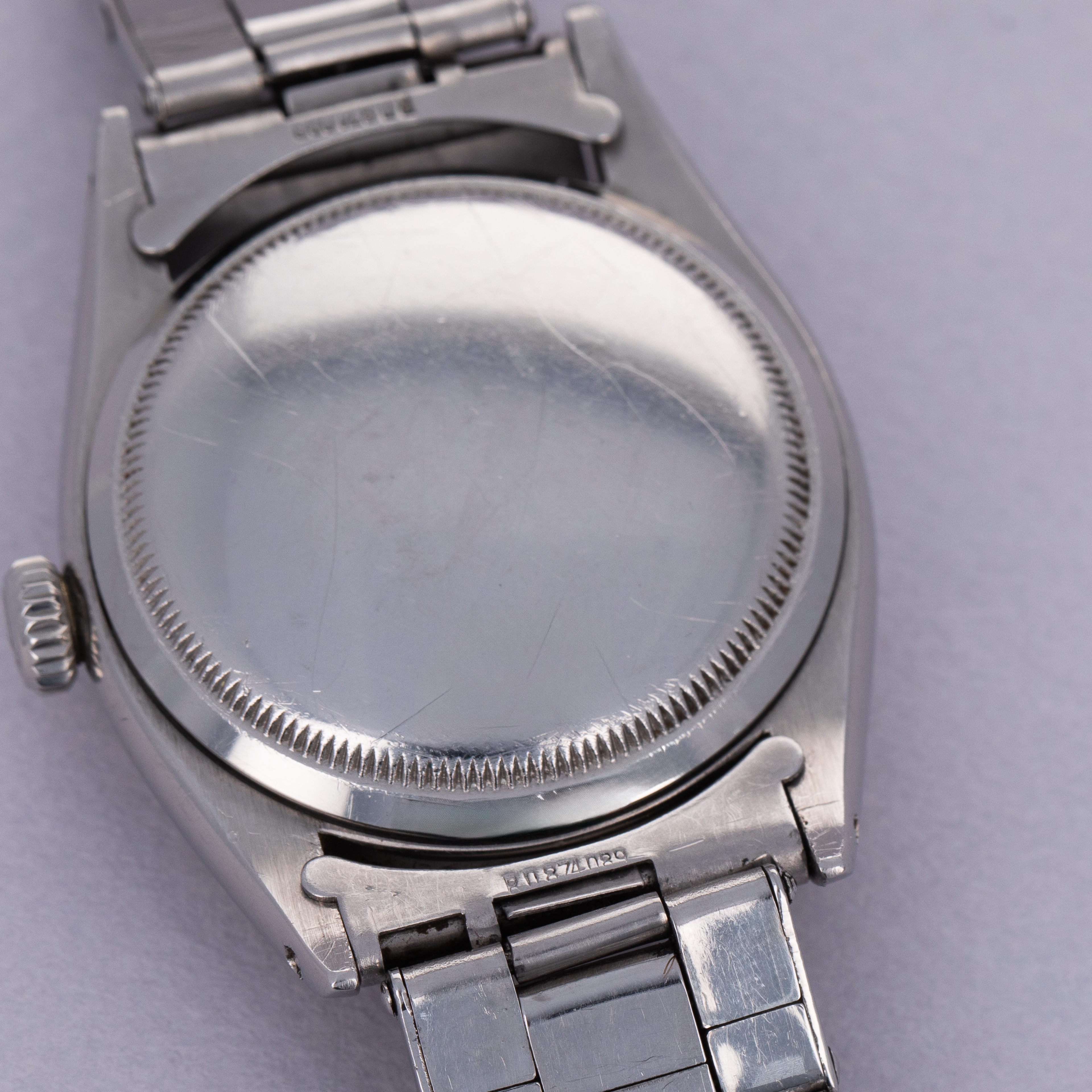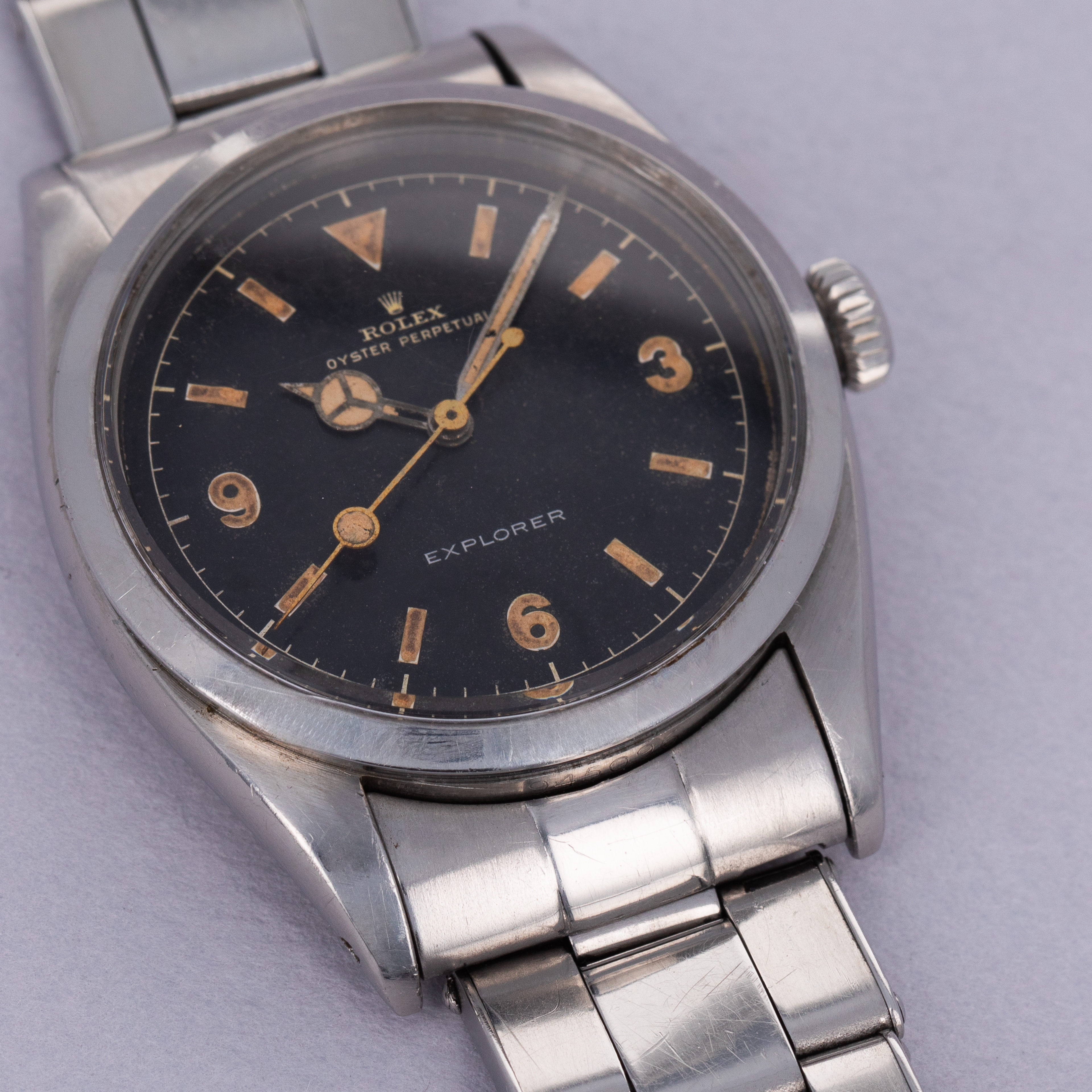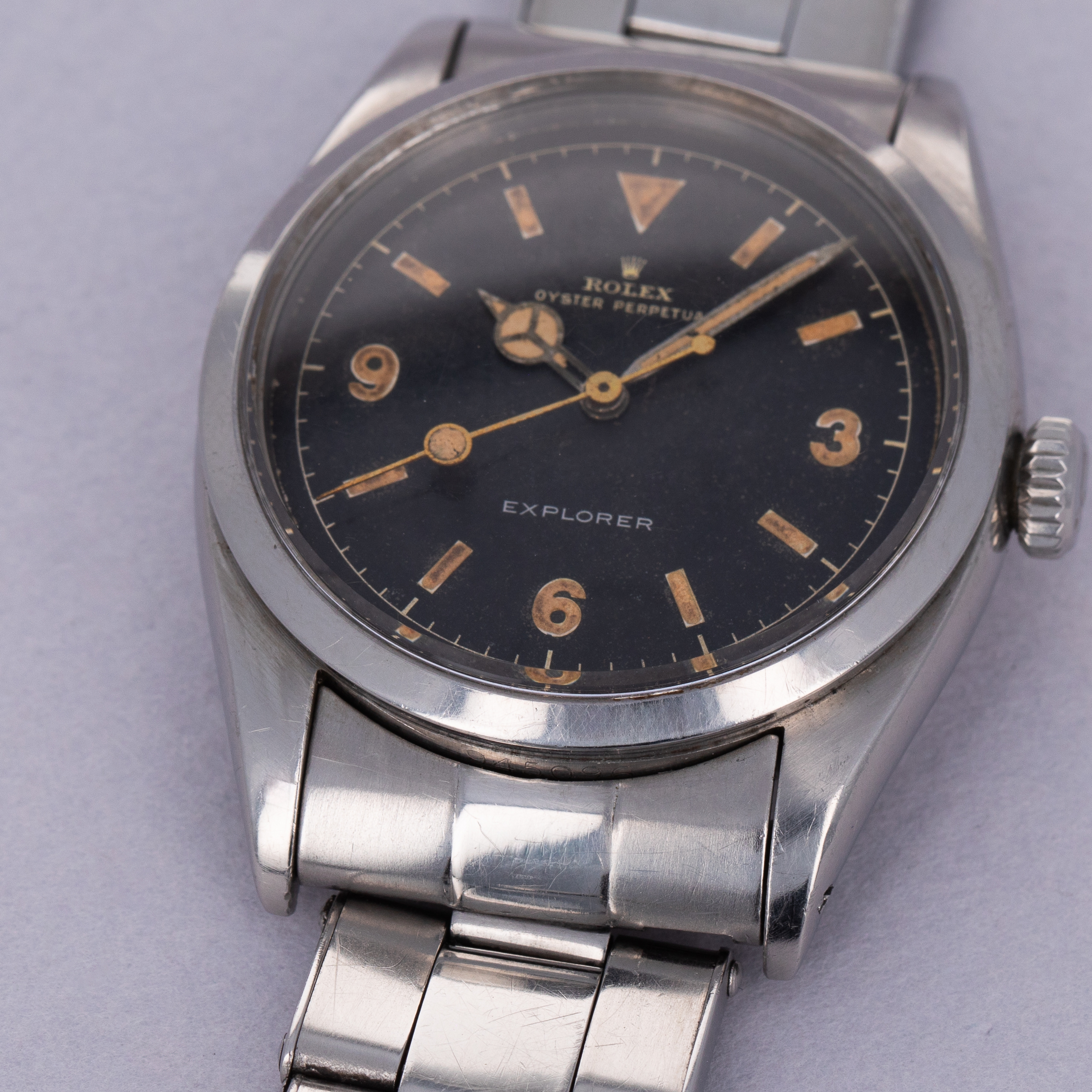 Watch is in very good overall condition. Case has moderate surface wear, with some lug wear visible, particularly on the lower right lug tip. Numbers between the lugs are crisp and clear. Caseback signed IV 1953 inside caseback. The original gilt chapter ring dial is very good. There is some mottling on the surface, and discolored but original luminous. The edge of the dial has some wear as seen in the images. There are some areas of luminous loss in the hands, as well as a faint crack in the bubble of the seconds hand. Watch comes with original rivet band with the correct "WAB England" style endpieces. The original clasp has been replaced with a later Rolex clasp. The band shows light wear, with 12 links total. it fits an approx 7" wrist.
