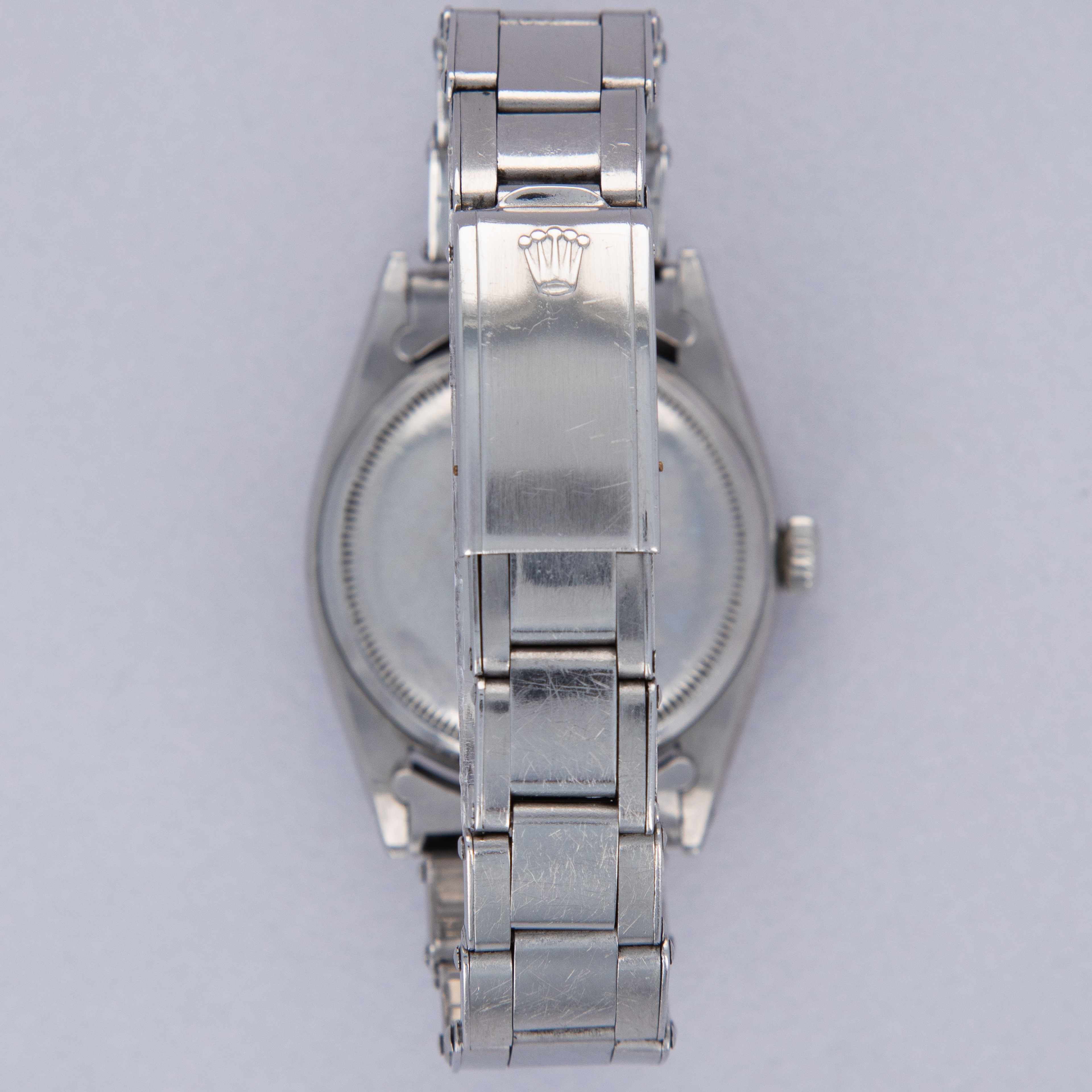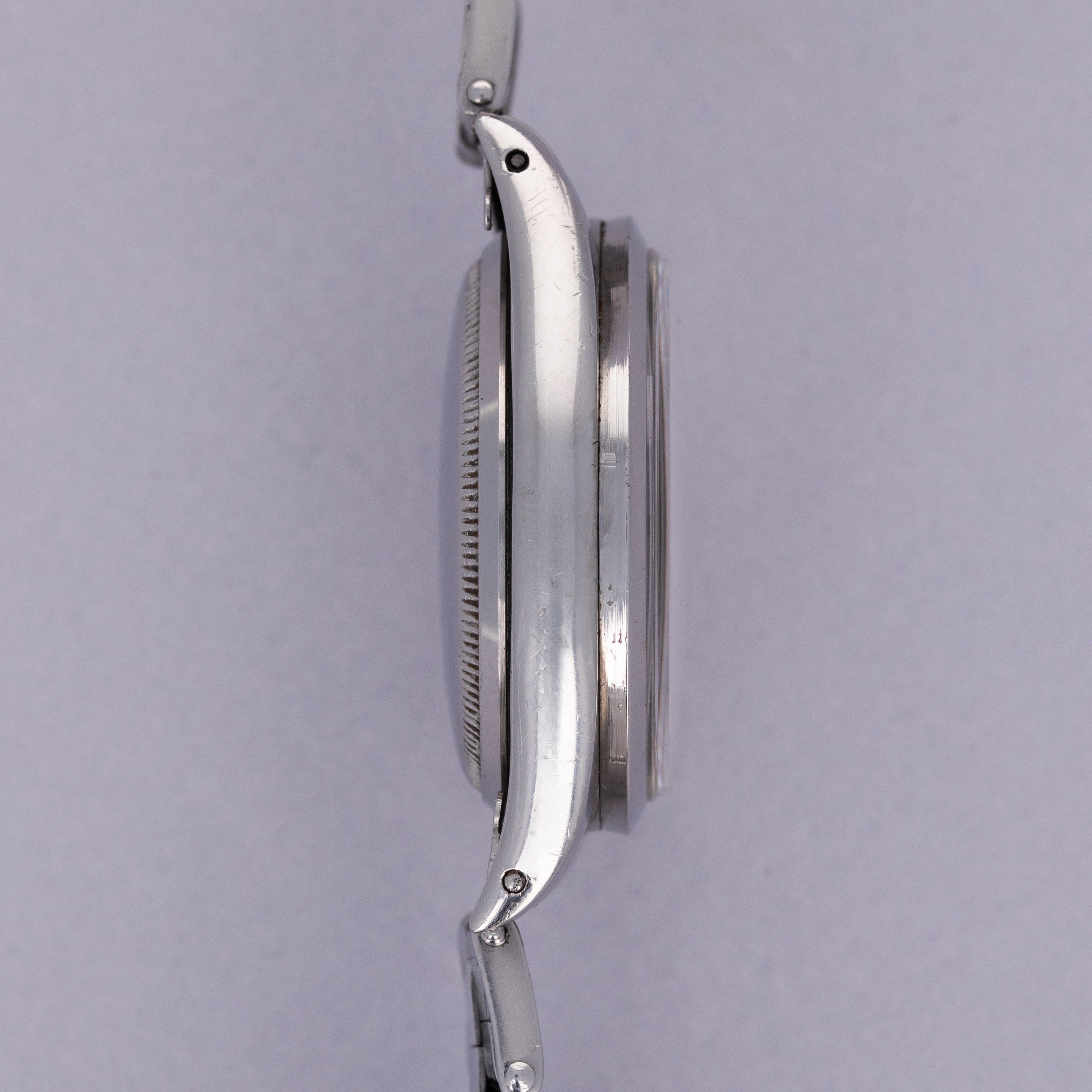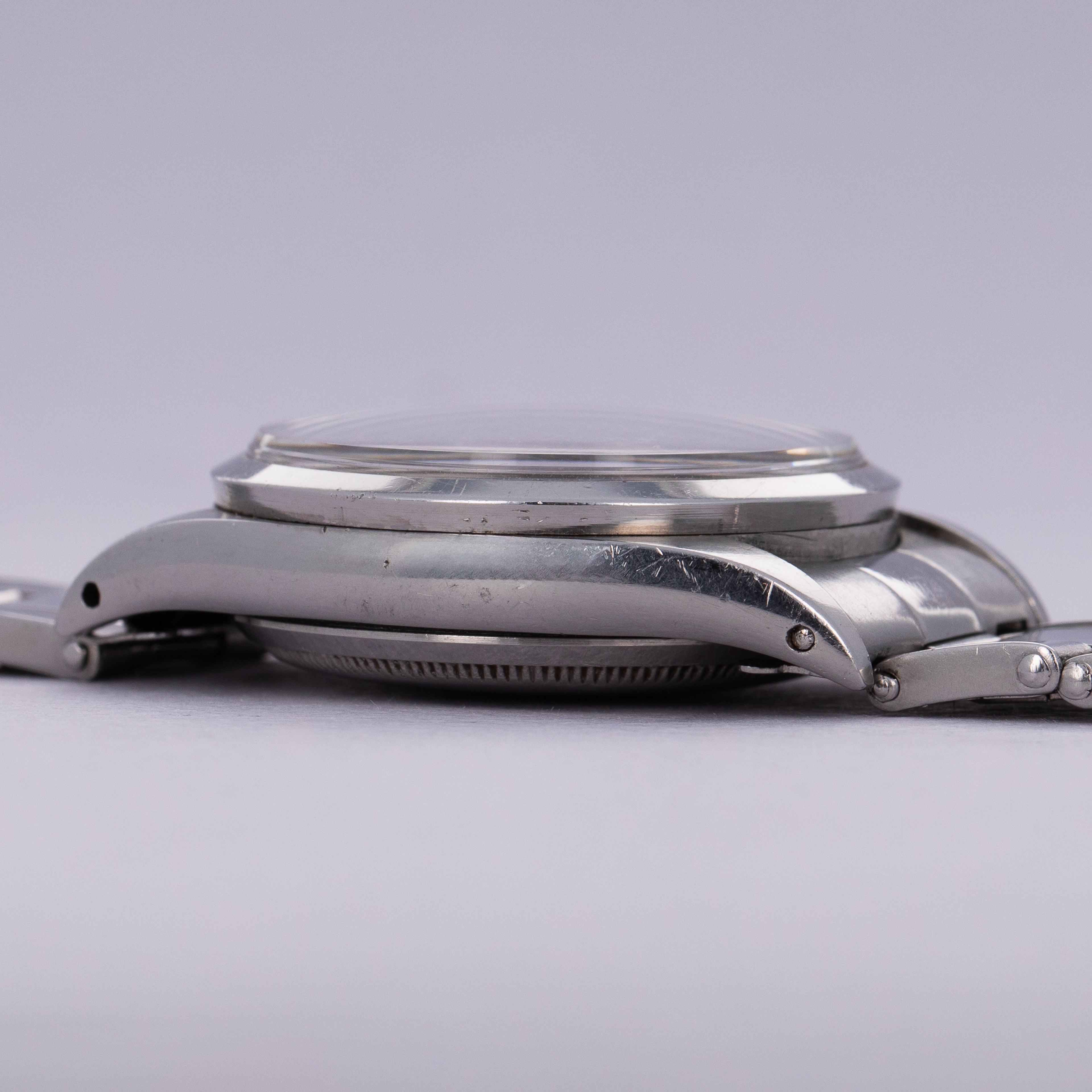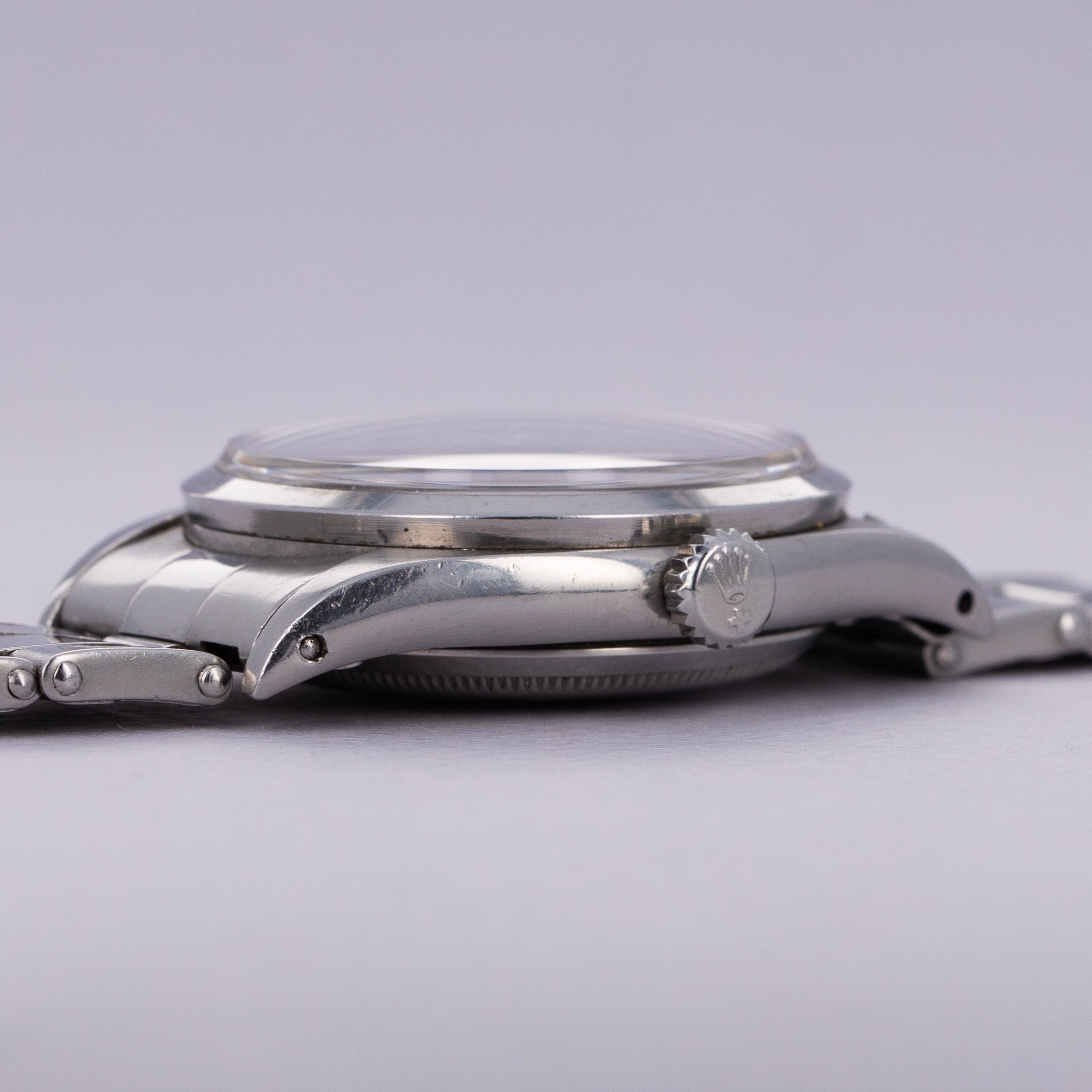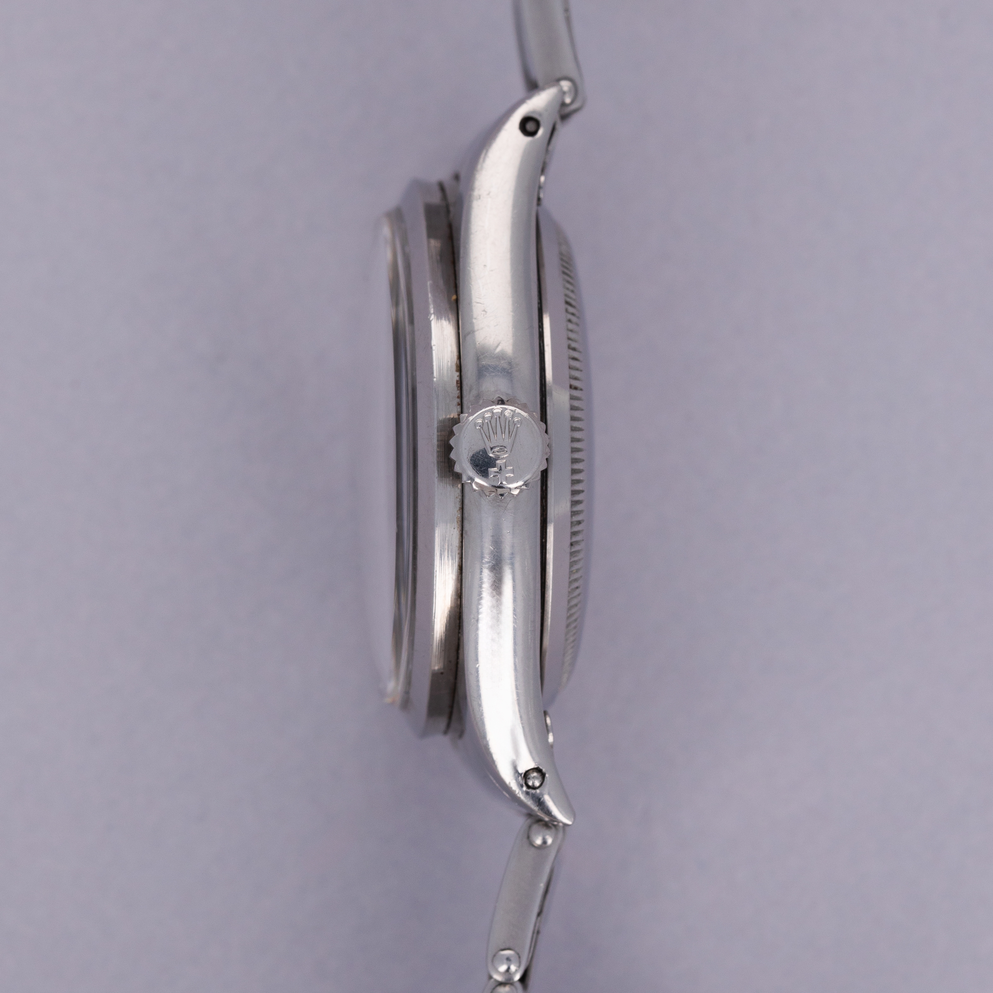 While its hollow end and center links, acrylic crystal, radium dial, and fold-over clasp provide a beautifully pure expression of what a vintage Rolex was like to wear back in its heyday, the ref. 6150's 36mm diameter was certainly not the norm when it was released, with it dwarfing most watches from the time.