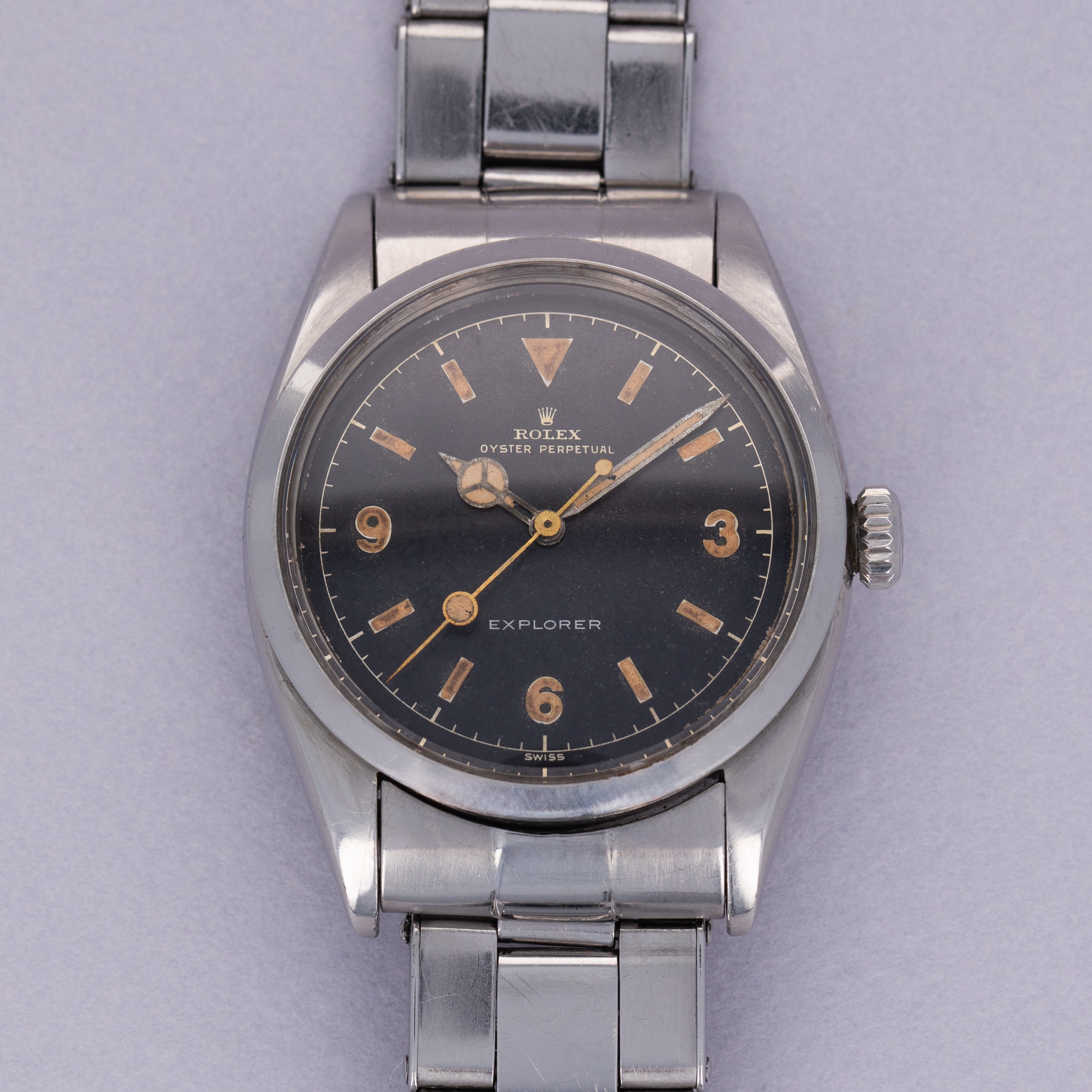 Legendary as what a lot of collectors determine to be the earliest Explorer reference, the short-lived ref. 6150 was launched in 1952 and produced only until 1953 and features all of the design signatures that we expect from a vintage Explorer. These come in the form of its lacquered black gilt dial, iconic 3-6-9 dial layout and 36mm stainless steel Oyster case. Featuring radium lume and the iconic ‘Explorer’ signature at 6 o’clock, this example’s dial is in great condition, given how radium can impact some dials. Fitted with the automatic cal. A296 movement, the Explorer ref. 6150 features a more bulbous caseback than the modern Rolex standard, a marker of its vintage essence. A truly iconic design with wonderful flourishes that remind its wearer of its vintage and original purpose, this Rolex Explorer ref. 6150 will make for an excellent addition to anyone’s collection.