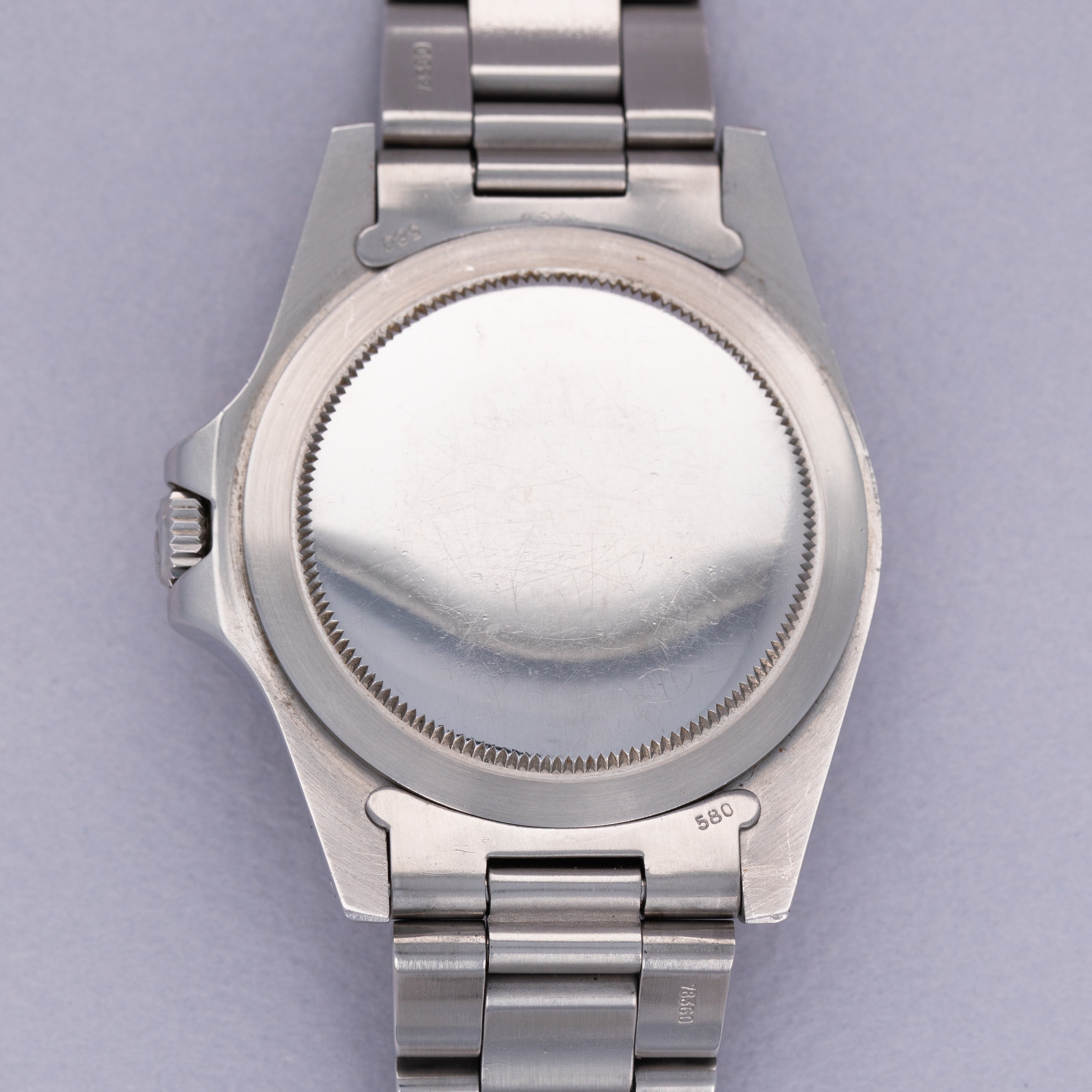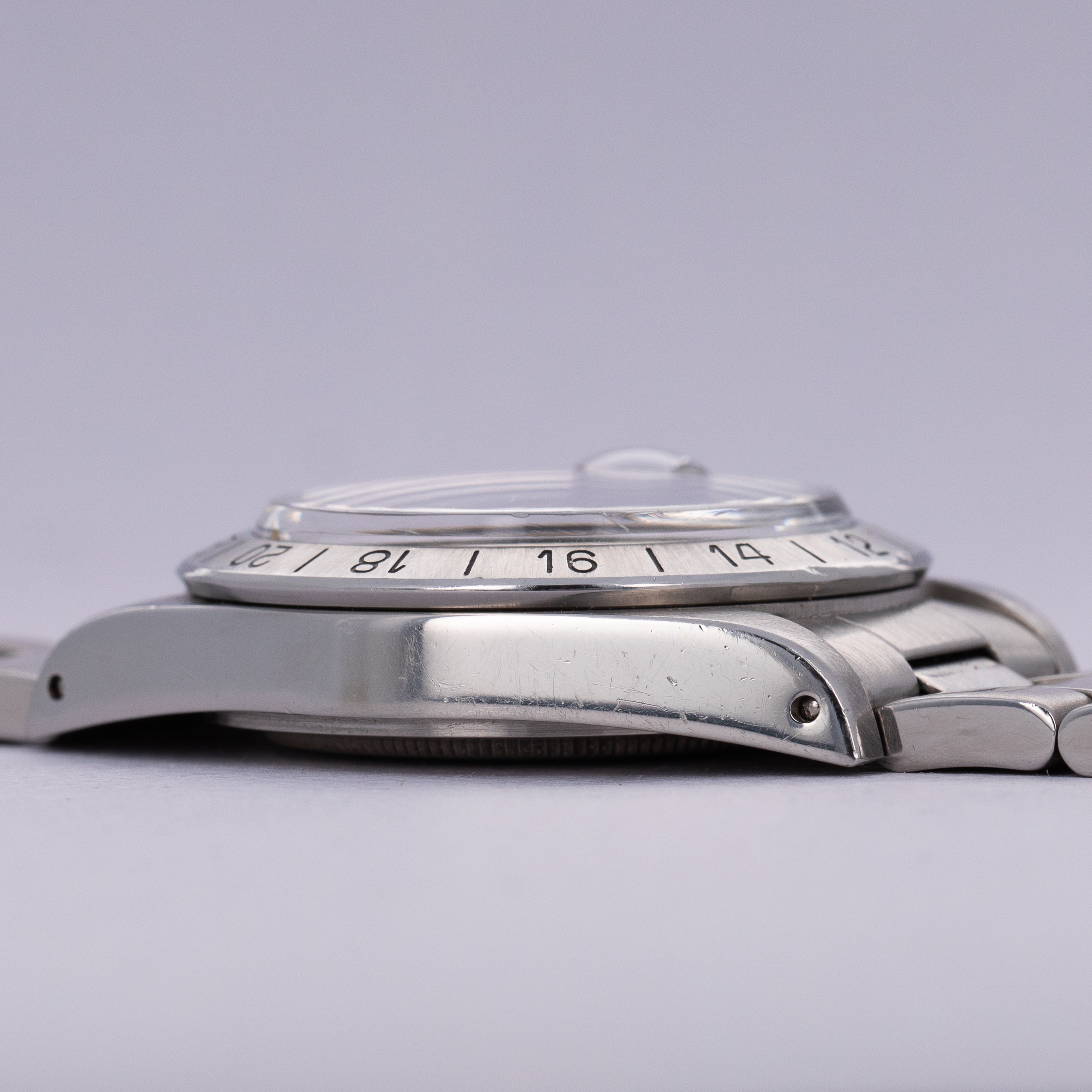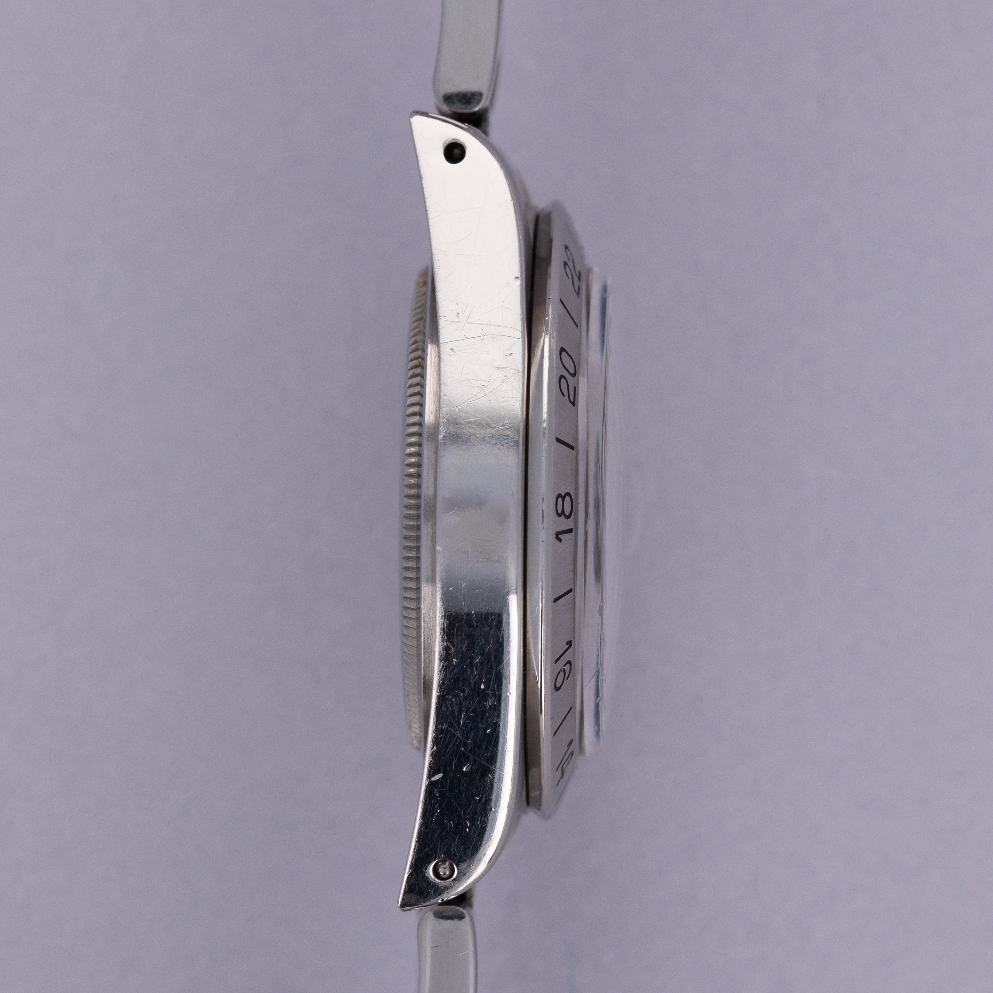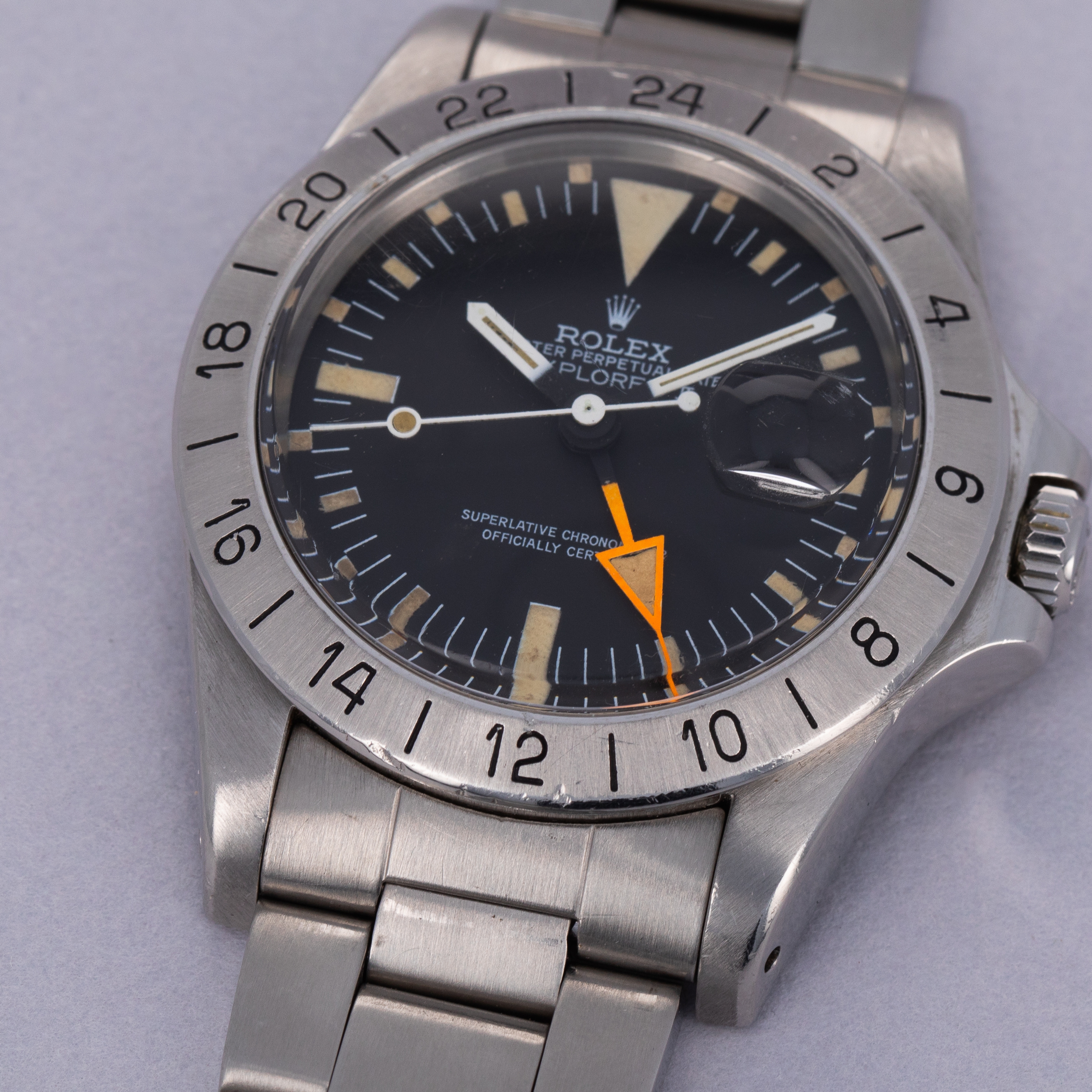 Watch is in excellent overall condition. Lugs are thick and full, but exhibit some softness on the edges. Bezel shows similar soft edges, with a few marks and dings, primarily located near the 6 o'clock inner and outer edge. The original dial is in excellent overall condition. Luminous along the lower left quarter are a bit darker than the rest of dial. The hands are original and retain original luminous material, but there is a tiny crack in the hour hand luminous, and some damage in the orange 24 hr hand. Watch comes with a 78360 oyster band with 12 links total, 2 of which are removable. The bracelet fits an approx 7 1/2" wrist. One of the screws on the bracelet has a mangled head.