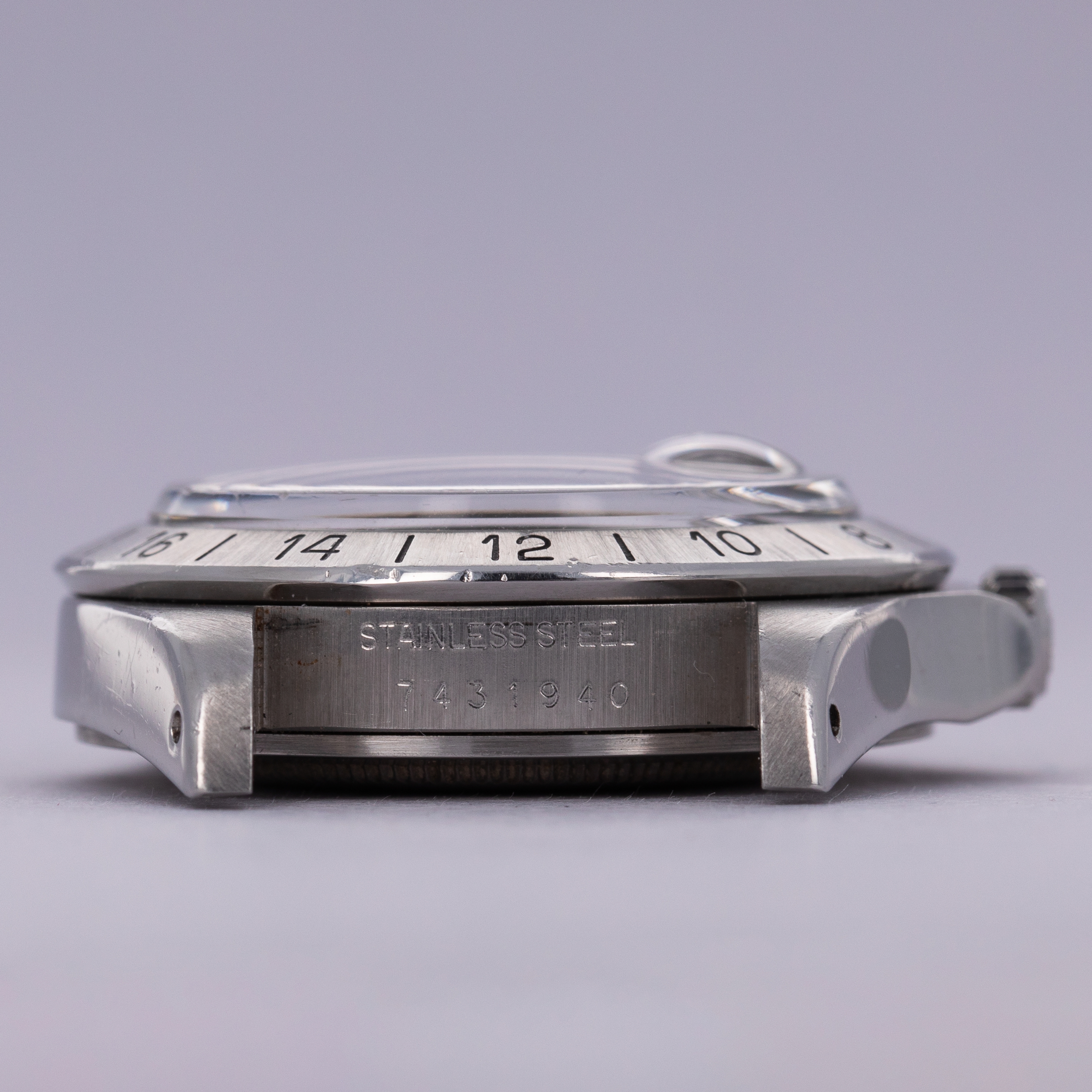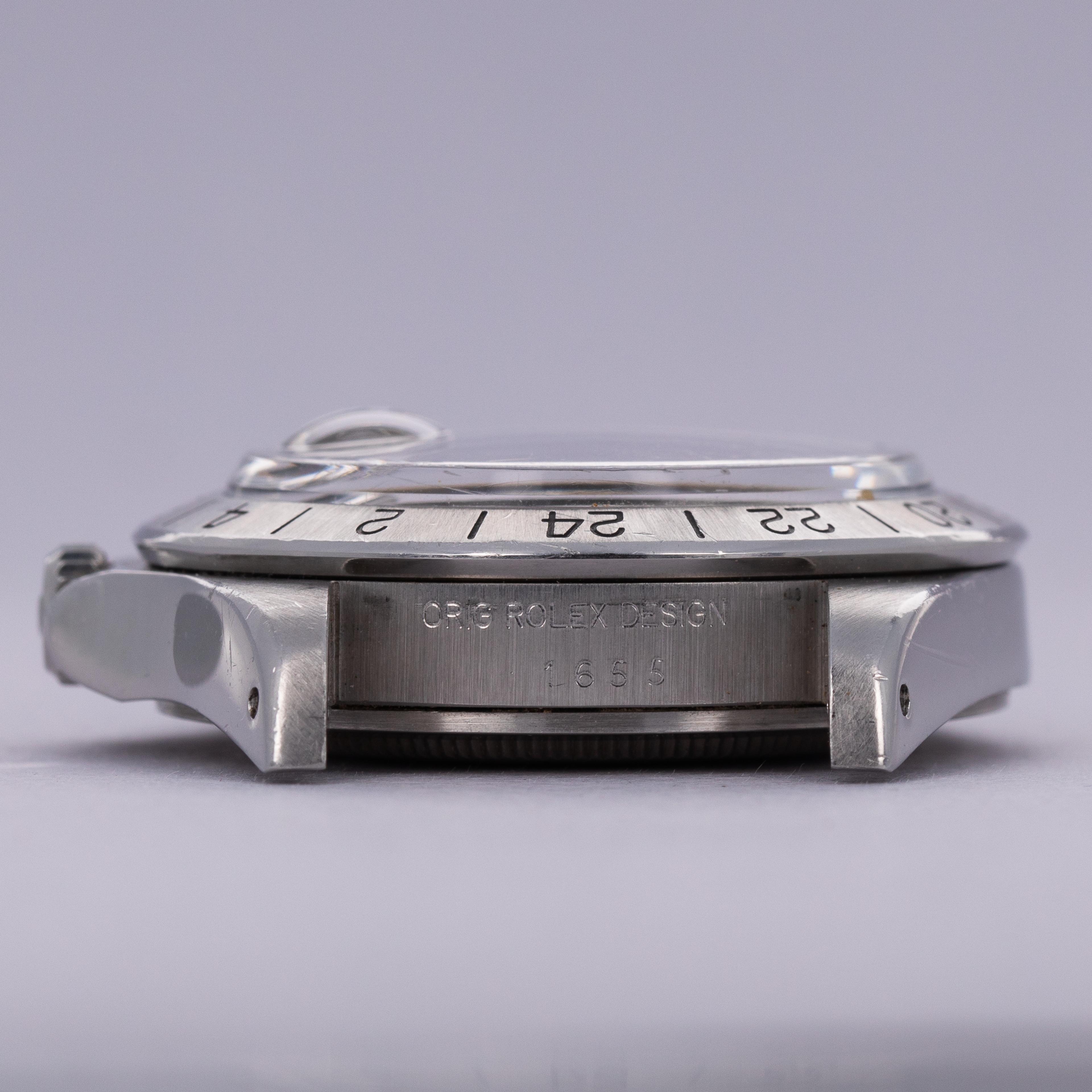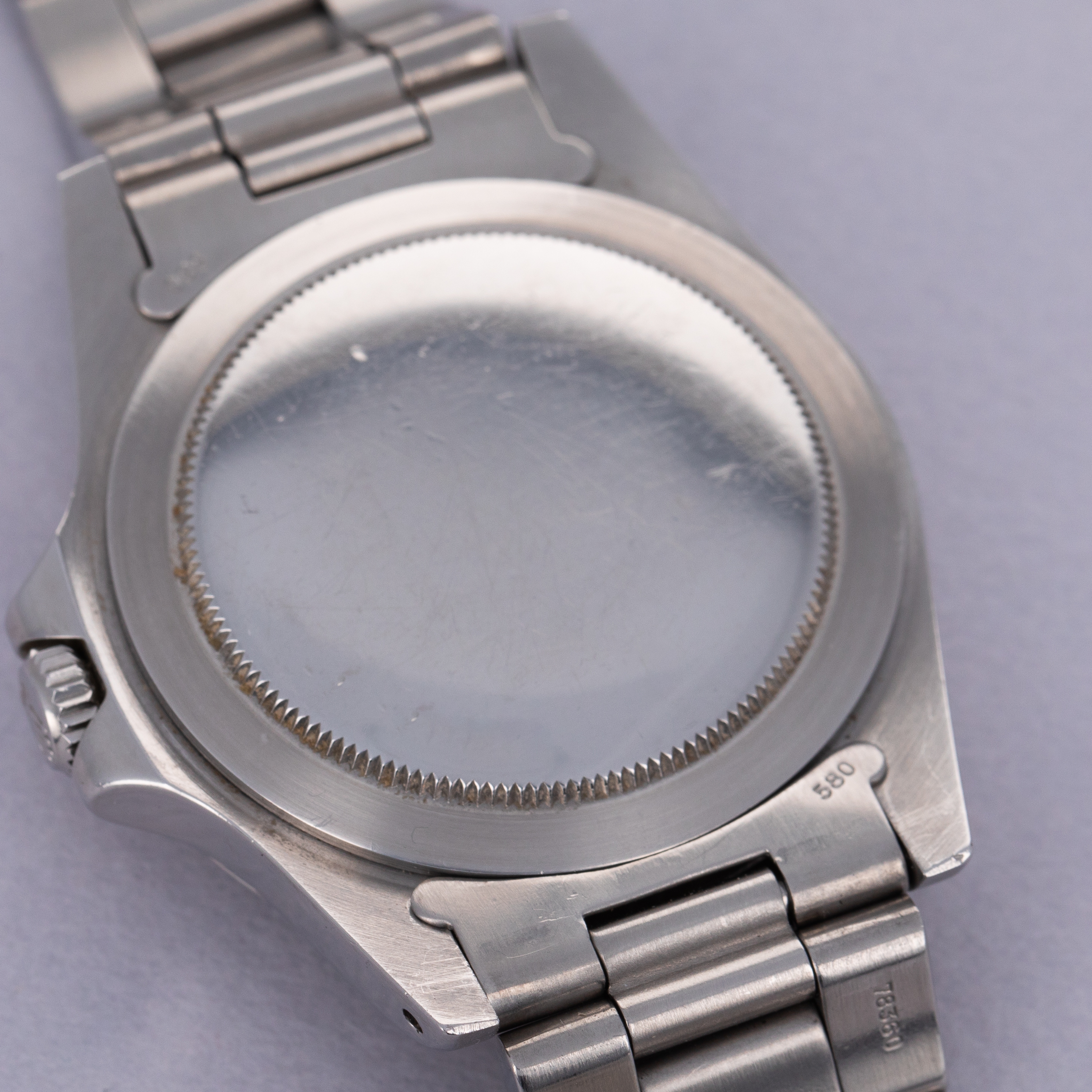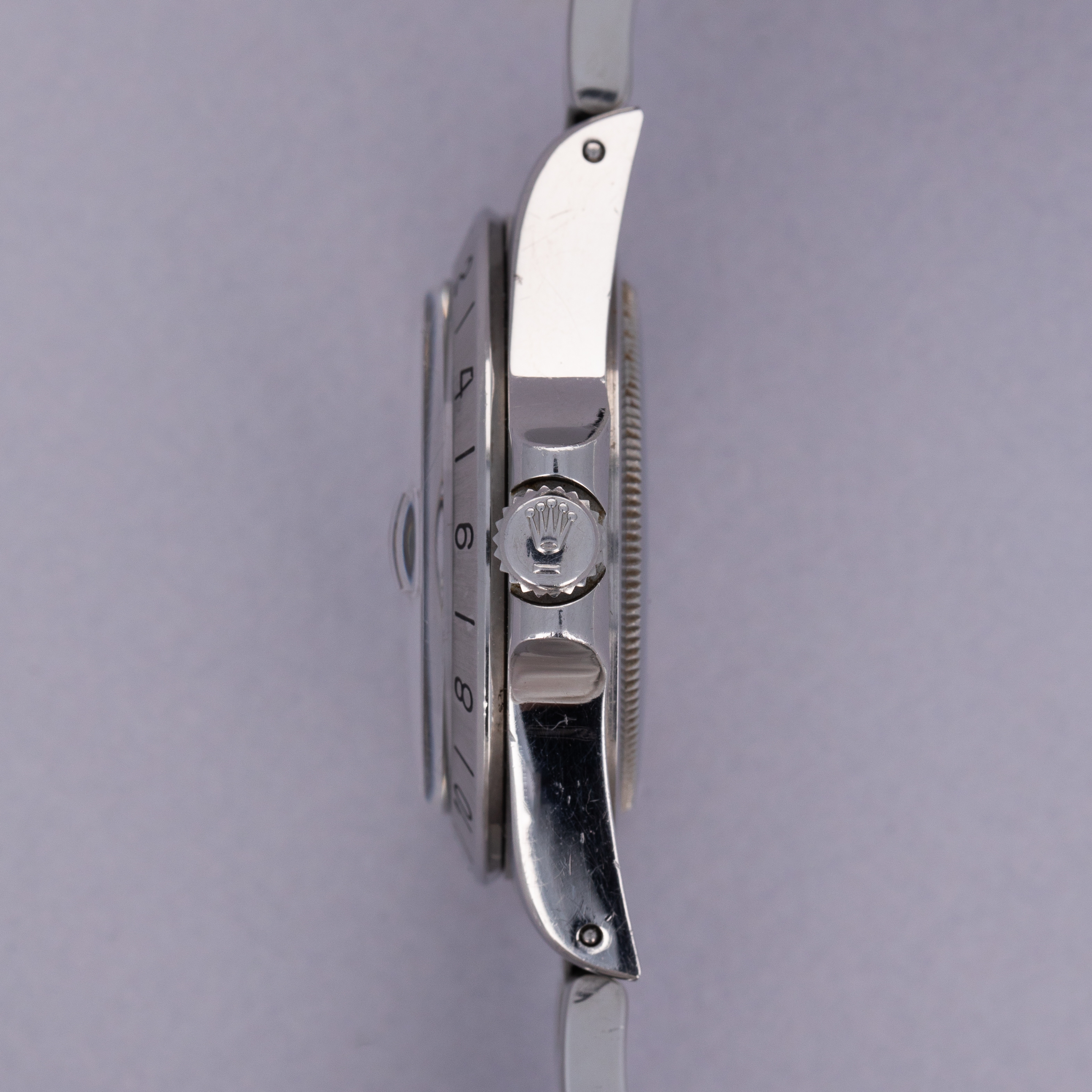 Watch is in excellent overall condition. Lugs are thick and full, but exhibit some softness on the edges. Bezel shows similar soft edges, with a few marks and dings, primarily located near the 6 o'clock inner and outer edge. The original dial is in excellent overall condition. Luminous along the lower left quarter are a bit darker than the rest of dial. The hands are original and retain original luminous material, but there is a tiny crack in the hour hand luminous, and some damage in the orange 24 hr hand. Watch comes with a 78360 oyster band with 12 links total, 2 of which are removable. The bracelet fits an approx 7 1/2" wrist. One of the screws on the bracelet has a mangled head.