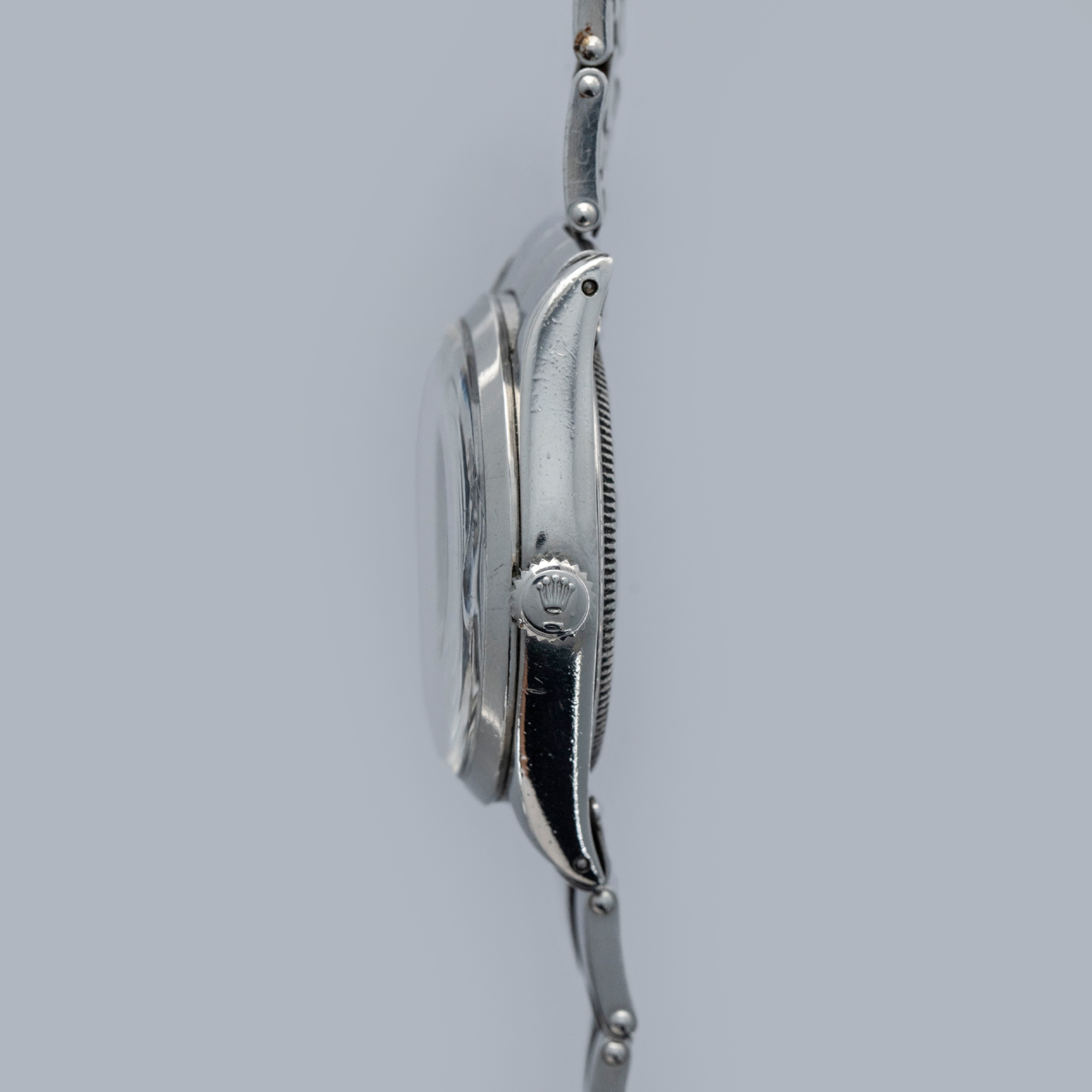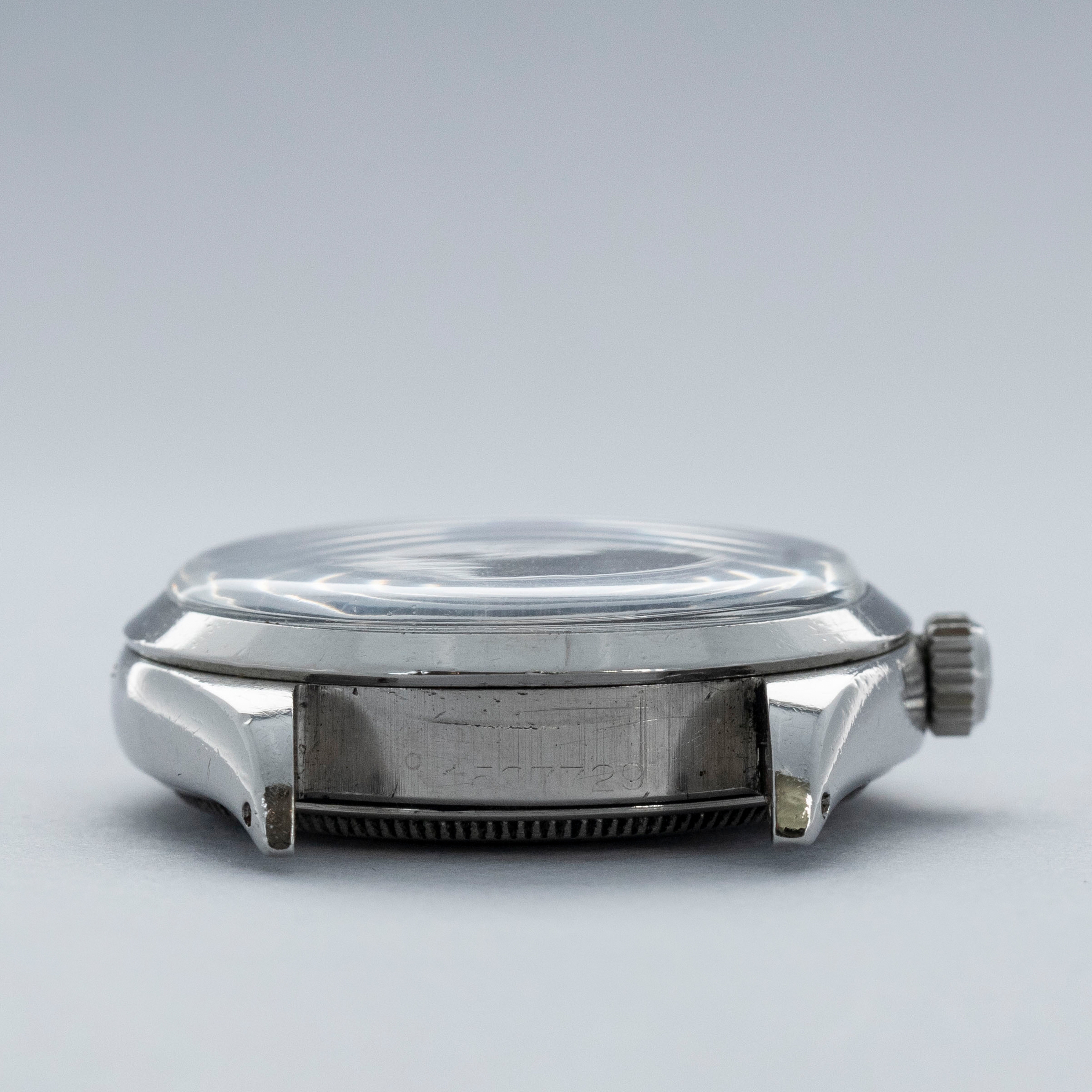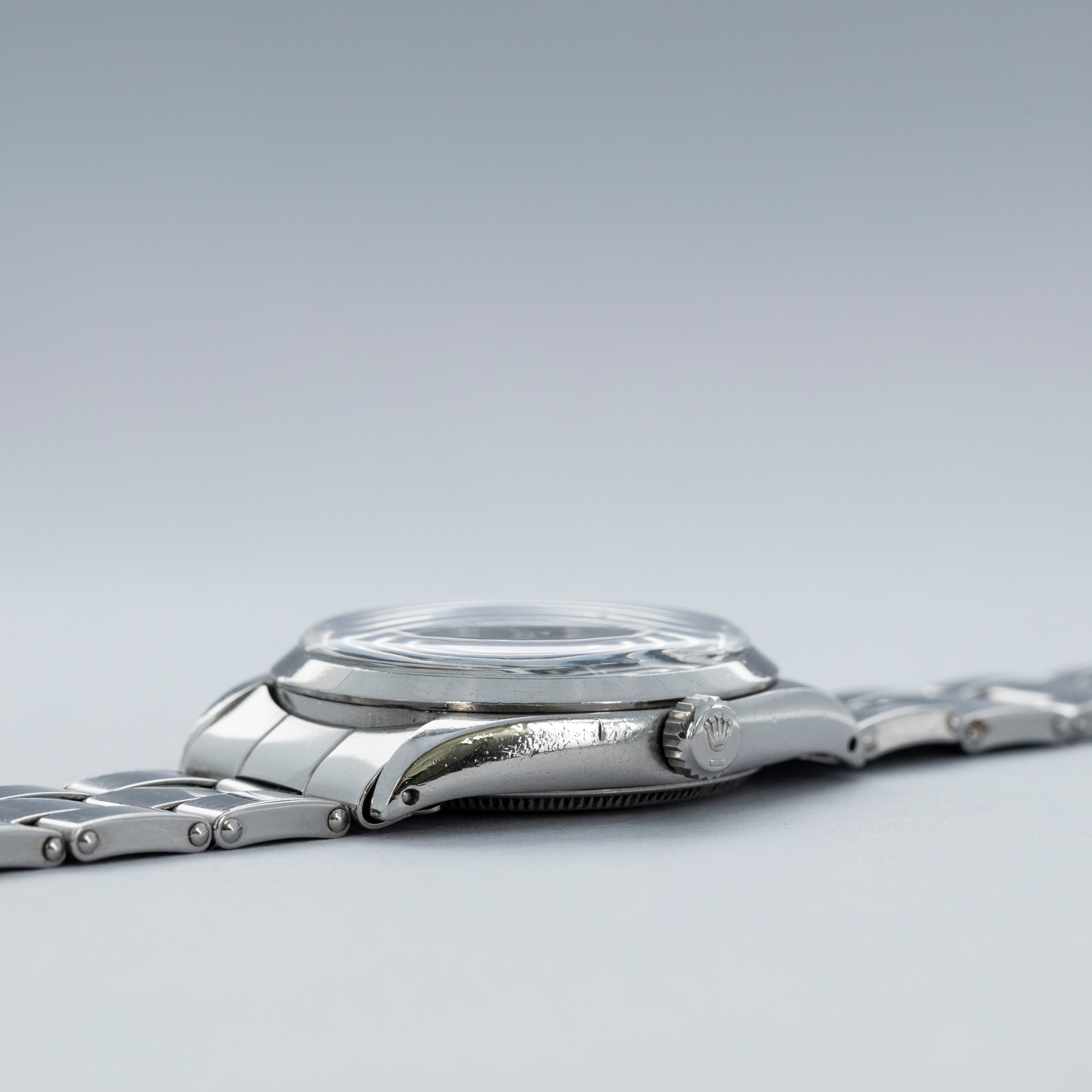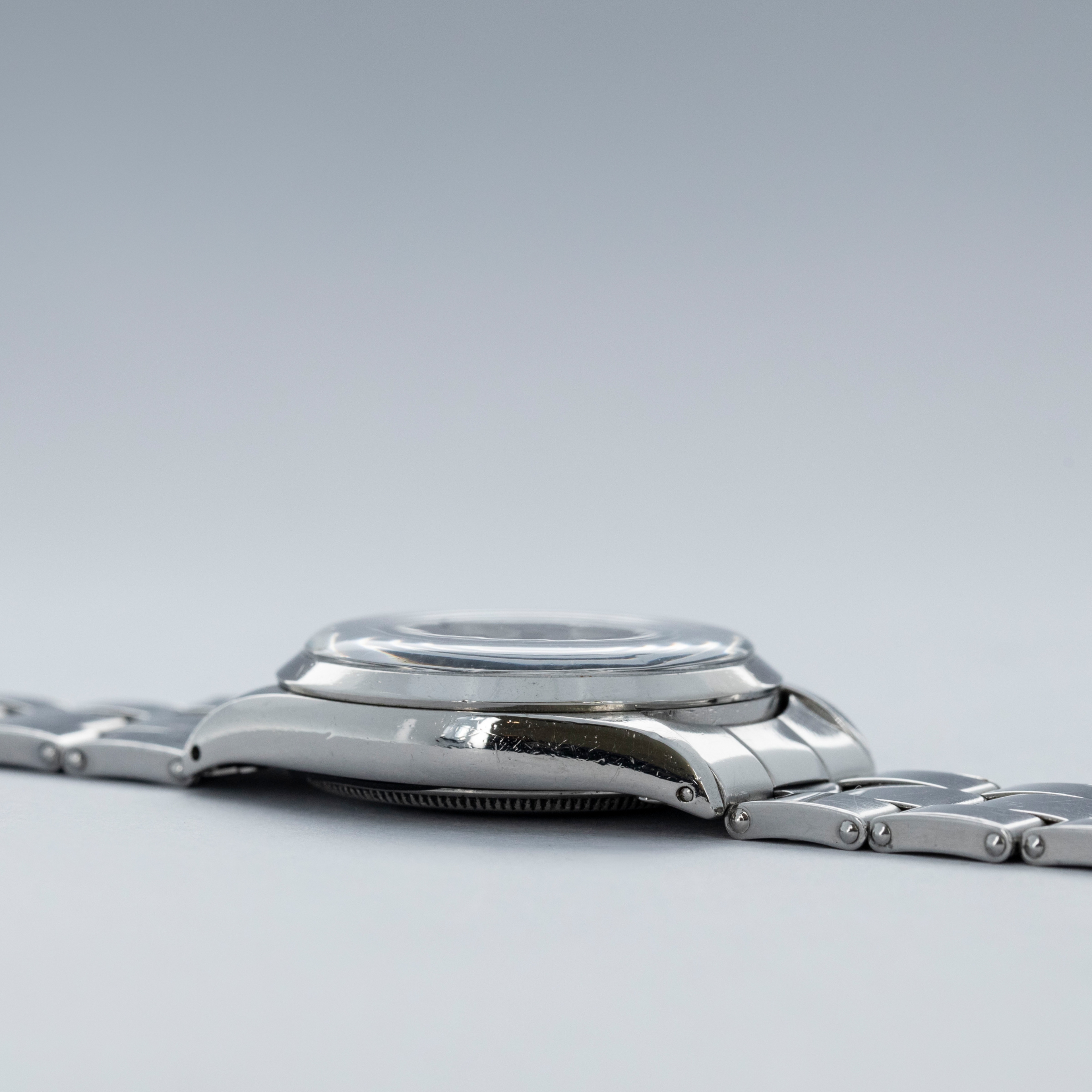The watch is in overall excellent condition. The steel case has some scratches and marks commensurate with a watch of this vintage, and the brushed areas of the case have developed a sheen from wear over the decades. The case back has some scratches and nicks. The gilt dial is near-mint, retaining its glossy finish and clean lume plots. The hands show some discoloration in the lume, and the seconds hand has been relumed at some point. The Swiss rivet-link Oyster bracelet has surface marks and light play between the links. The bracelet has 12 links and fits an approximately 7 1/4” wrist.