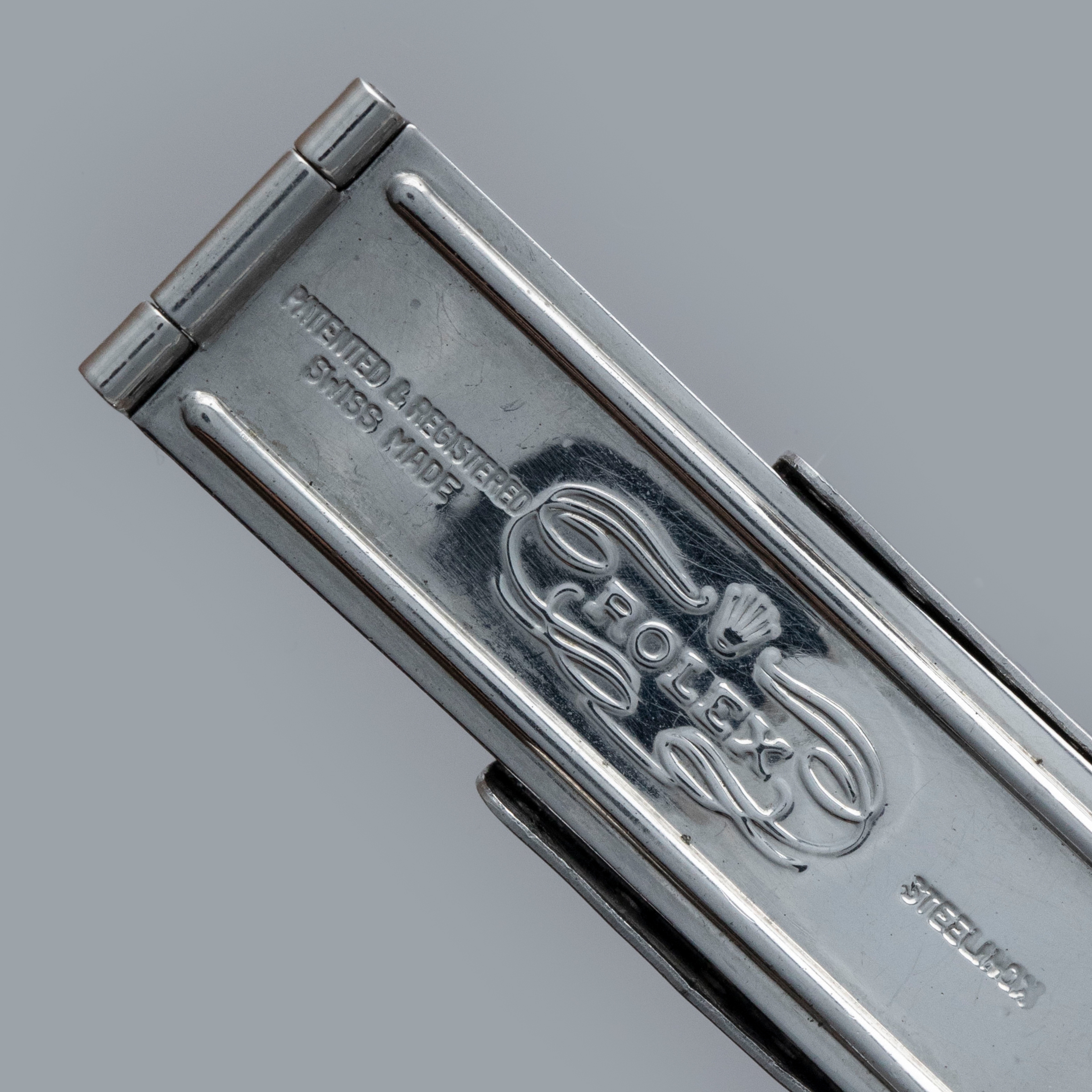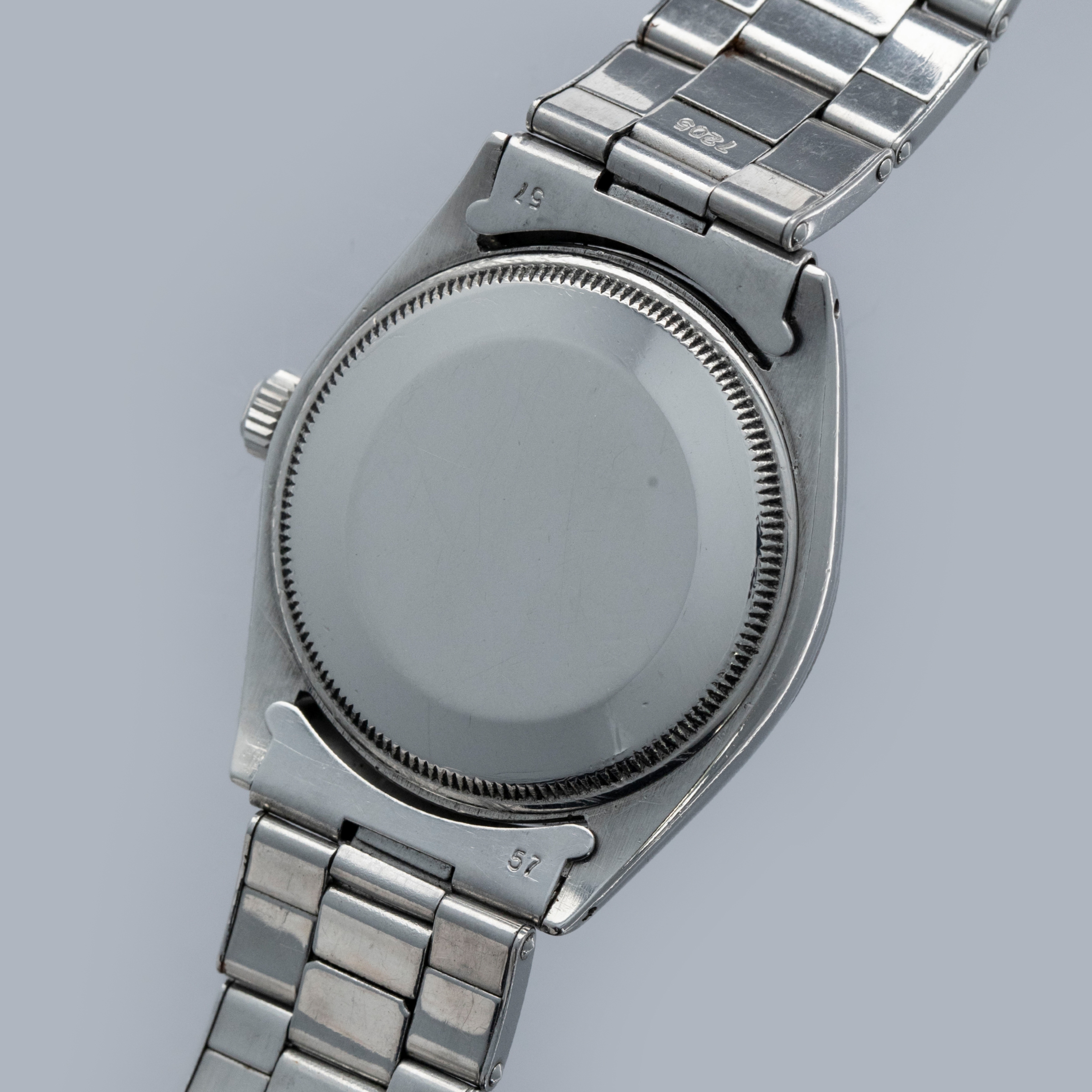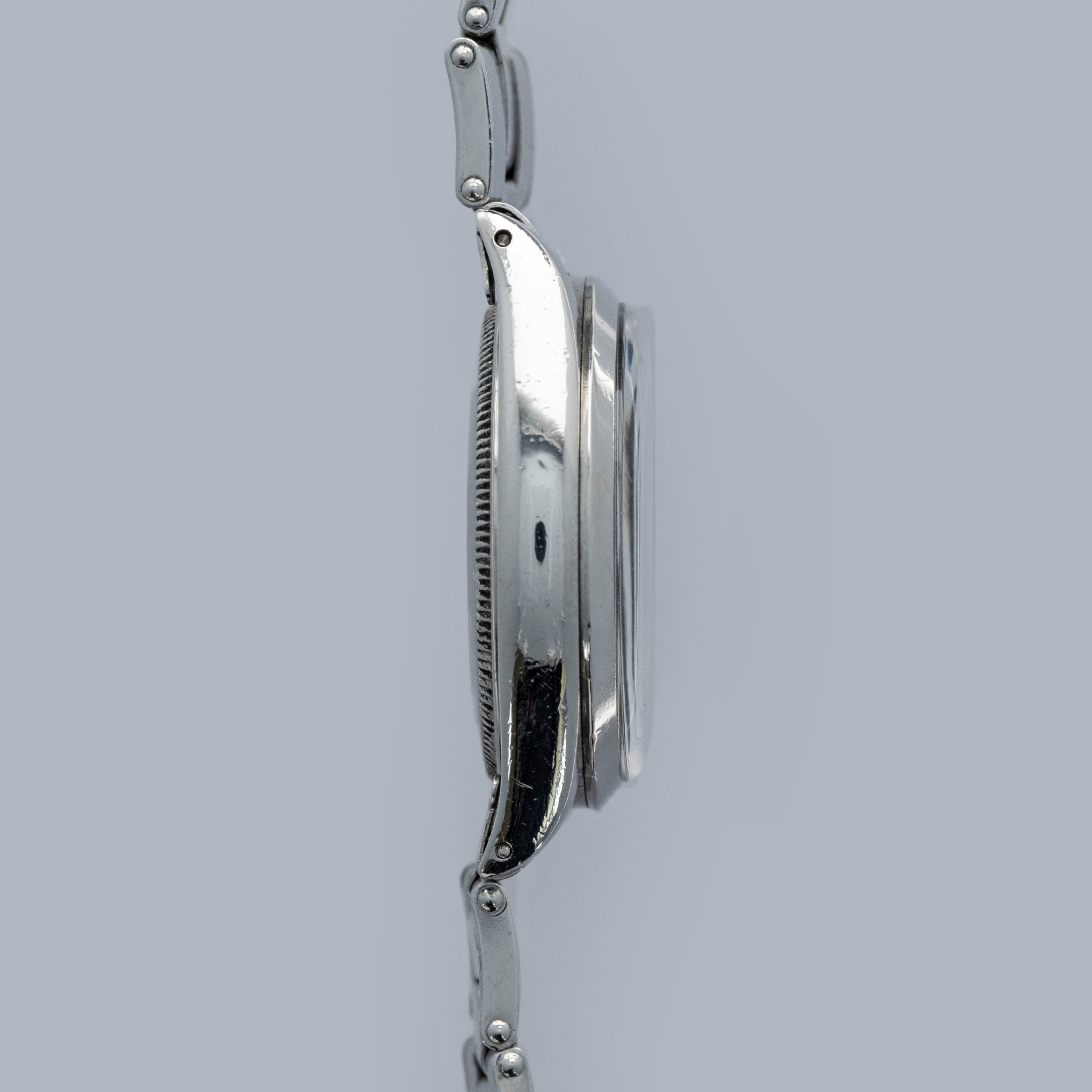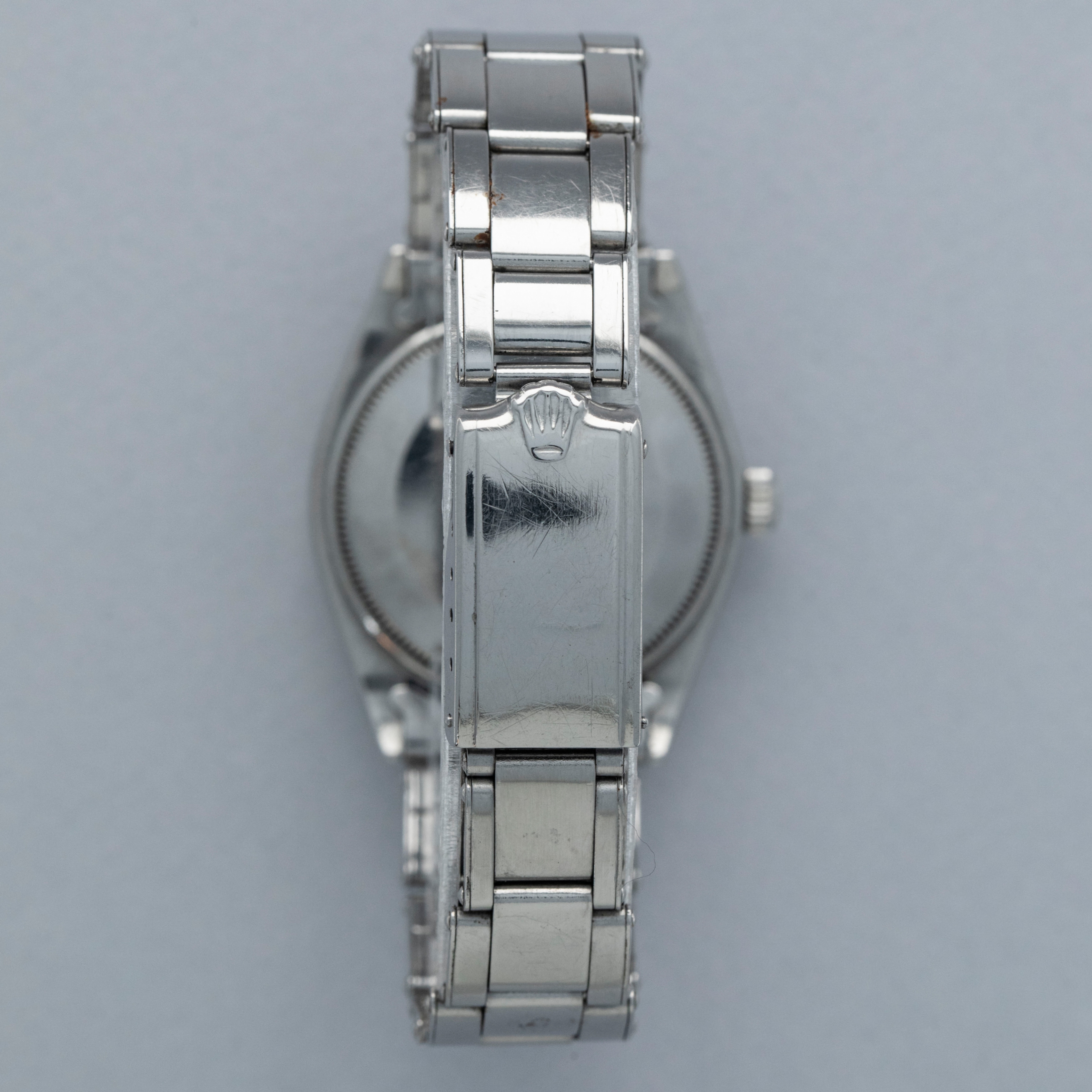 The watch is in overall excellent condition. The steel case has some scratches and marks commensurate with a watch of this vintage, and the brushed areas of the case have developed a sheen from wear over the decades. The case back has some scratches and nicks. The gilt dial is near-mint, retaining its glossy finish and clean lume plots. The hands show some discoloration in the lume, and the seconds hand has been relumed at some point. The Swiss rivet-link Oyster bracelet has surface marks and light play between the links. The bracelet has 12 links and fits an approximately 7 1/4” wrist.