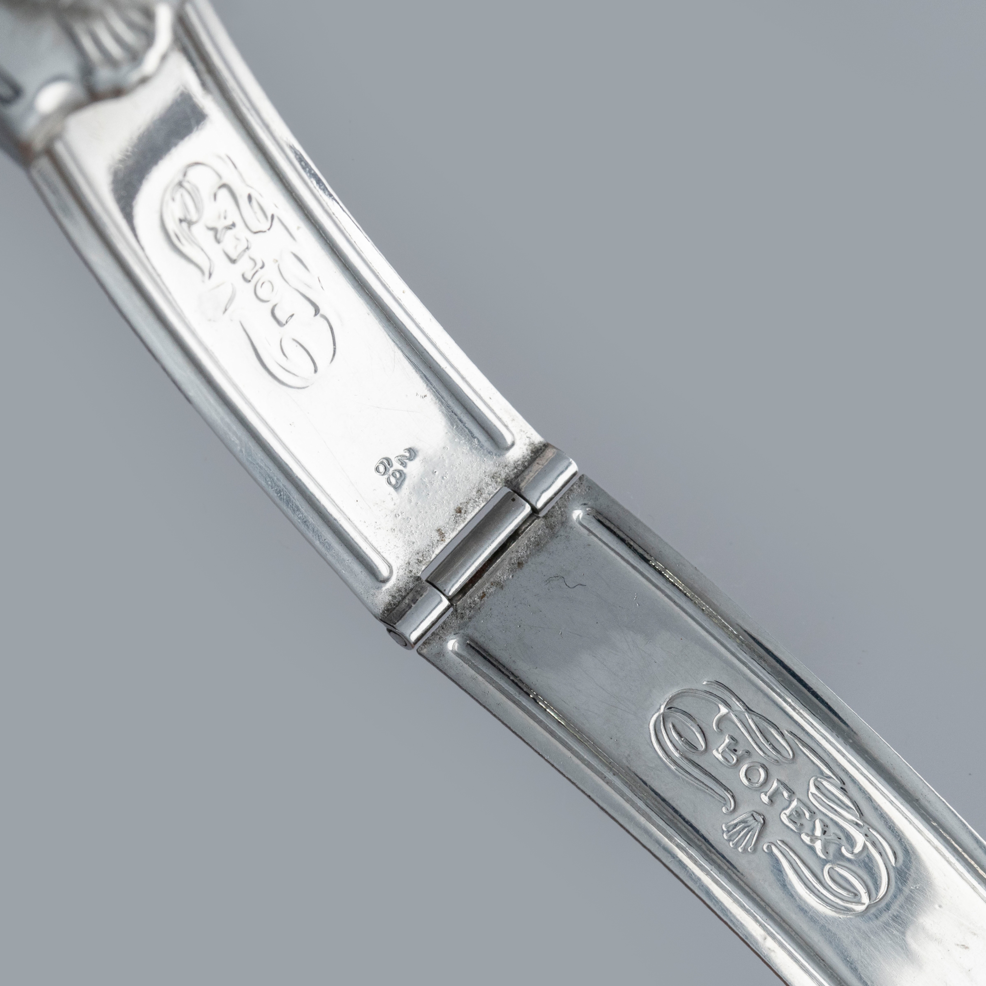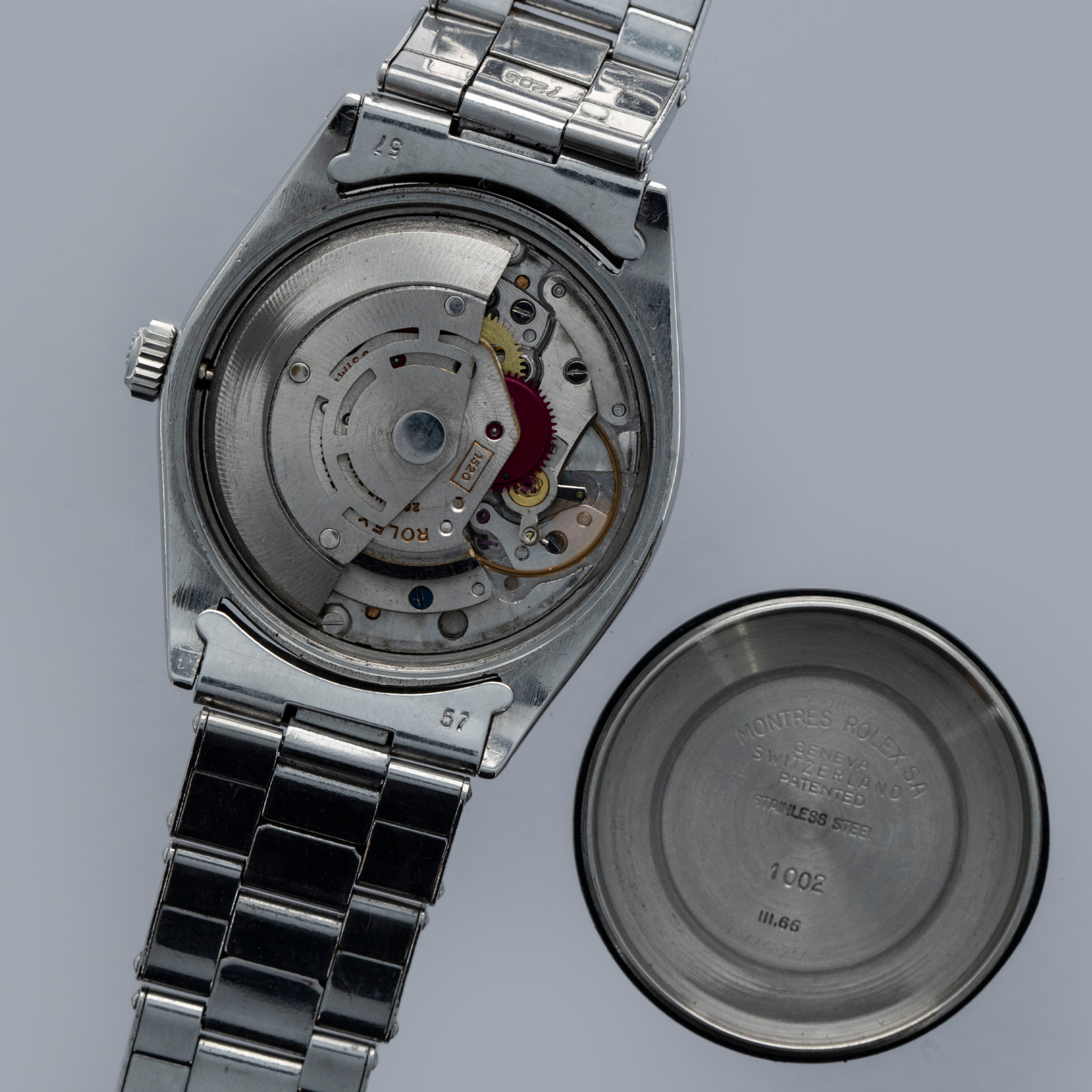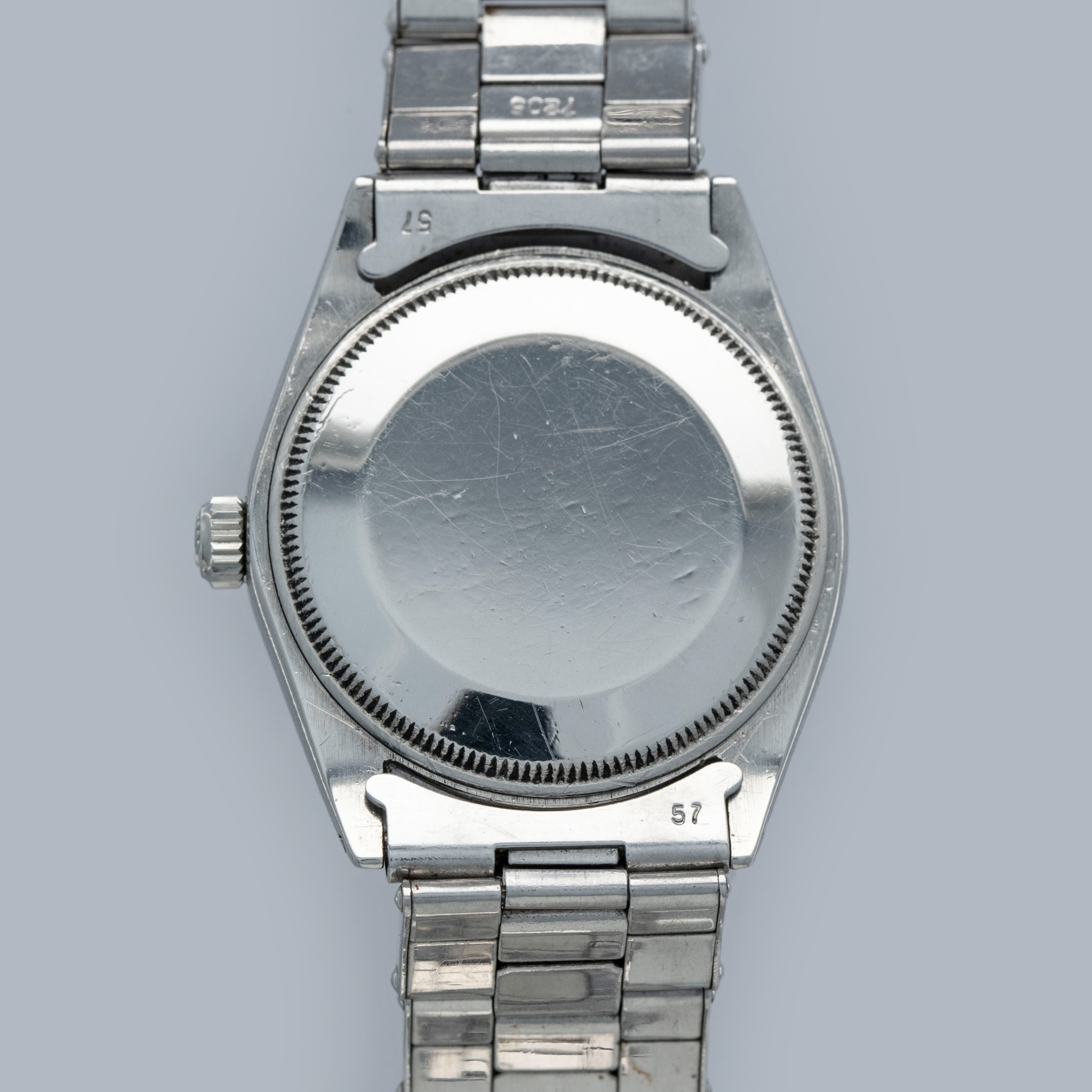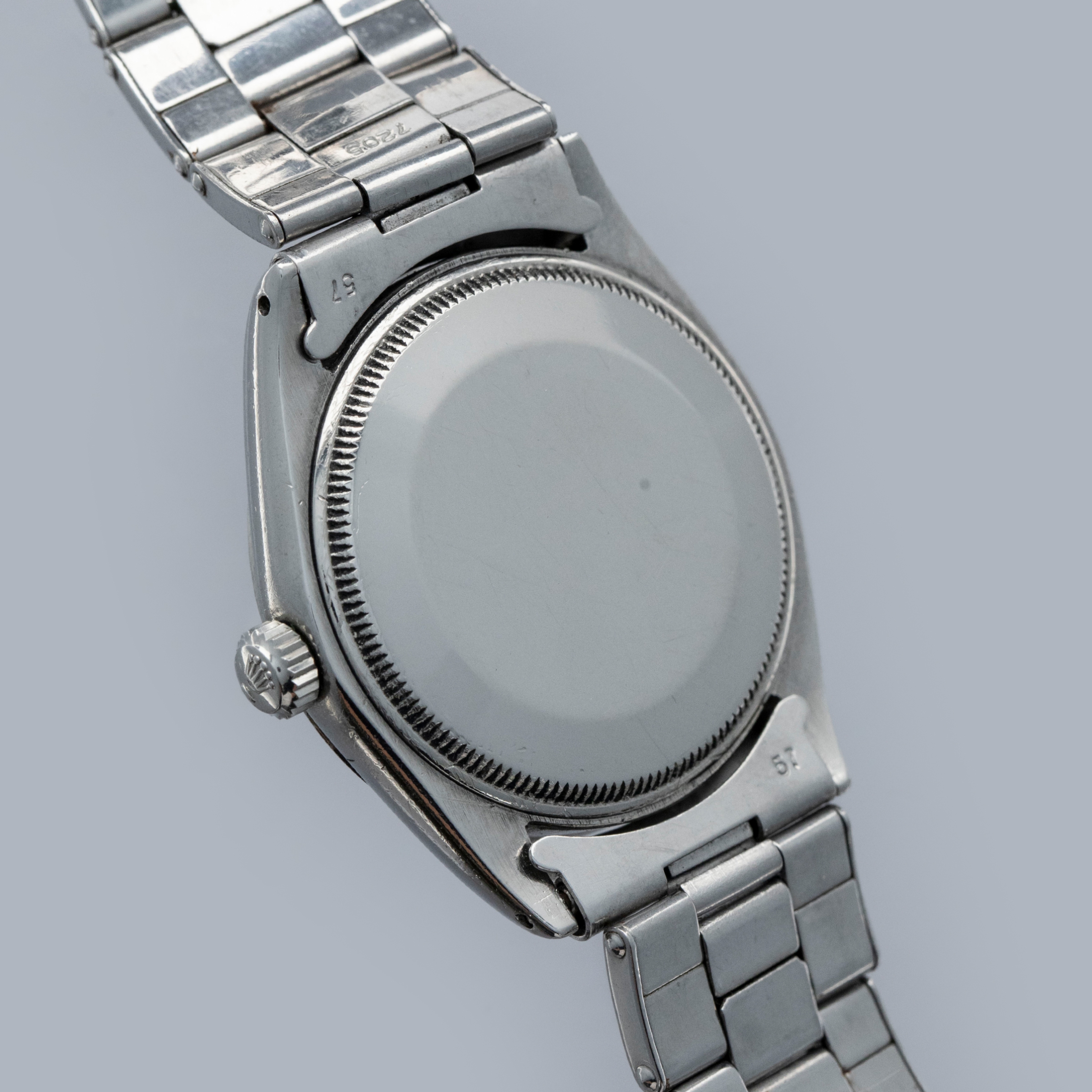 The watch is in overall excellent condition. The steel case has some scratches and marks commensurate with a watch of this vintage, and the brushed areas of the case have developed a sheen from wear over the decades. The case back has some scratches and nicks. The gilt dial is near-mint, retaining its glossy finish and clean lume plots. The hands show some discoloration in the lume, and the seconds hand has been relumed at some point. The Swiss rivet-link Oyster bracelet has surface marks and light play between the links. The bracelet has 12 links and fits an approximately 7 1/4” wrist.
