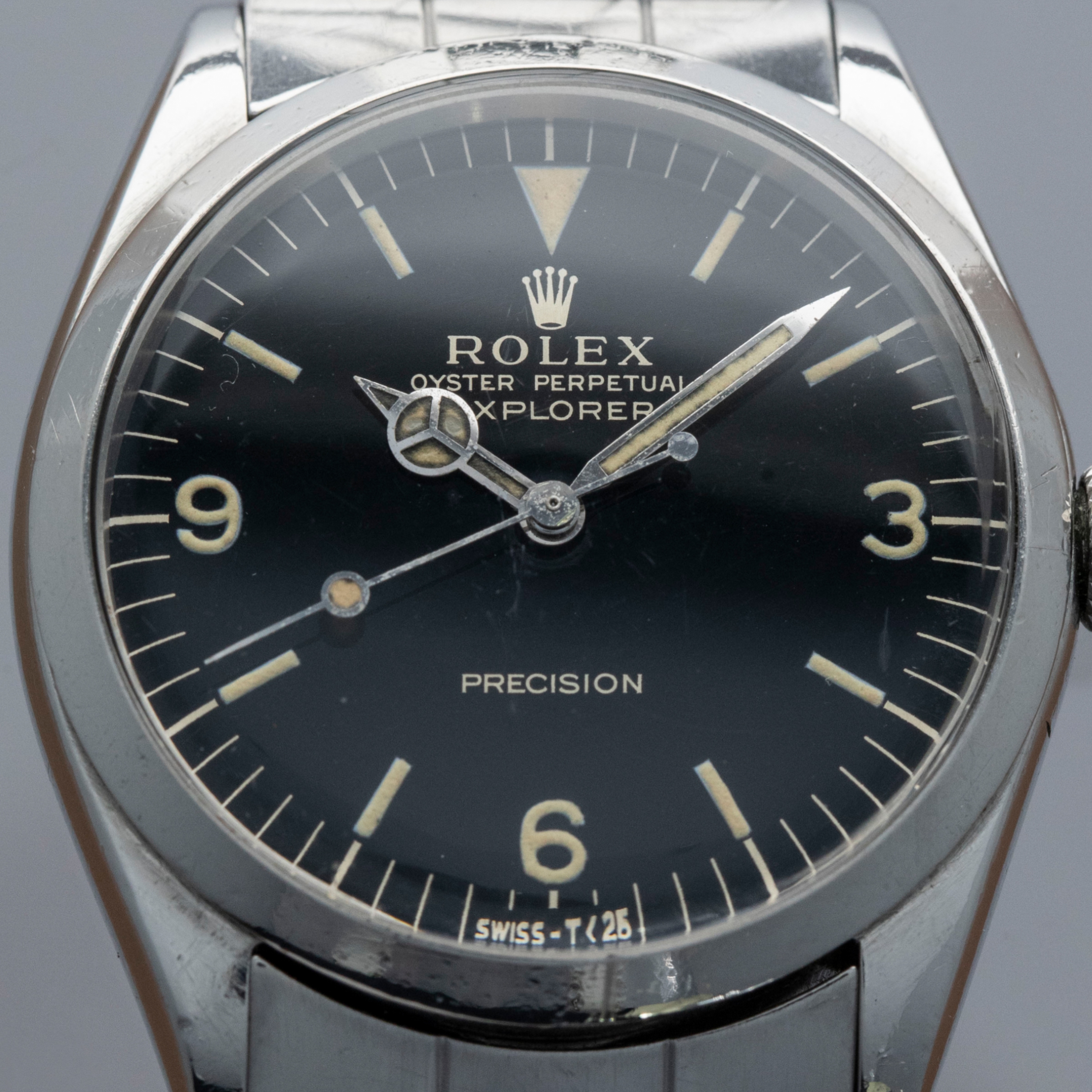 First released in 1945 in honor of the British RAF following their efforts in WWII, the Air-King has become one of the longest-serving members of Rolex’s catalog, with its official debut as a standalone collection, as we know it today, tracing its origins a little bit more recently to 1958. Since then, the collection has become one of Rolex’s most unique collections, with its design and construction often used as a means to push aesthetic boundaries and experiment with design in a way that few other collections within the Rolex family could. As such, the Air-King collection has been found to sport a vast expanse of dial colors and set-ups, with different bezel configurations and a large variety of sizes, with this ref. 5500 being the perfect example of that very essence, because this is not a normal ref. 5500: it is an Explorer. Produced between 1958 and 1967, the Explorer ref. 5500 was offered as a scaled-down version of the 36mm Explorer, with the Explorer ref. 5500 featuring the Air-King’s 34mm construction, smaller hands, and “Precision” designation instead of the Explorer’s usual “Superlative Chronometer Officially Certified”. However, none of this takes away from the ref. 5500 Explorer’s desirability, with its obscure history and extreme rarity (when compared to that of its Air-King-branded ref. 5500 siblings), combining to create a wonderfully obscure part of Rolex’s history. Made for the UK market and most commonly sold through NAAFI stores, which were the British military’s equivalent of the US’ Post Exchange stores that sell goods to military personnel and their families living on military installations, these timepieces are inextricably linked to Rolex’s rich heritage creating timepieces for militaries across the world.