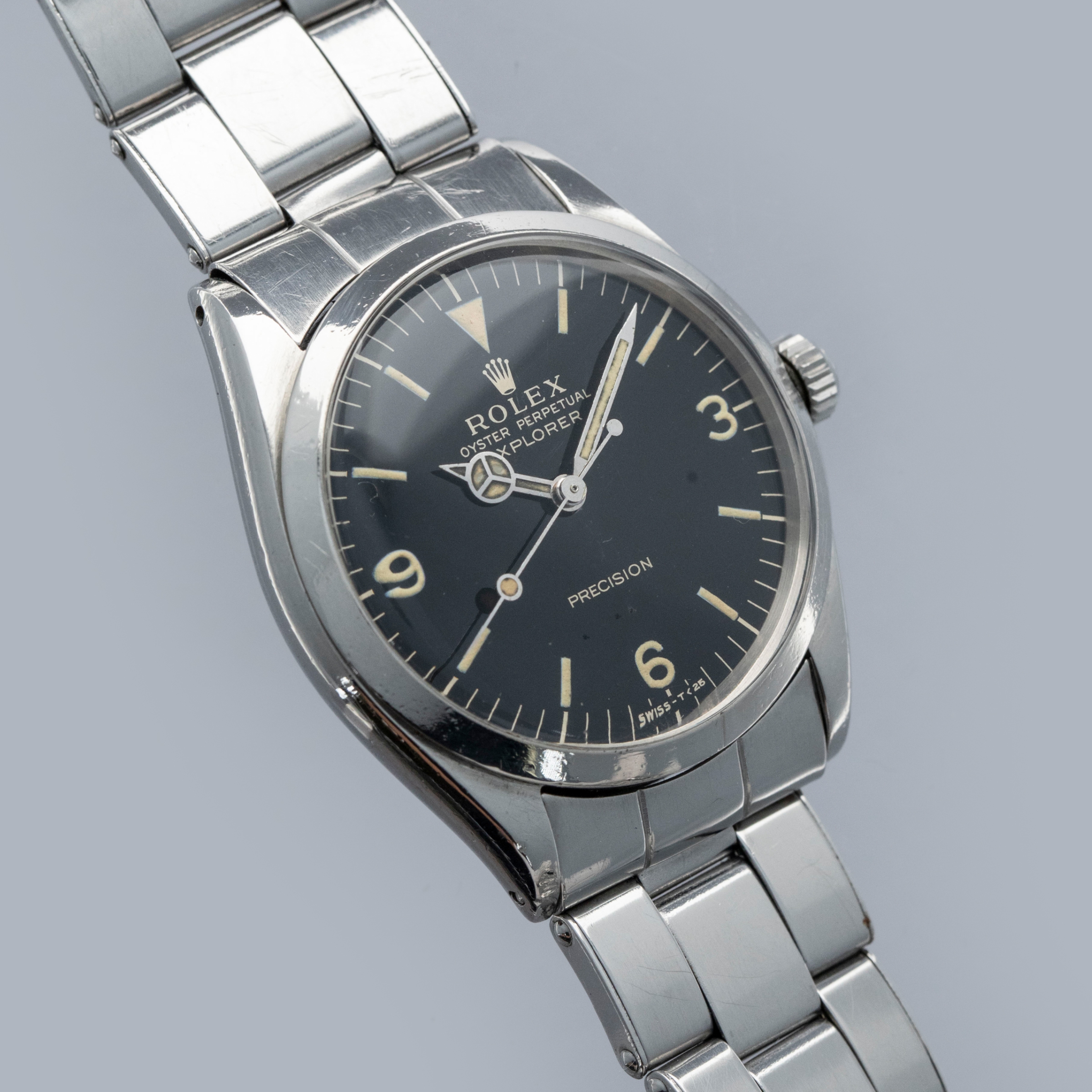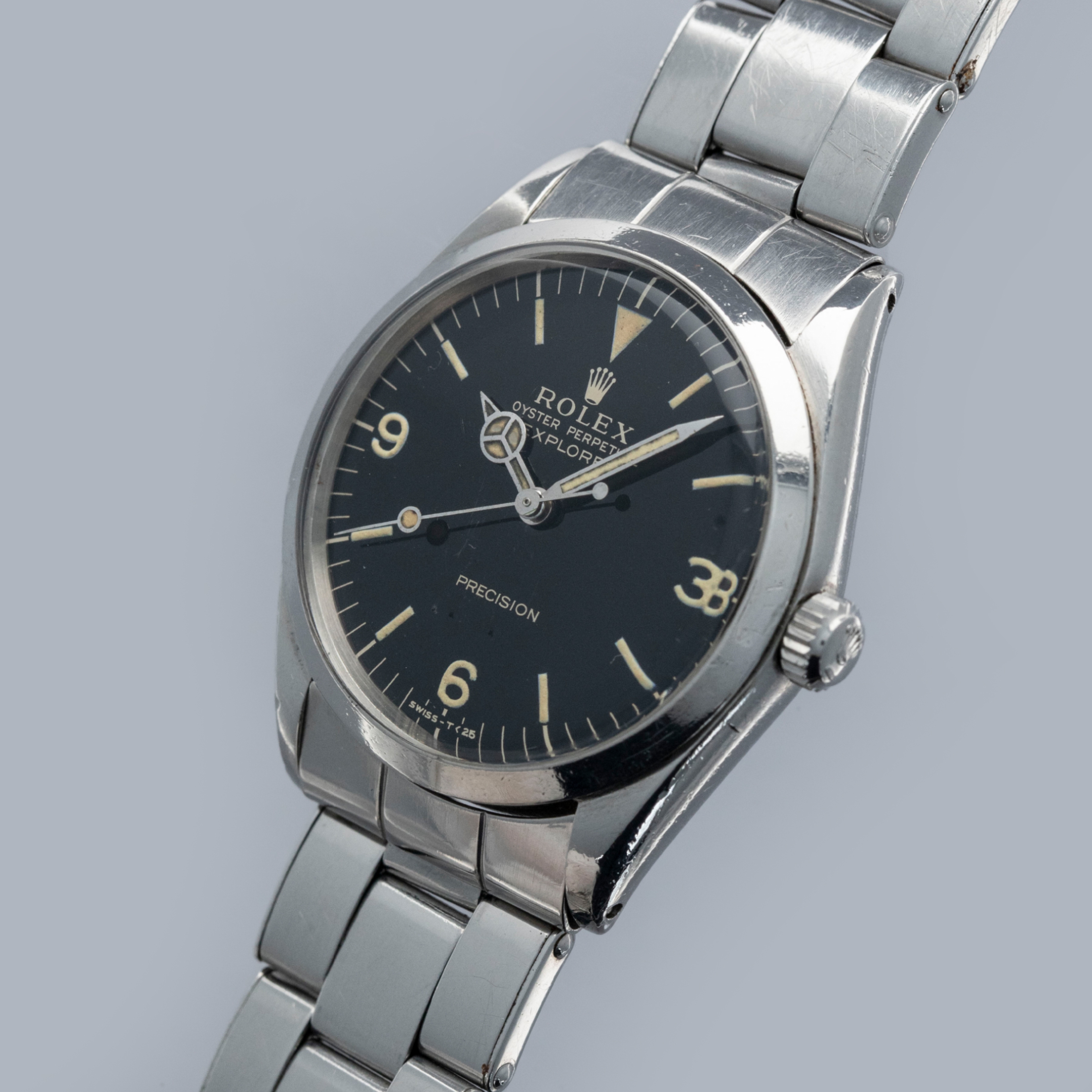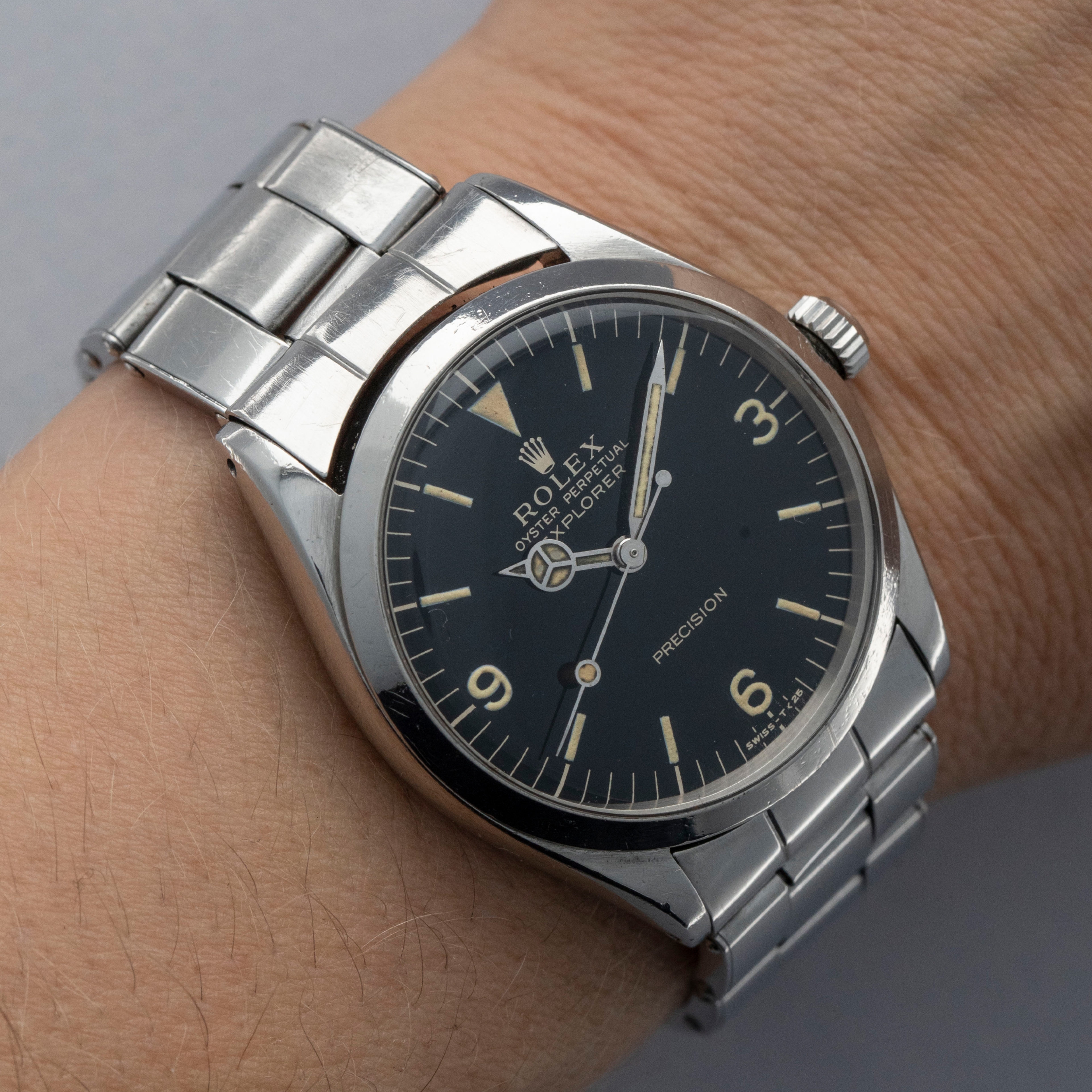 Featuring some subtle differences to the Explorer's usual dial design, the ref. 5500 Explorer's black 3-6-9 gilt dial features a slightly smaller handset (in line with its smaller 34mm construction) and a "Precision" designation at 6 o'clock instead of the usual “Superlative Chronometer Officially Certified”.