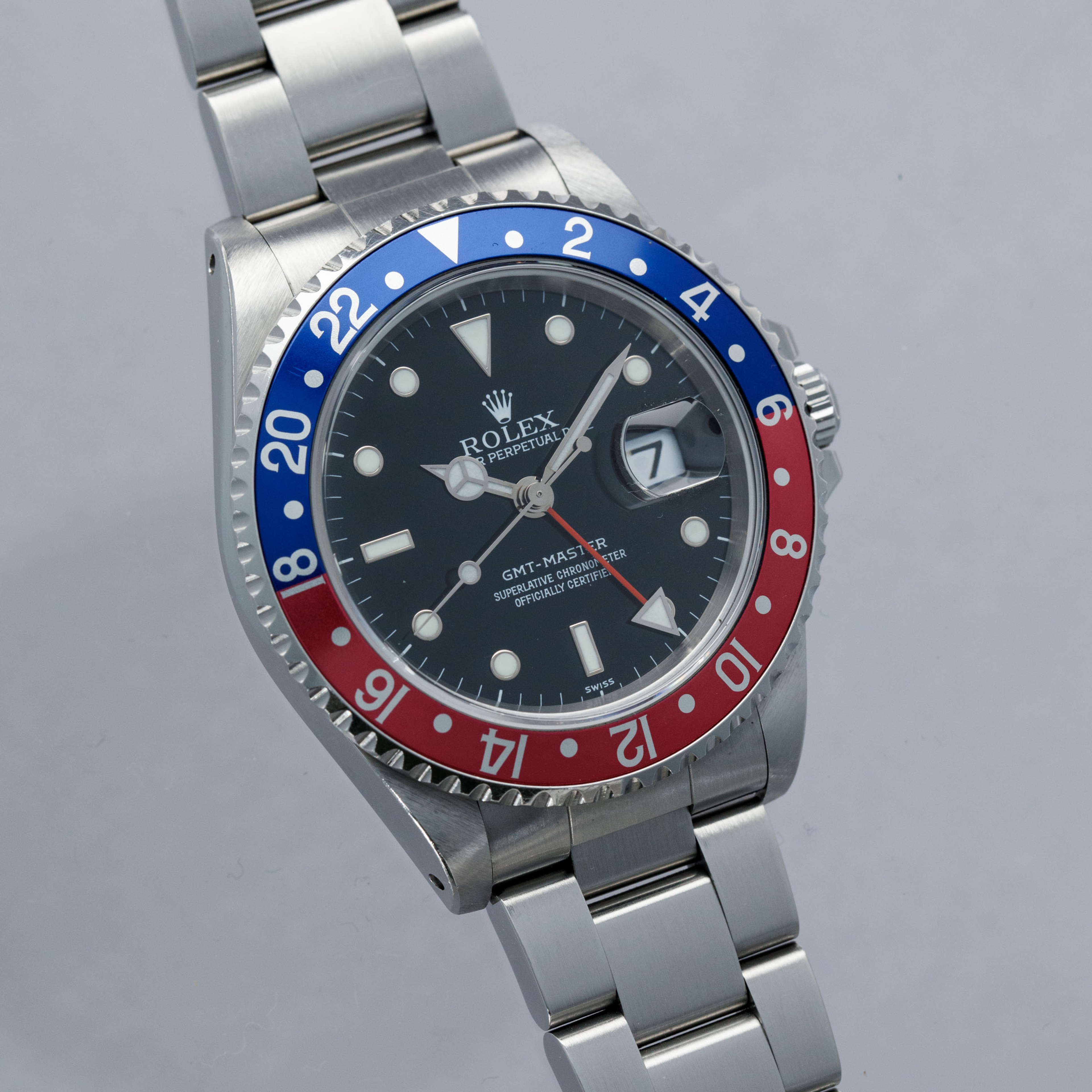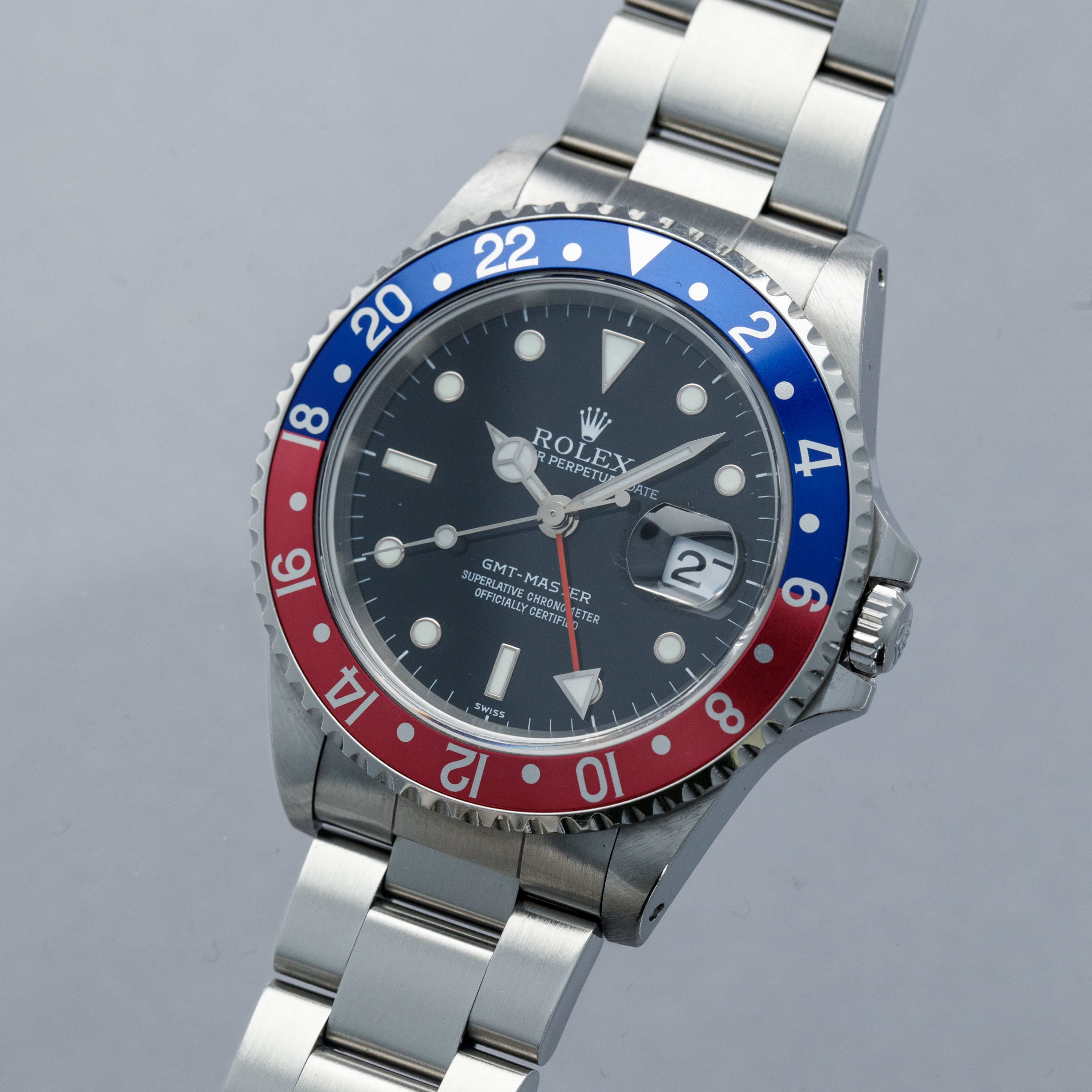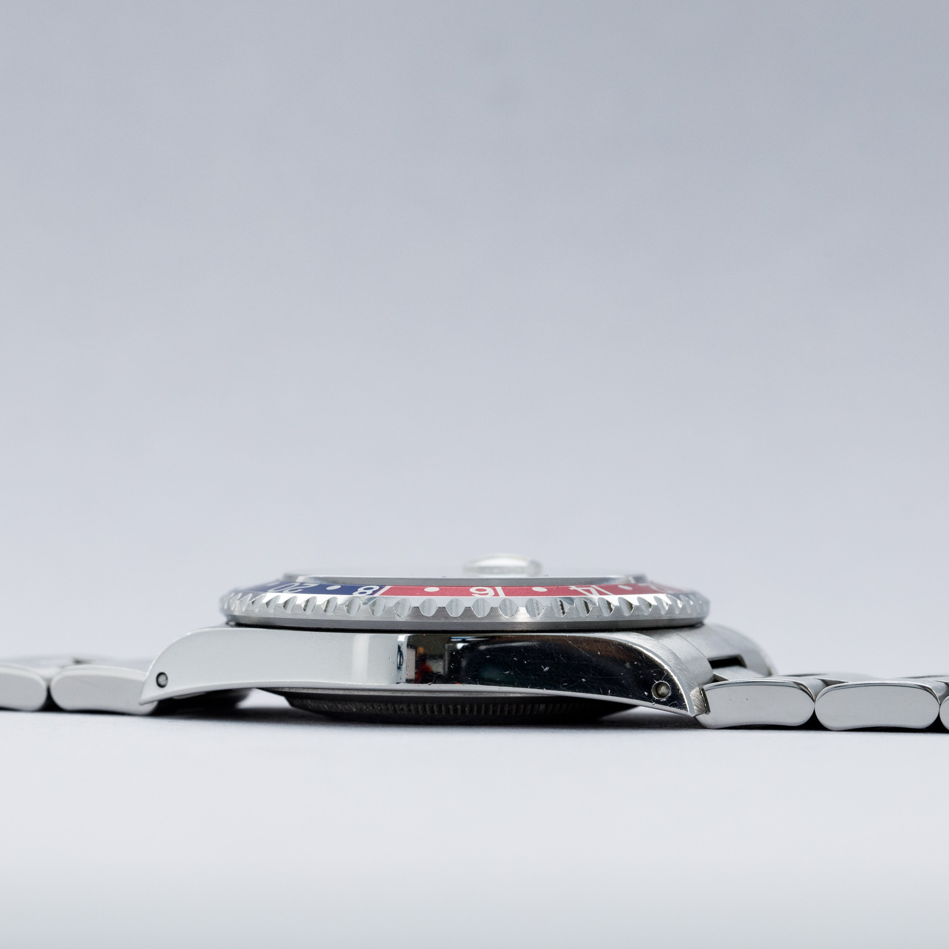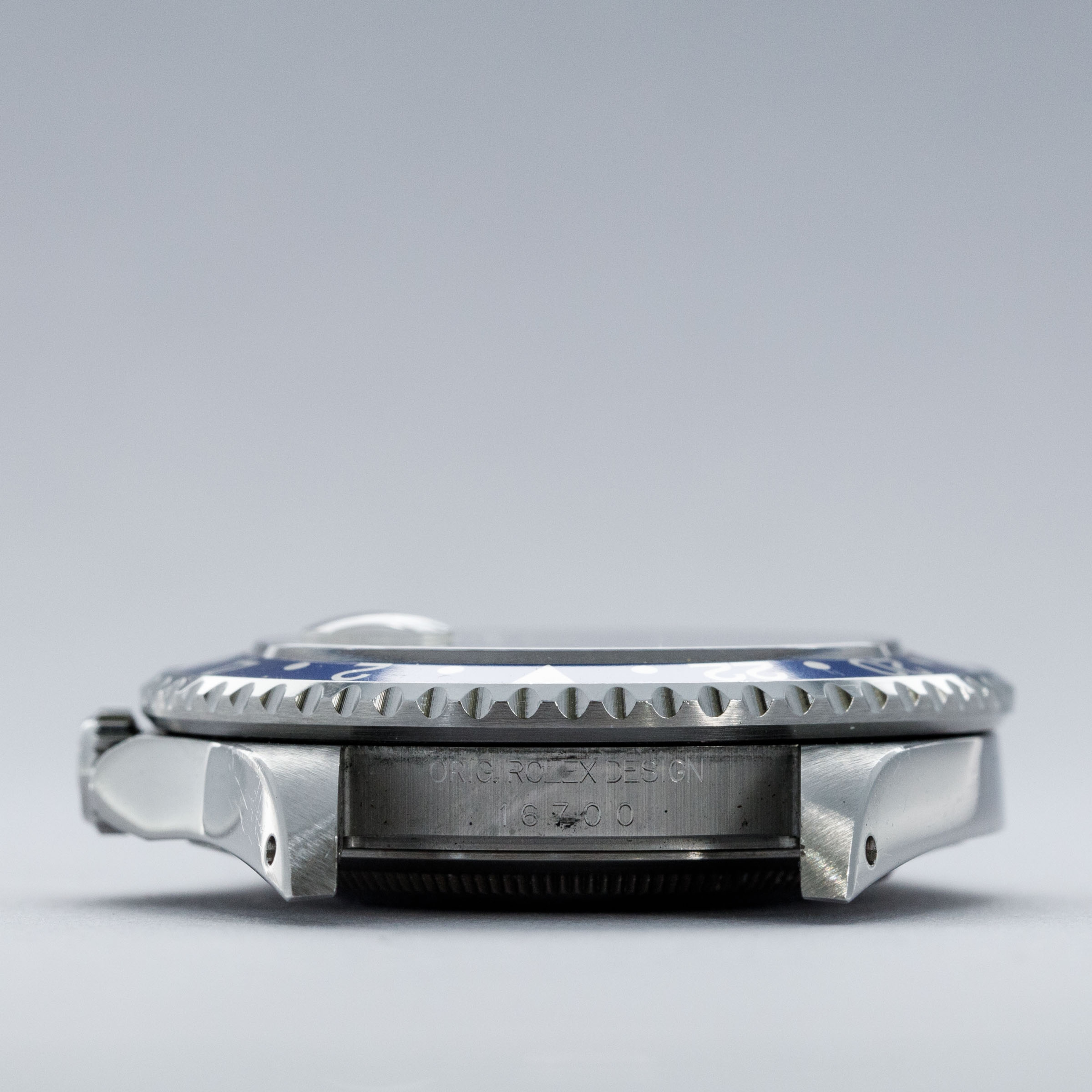 Released in 1988, the Rolex GMT-Master ref. 16700 replaced the outgoing ref. 16760 "Fat Lady," as collectors longed for a slimmed-down GMT-Master without the Fat lady's thicker case, beefier lugs, and larger design. Discontinued in 1999, the ref. 16700 was produced alongside the modern GMT-Master II and its successor, the GMT-Master ref. 16710, which was released a year after in 1989. As both of these options were more technically advanced than the ref. 16700 that we have here, the ref. 16700 failed to perform as well as it might have, with collectors spending the extra money to buy either the ref. 16710 instead, or the GMT-Master II when it was released. This has enabled the ref. 16700 to enjoy superior demand within the modern market as collectors seek out this now scarce timepiece. Offered with either an all-black bezel or the iconic red and blue Pepsi bezel, the ref. 16700 is the quintessential GMT-Master with its elegant design and vintage traits such as an aluminum bezel insert, hollow end links, hollow center links, and tritium lume (until 1997).