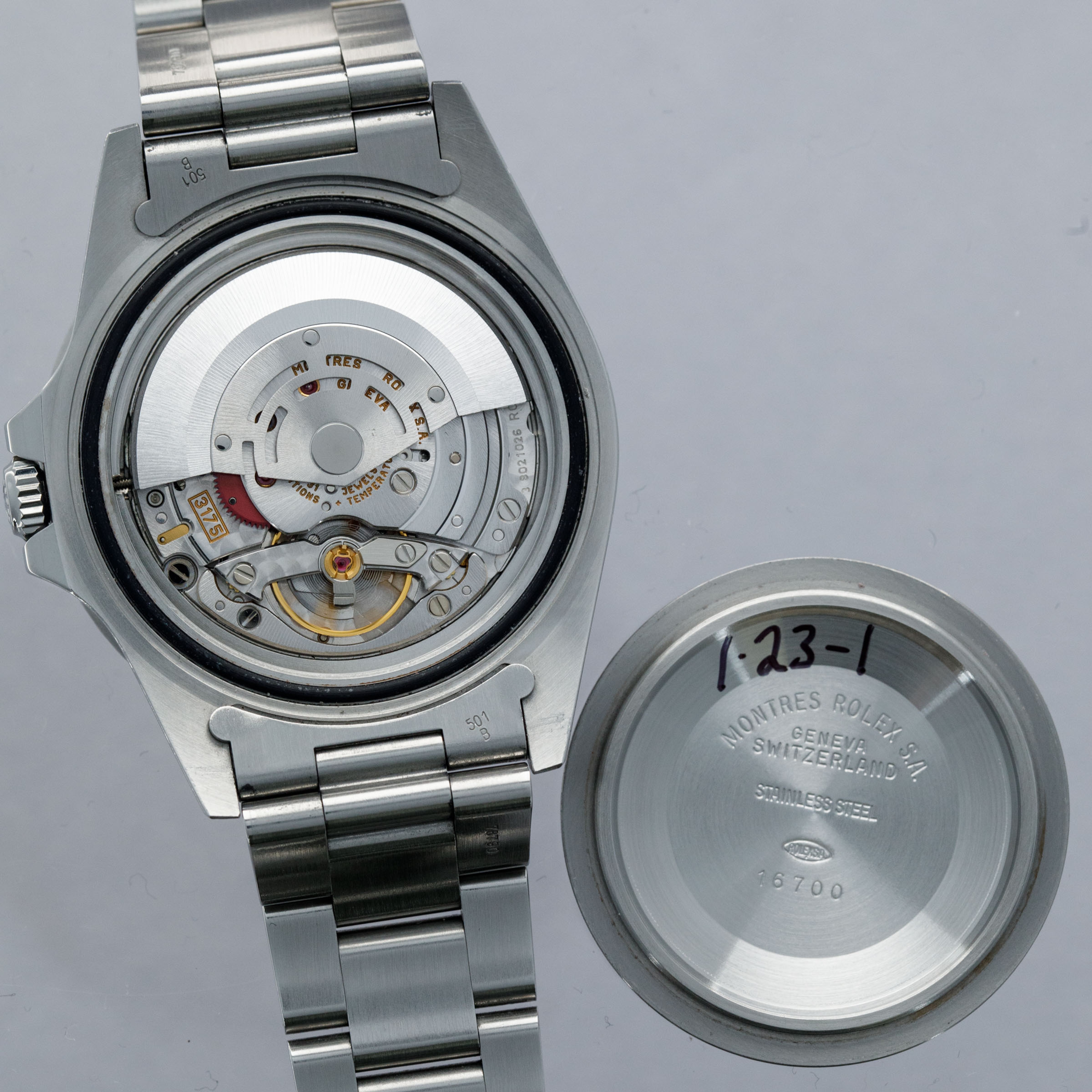 Featuring its iconic 'Pepsi' bezel, so named due to its blue and red colors that are used to indicate either AM or PM at a glance, the ref. 16700's aesthetic is distinctly 'Rolex' with its Oyster bracelet and timeless case design.