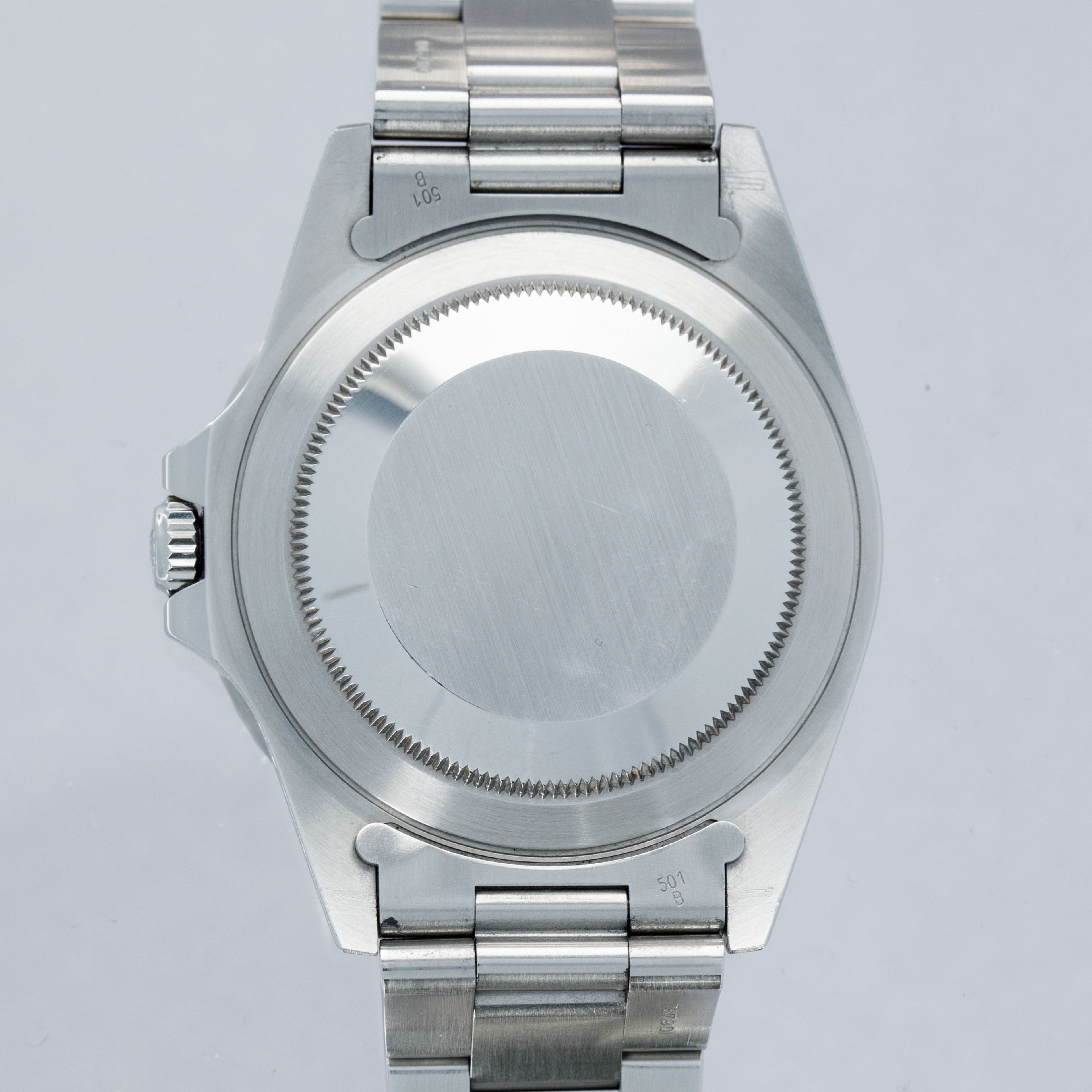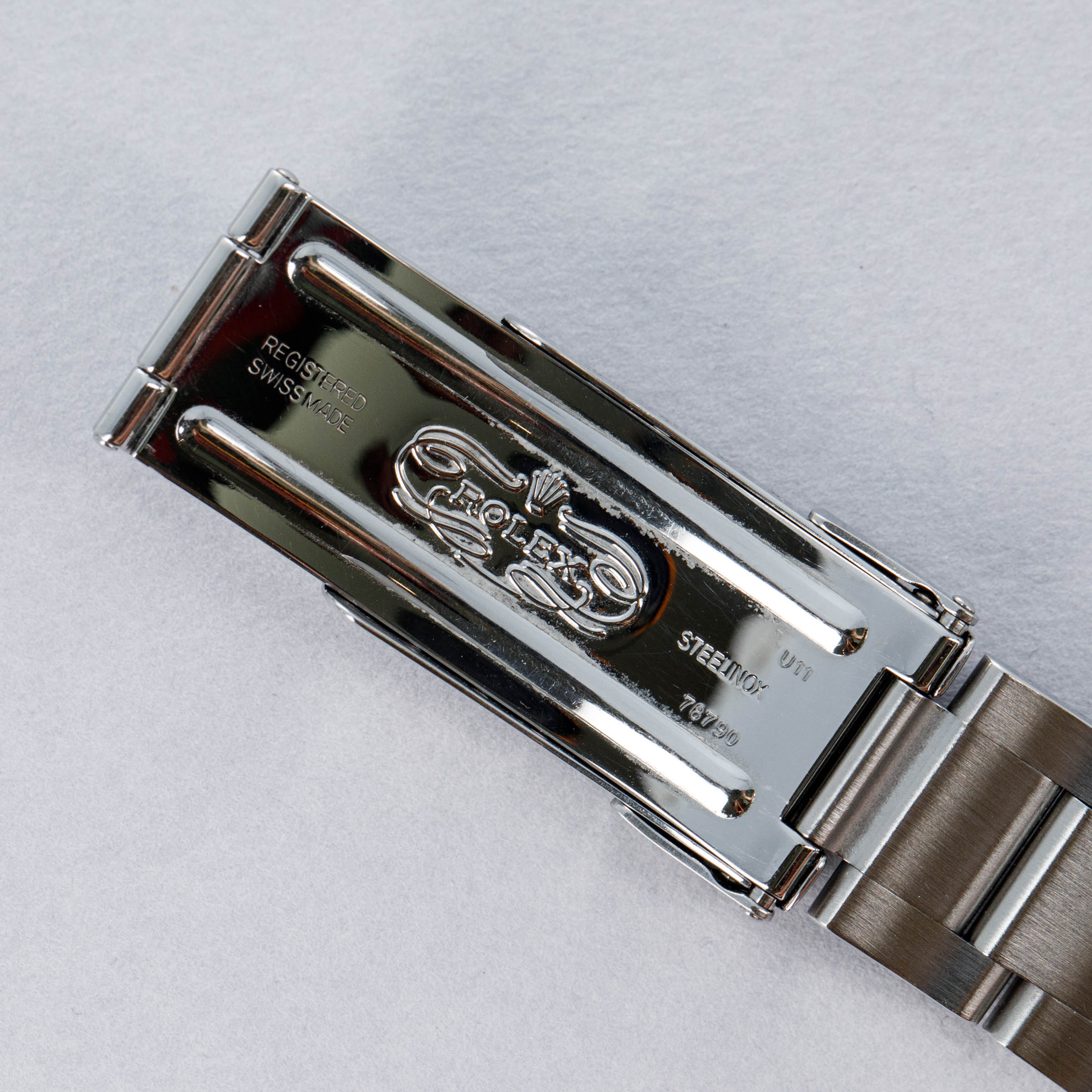 Watch is in excellent condition. The case shows minor surface wear, primarily visible along the polished lug sides and lug hole areas. The bezel is well-defined and crisp, featuring a pristine insert that remains in excellent condition. The glossy black dial is flawless and is signed "SWISS" only, with clean, white luminous material that matches the hands well. The bracelet has 11 links, including 1 removable link, and fits an approximately 6 1/2" wrist. The watch comes with its original papers, inner box, and outer box.
