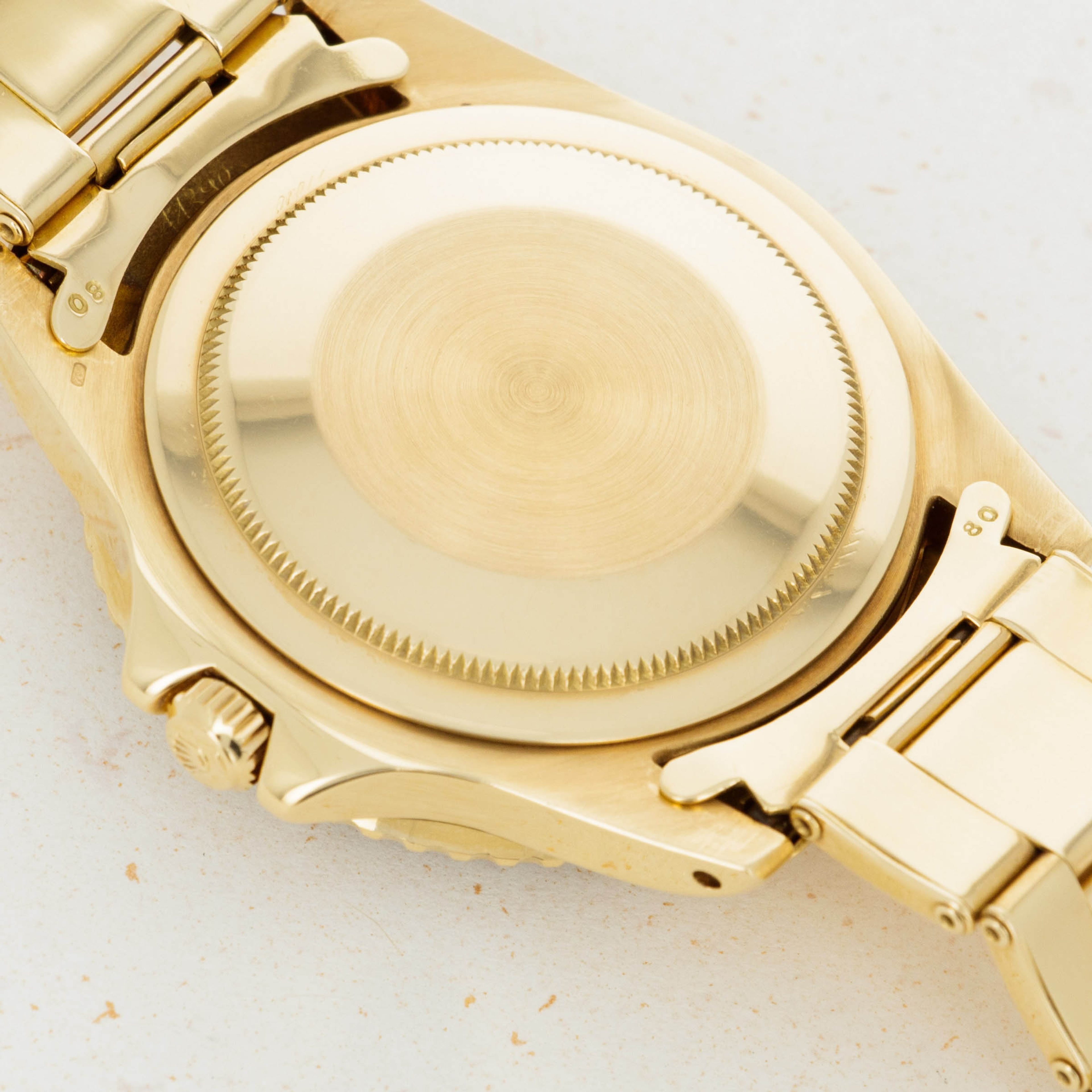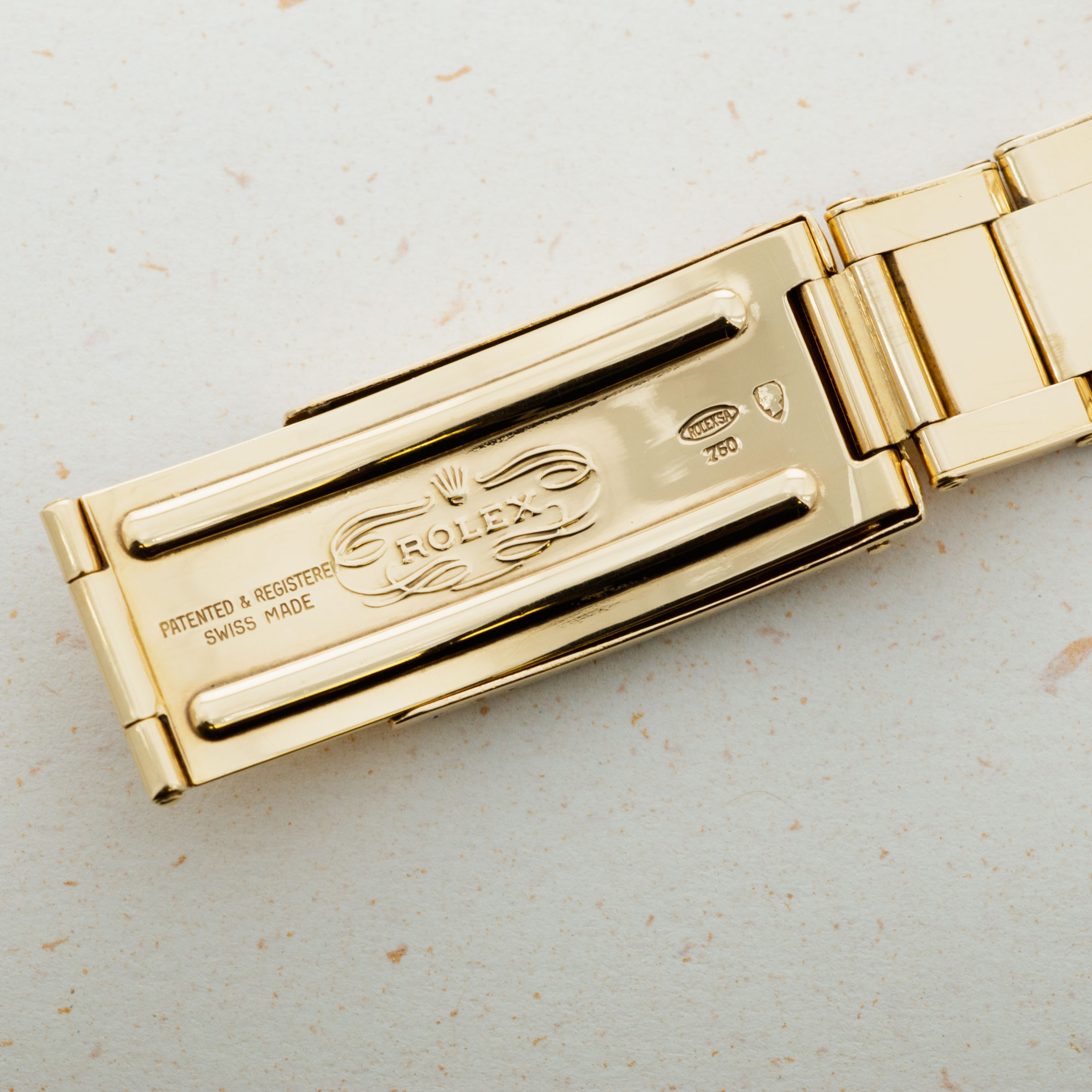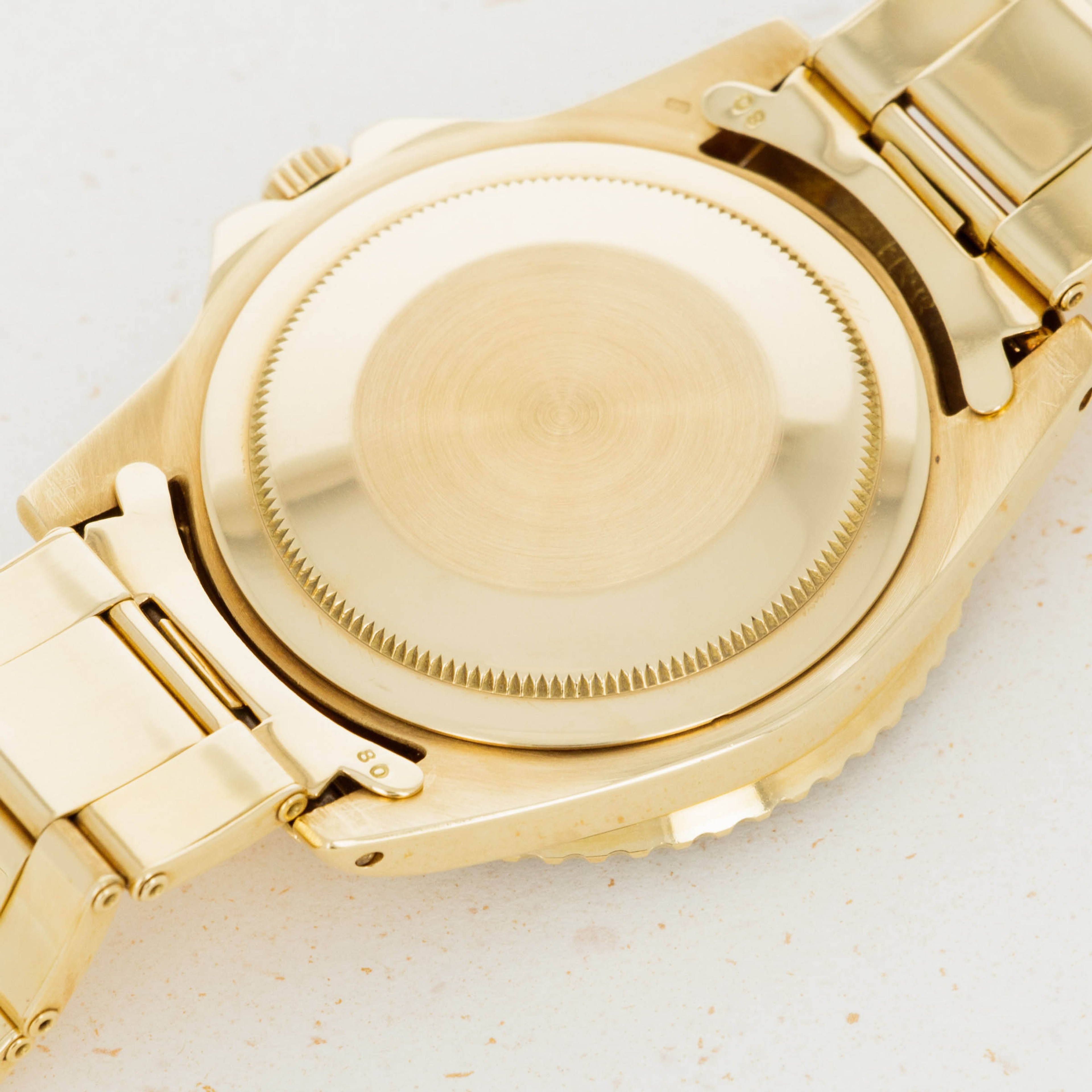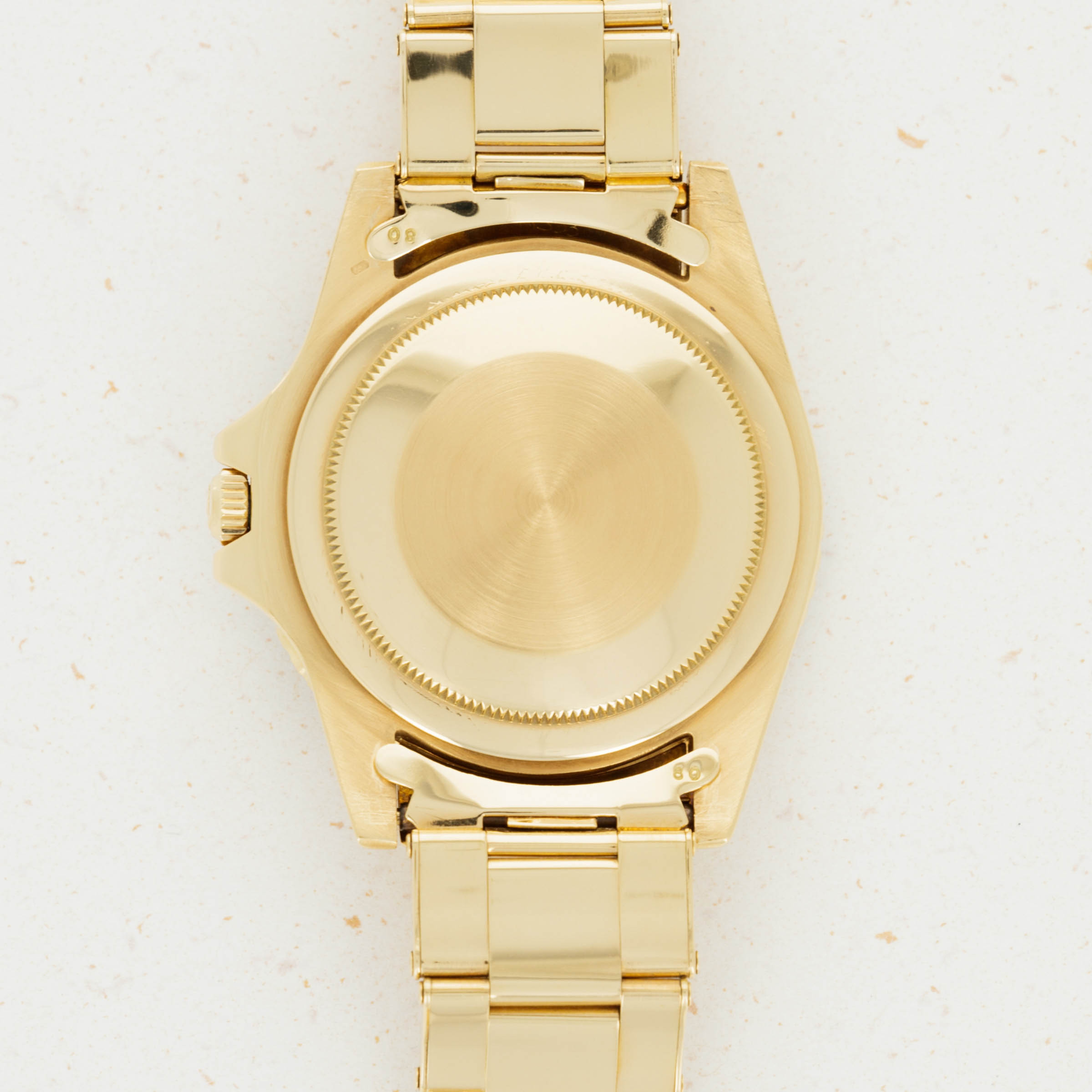 Overall condition is near-mint. Dial appears to be free of any blemishes. Case is very sharp and has strong chamfered edges. Very light surface abrasions present on the bracelet, consistent with careful usage. There is a total of 12 links on the gold oyster band, and it shows little to no stretch.