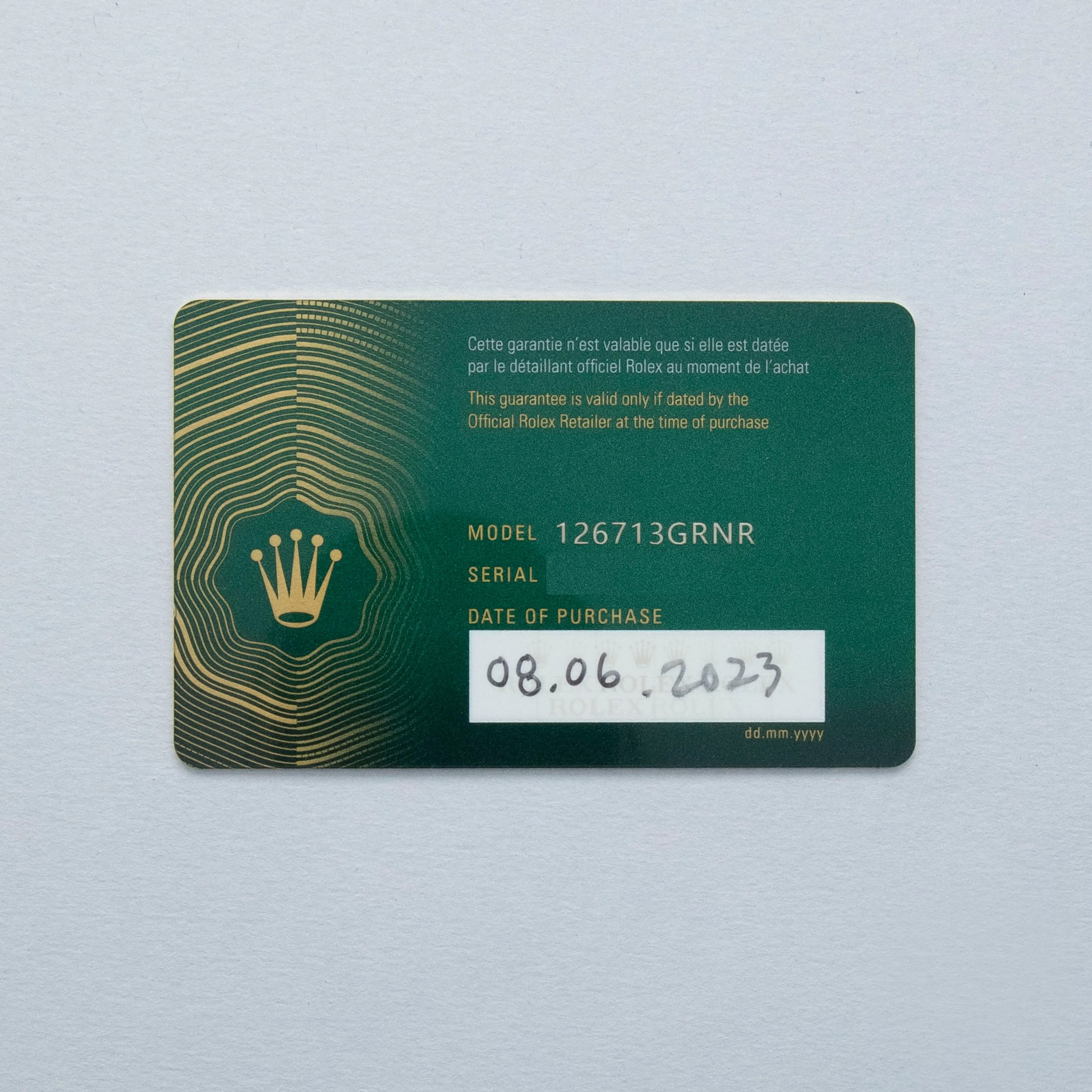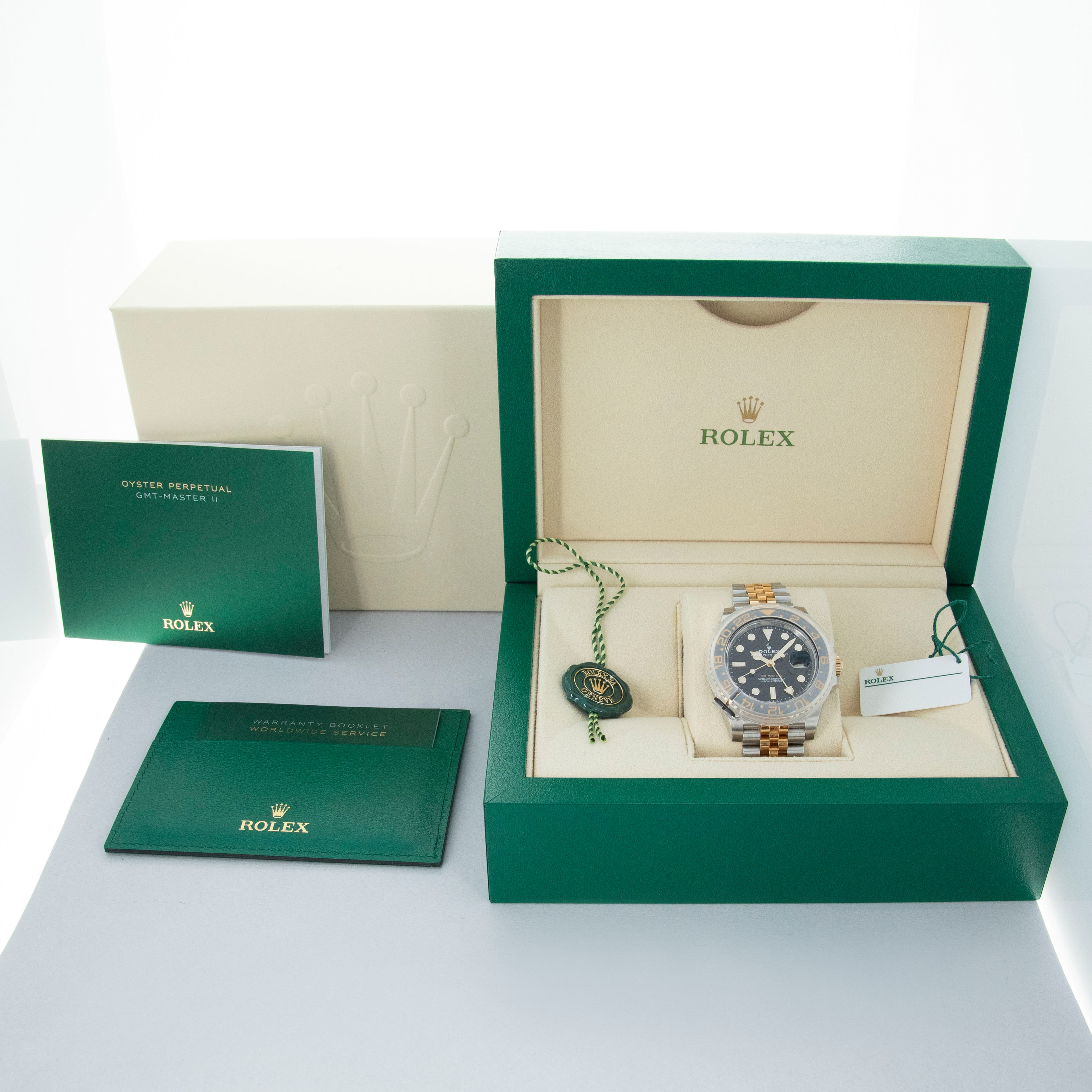 The Rolex GMT-Master is one of the most iconic travel watches ever created, known for combining practical functionality with distinctive design. Introduced in the 1950s during the rise of international aviation, it was developed in collaboration with Pan American World Airways to help pilots track multiple time zones on long-distance flights. Its defining feature is a fourth 24-hour hand paired with a rotating bezel, allowing the wearer to read a second time zone at a glance. Over the decades, the model evolved with improved movements, durable Oystersteel cases, and scratch-resistant Cerachrom ceramic bezels. The later Rolex GMT-Master II introduced an independently adjustable hour hand, making time zone changes even easier for travelers. Famous for its colorful bezel variations and enduring design, the GMT-Master remains a symbol of both adventure and precision watchmaking, a legacy that continues in modern references such as this Rolex GMT-Master II reference 126713GRNR.