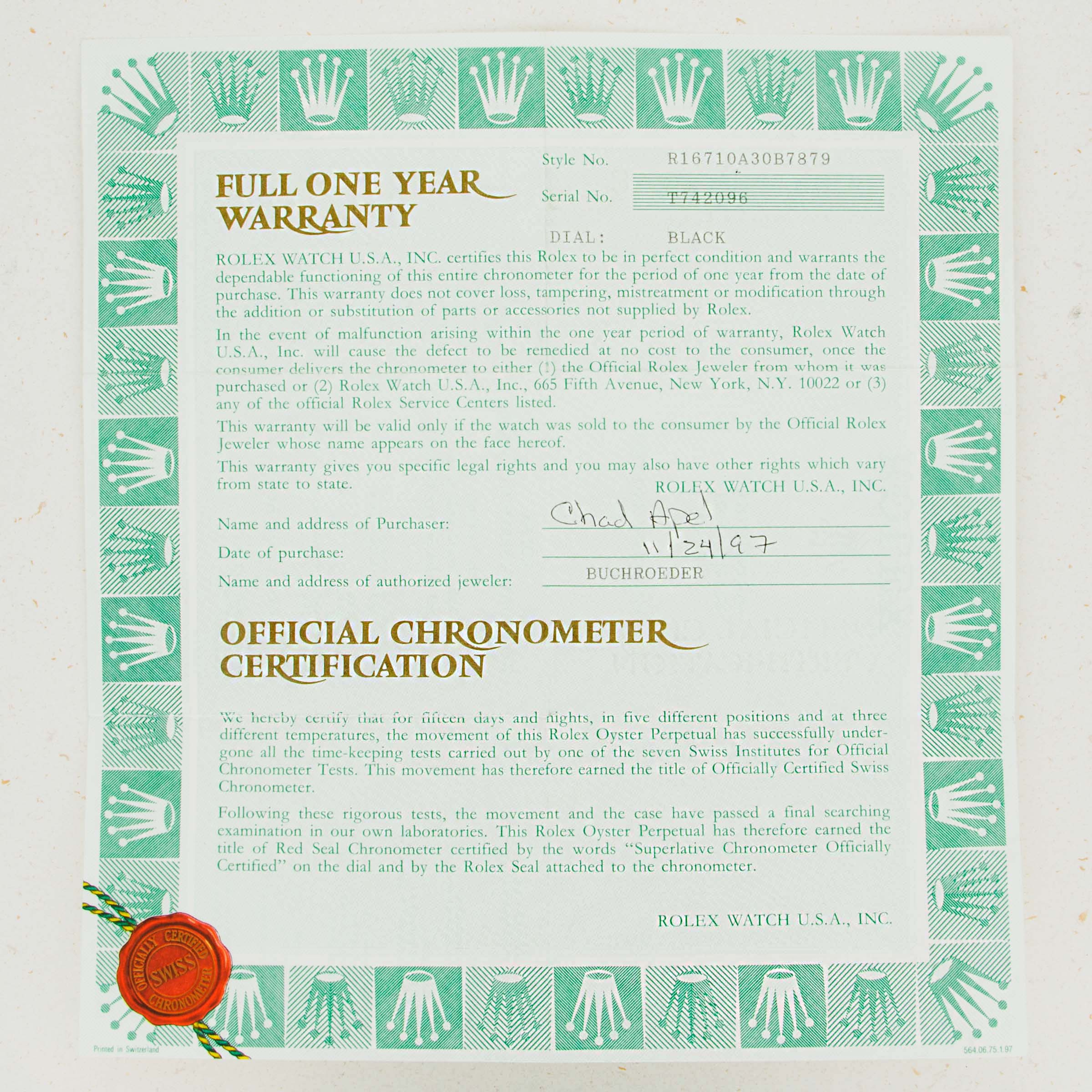 This reading was taken (crown down) with a ONEOF Accuracy Boutique Edition timing machine at time of cataloging. It is provided as a courtesy only, and shall not be construed as a warranty or guarantee of any kind. Please refer to our terms and conditions of sale for more information.