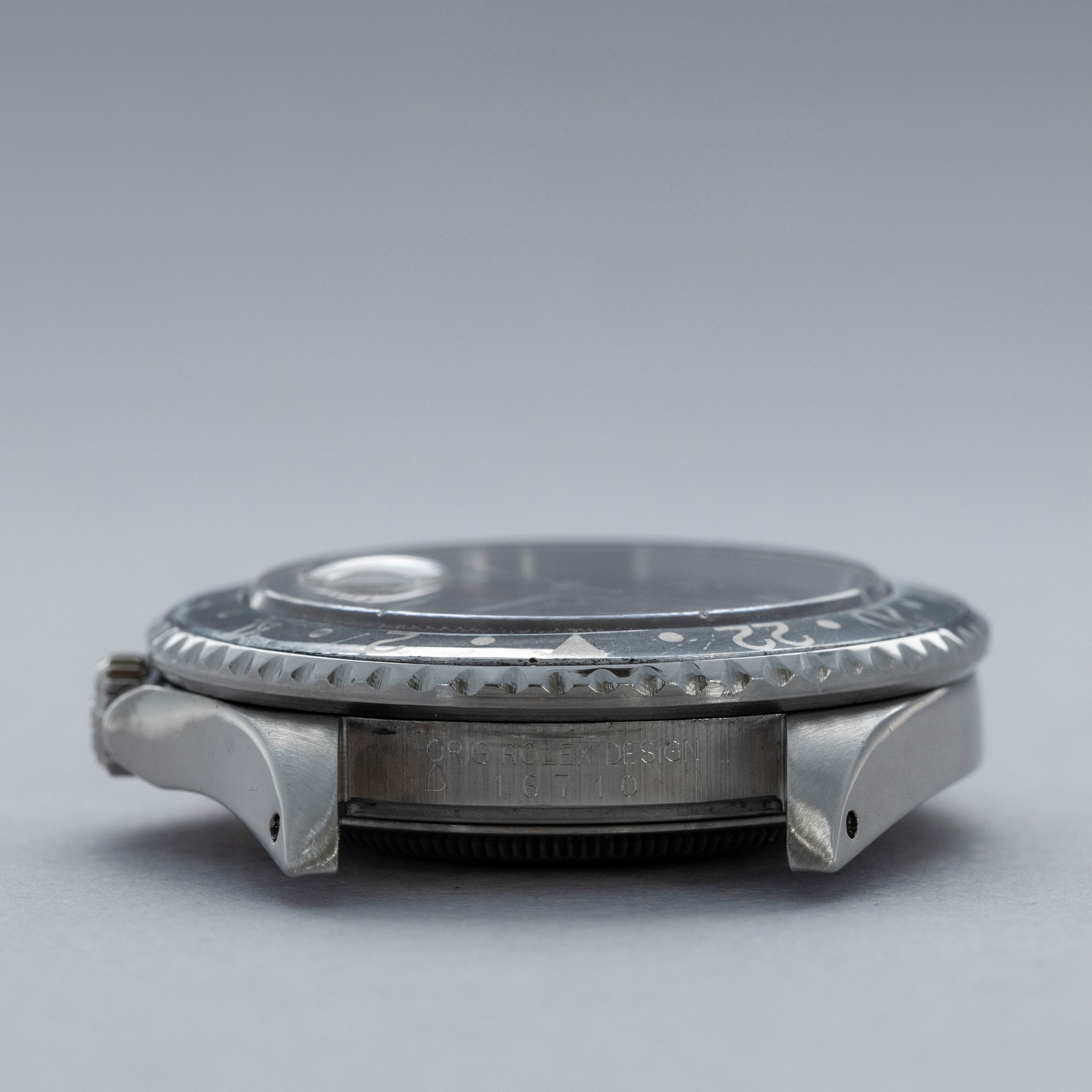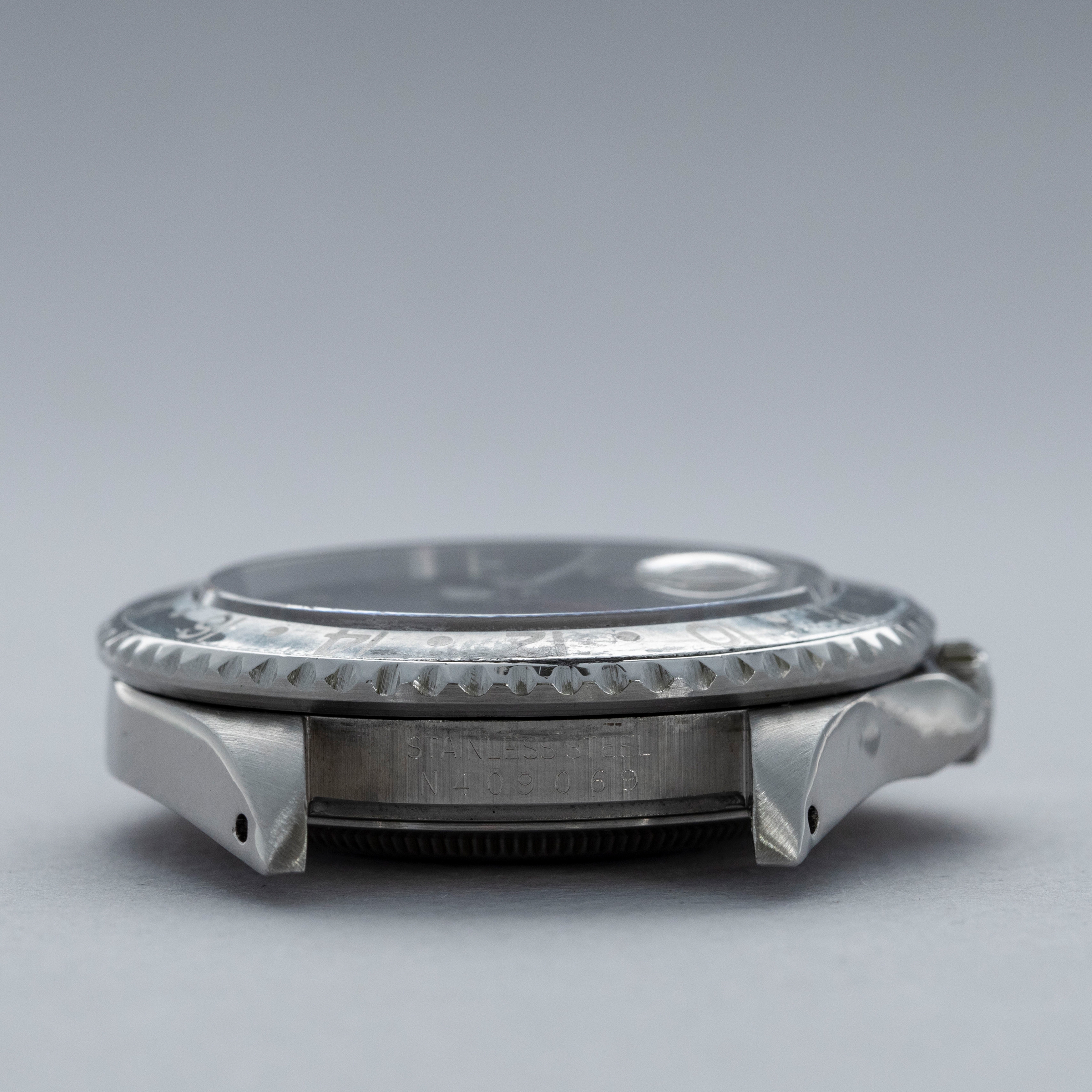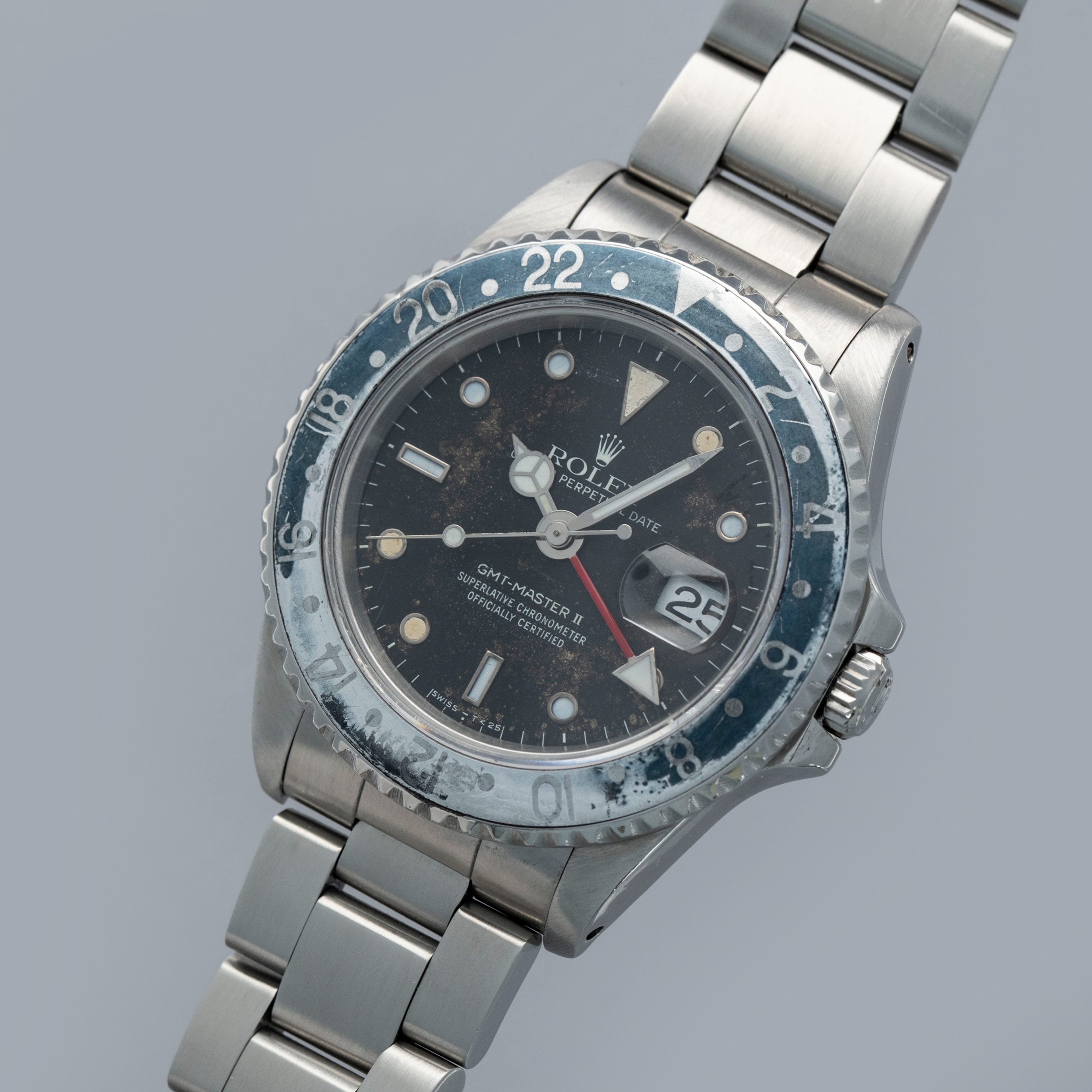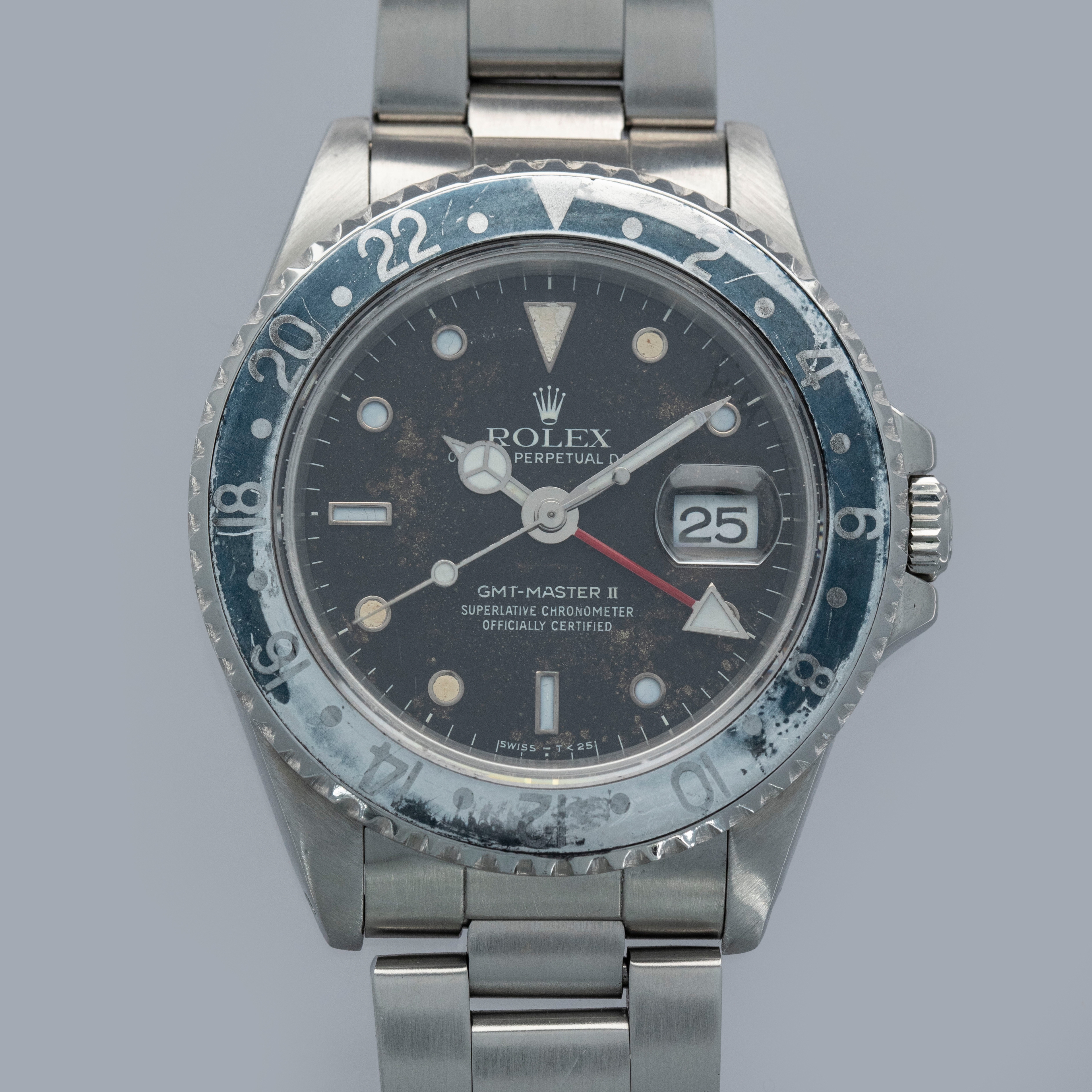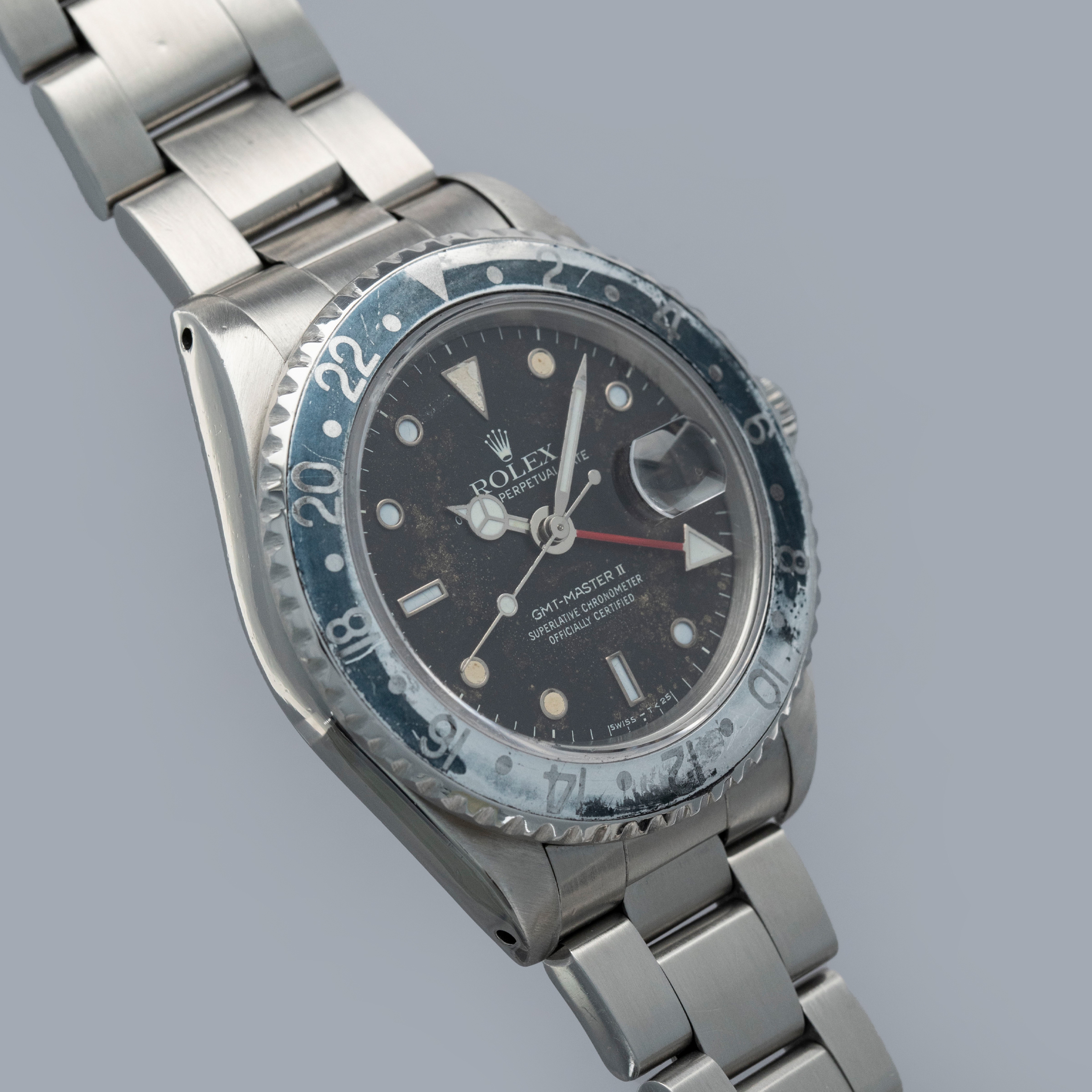 In addition to its rather uniquely aged dial, this example's once all-black bezel aluminum insert has also aged to include a unique aesthetic, whereby its black has faded to a dark grey in some regions and faded to a light grey in others, which echos the GMT-Master II "Bruce Wayne" that we launched recently.