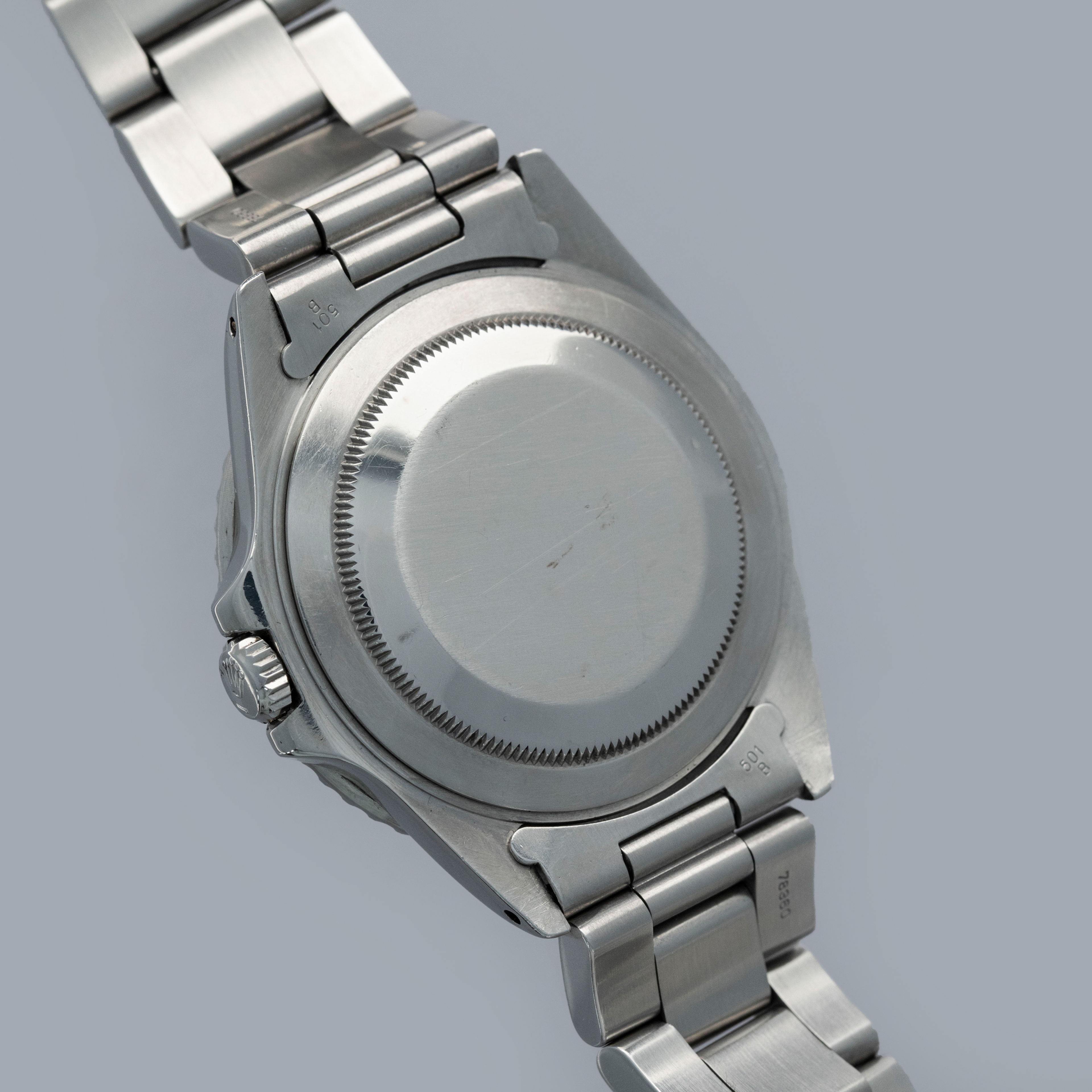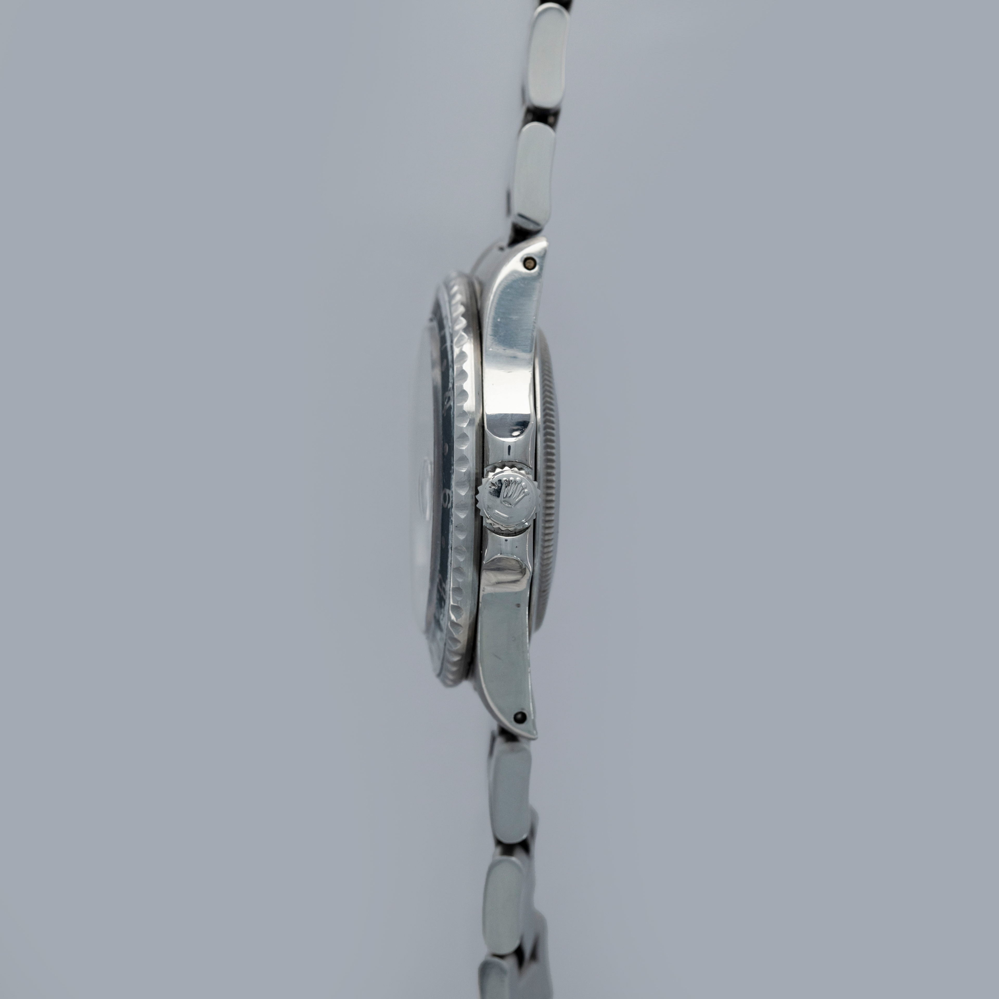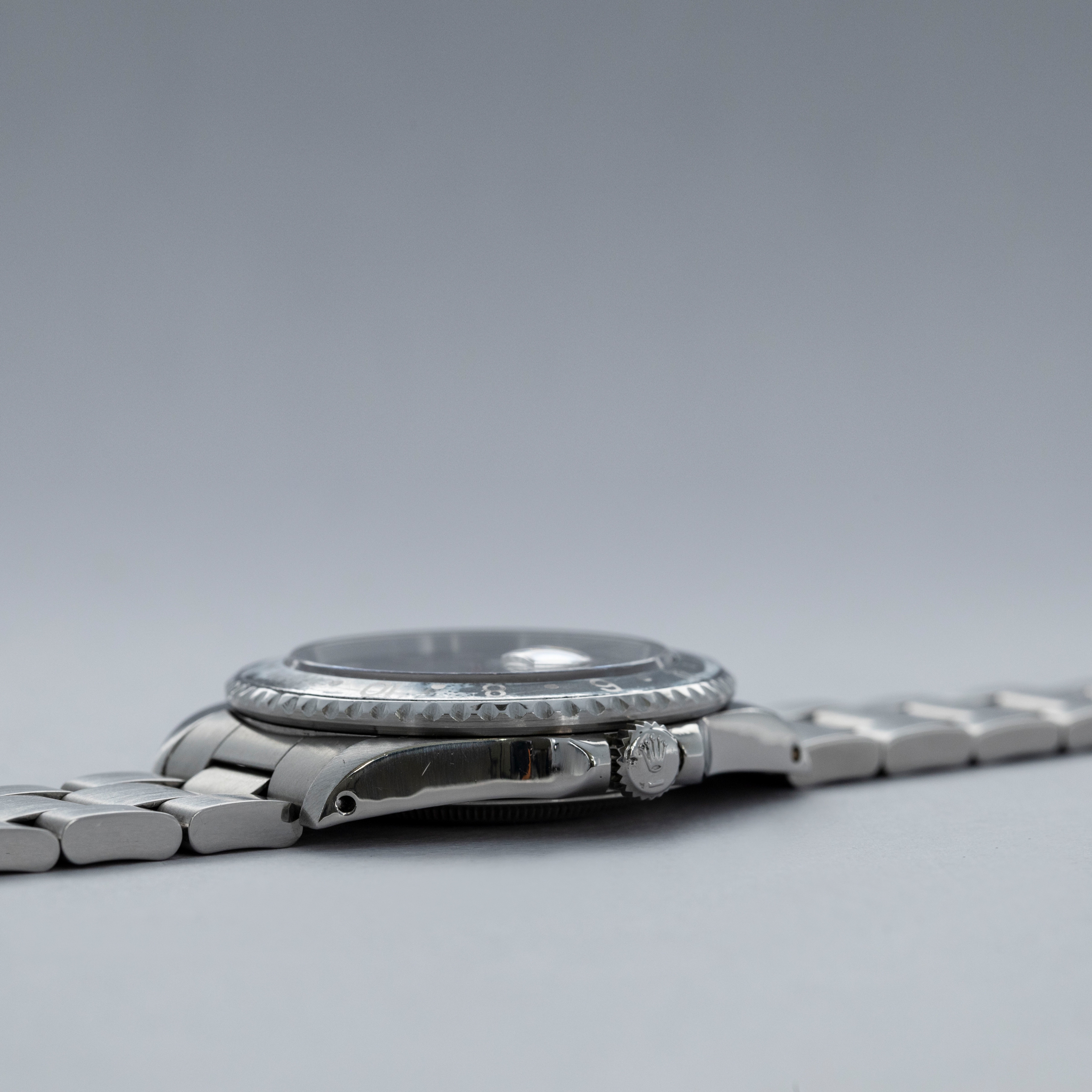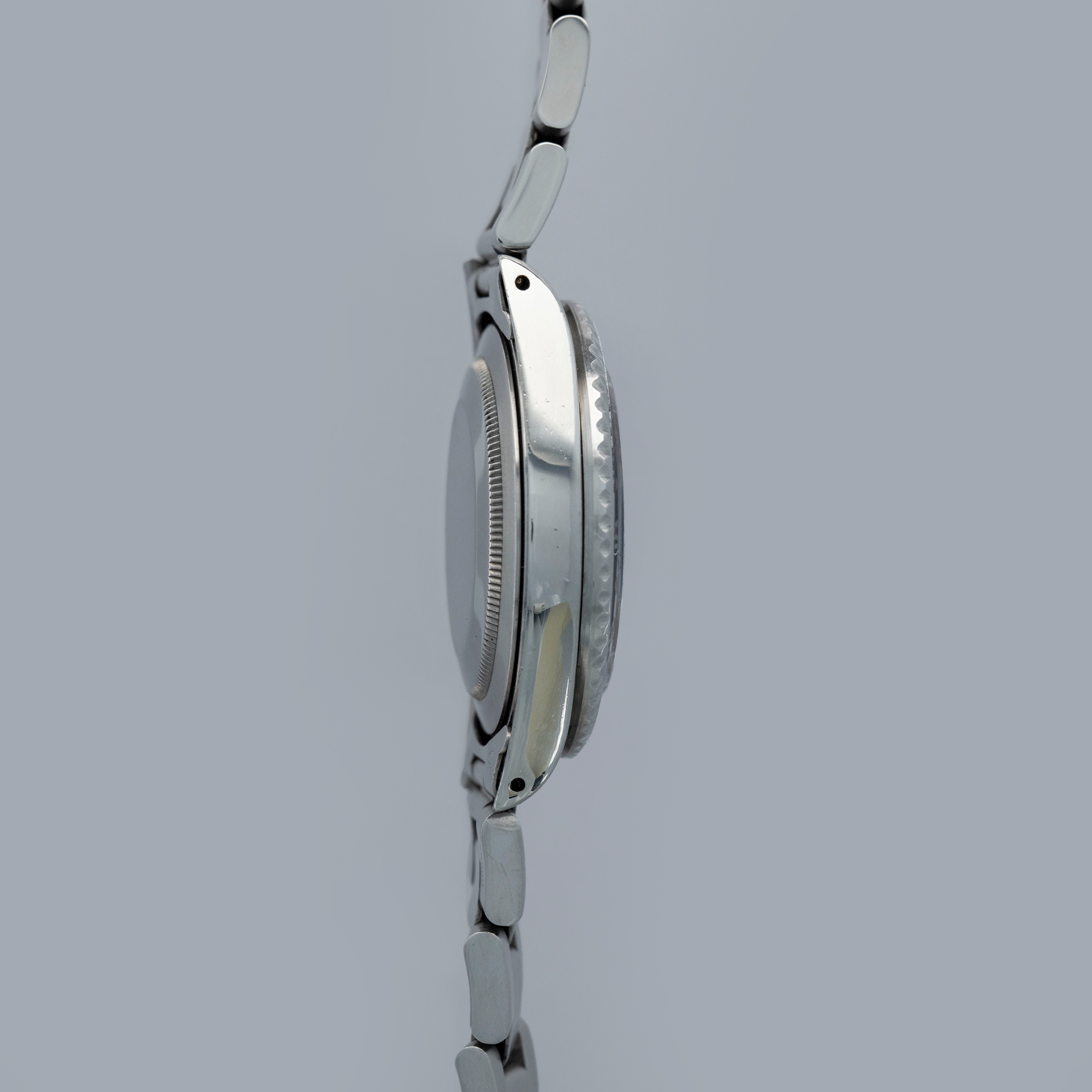 The watch is overall in good condition. The steel case remains well defined and the case back is clean. The bezel shows softened edges and the insert is aftermarket and has significantly faded in places. The dial has signs of severe degradation. Several lume plots are missing and showing the white substrate below, while others have been relumed poorly. The hands are clean. The solid link Oyster bracelet has significant play between the links and surface wear throughout. The bracelet currently fits a 7 1/4" wrist and has 11 links.