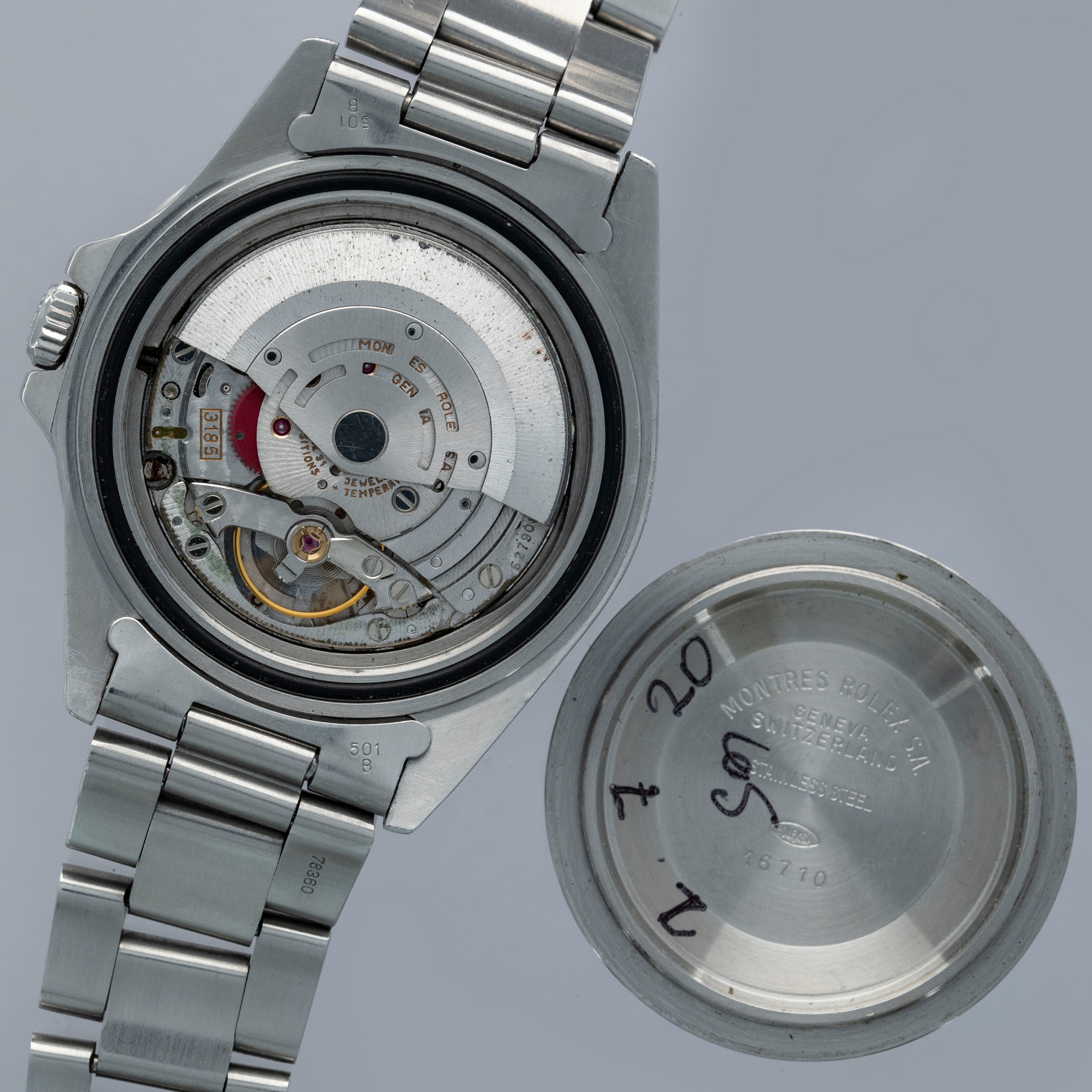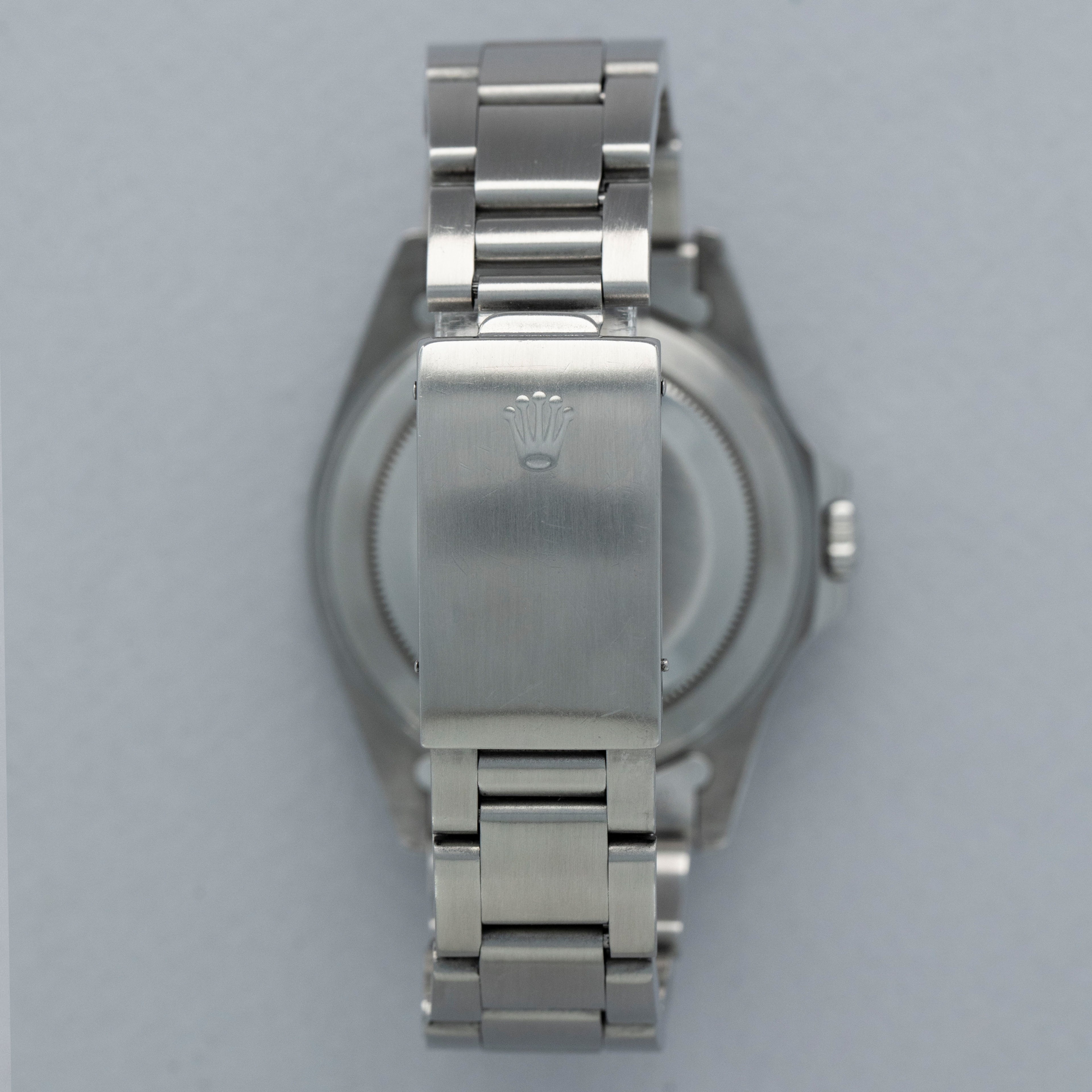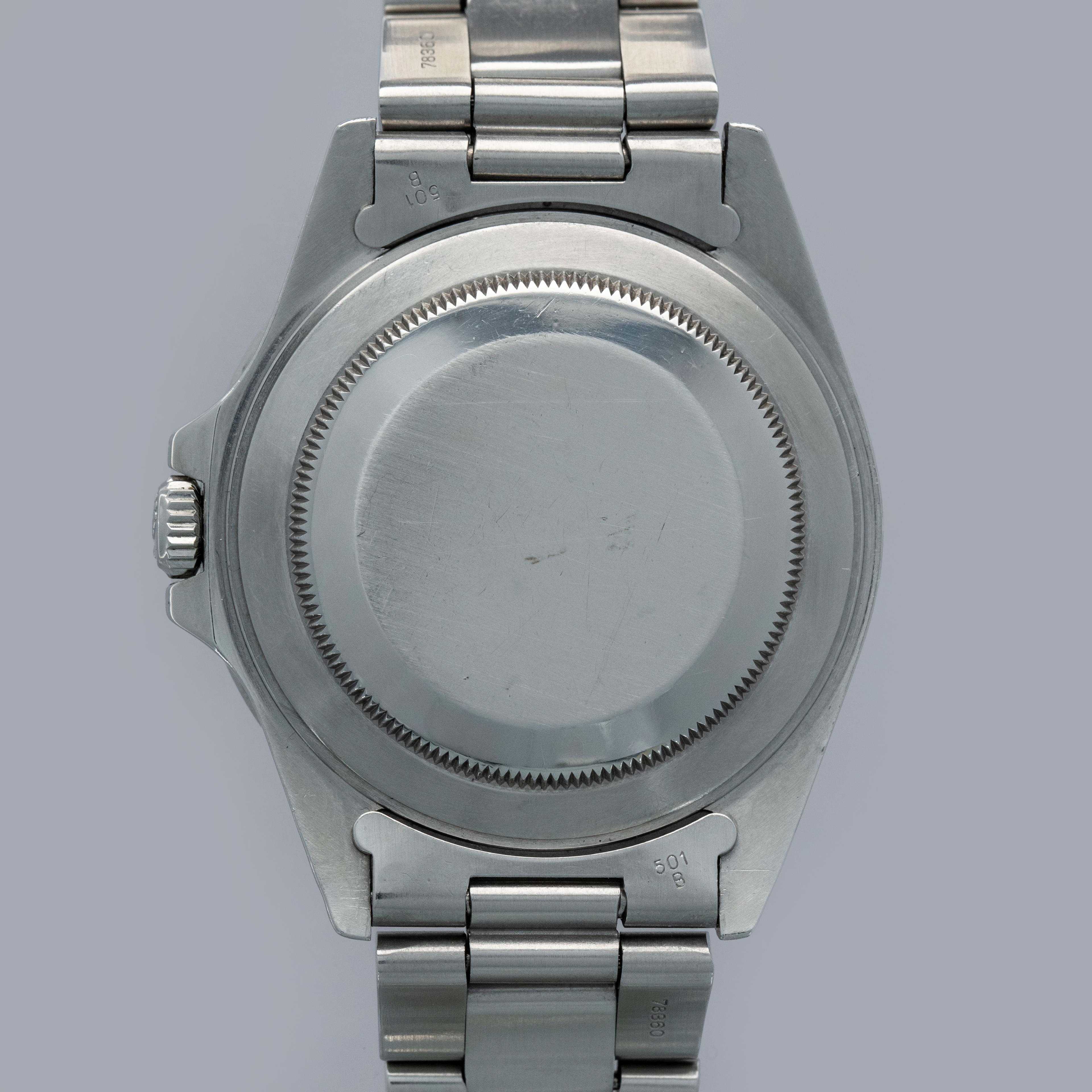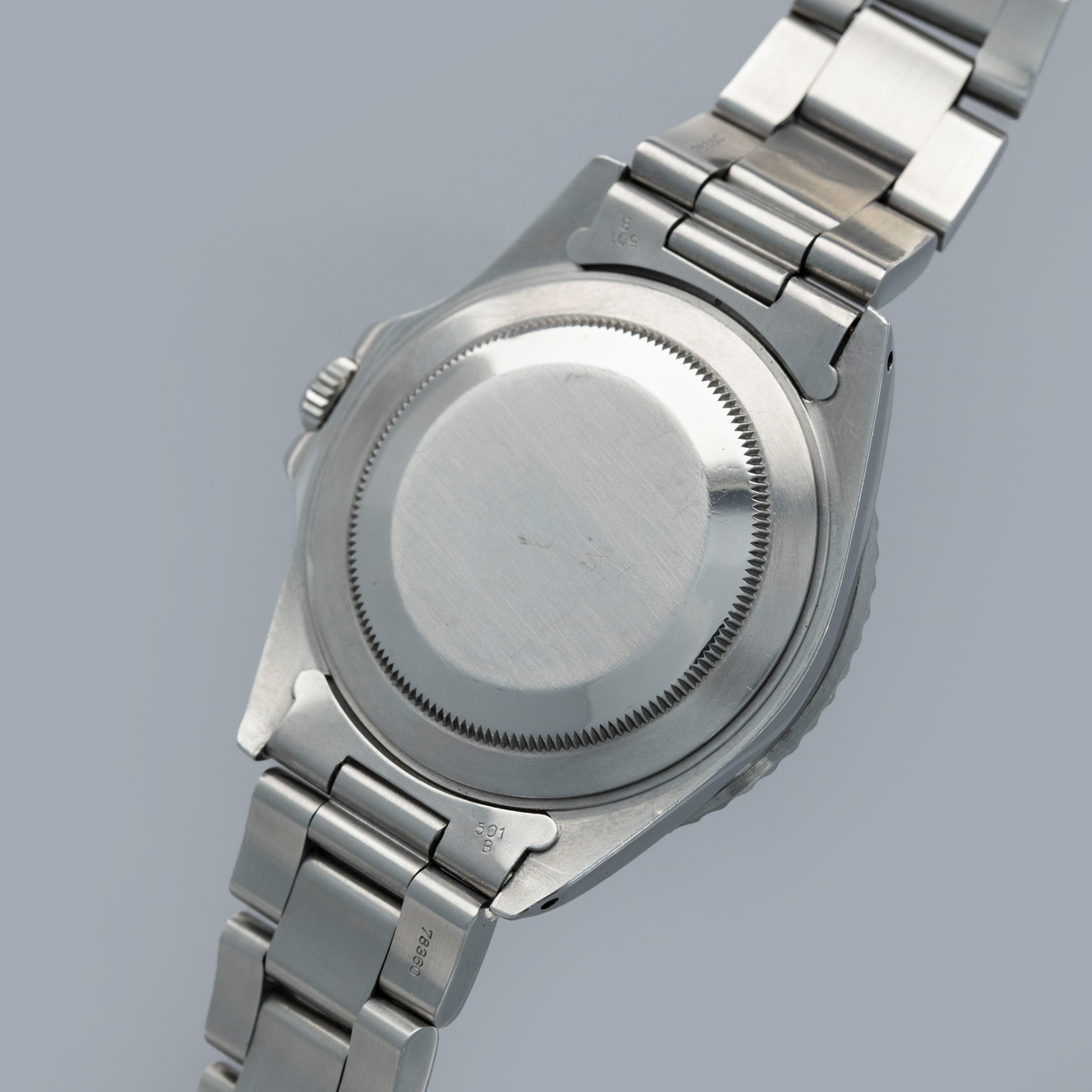 The watch is overall in good condition. The steel case remains well defined and the case back is clean. The bezel shows softened edges and the insert is aftermarket and has significantly faded in places. The dial has signs of severe degradation. Several lume plots are missing and showing the white substrate below, while others have been relumed poorly. The hands are clean. The solid link Oyster bracelet has significant play between the links and surface wear throughout. The bracelet currently fits a 7 1/4" wrist and has 11 links.