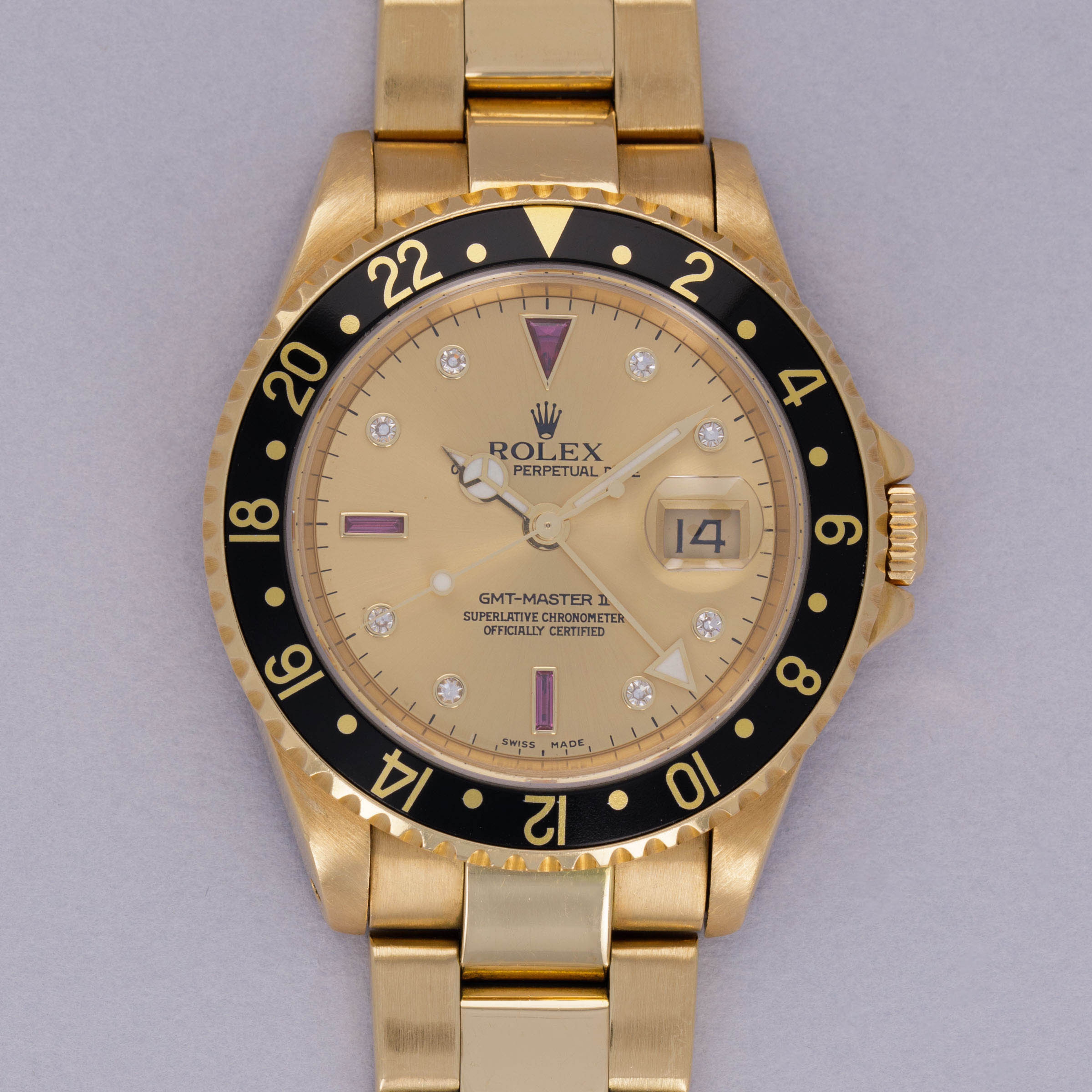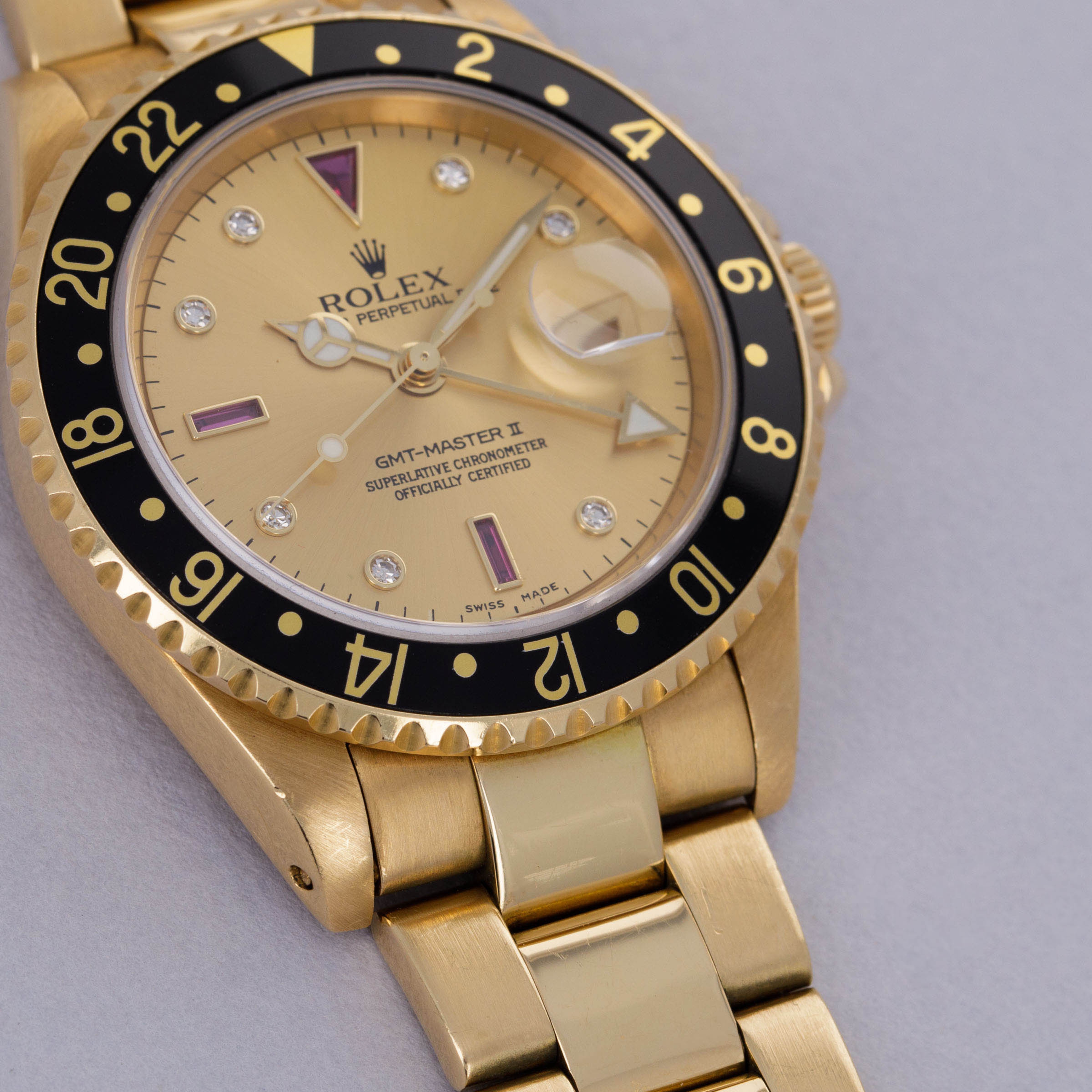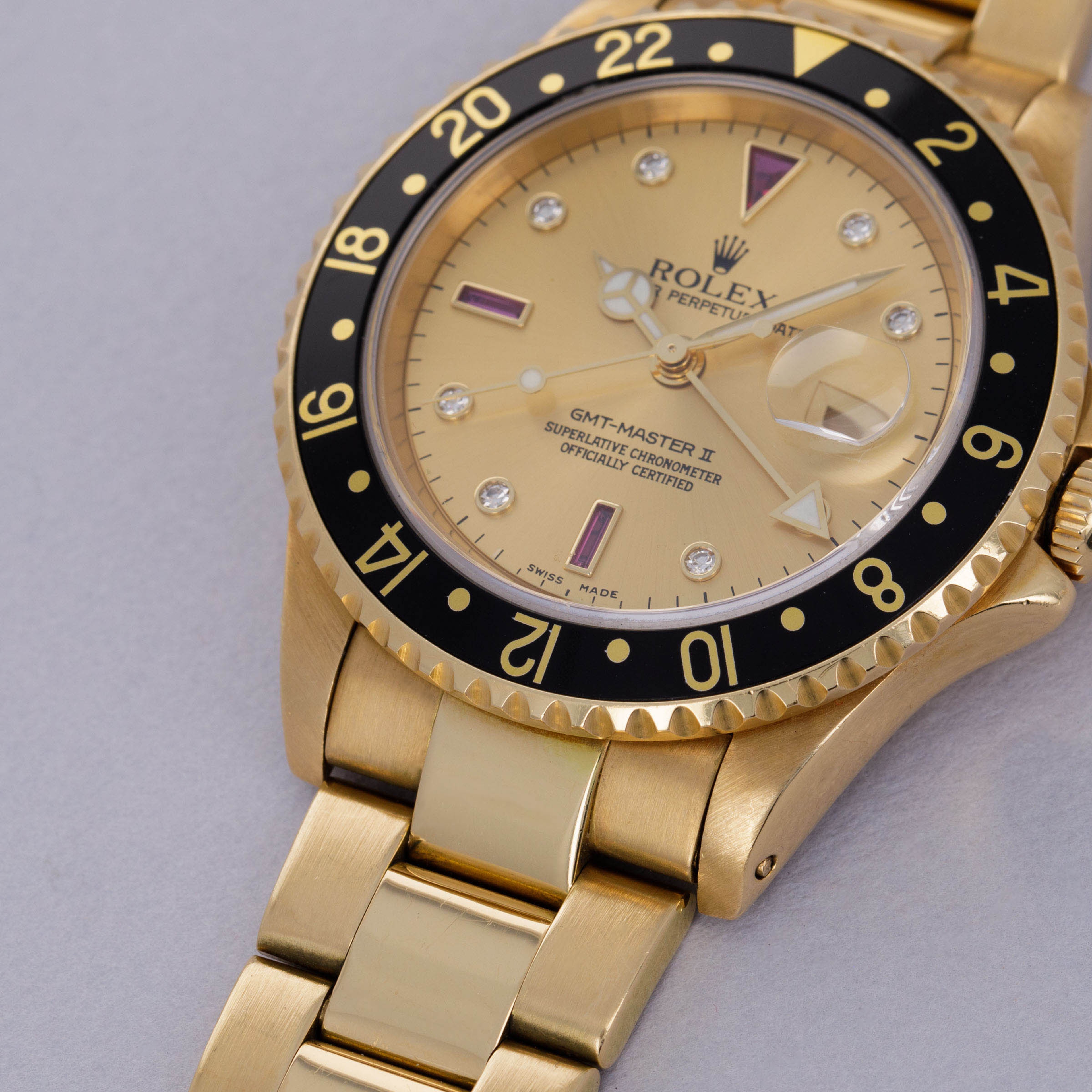Combining Rolex's esteemed talents as a watchmaker and jeweler in equal measure, this Serti dial 18kt yellow gold GMT-Master II features everything that a Rolex collector might want from its golden construction to its practical complication to its gem-set Serti dial.
