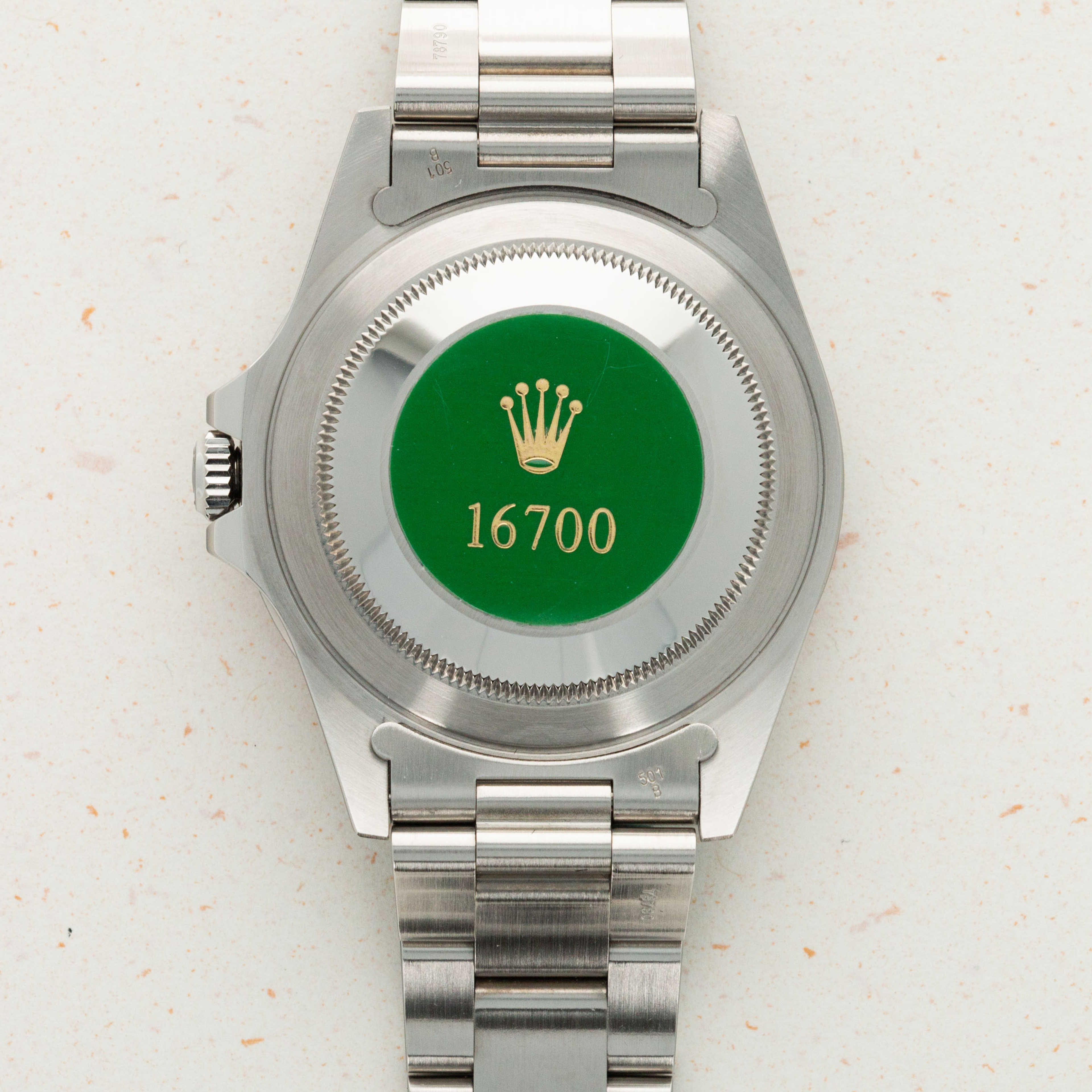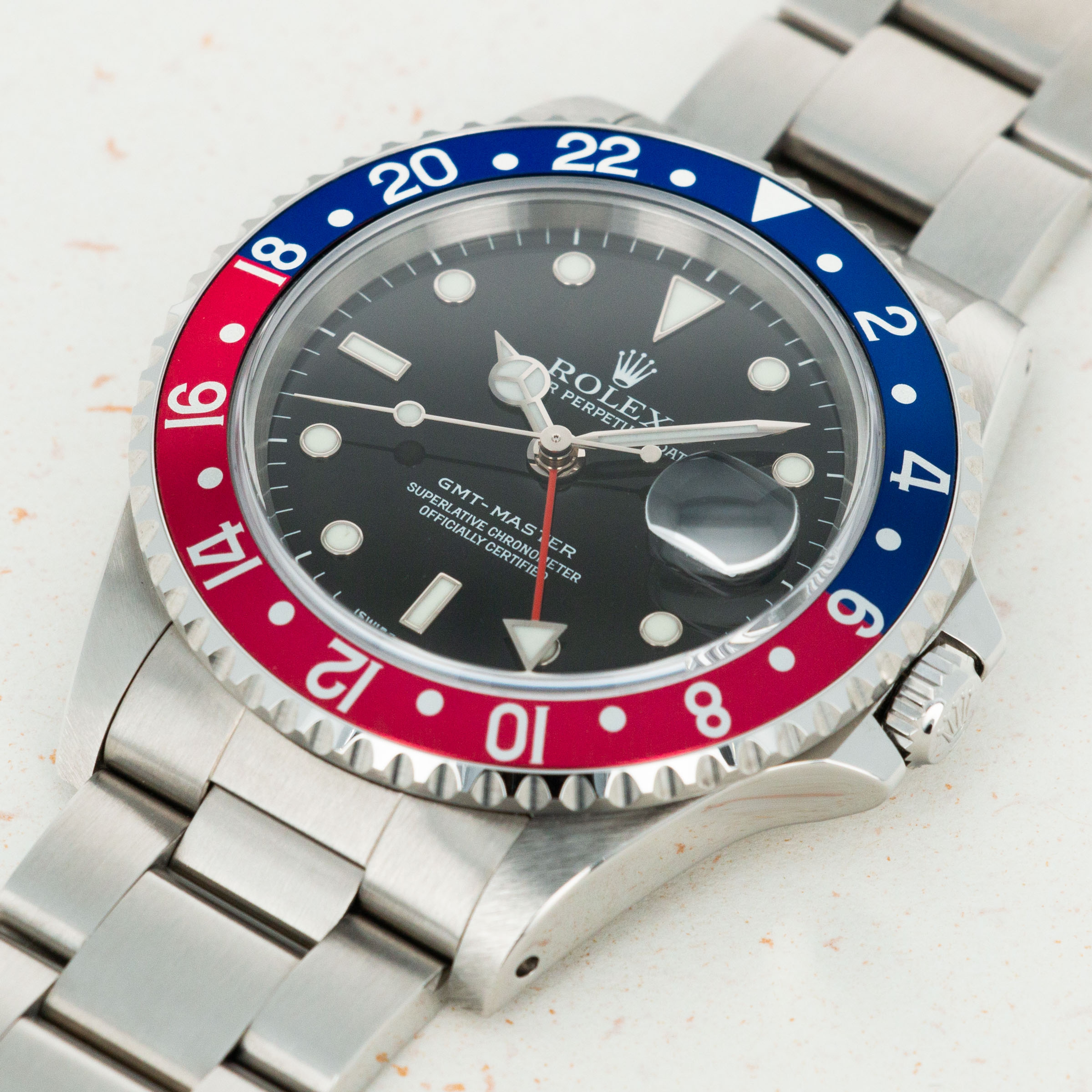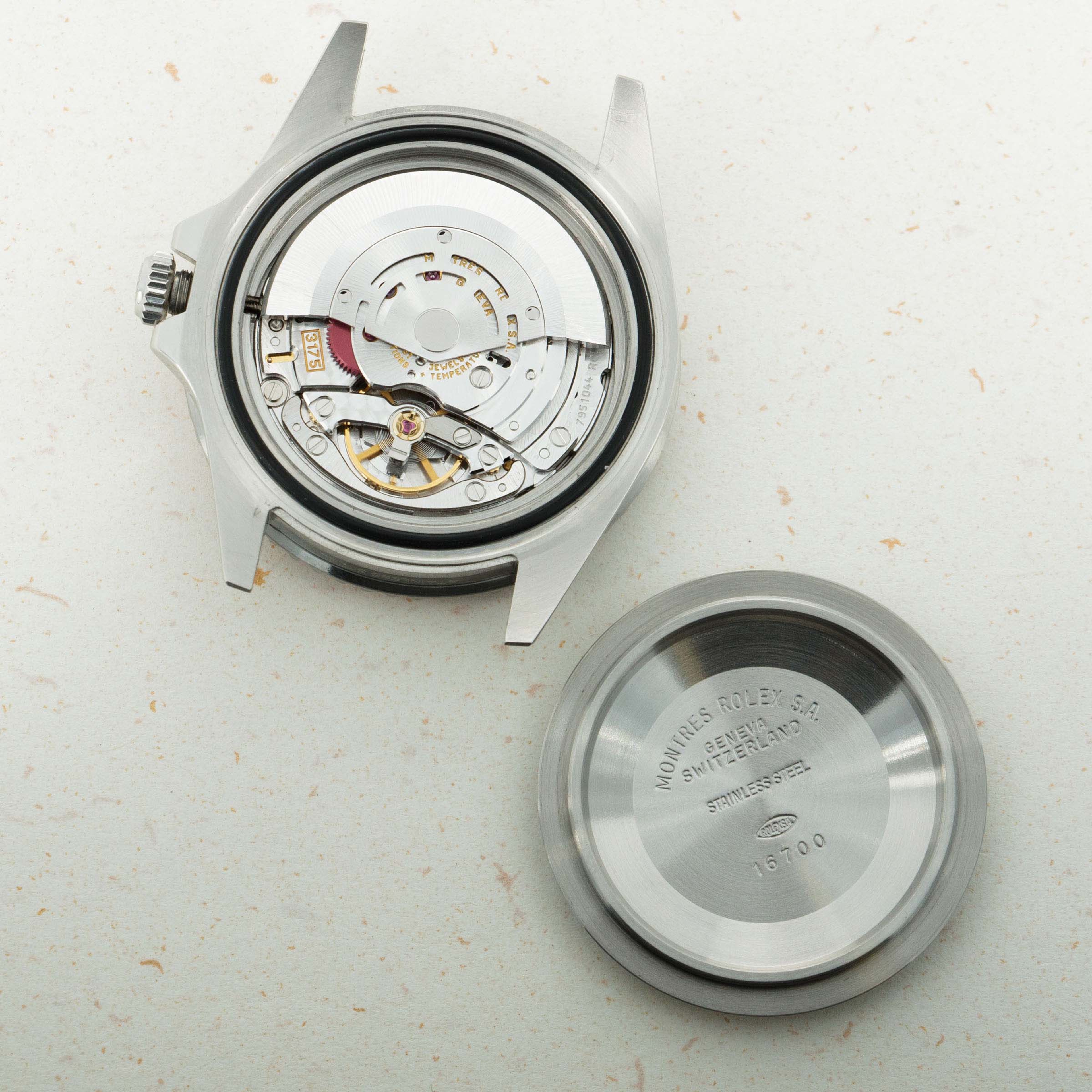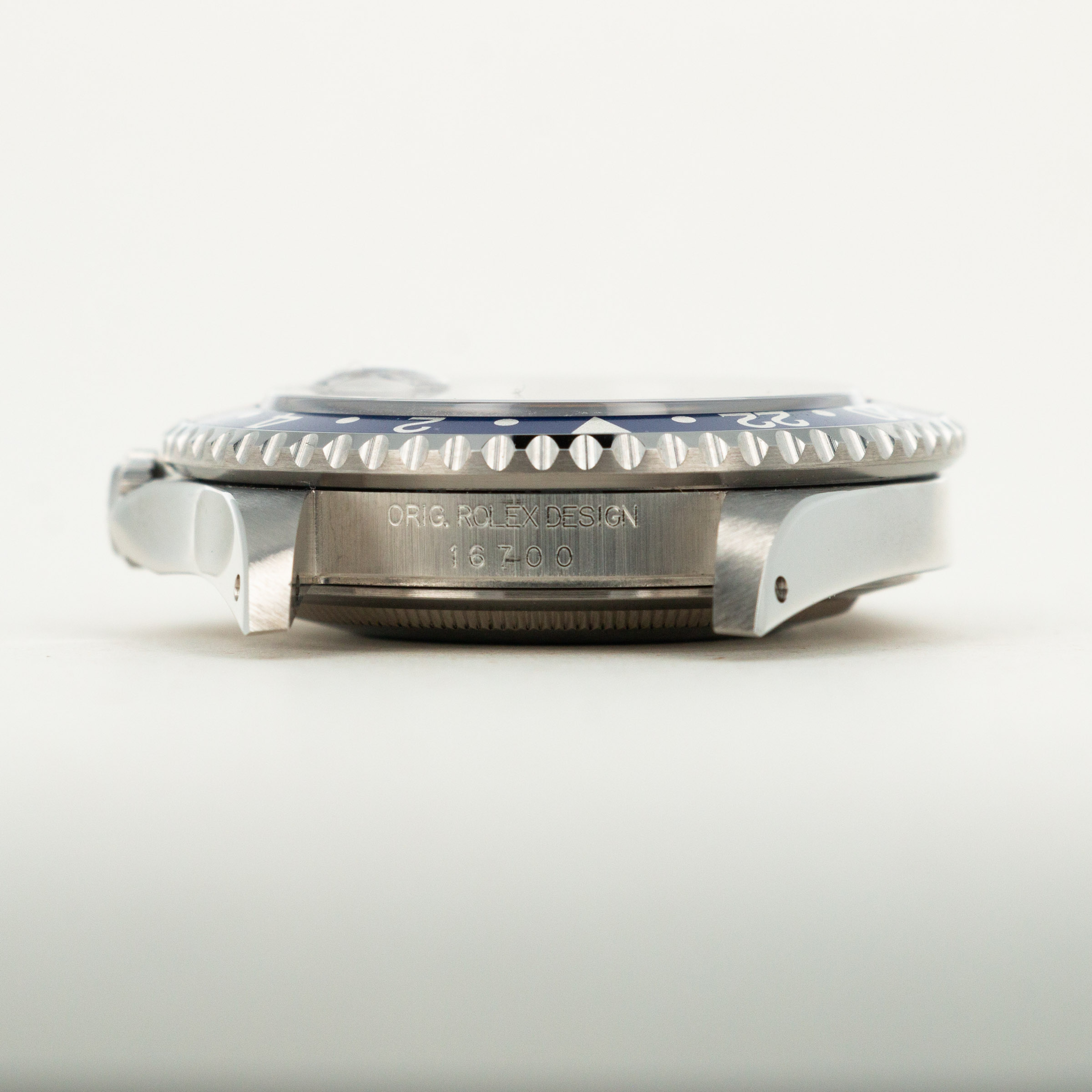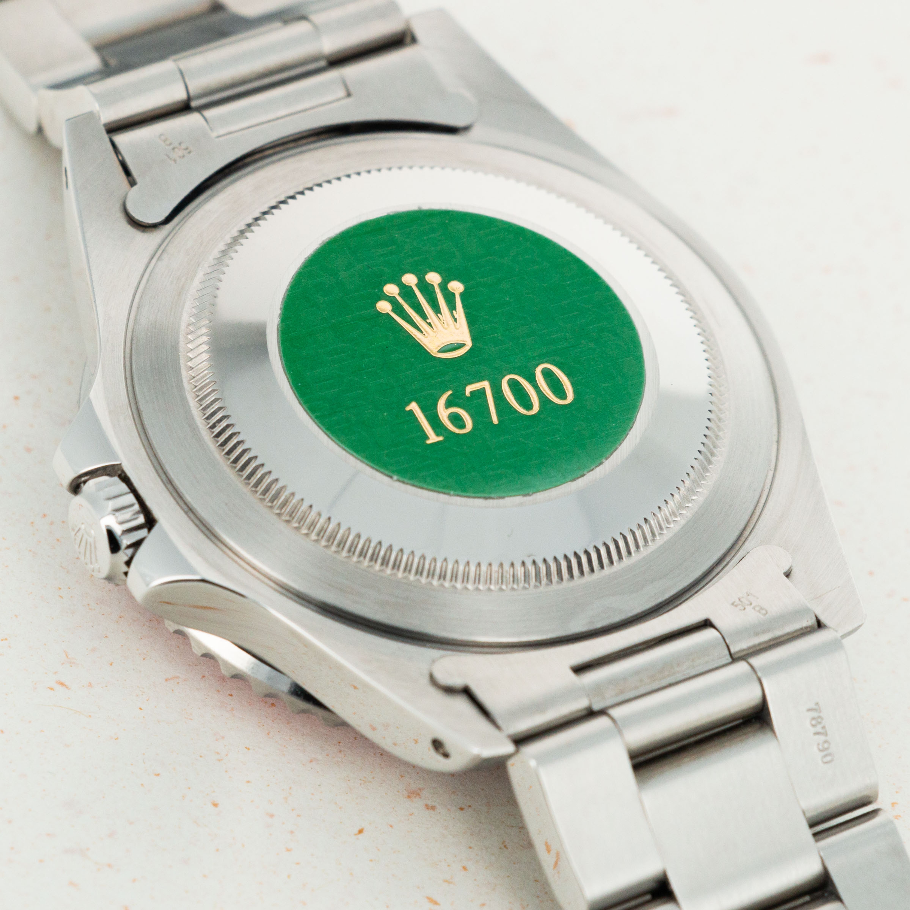 Released in 1988, the Rolex GMT-Master ref. 16700 replaced the outgoing ref. 16760 "Fat Lady," as collectors longed for a slimmed-down GMT-Master without the Fat lady's thicker case, beefier lugs, and larger design. Discontinued in 1999, the ref. 16700 was produced alongside the modern GMT-Master II and its successor, the GMT-Master ref. 16710, which was released a year after in 1989. As both of these options were more technically advanced than the ref. 16700 that we have here, the ref. 16700 failed to perform as well as it might have, with collectors spending the extra money to buy either the ref. 16710 instead, or the GMT-Master II when it was released. This has enabled the ref. 16700 to enjoy superior demand within the modern market as collectors seek out this now scarce timepiece. Offered with either an all-black bezel or the iconic red and blue Pepsi bezel, the ref. 16700 is the quintessential GMT-Master with its elegant design and vintage traits such as an aluminum bezel insert, hollow end links, hollow center links, and tritium lume (until 1997).