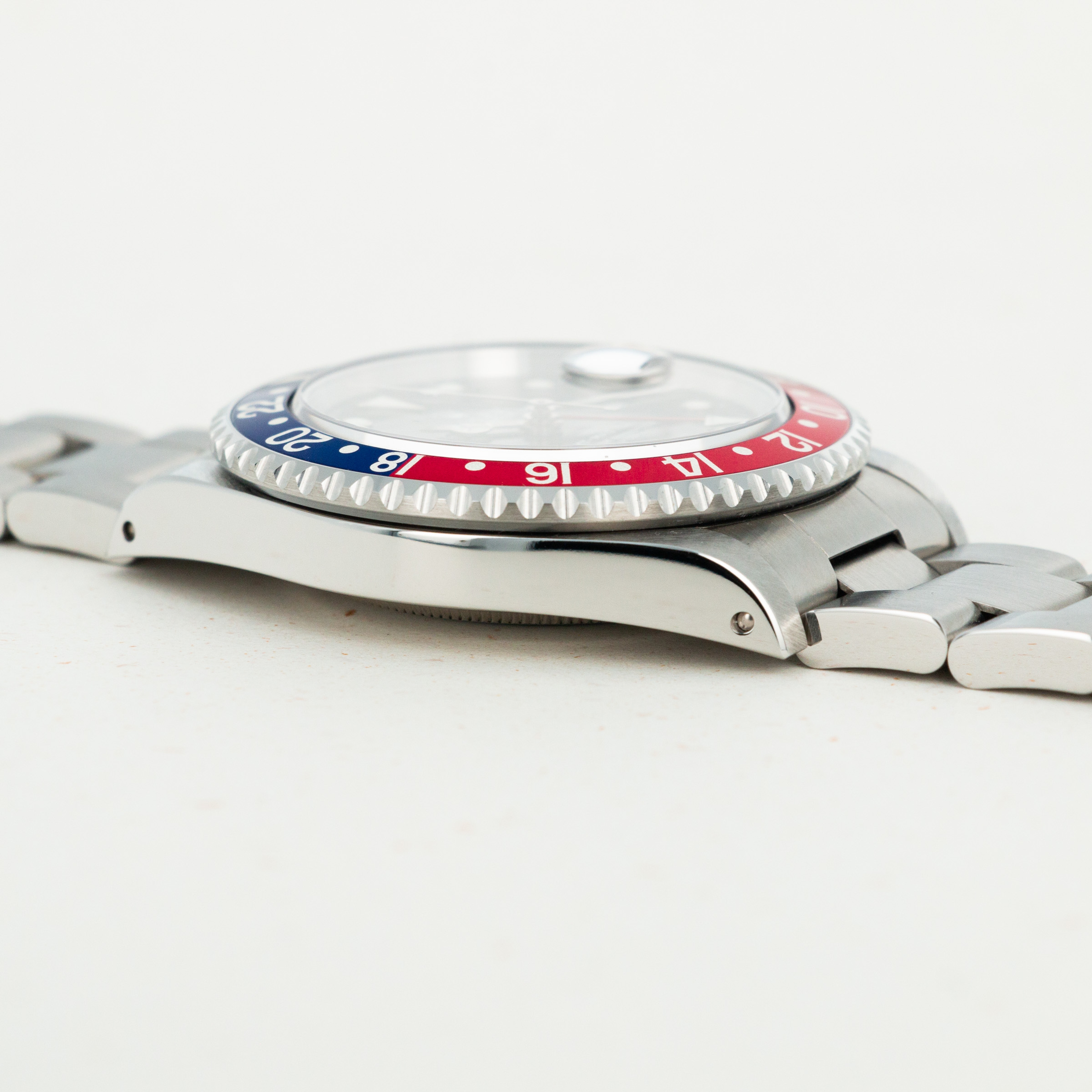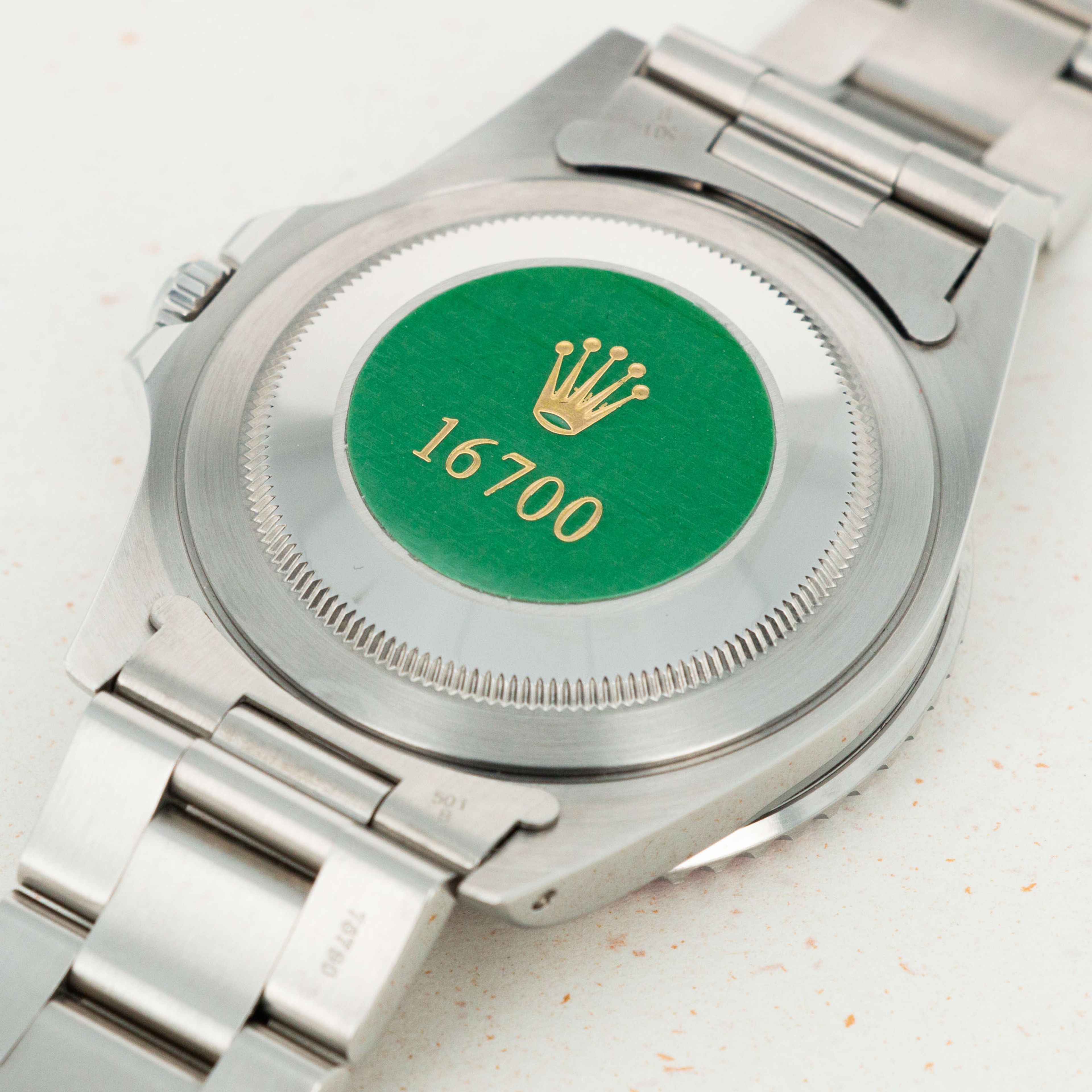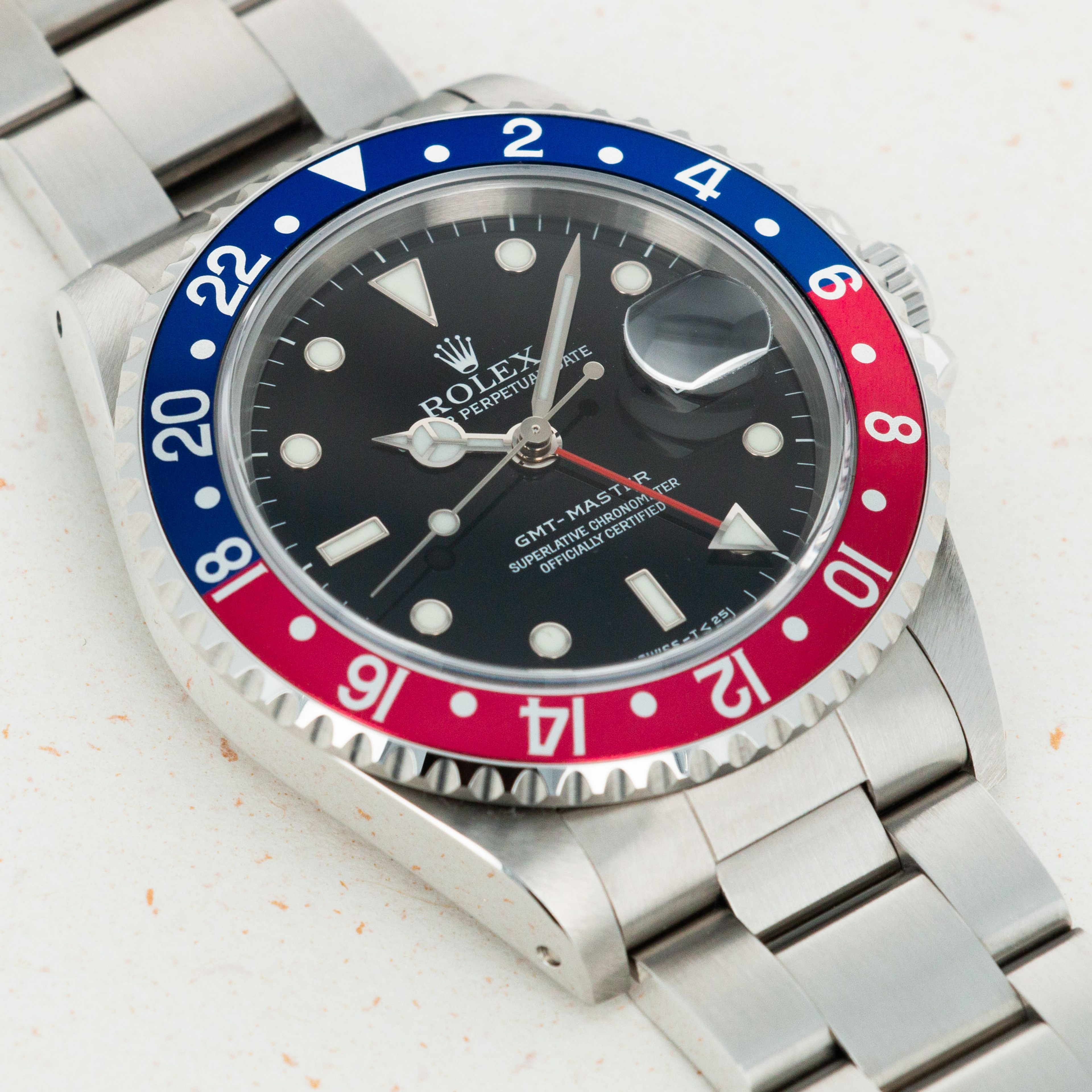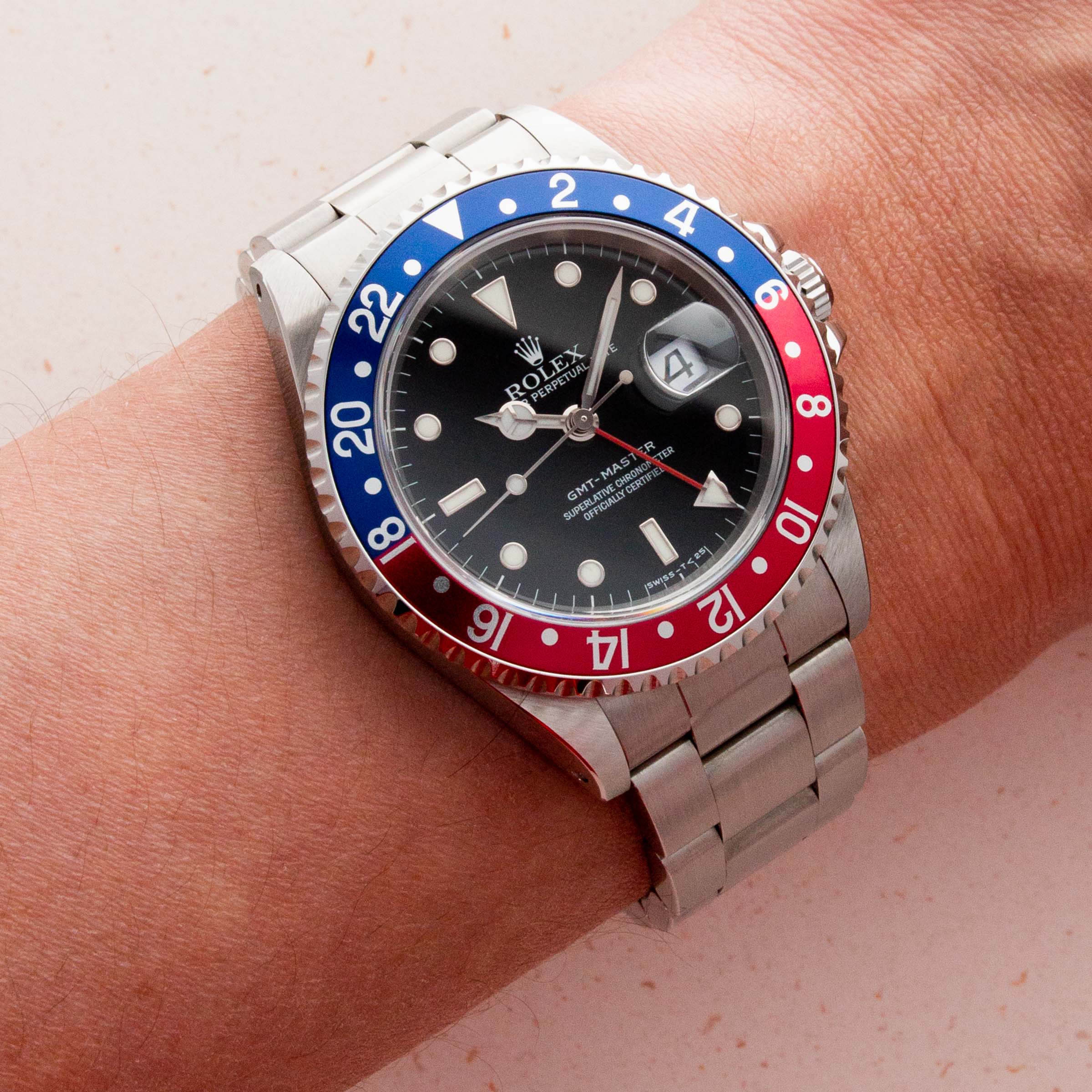 Released in 1988, the Rolex GMT-Master ref. 16700 replaced the outgoing ref. 16760 "Fat Lady," as collectors longed for a slimmed-down GMT-Master without the Fat lady's thicker case, beefier lugs, and larger design. Discontinued in 1999, the ref. 16700 was produced alongside the modern GMT-Master II and its successor, the GMT-Master ref. 16710, which was released a year after in 1989. As both of these options were more technically advanced than the ref. 16700 that we have here, the ref. 16700 failed to perform as well as it might have, with collectors spending the extra money to buy either the ref. 16710 instead, or the GMT-Master II when it was released. This has enabled the ref. 16700 to enjoy superior demand within the modern market as collectors seek out this now scarce timepiece. Offered with either an all-black bezel or the iconic red and blue Pepsi bezel, the ref. 16700 is the quintessential GMT-Master with its elegant design and vintage traits such as an aluminum bezel insert, hollow end links, hollow center links, and tritium lume (until 1997).