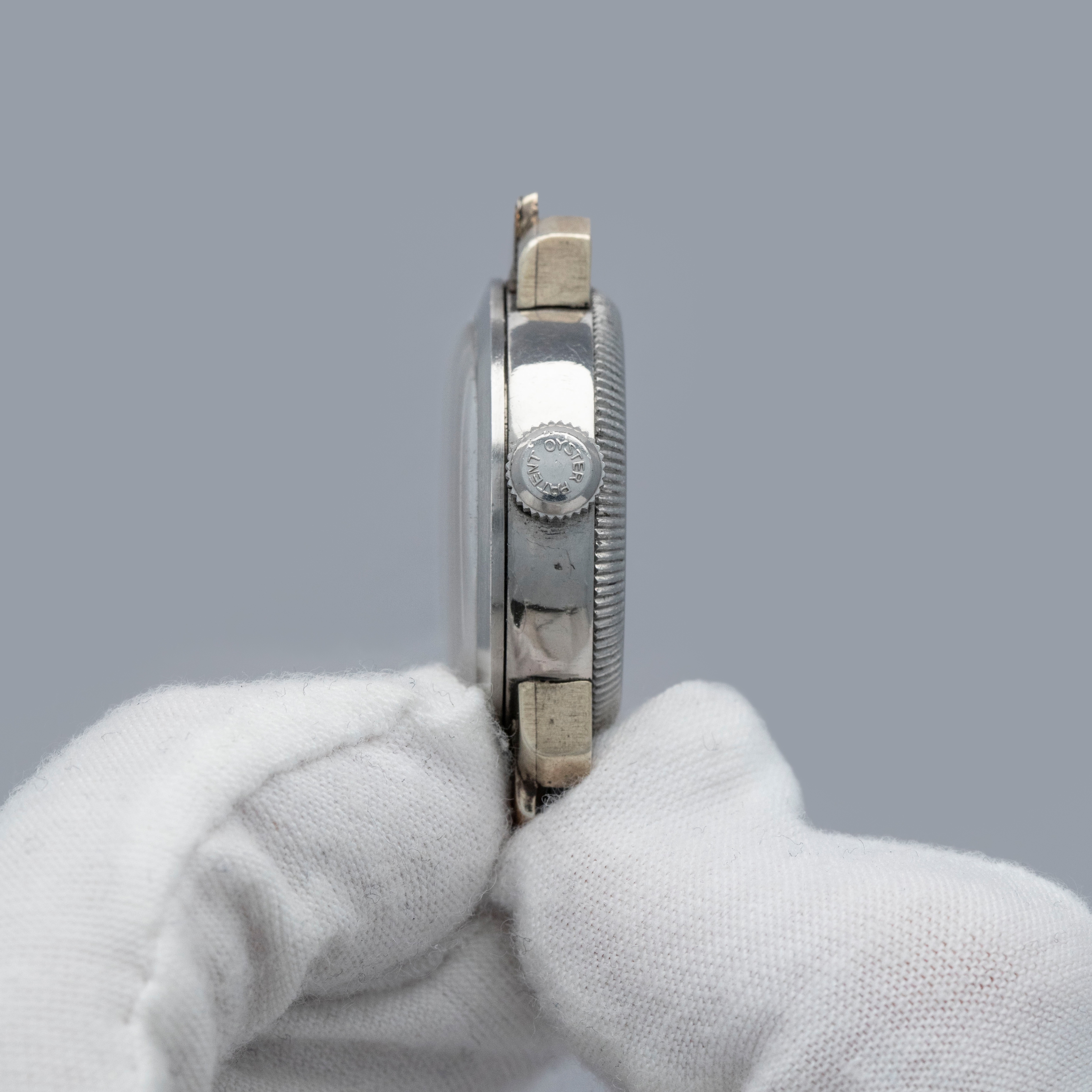 Watch is in overall excellent condition. The steel case shows surface scratches and small nicks as expected of a watch of this vintage, while the case back retains a well-defined serial number with some wear visible to the tool teeth. The pink gold 9k hooded lugs show surface marks, with the ribbed hoods remaining well defined and showing some oxidation. The watch retains its original Oyster Patent crown. The salmon dial with applied Arabic numerals remains excellent, with some light surface marks, while the gold dagger hands remain clean and may have been relumed at some point. Case has fixed lugs not springbars.