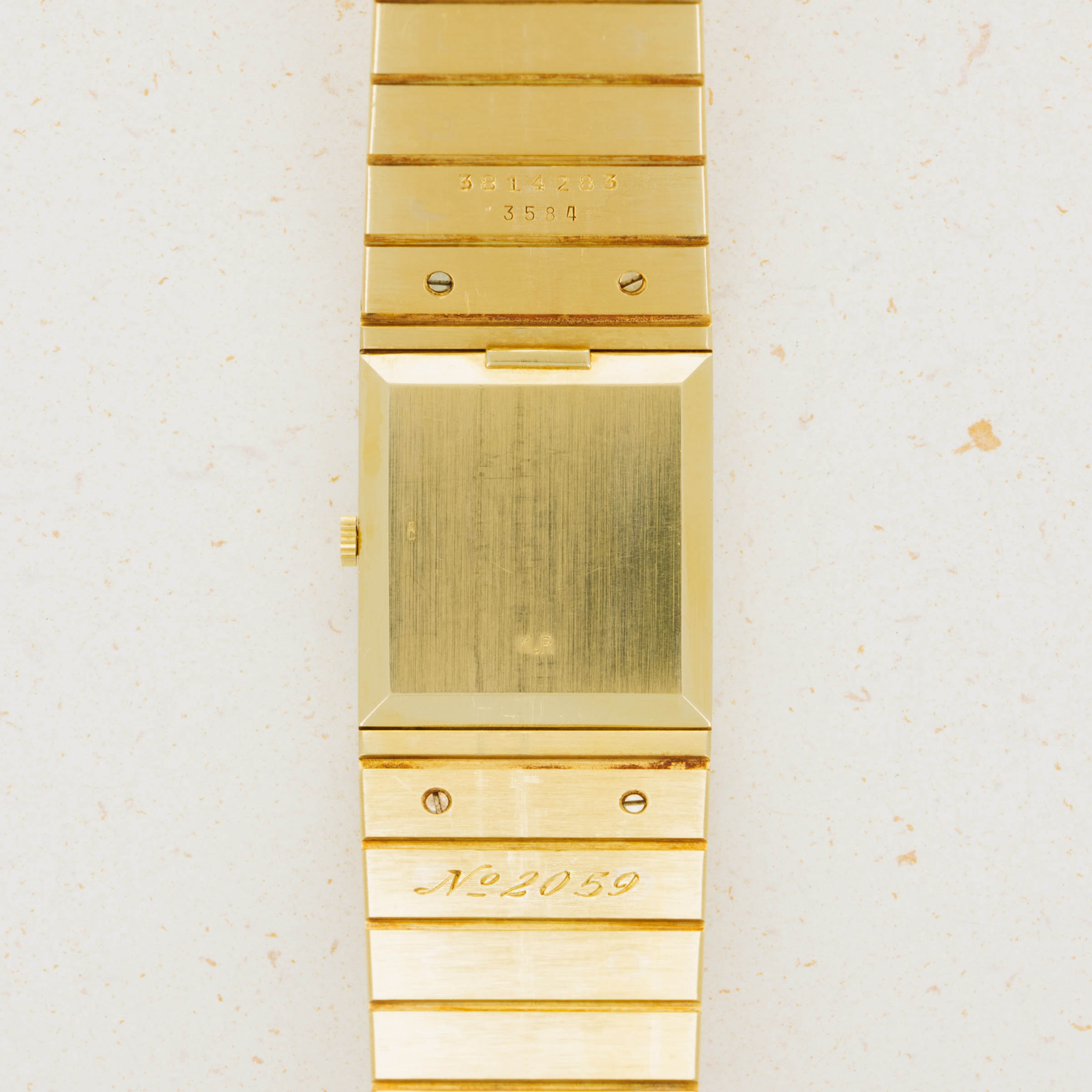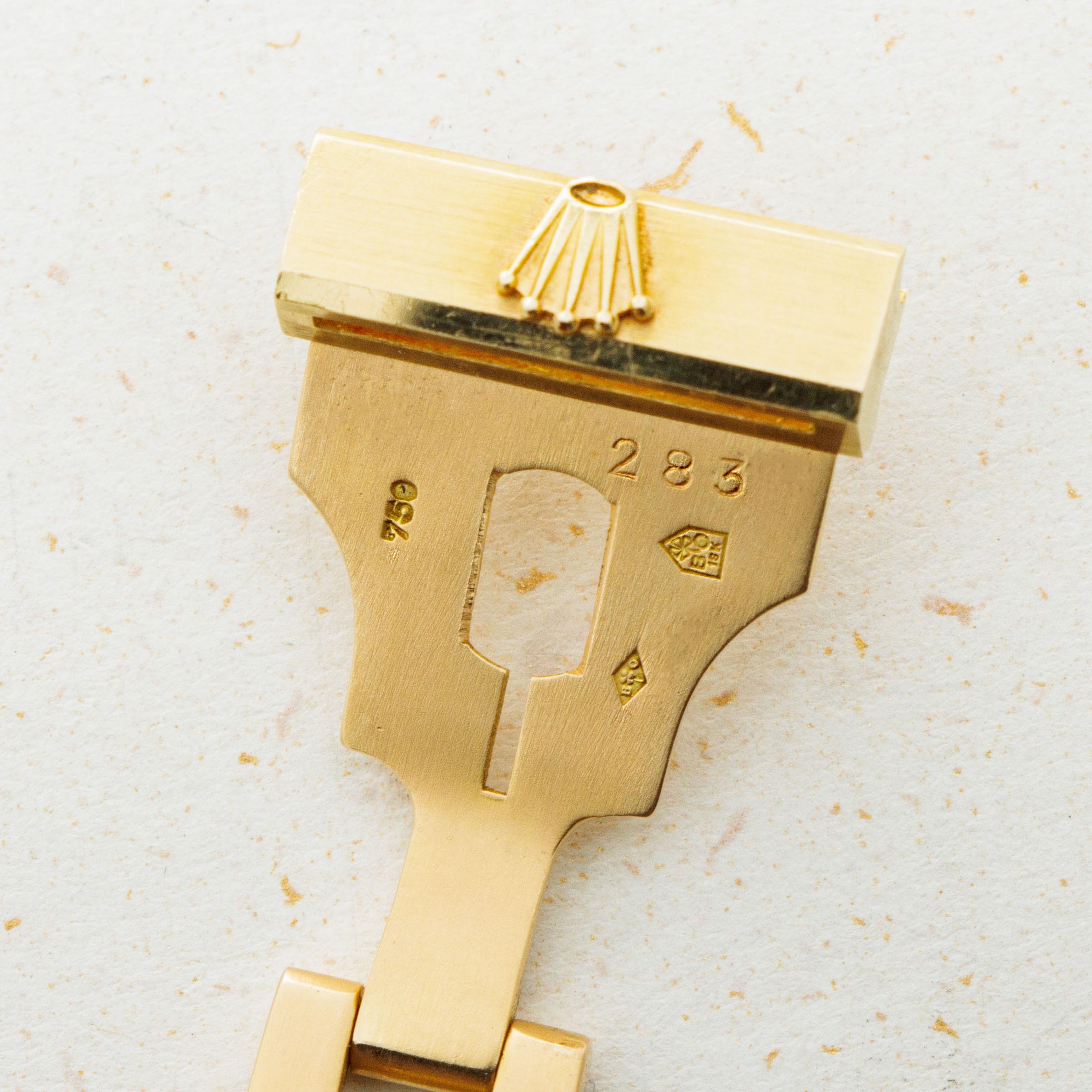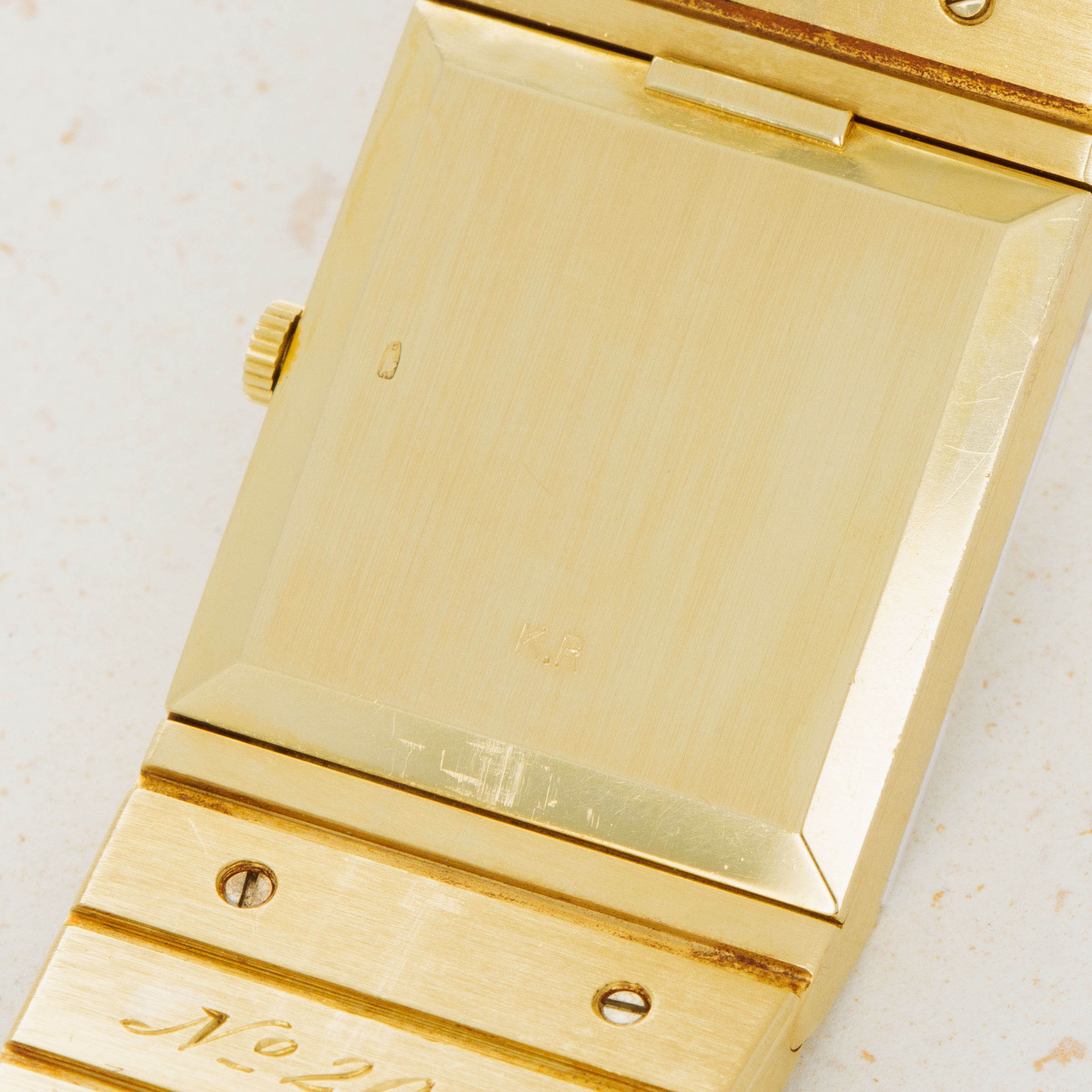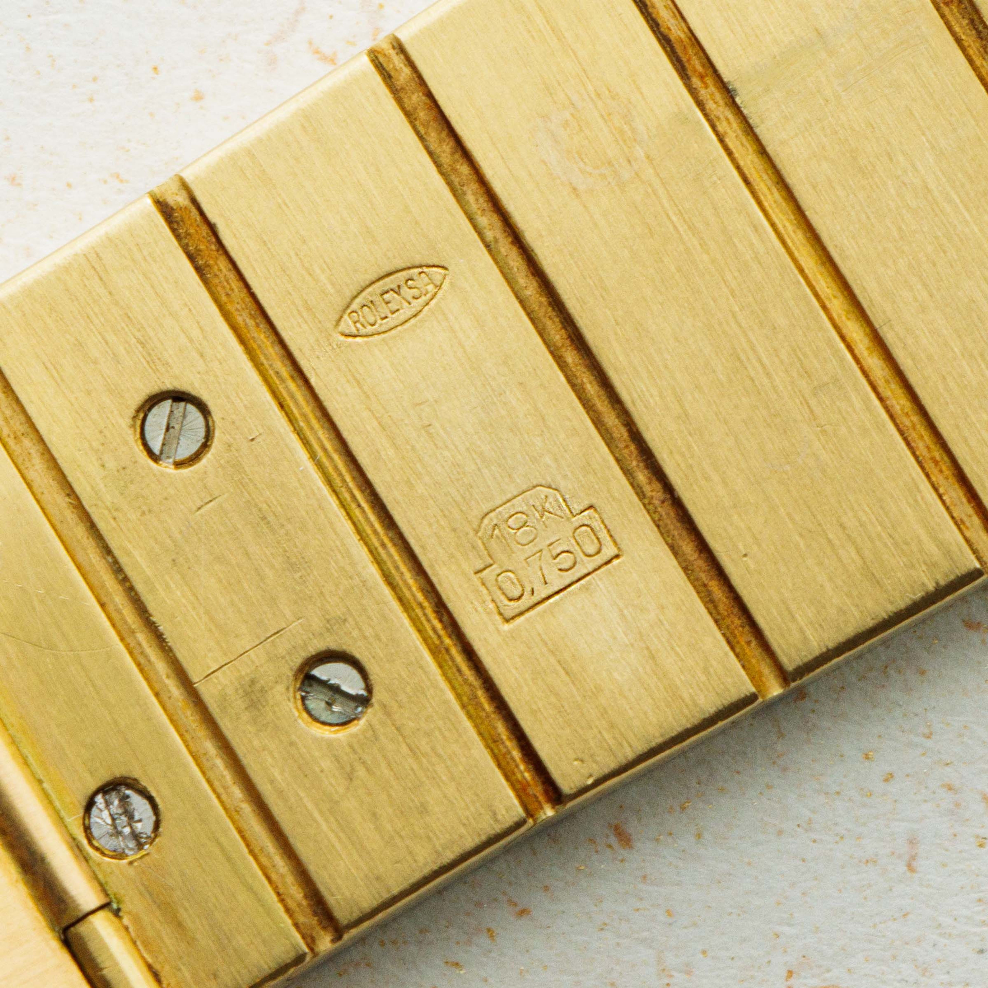 A more detailed look at the caseback reveals the initials "KR" engraved, denoting that the watch was sold by Khimji Ramdas, the official Rolex retailer of Oman. Khimji Ramdas was the official supplier of watches to the Omani palace after Asprey, and this piece was part of a special order requested by Qaboos bin Said Al Said.