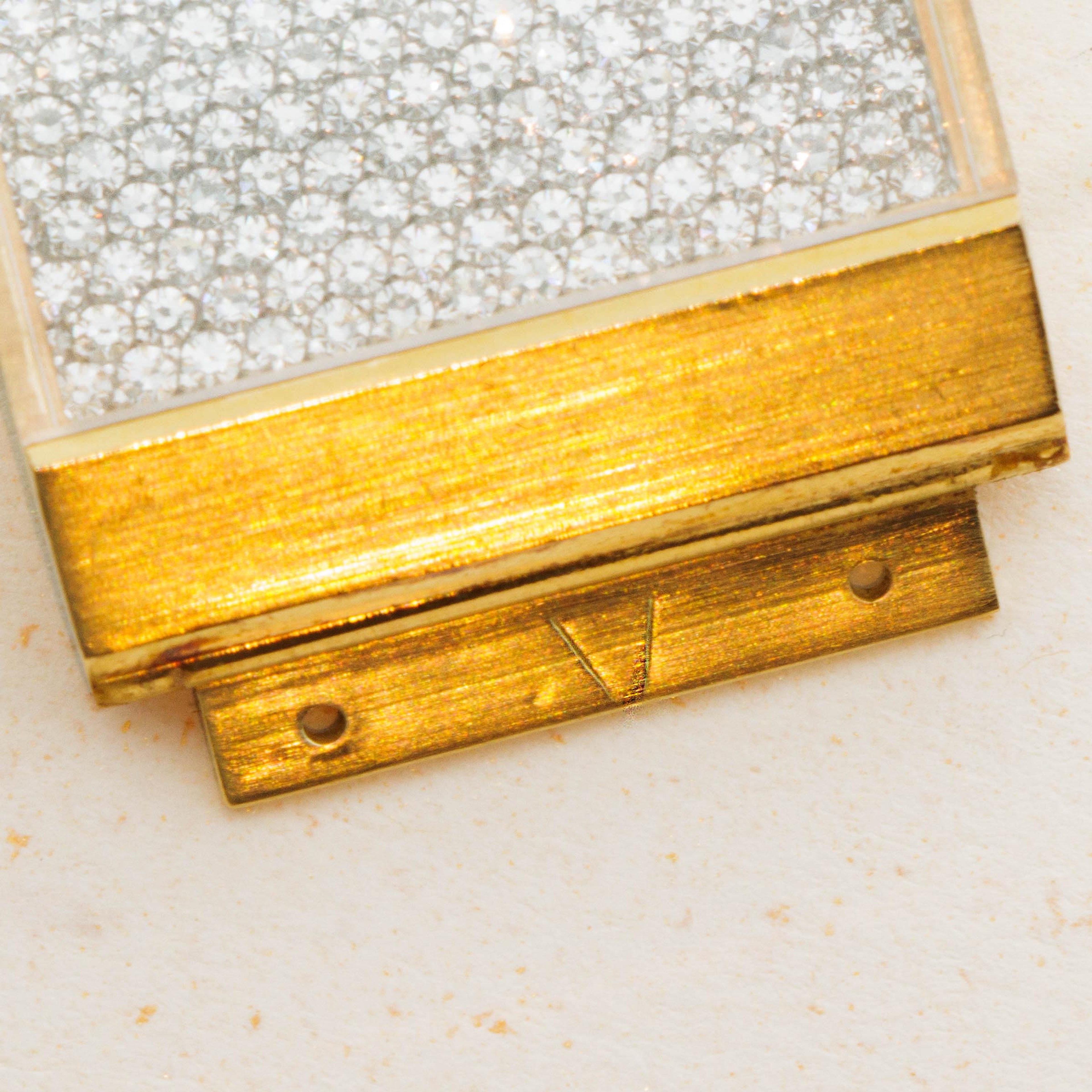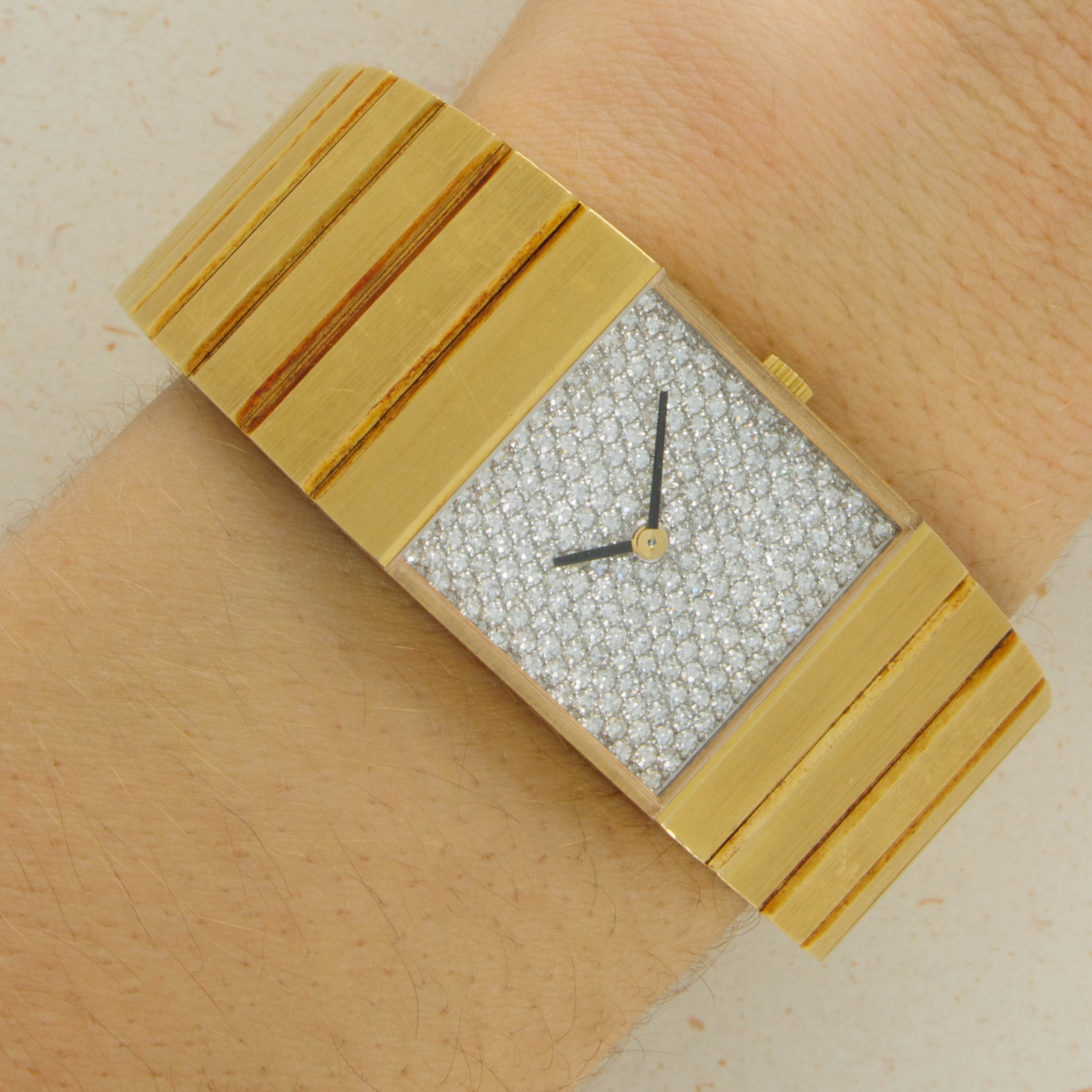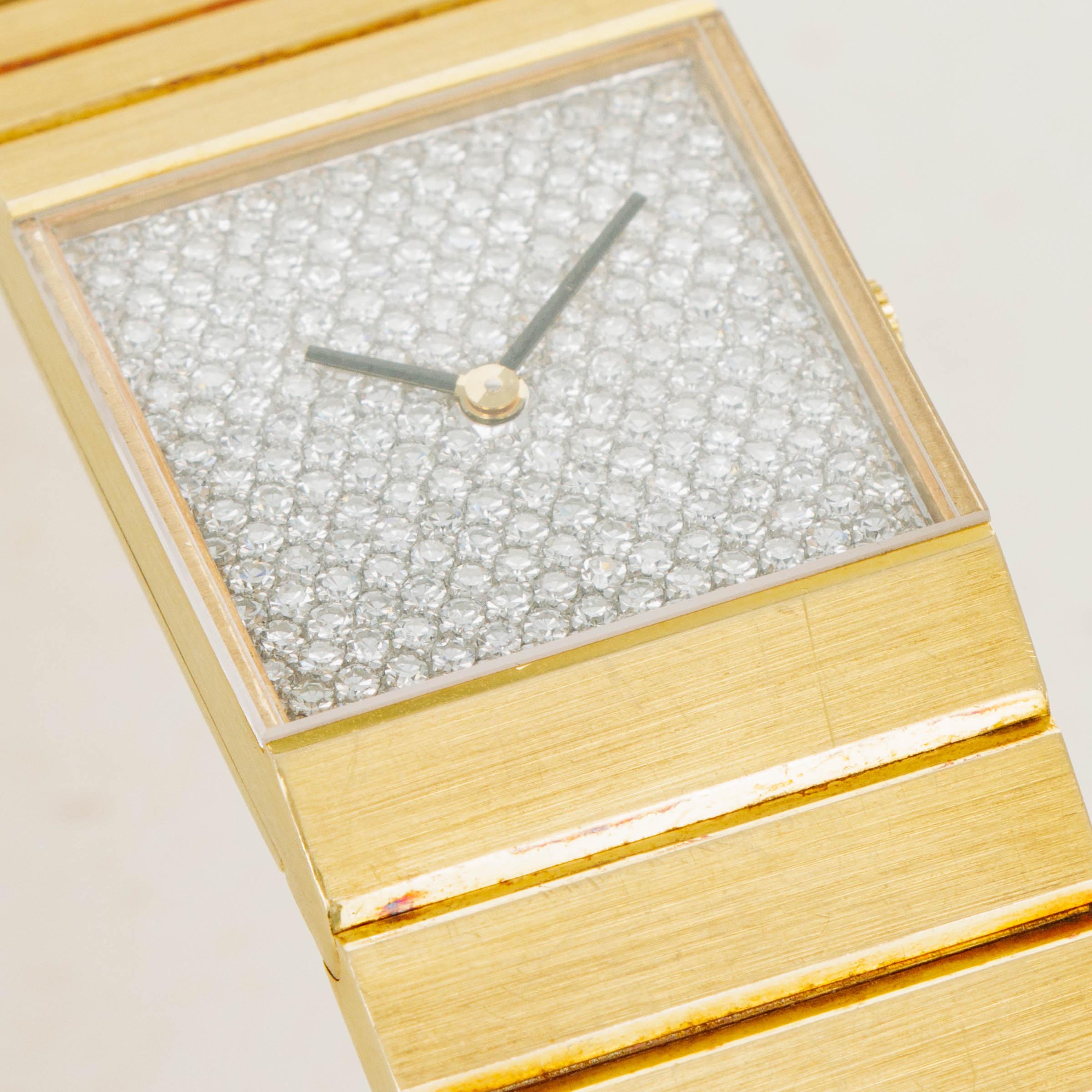 In addition to its incredibly unique 18kt yellow gold construction, this example also boasts a pave-set diamond dial that contrasts the ref. 3584's brushed surfaces with an intoxicating sparkle and shine.