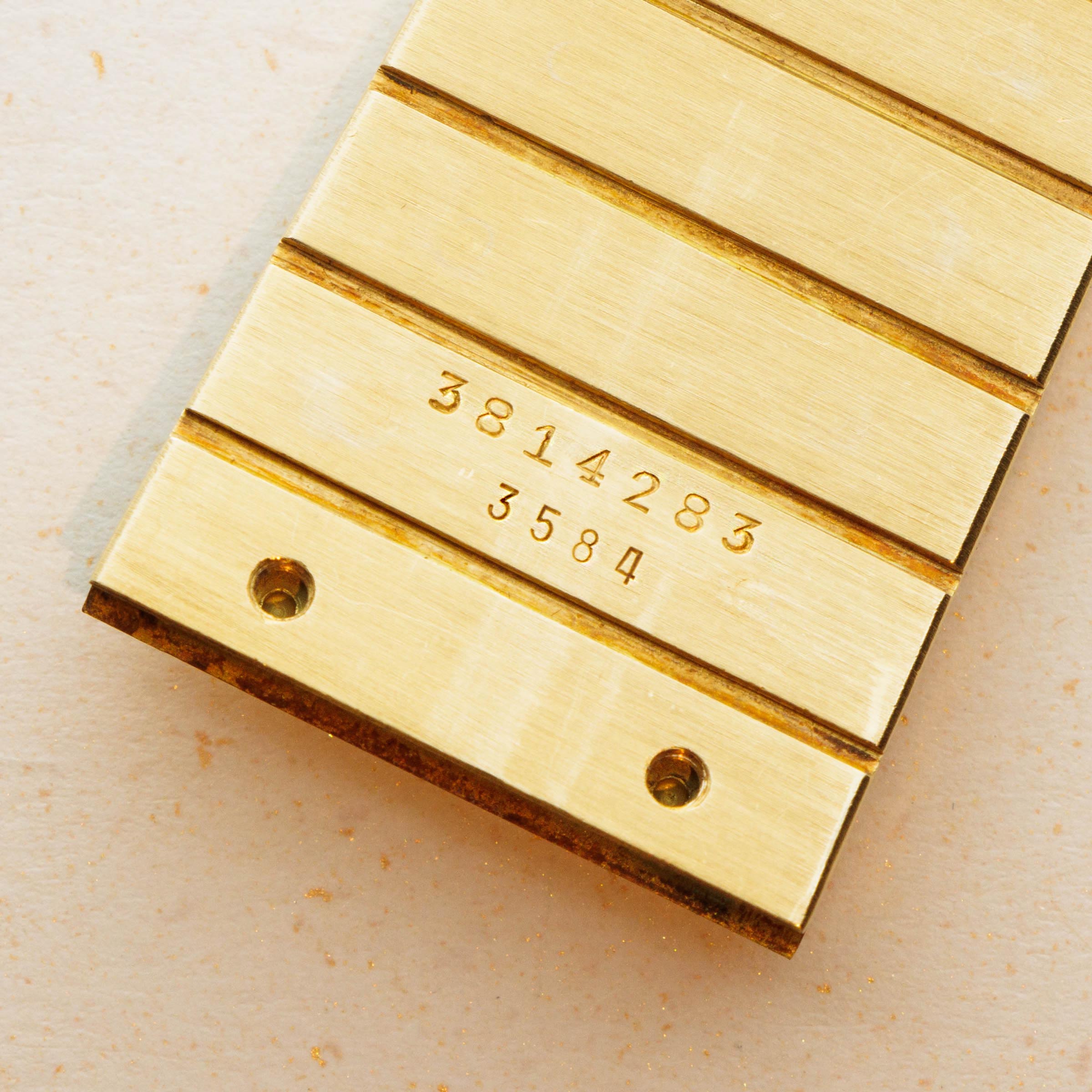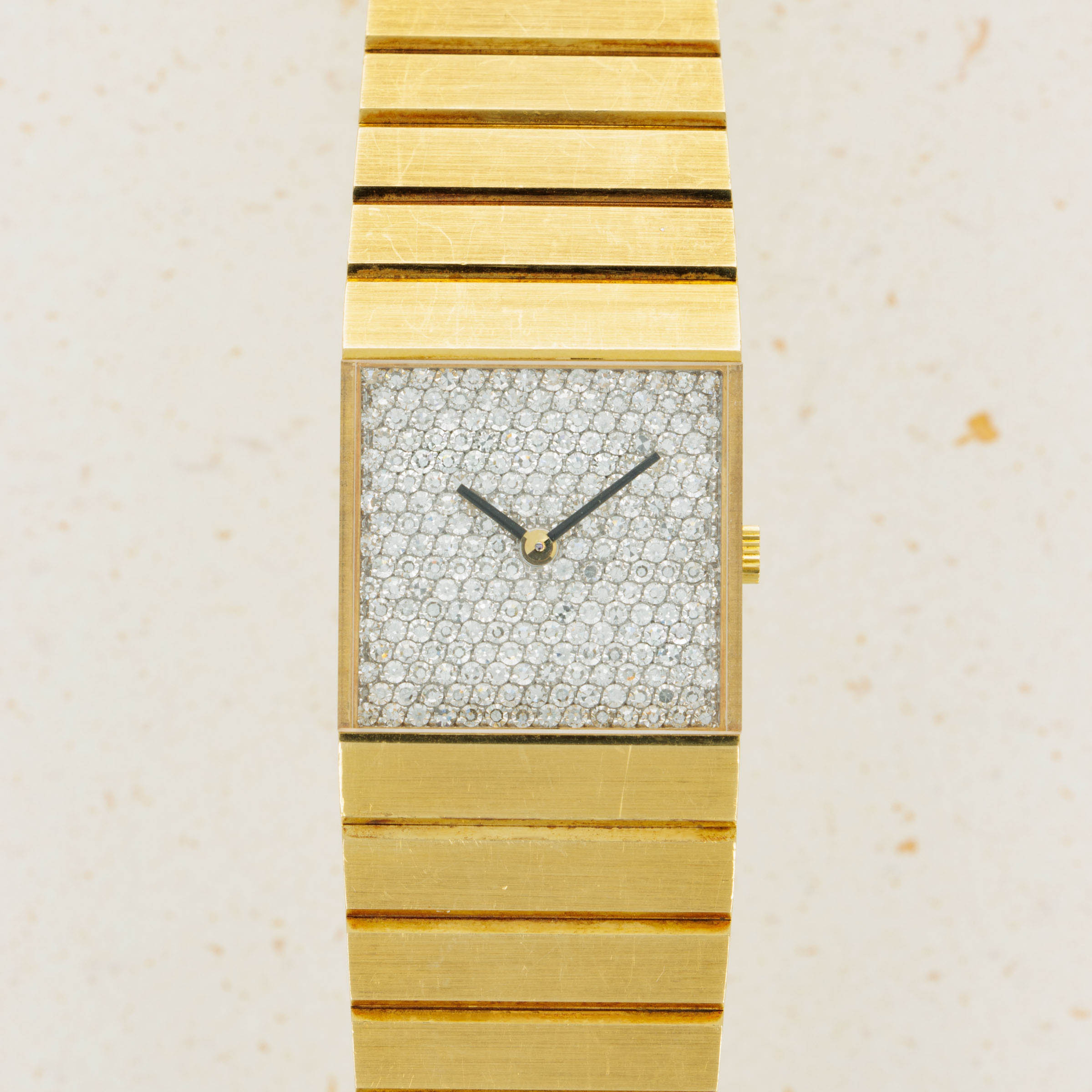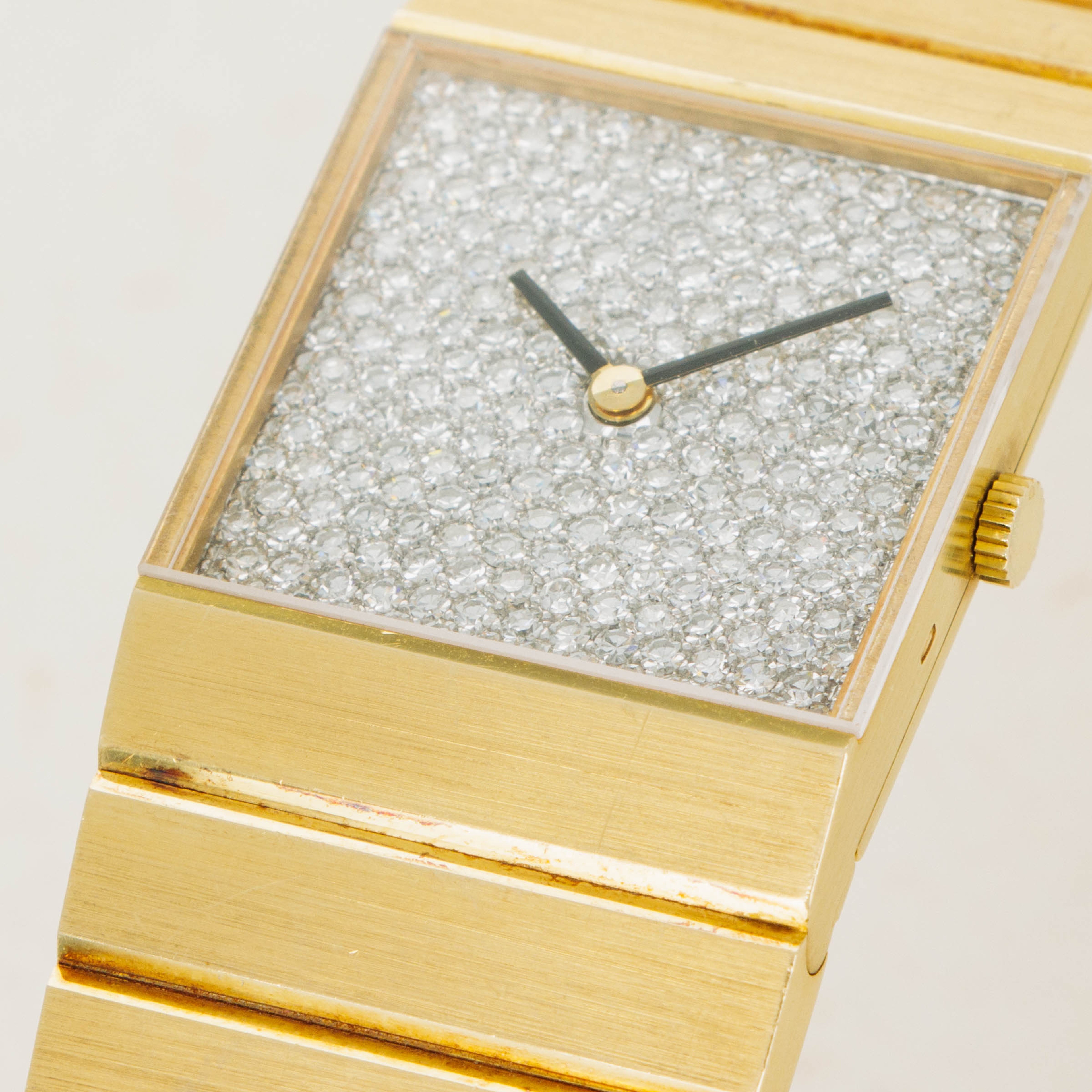 In addition to its incredibly unique 18kt yellow gold construction, this example also boasts a pave-set diamond dial that contrasts the ref. 3584's brushed surfaces with an intoxicating sparkle and shine.