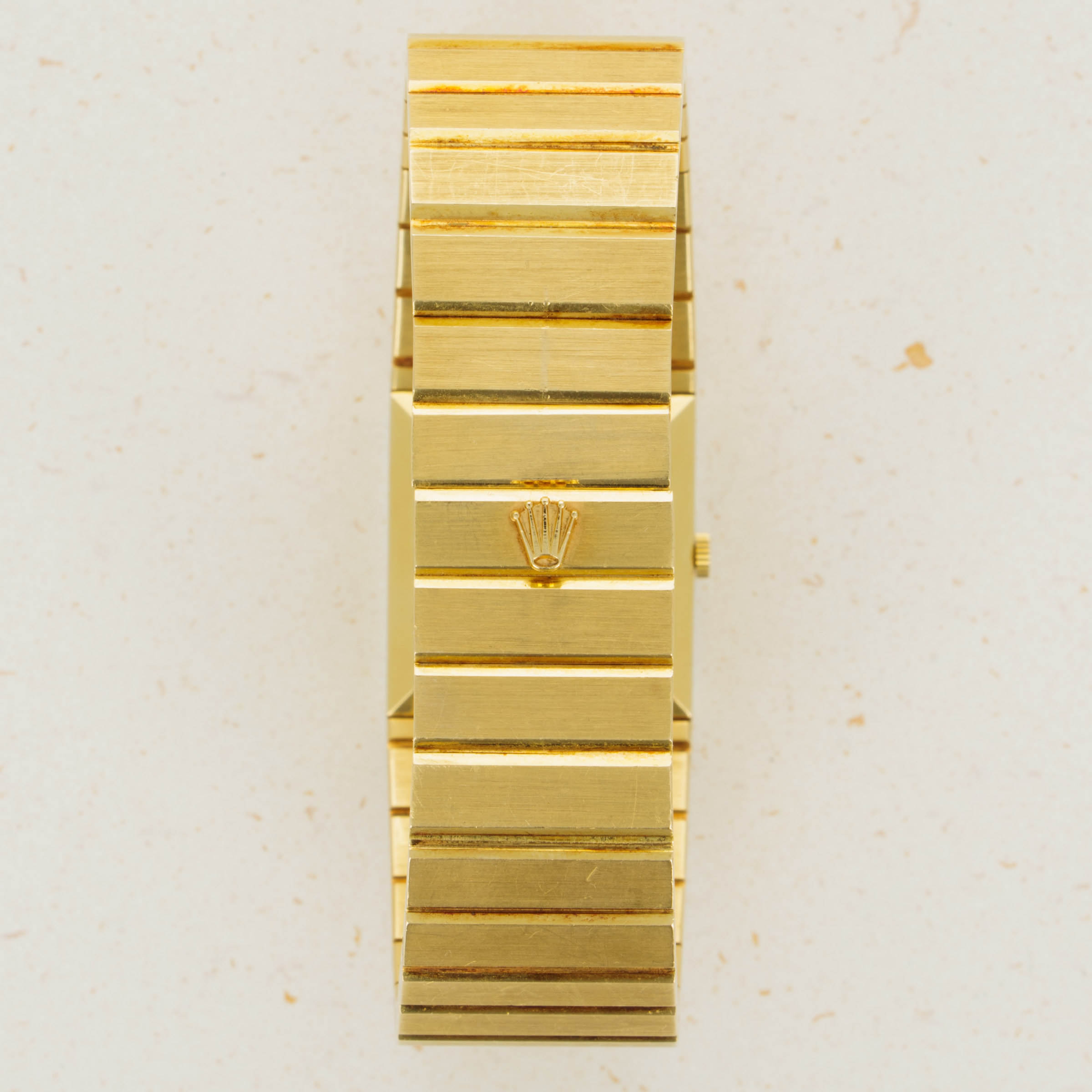 Stemming from Rolex’s acceptance of the idea that some of their customers would like to own a second watch, the Rolex Cellini collection is perhaps one of the brands most widely varied collections, with round leather strapped dress watches to oval shaped pieces of distilled excellence and even integrated bracelet watches like the King Midas ref. 3584 that we have here, the collection is varied and rich with diversity. Launched in the 1960s, Rolex approached a young Gerald Genta to design a gold watch fit for royalty. Inspired by several of the Greek temples in Athens, Genta designed the King Midas references with a variety of shapes ranging from asymmetrical pentagon-shaped models with a left-handed crown arrangement to more symmetrical models like the ref. 3584 that we have here that also kept the integrated bracelet of its sibing models. Named after King Midas, whose touch could turn anything to gold, the King Midas was an exclusive timepiece that weighed double that of a Day-Date, Rolex’s flagship and most exclusive collection. Taking elements of King Midas’ story and implementing them into the watch itself, Genta showcased his ability to create a unique watch unlike anything else. With its unique case reflecting the design of a temple roof and hefty 18kt gold construction taking inspiration from King Midas’ golden touch, the King Midas is perhaps one of Rolex’s most unique watches ever, and with its diamond-set pave dial this ref. 3584 is aesthetically rich, luxurious and even more exclusive than an already rare non—diamond-set King Midas would be – a true collector’s piece in every sense imaginable.