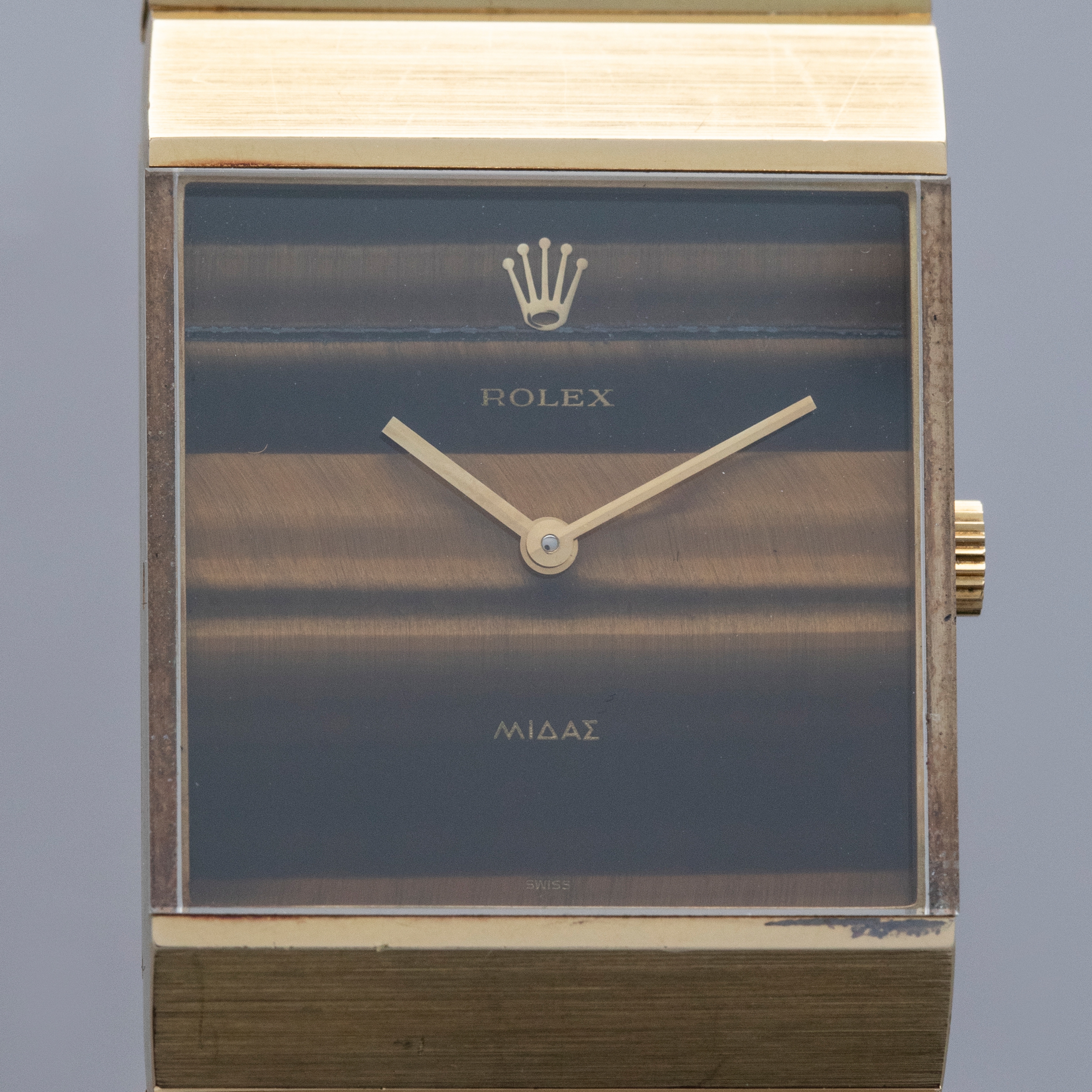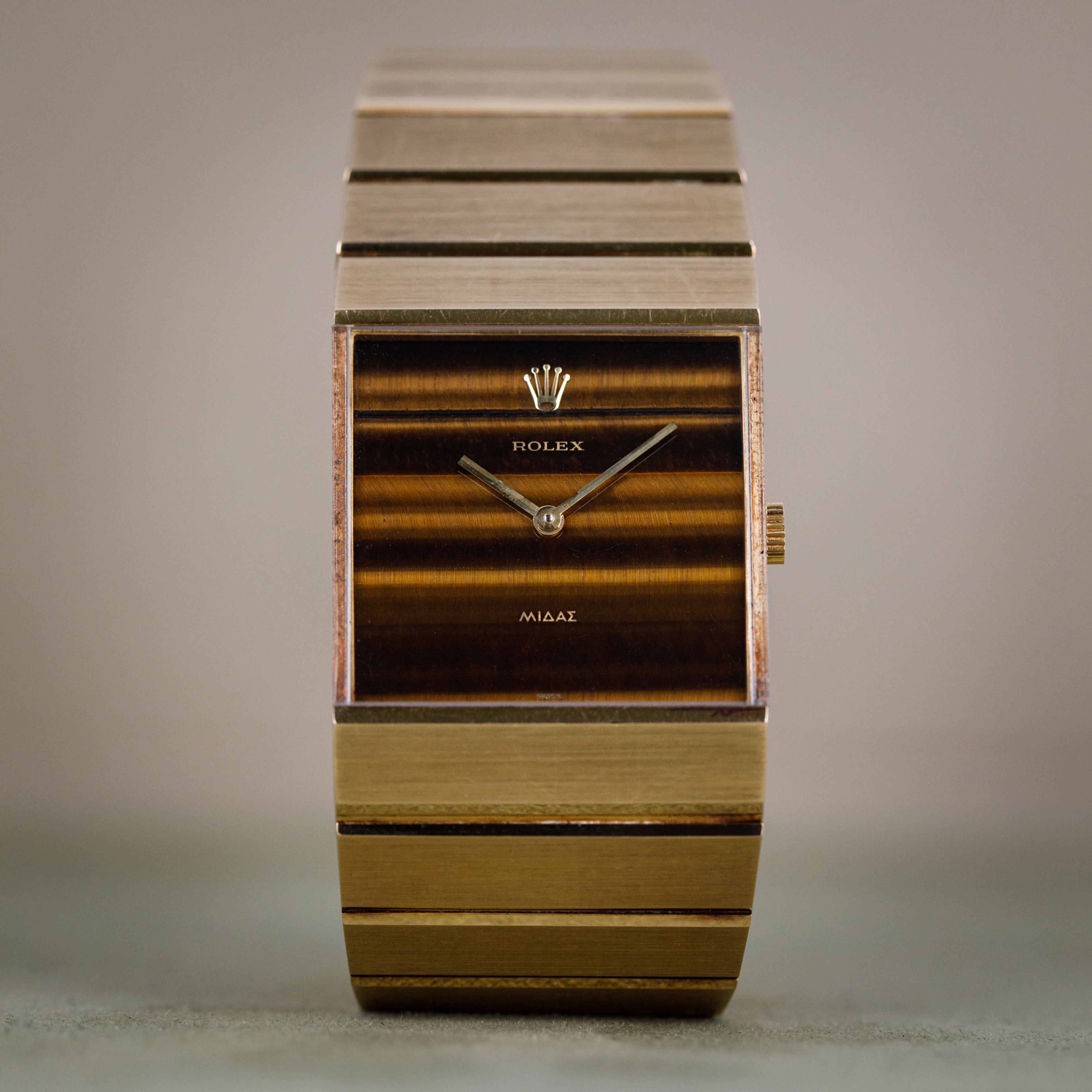 An entirely unique watch that completely breaks from Rolex convention, the King Midas offered, and still offers, a completely different experience and aesthetic from anything the brand has ever produced. This example is one of the most coveted, with its beautiful brown Tiger's eye stone dial.