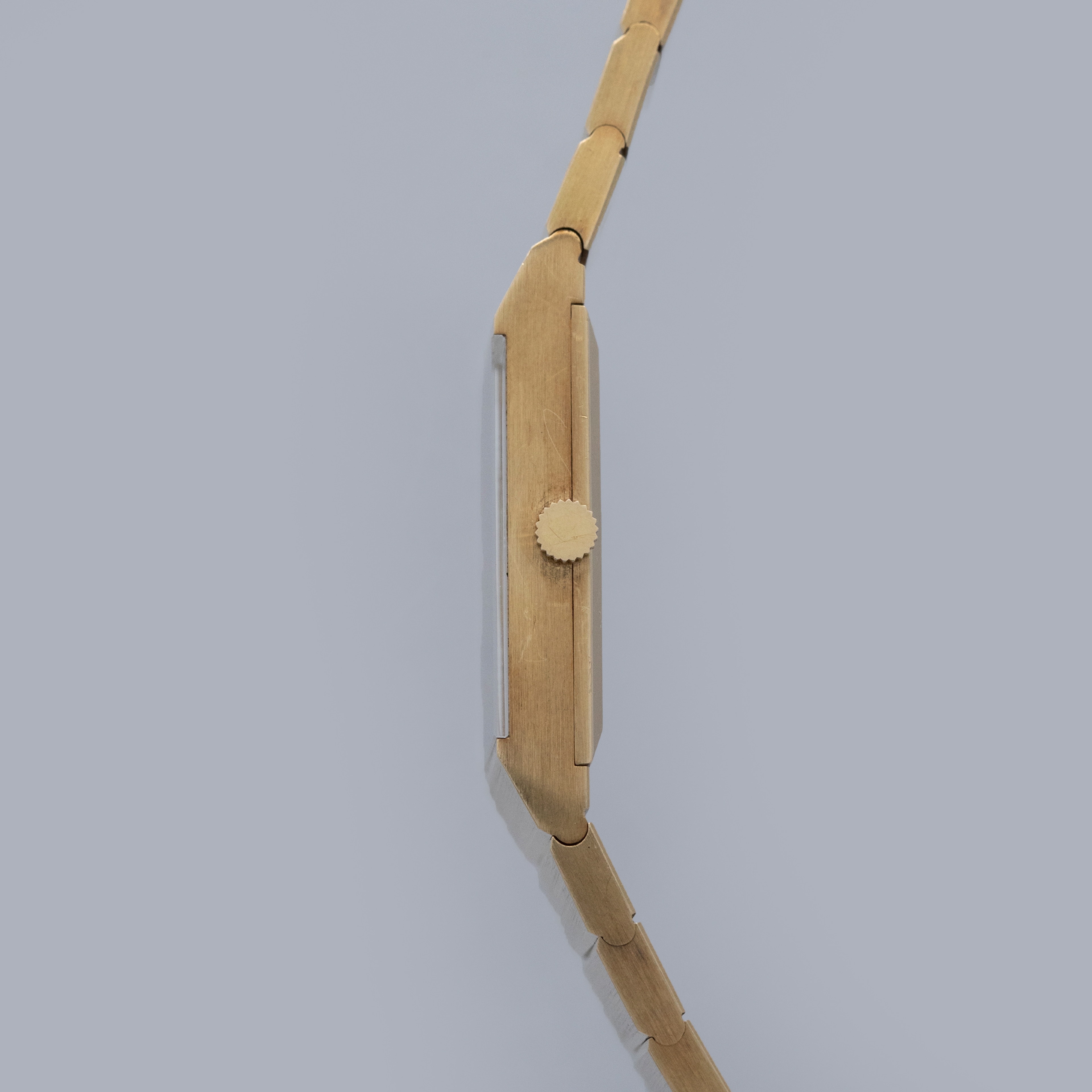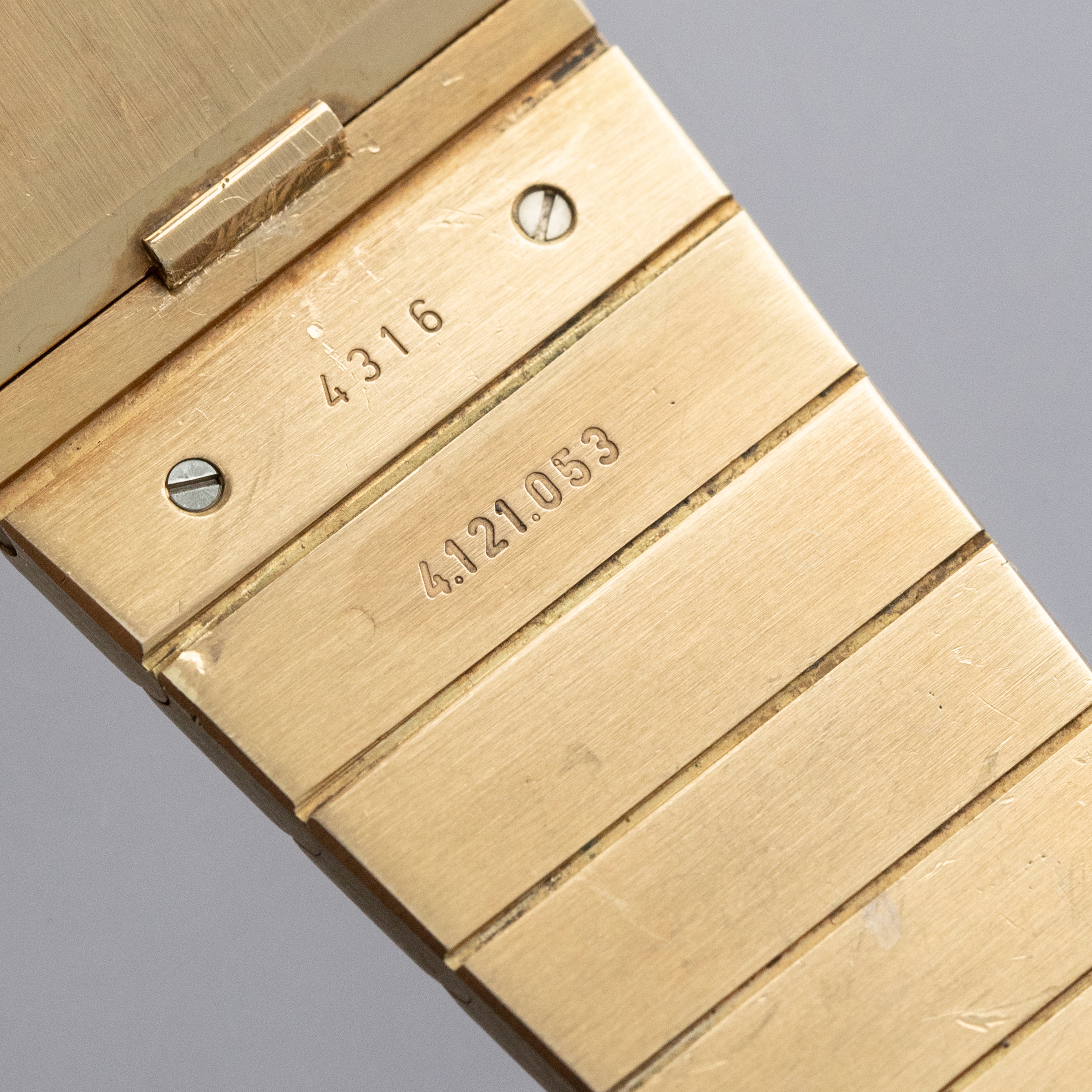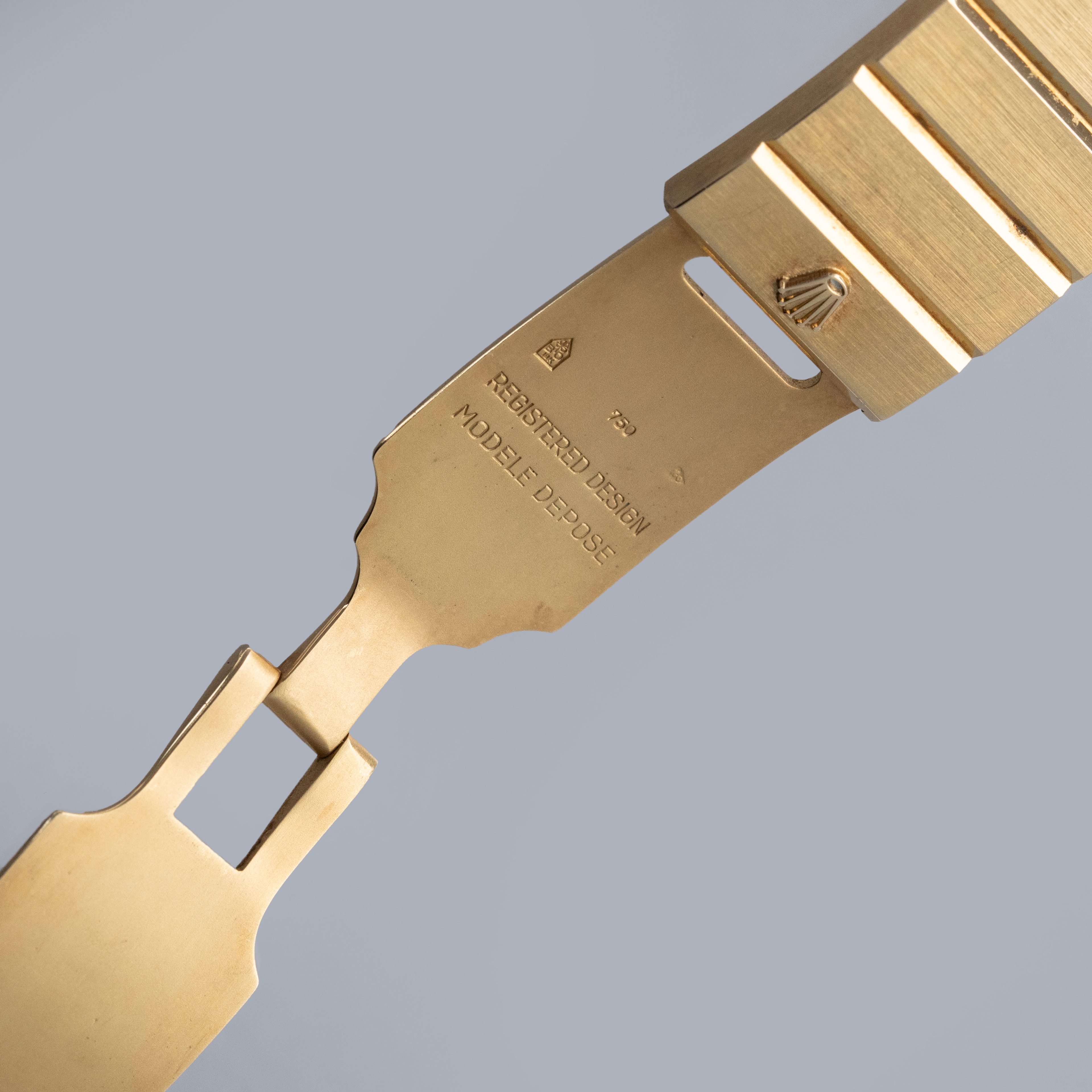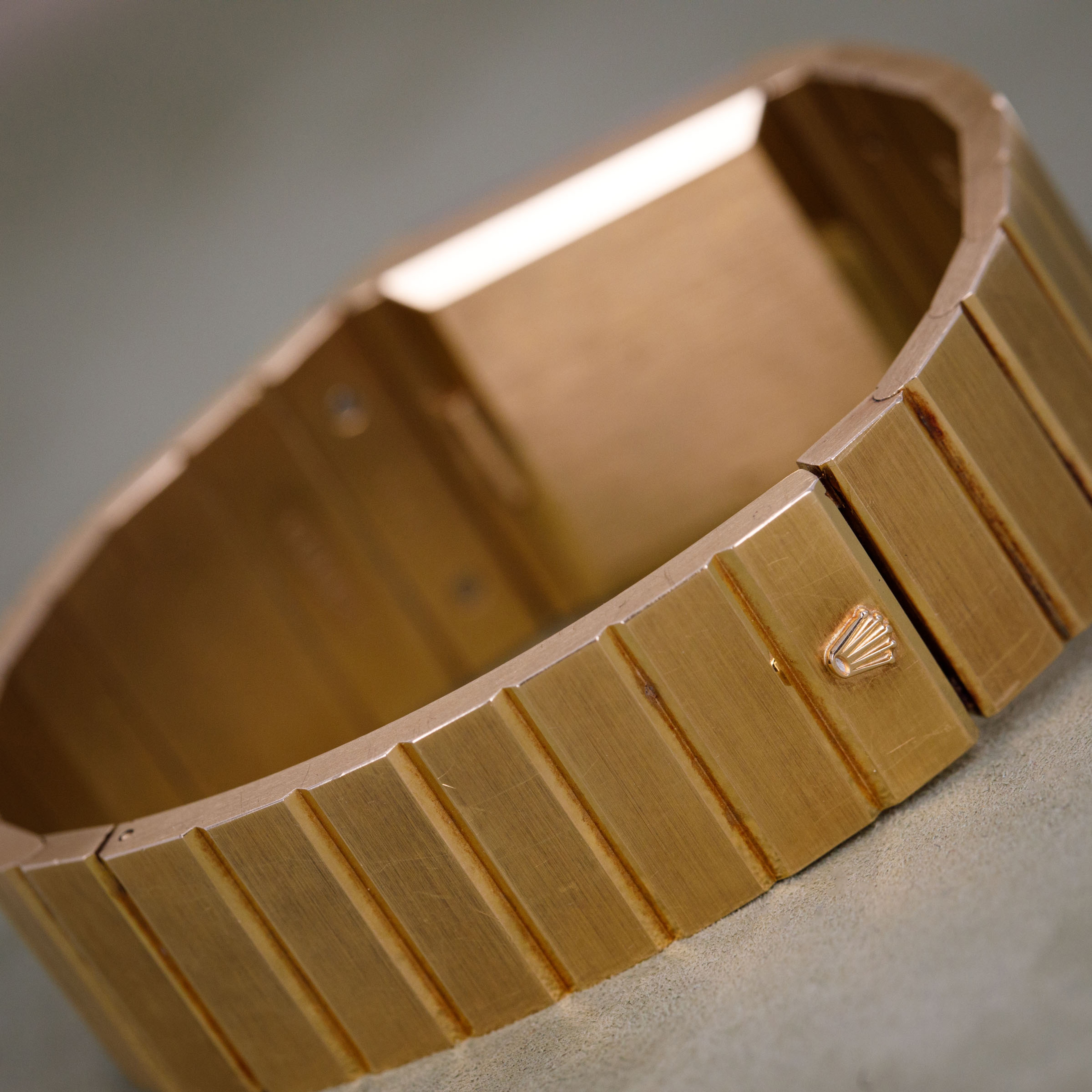 Watch is in overall excellent condition. The yellow gold case is very well defined with a deep hallmark on the side, showing some scratches and a small nick on the lower front lip of the case below the dial. The case back retains its vertical brushed finish with a deep hallmark and some scratches. The hardstone dial is free from hairlines and surface cracks. The gold hands are very clean. The integrated bracelet has very well-defined engravings on the inside and a crisp coronet on the clasp, with surface scratches as expected on a watch of this vintage. The bracelet currently fits a 7" wrist and has 18 links, 2 of which are removable. There is negligible play between the links.