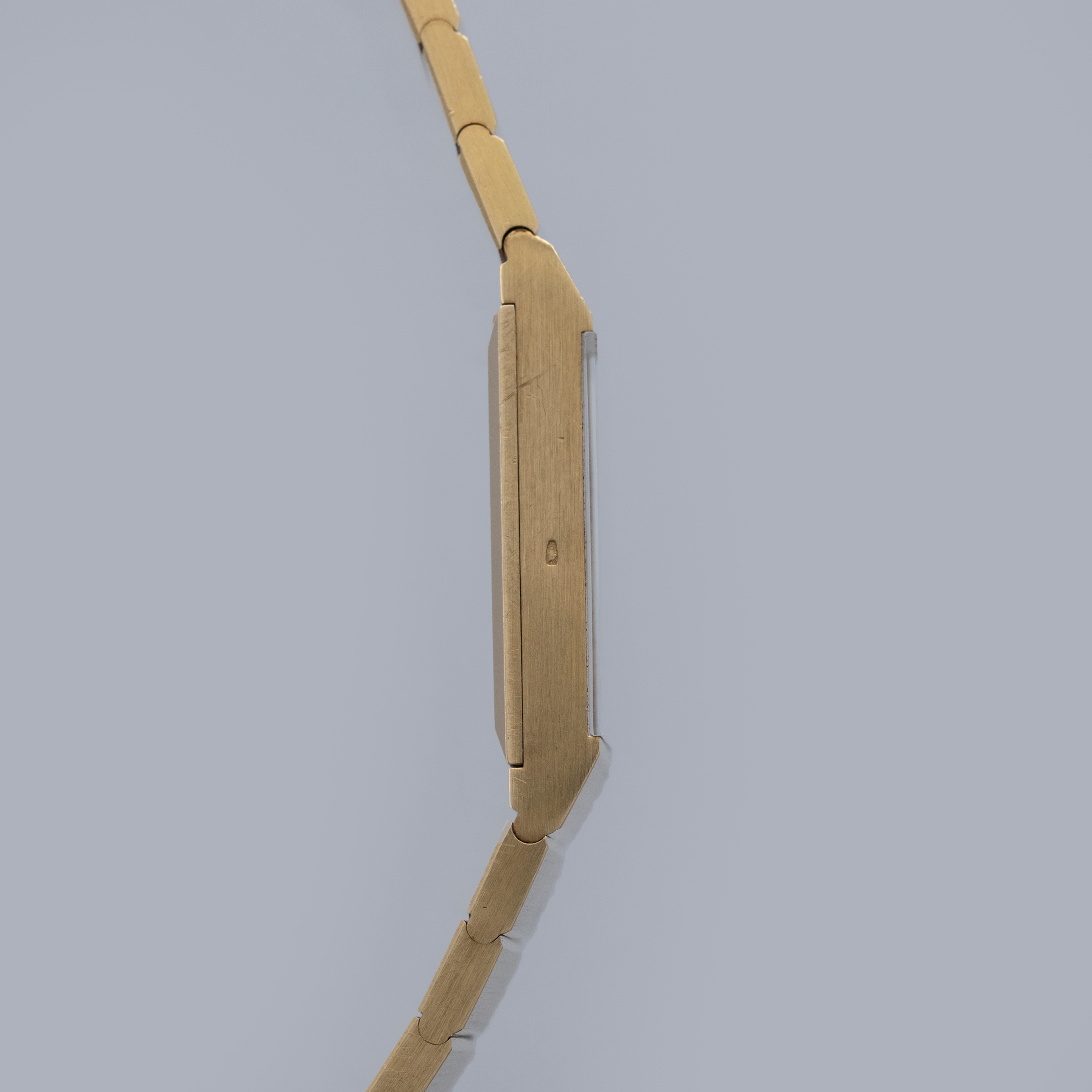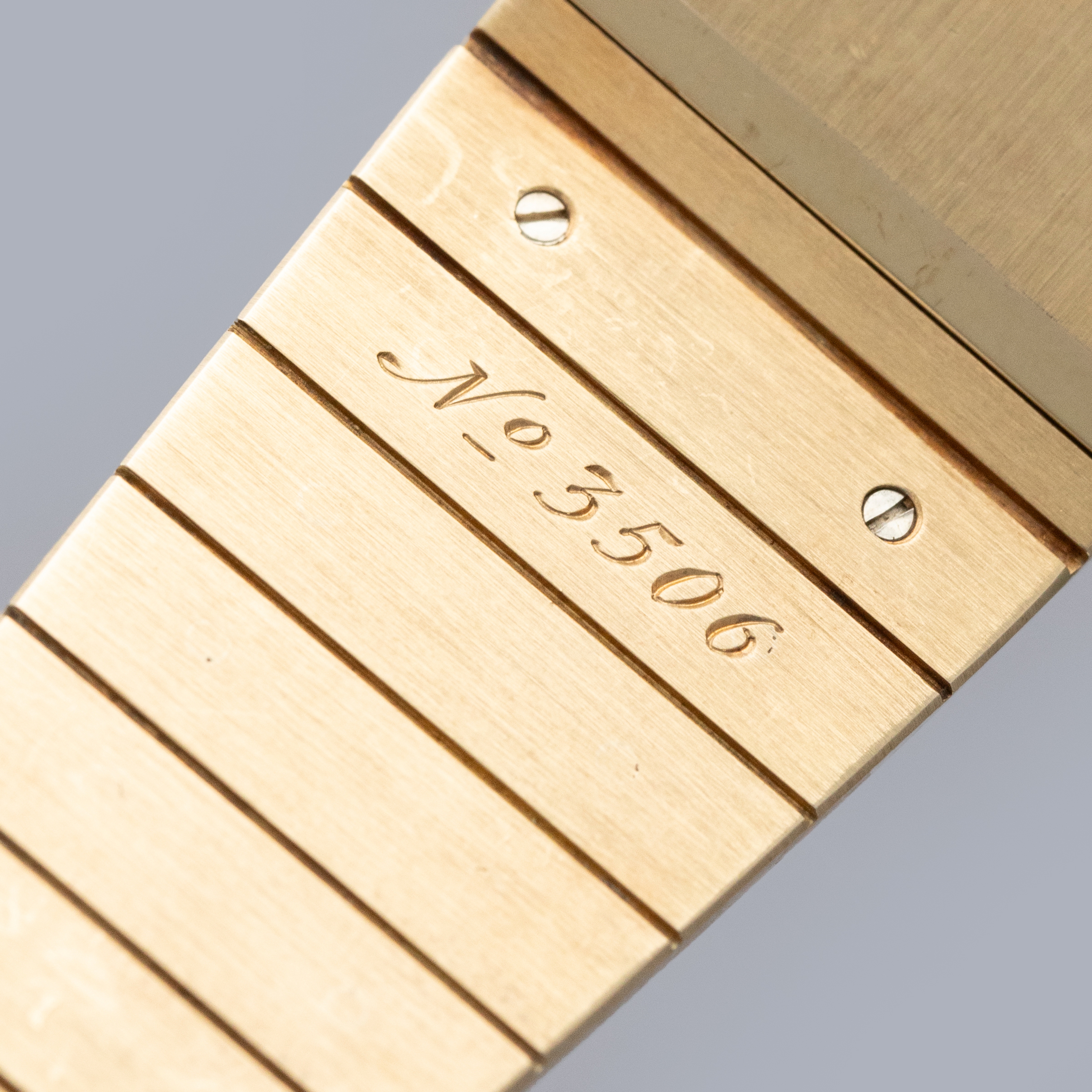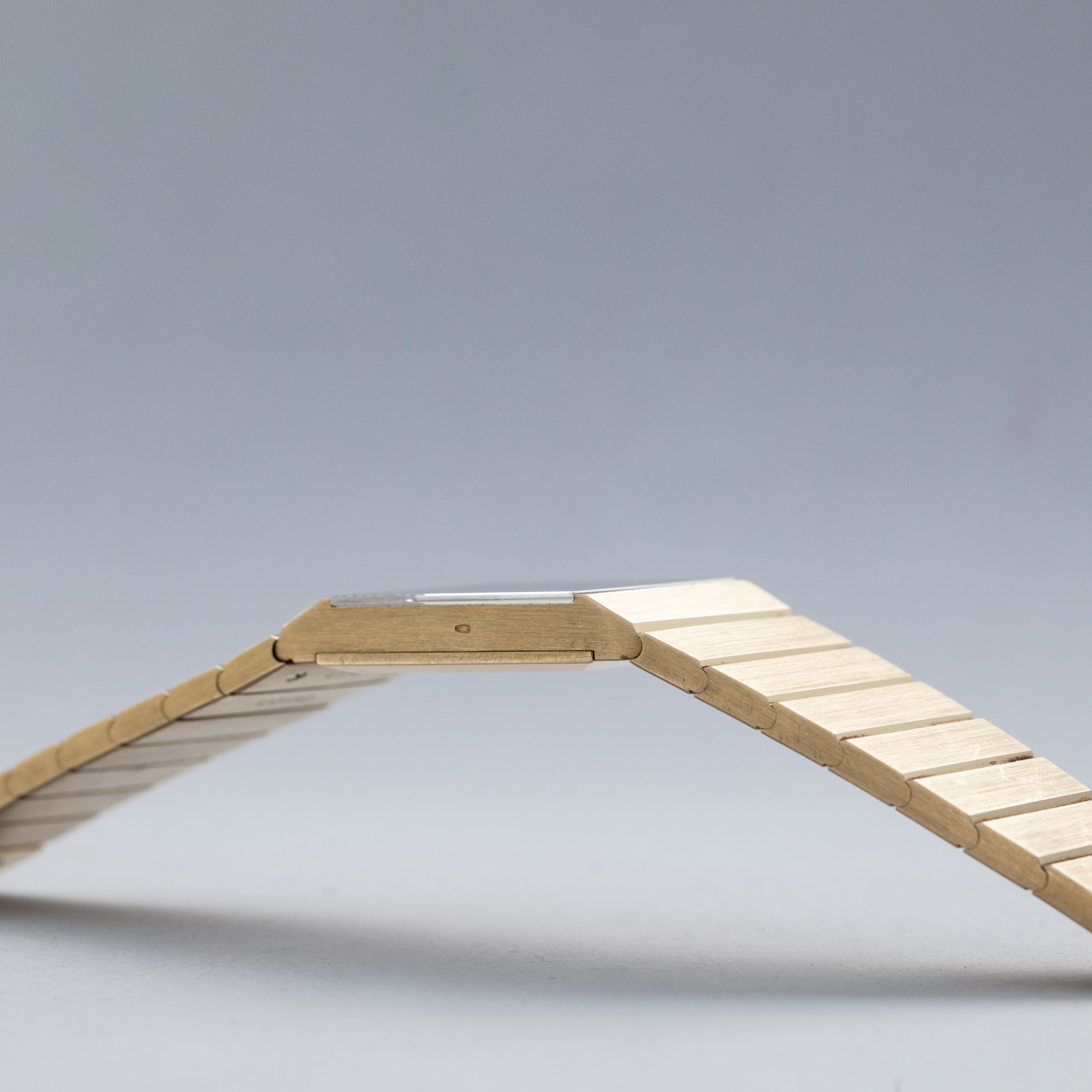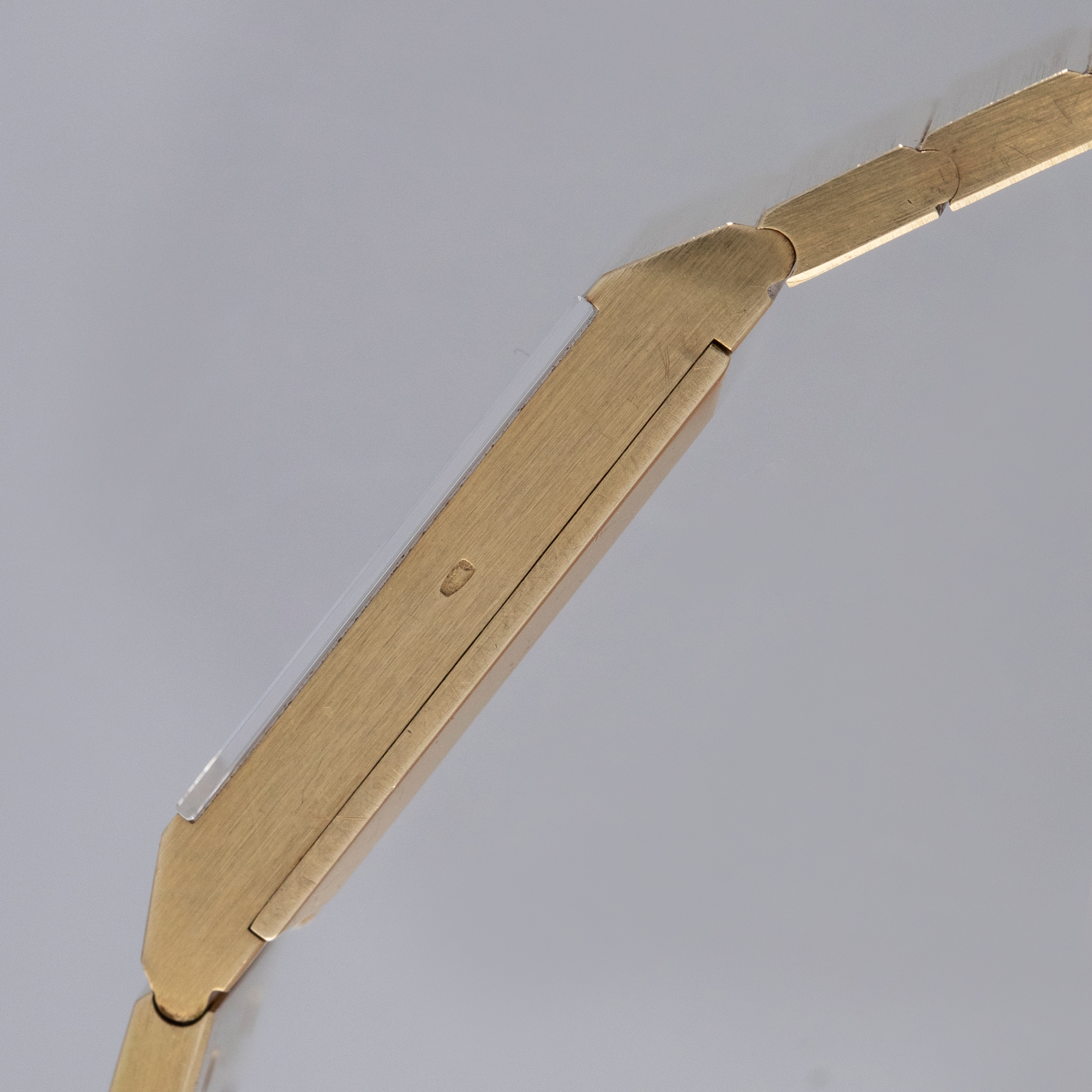 Watch is in overall excellent condition. The yellow gold case is very well defined with a deep hallmark on the side, showing some scratches and a small nick on the lower front lip of the case below the dial. The case back retains its vertical brushed finish with a deep hallmark and some scratches. The hardstone dial is free from hairlines and surface cracks. The gold hands are very clean. The integrated bracelet has very well-defined engravings on the inside and a crisp coronet on the clasp, with surface scratches as expected on a watch of this vintage. The bracelet currently fits a 7" wrist and has 18 links, 2 of which are removable. There is negligible play between the links.
