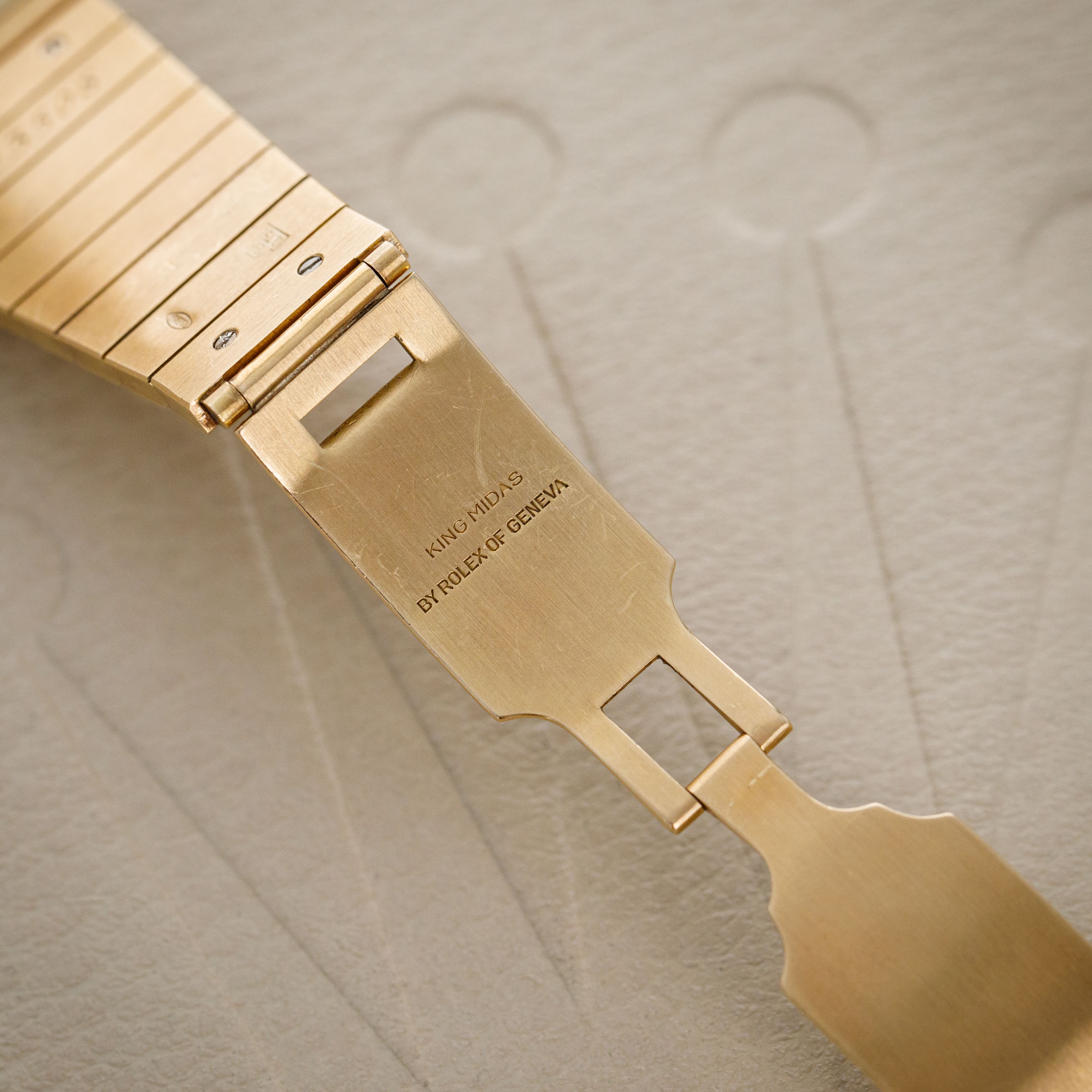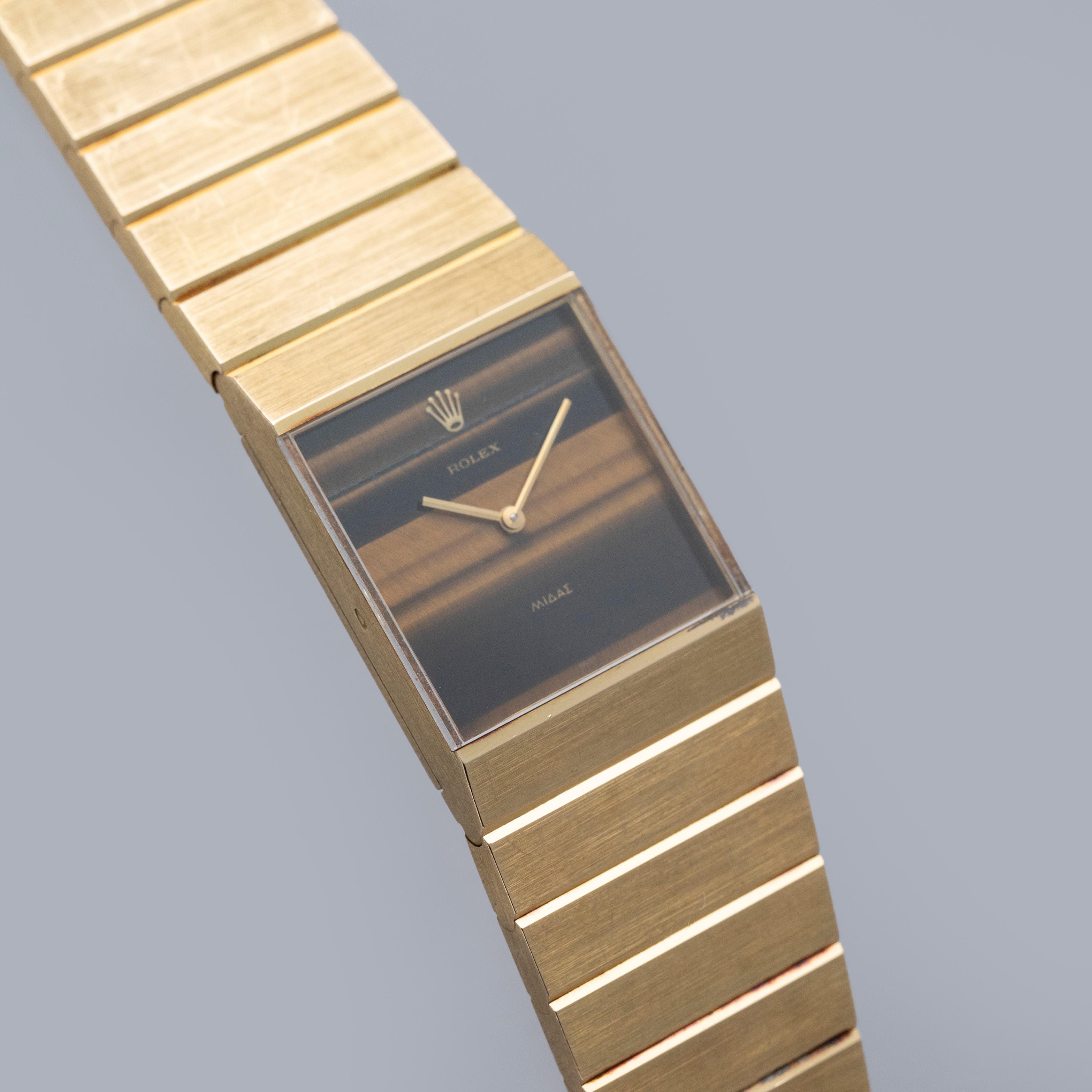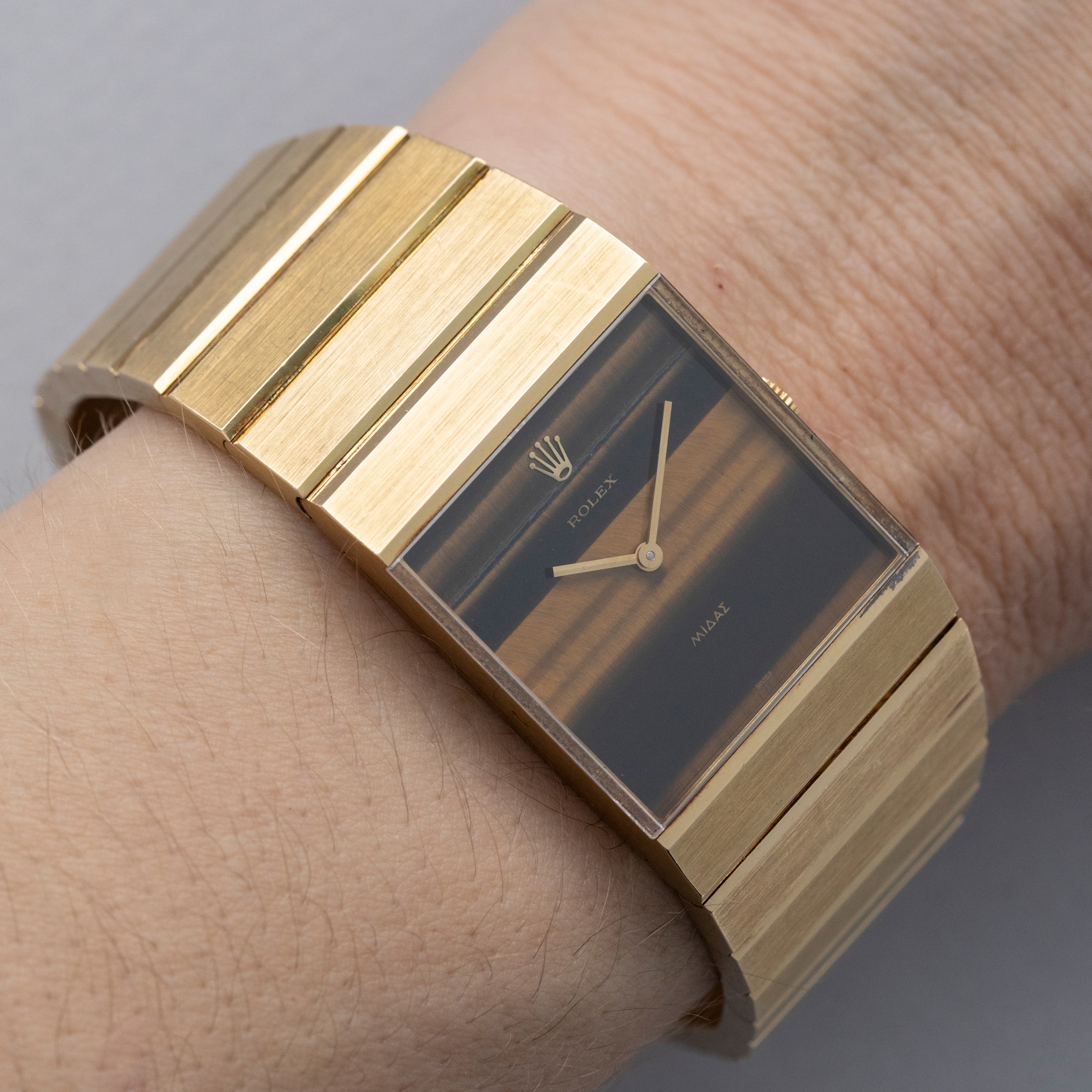 Stemming from Rolex’s acceptance of the idea that some of their customers would like to own a second watch, the Rolex Cellini collection is perhaps one of the brands most widely varied collections, with round leather strapped dress watches to oval-shaped pieces of distilled excellence and even integrated bracelet watches like the King Midas ref. 4611 that we have here, the collection is varied and rich with diversity. Launched in the 1960s, Rolex approached a young Gerald Genta to design a gold watch fit for royalty. Inspired by several of the Greek temples in Athens, Genta designed the King Midas references with a variety of shapes ranging from asymmetrical pentagon-shaped models with a left-handed crown arrangement to more symmetrical models like the ref. 4316 that we have here that also kept the integrated bracelet of its sibing models. Named after King Midas, whose touch could turn anything to gold, the King Midas was an exclusive timepiece that weighed double that of a Day-Date, Rolex’s flagship and most exclusive collection. Taking elements of King Midas’ story and implementing them into the watch itself, Genta showcased his ability to create a unique watch unlike anything else. With its unique case reflecting the design of a temple roof and hefty 18kt gold construction taking inspiration from King Midas’ golden touch, the King Midas is perhaps one of Rolex’s most unique watches ever, and with its stunning tiger's eye dial, this ref. 4316 is aesthetically rich, luxurious and exclusive – a true collector’s piece in every sense imaginable.