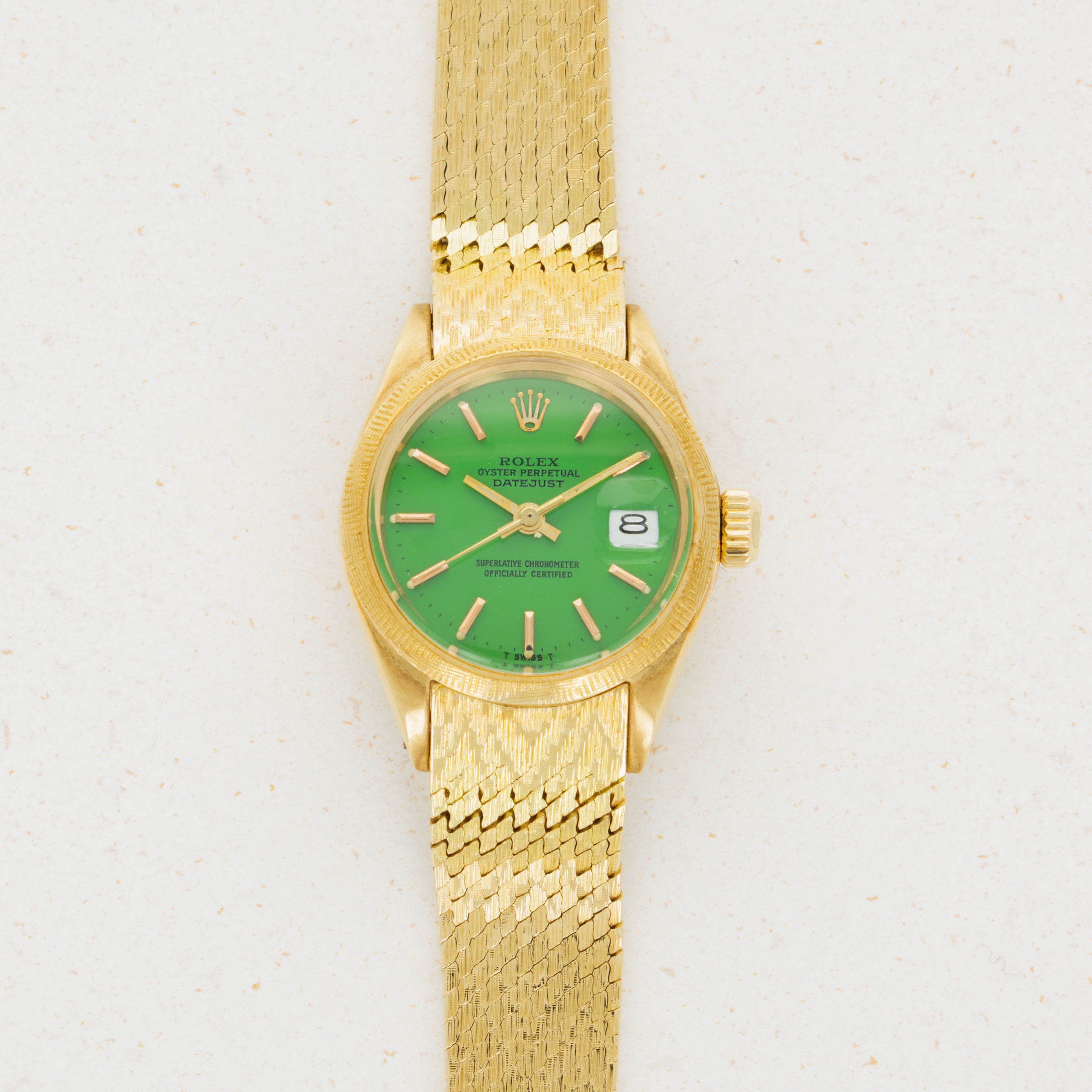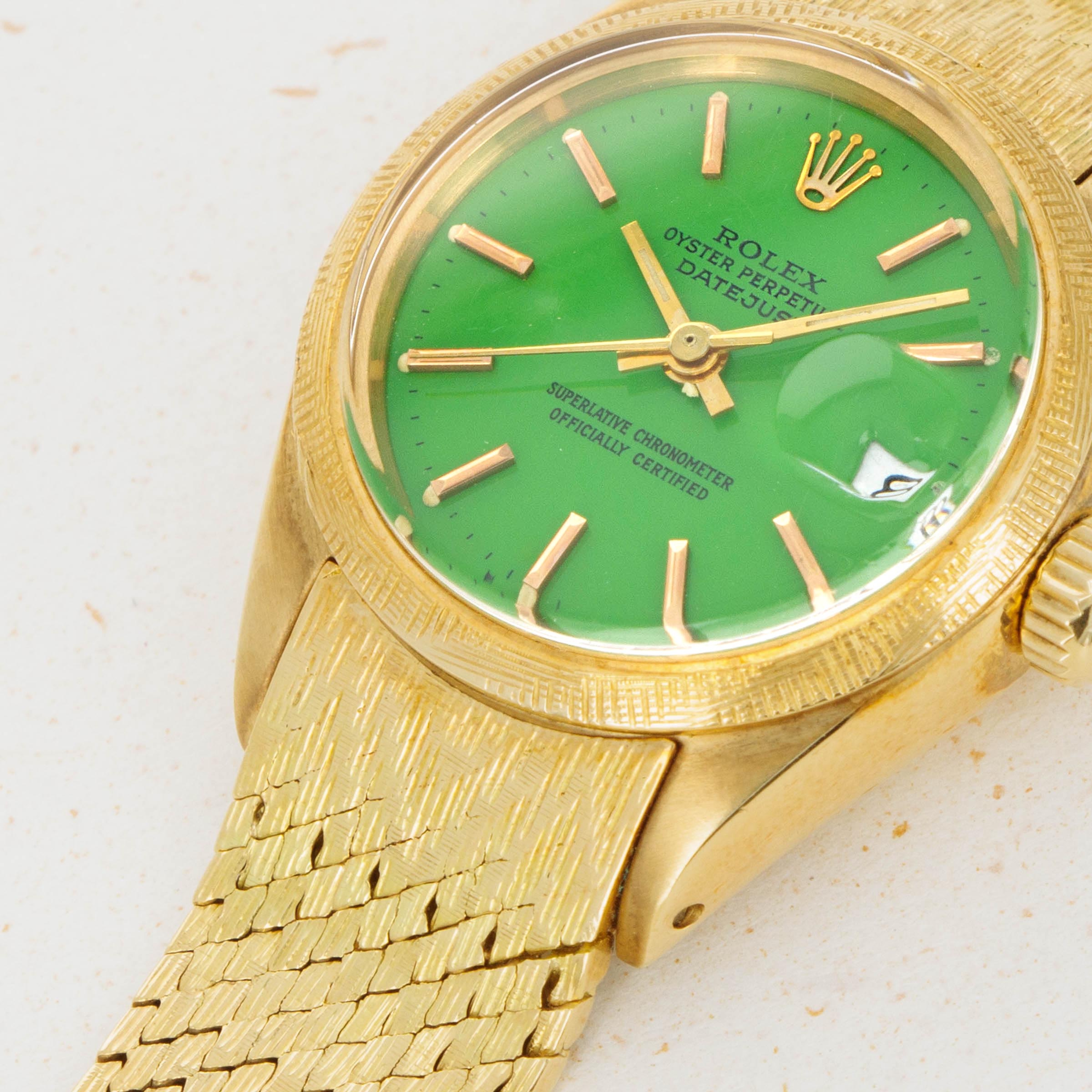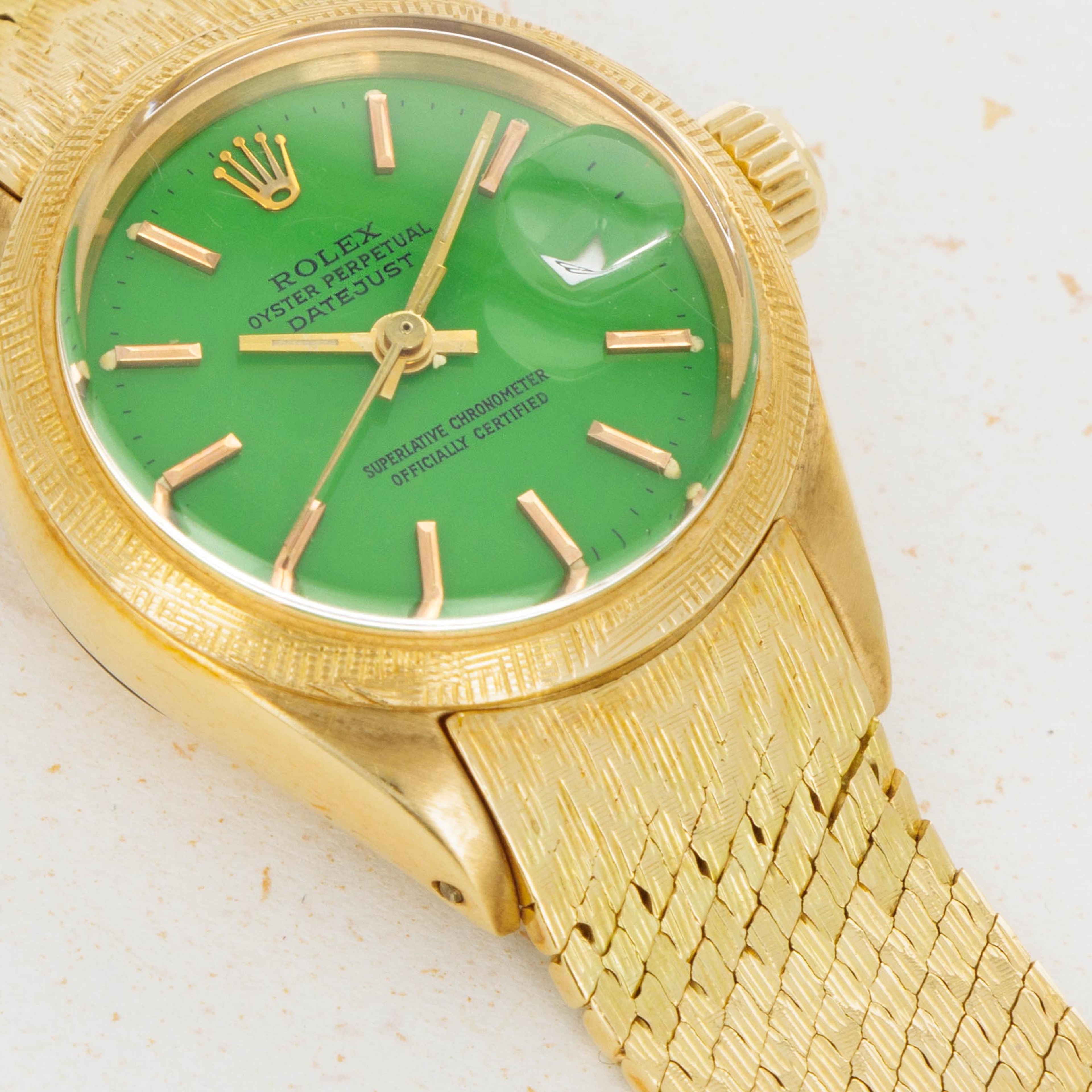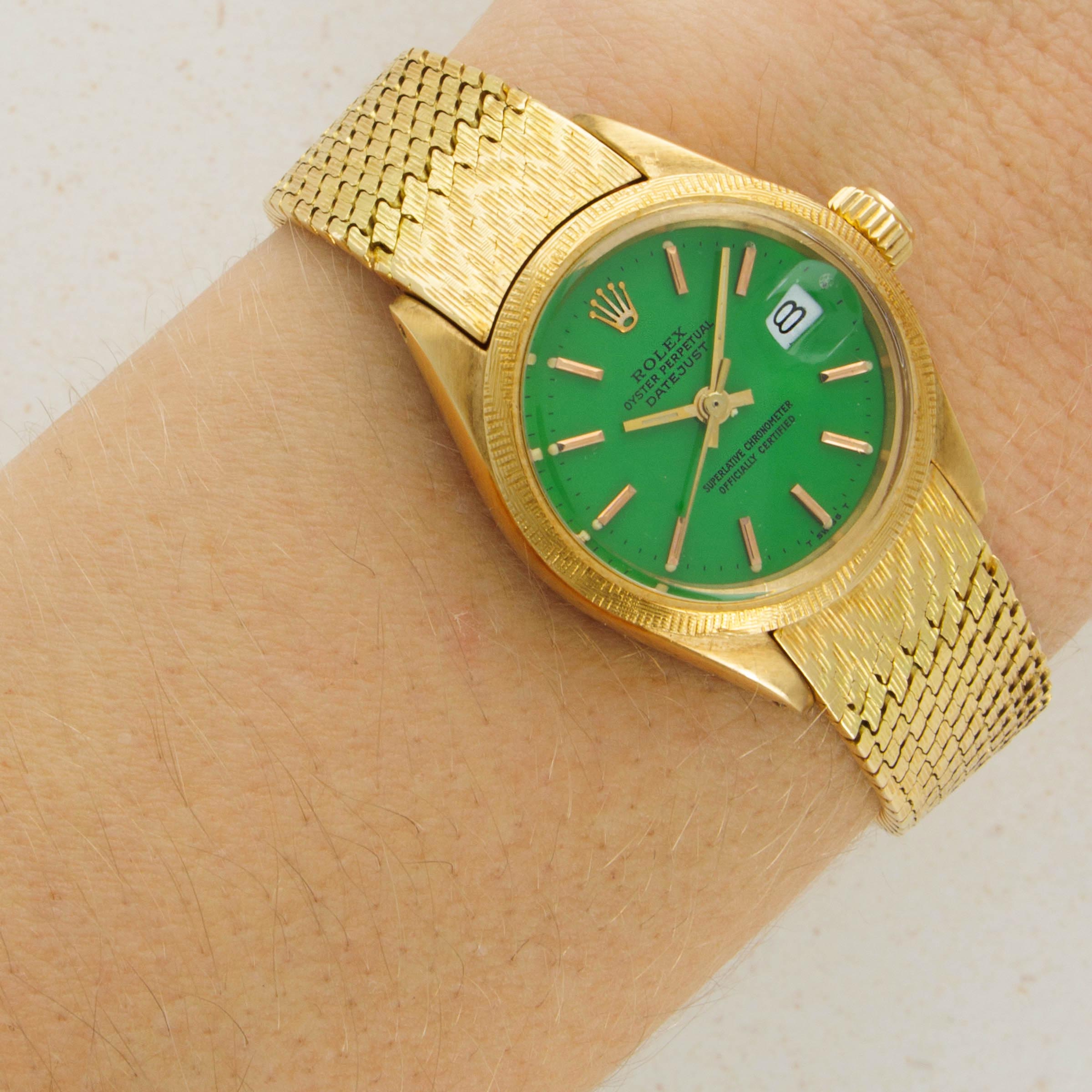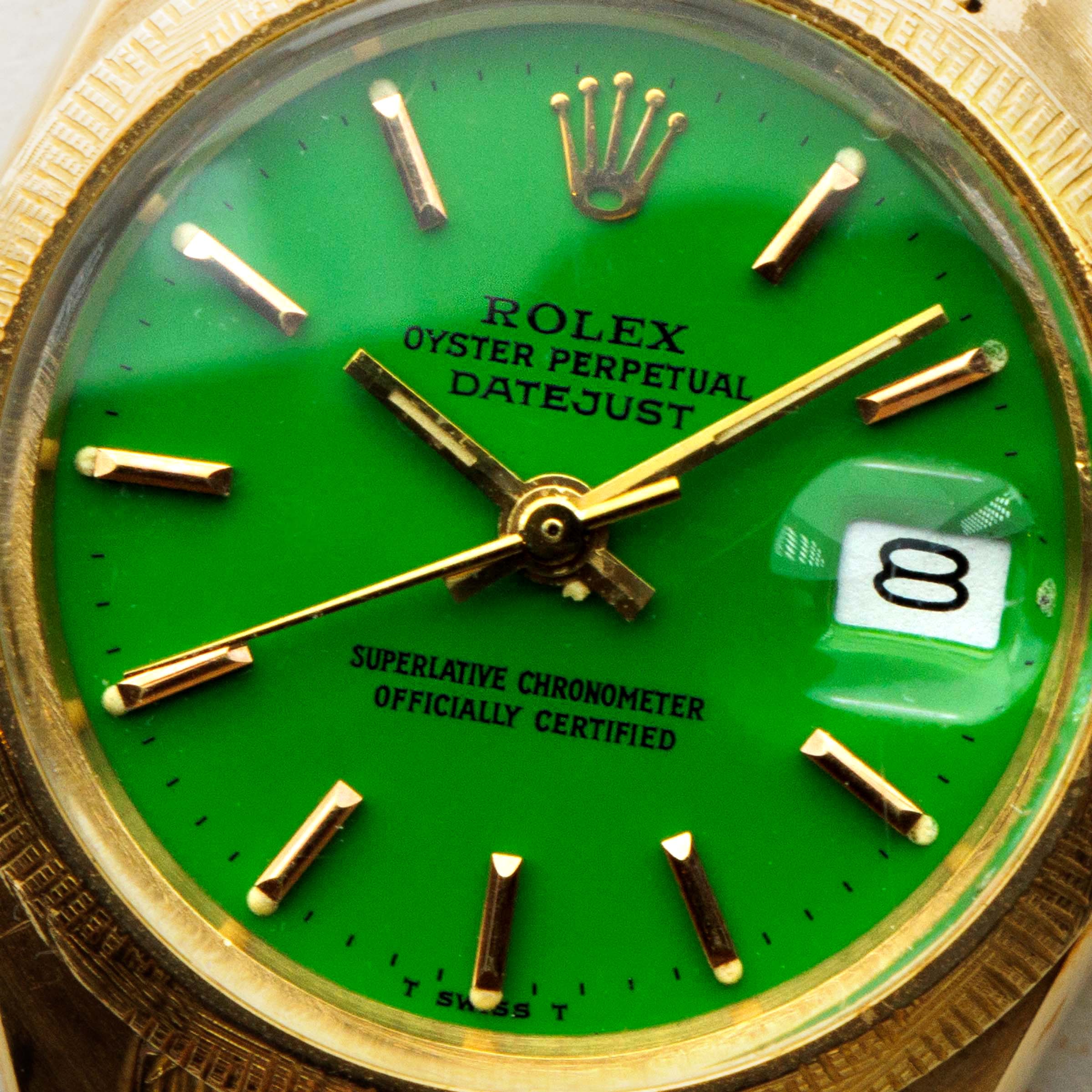 A stunning watch that combines three elements we don't often see on the Datejust, this example's green Stella dial, 18kt yellow gold construction with a cross-fluted finish bezel, and a rare brick bracelet make this watch a wonderfully unique addition to any collection.