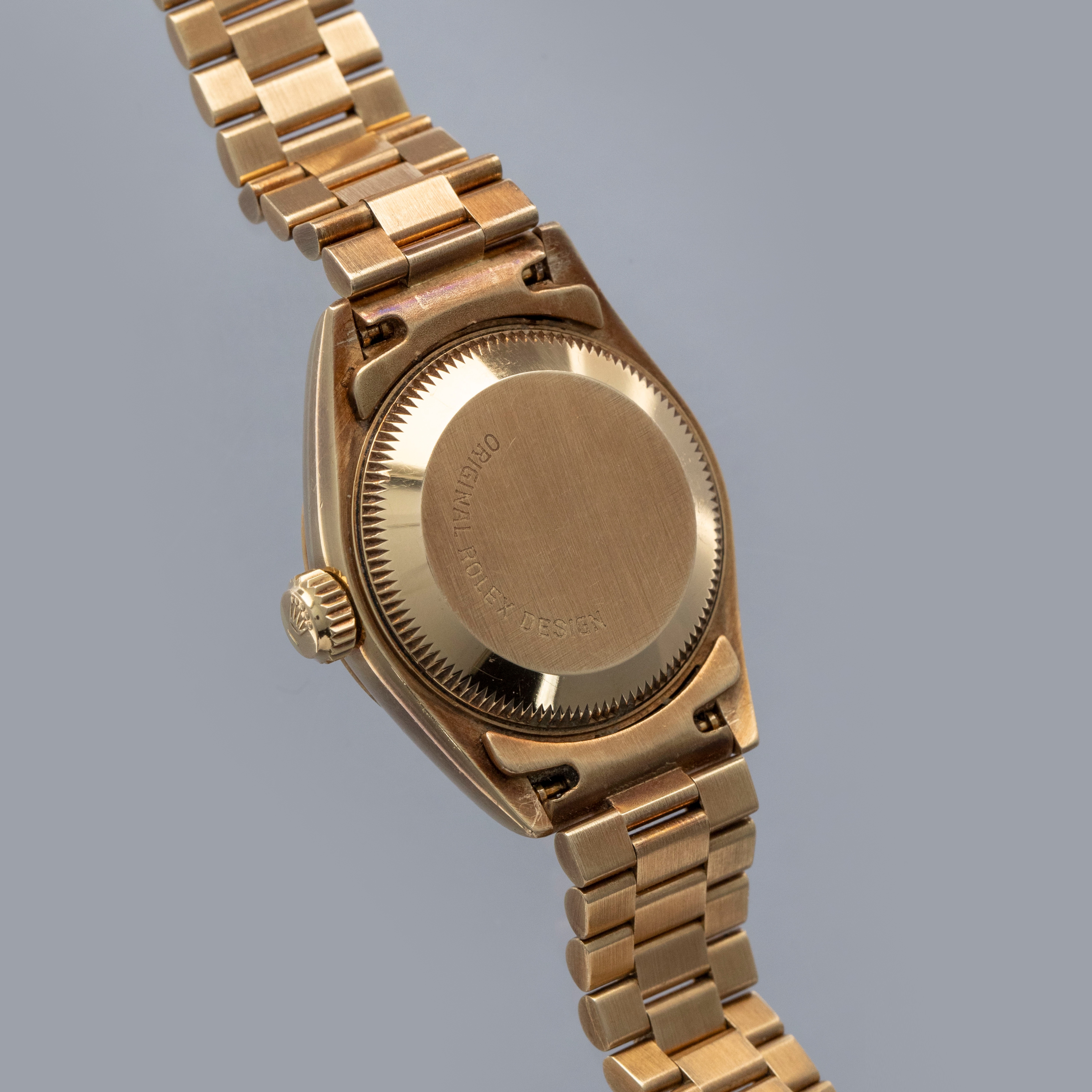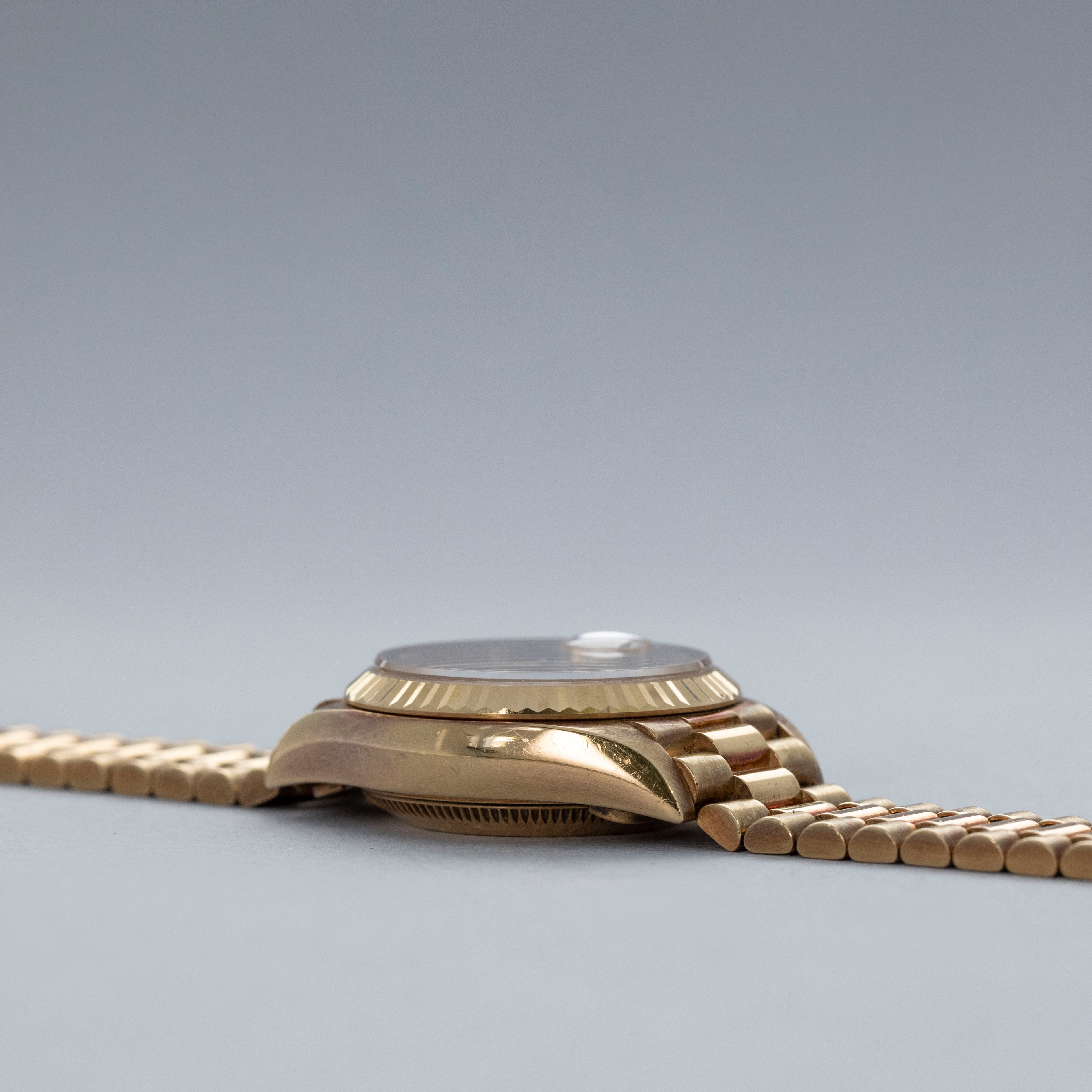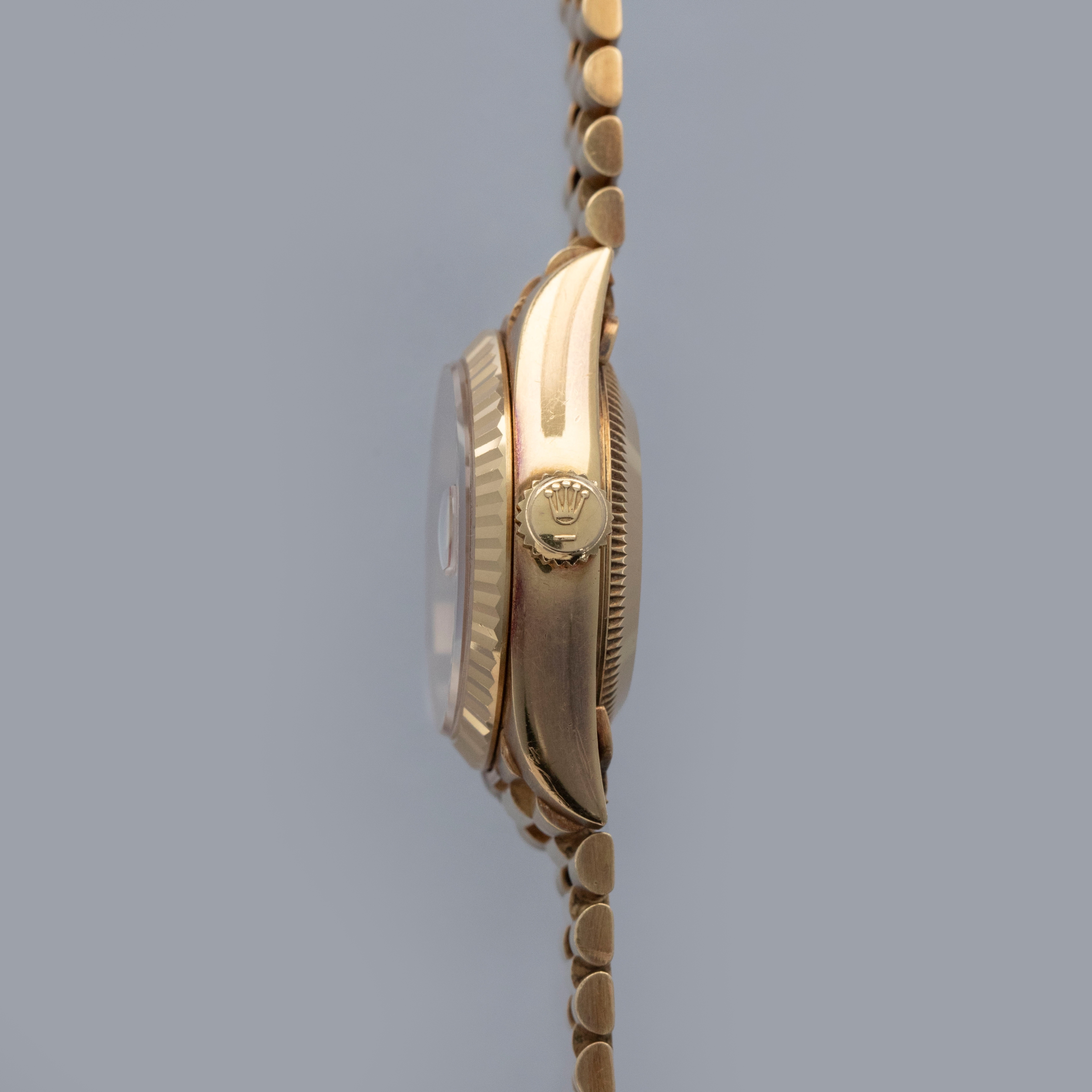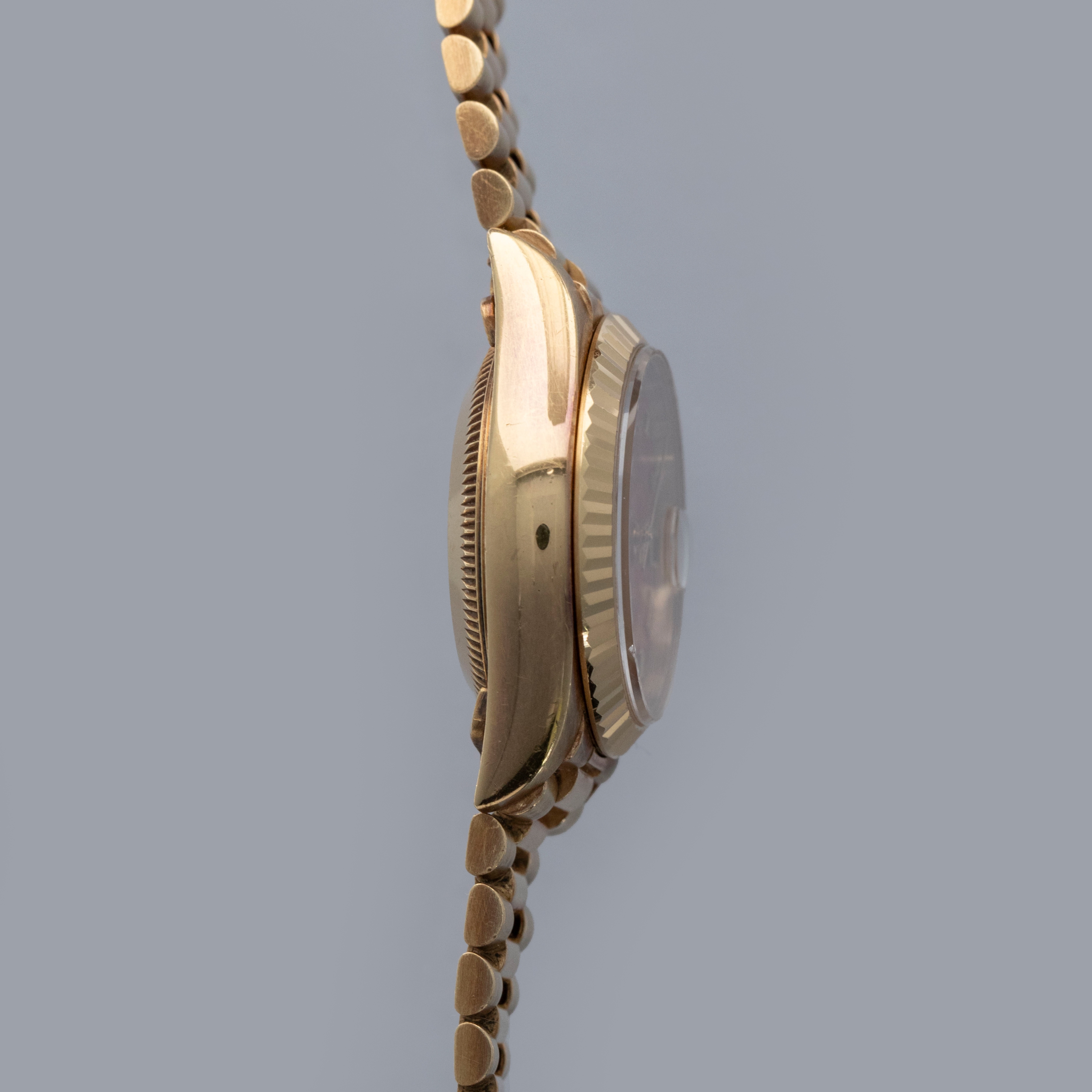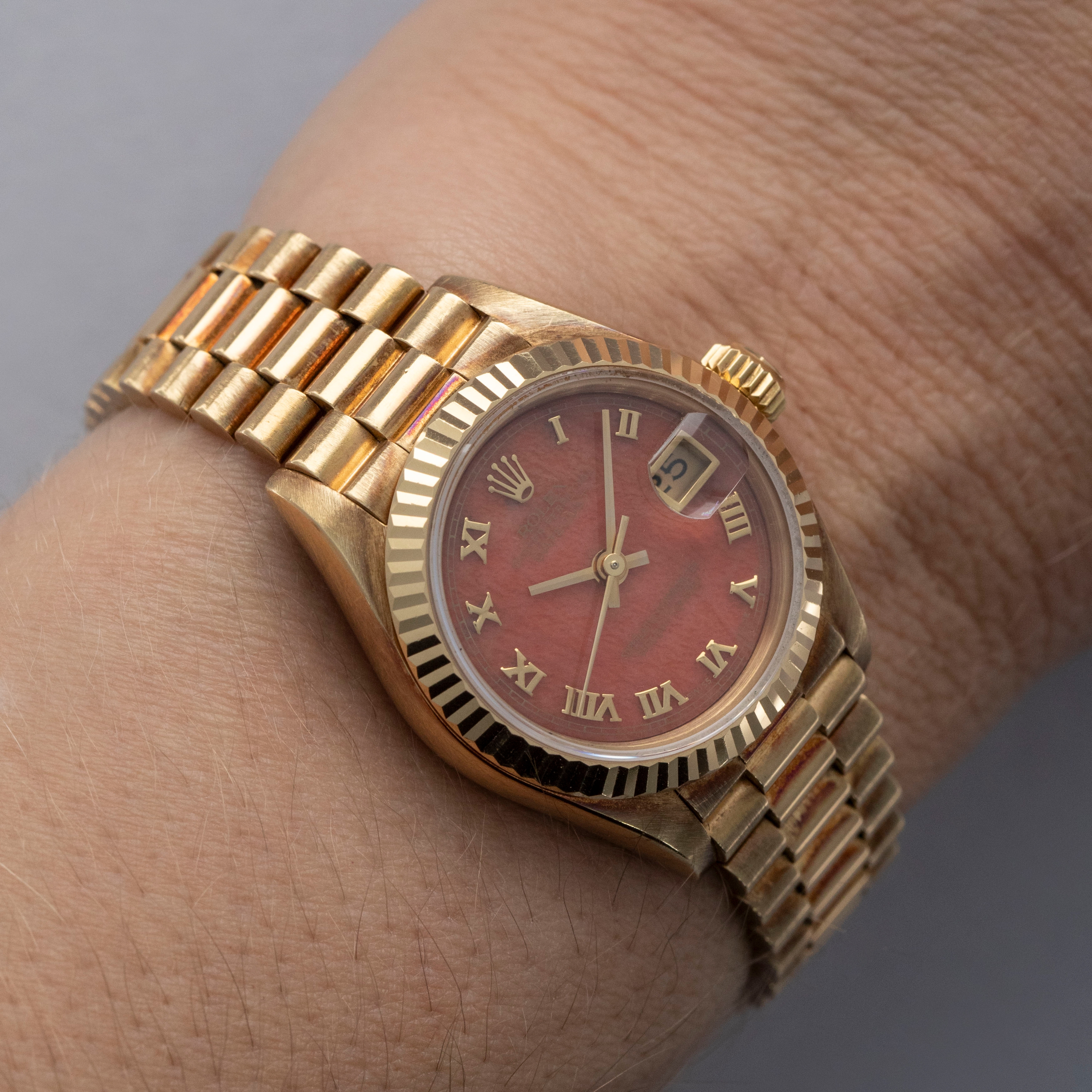 Watch is in overall excellent condition. The yellow gold case shows surface scratches and light nicks, while the case back retains a well-defined factory engraving with some light scuffs. The hallmarks and stamps on the backs of the lugs remain legible. The fluted bezel shows light surface scratches. The hardstone coral dial remains near mint with no cracks, and the no-lume hands remain very clean. It is fitted with a yellow gold President bracelet showing light surface marks and light play between the links. The bracelet is fitted with 31 links and fits approximately a 6¼” wrist.
